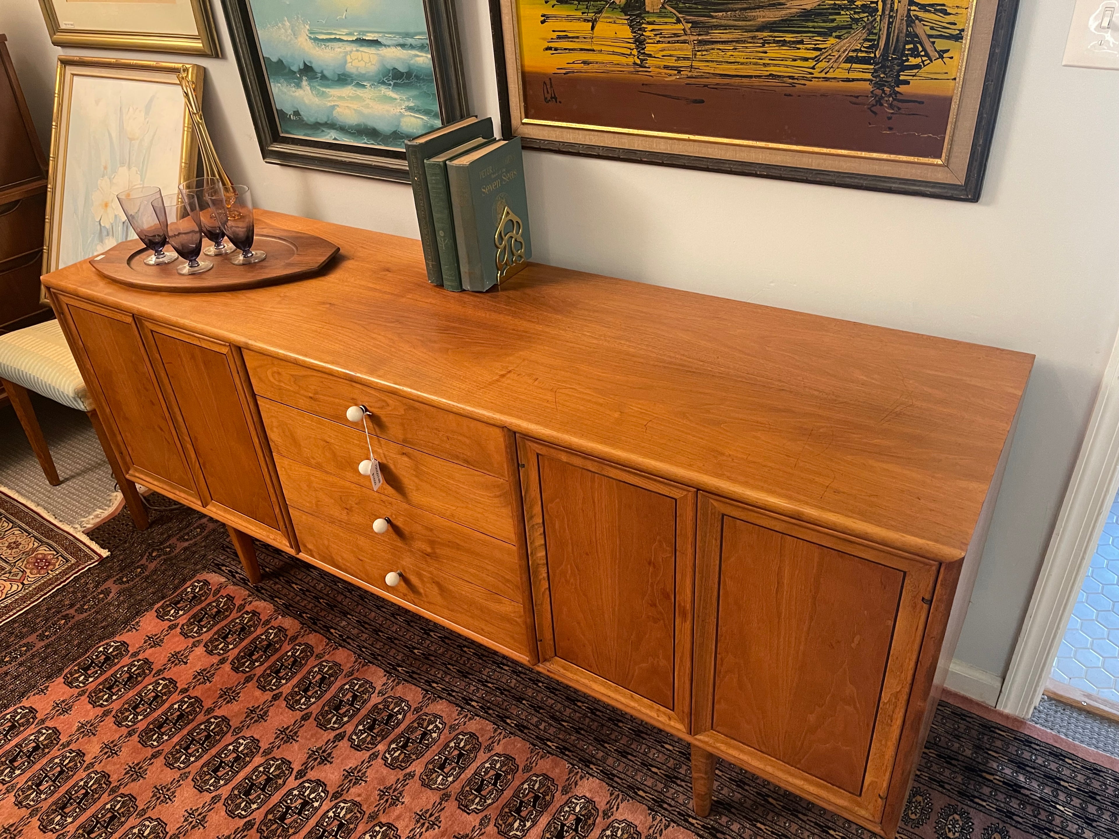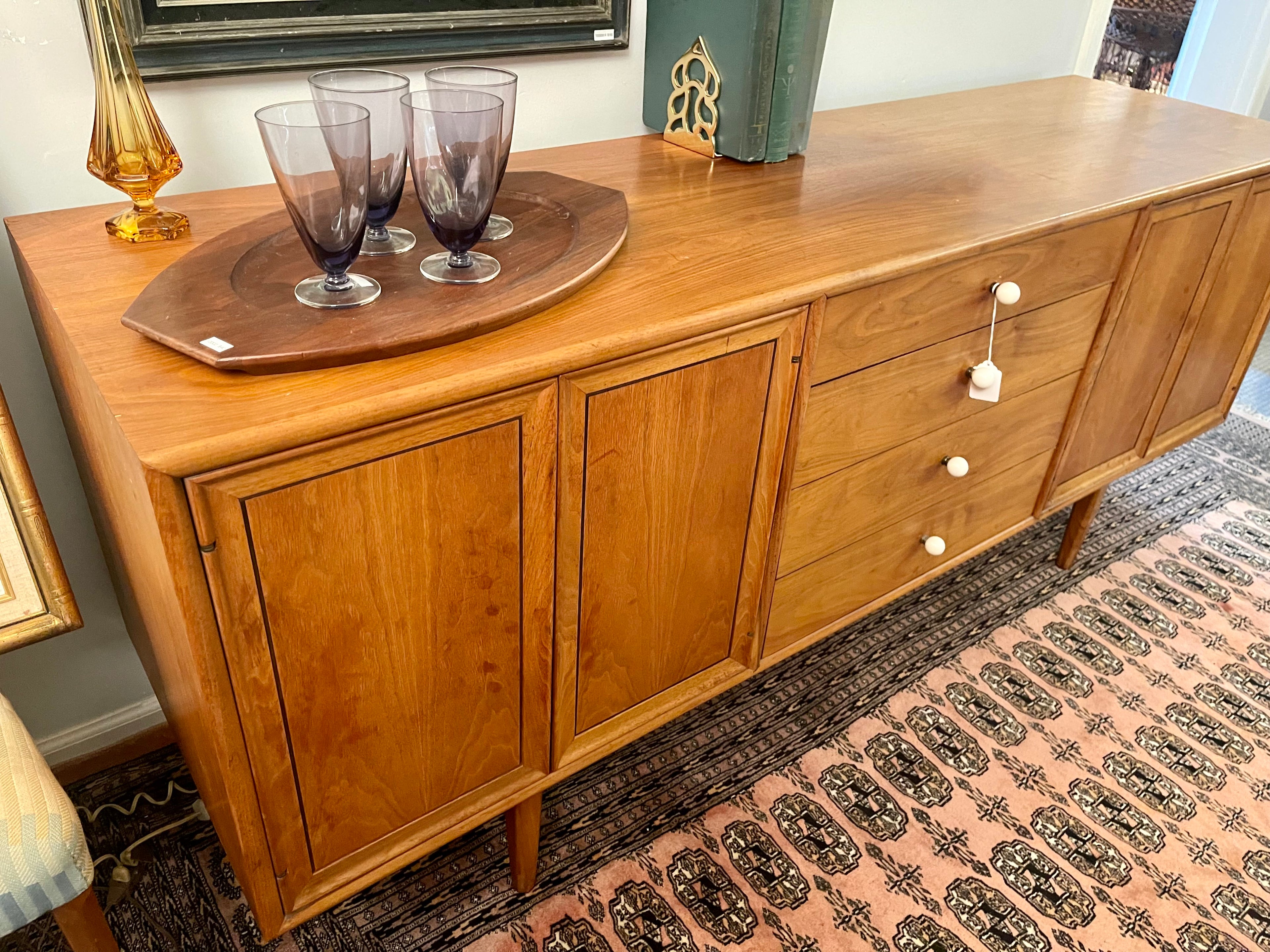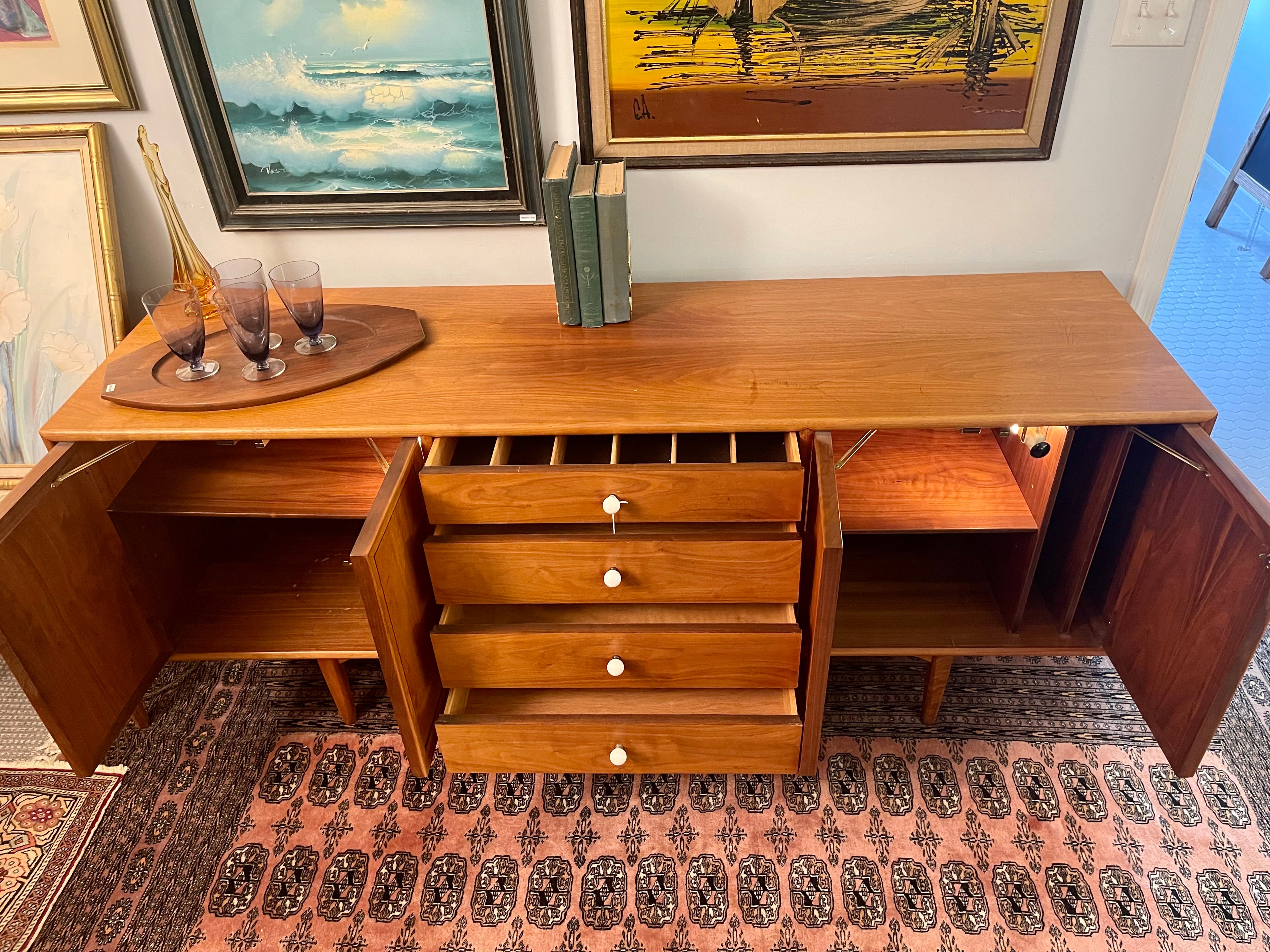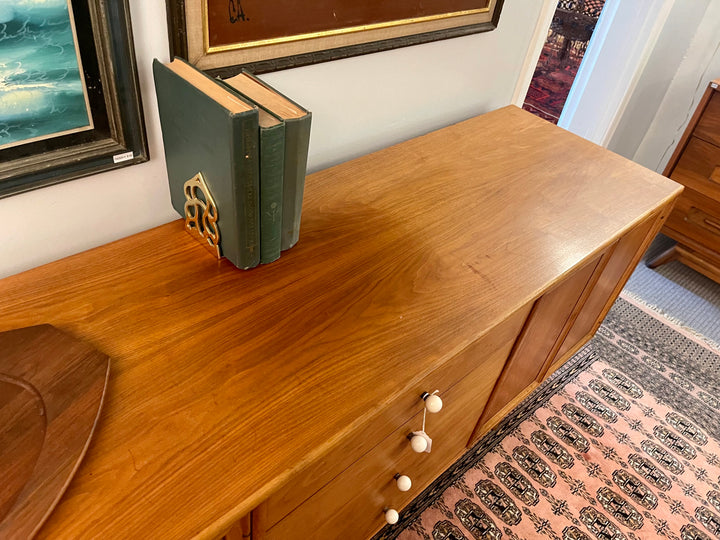 Beautiful Mid Century Modern Lowboy Dresser/Credenza from the famous Drexel Declaration line. Unique porcelain knobs and dramatic wood grain combine with classic MCM lines to makes this one of the most desirable and collected pieces on the market. Tons of functional storage and all of the style. This vintage piece does have some blemishes one would expect of a piece this age but overall has a beautiful patina and is ready for the next 60 years!