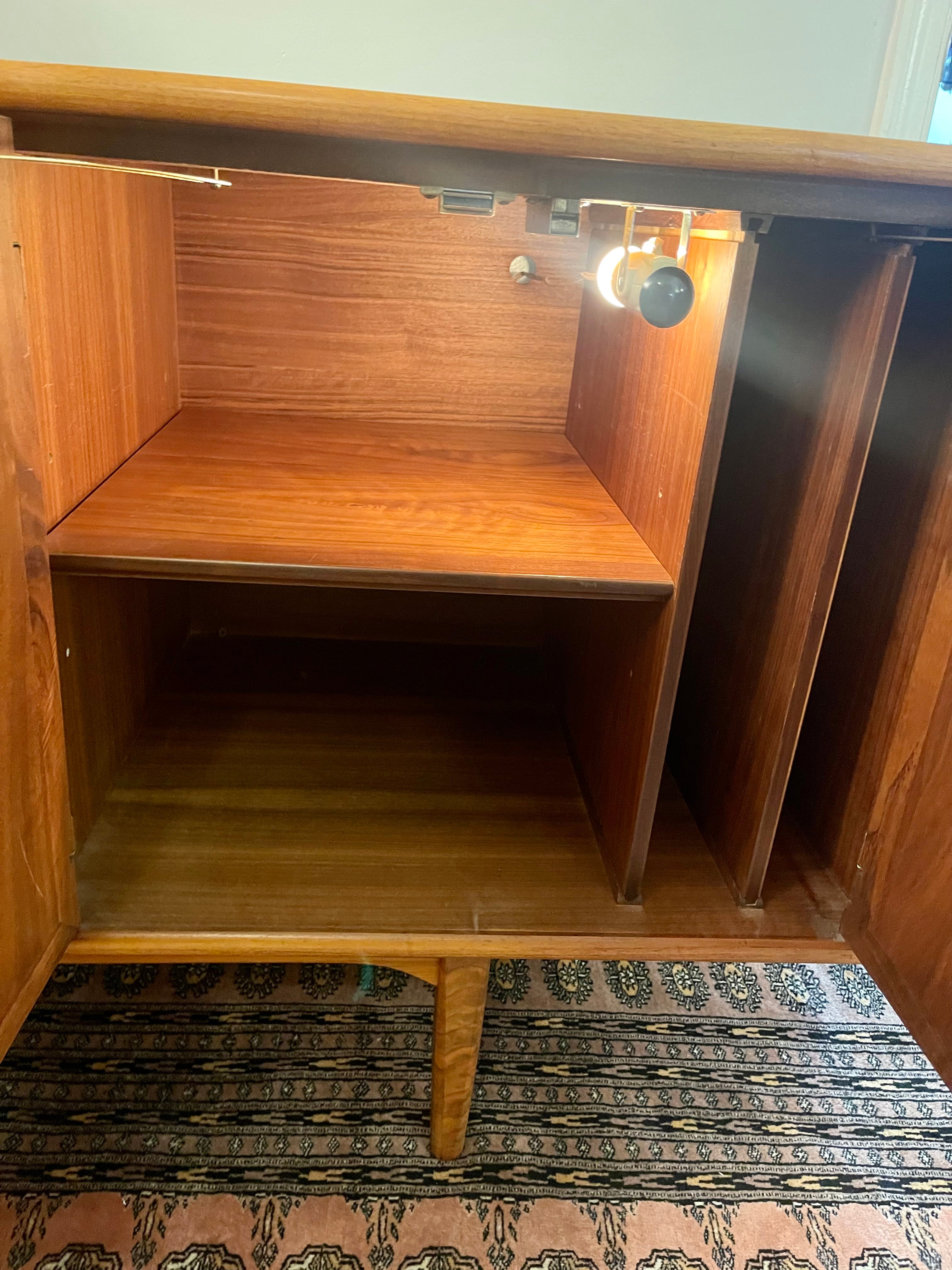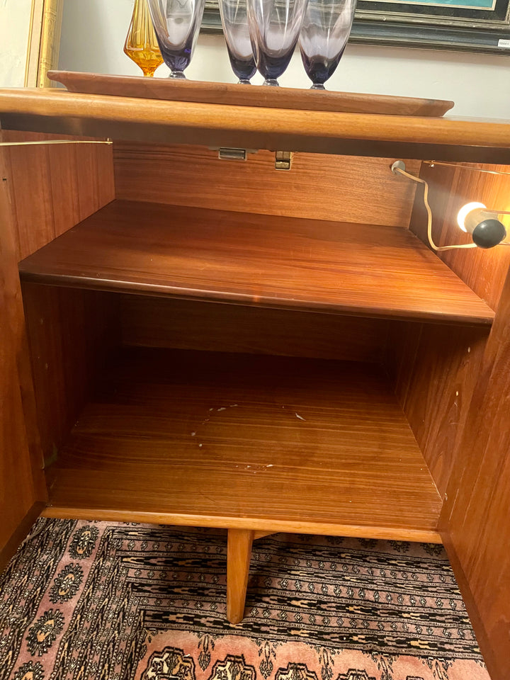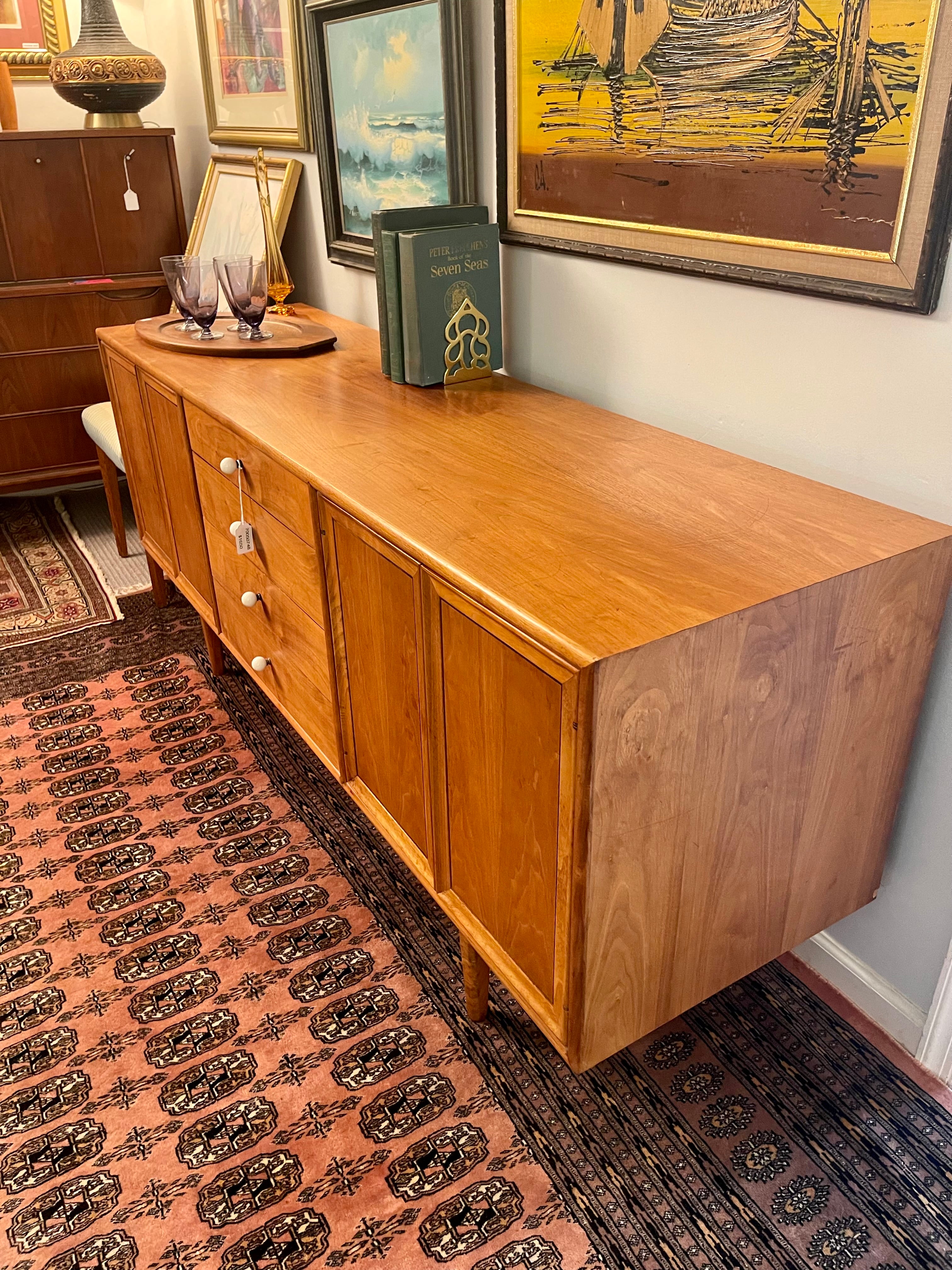 Beautiful Mid Century Modern Lowboy Dresser/Credenza from the famous Drexel Declaration line. Unique porcelain knobs and dramatic wood grain combine with classic MCM lines to makes this one of the most desirable and collected pieces on the market. Tons of functional storage and all of the style. This vintage piece does have some blemishes one would expect of a piece this age but overall has a beautiful patina and is ready for the next 60 years!