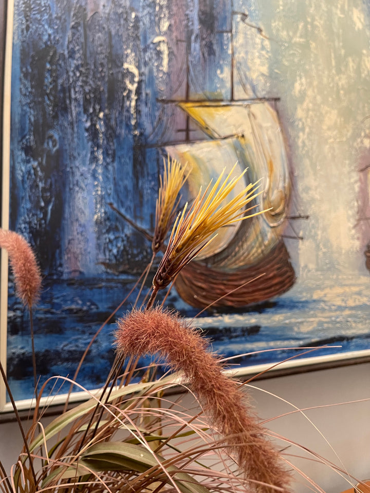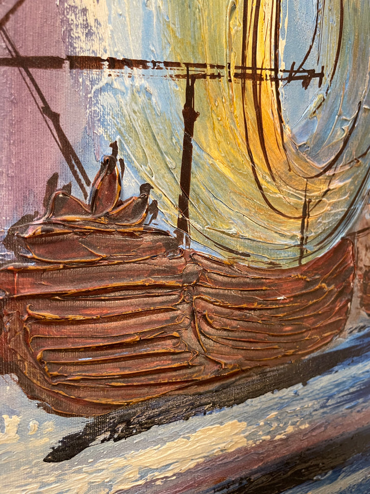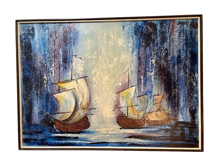 Large Midcentury Modern Oil Painting Depicting Ships at Sea Signed Val
