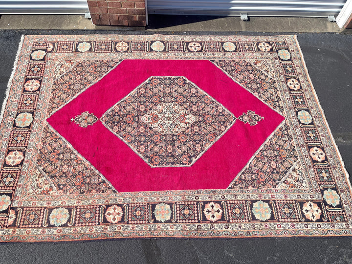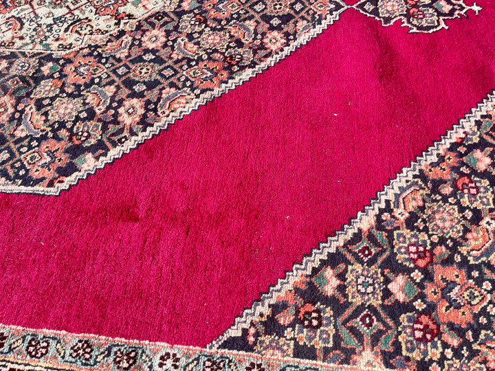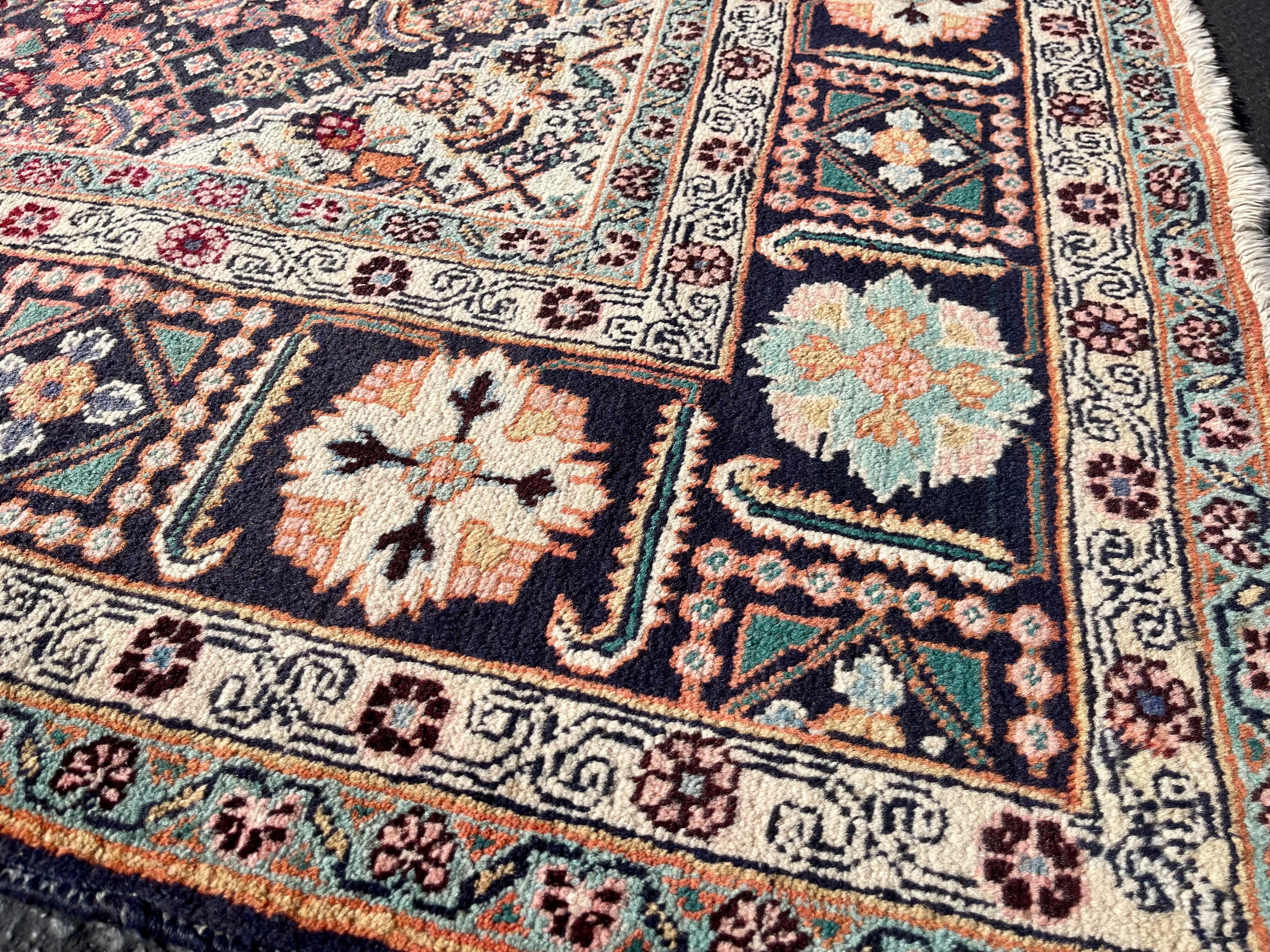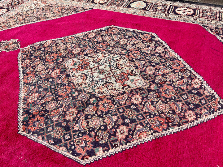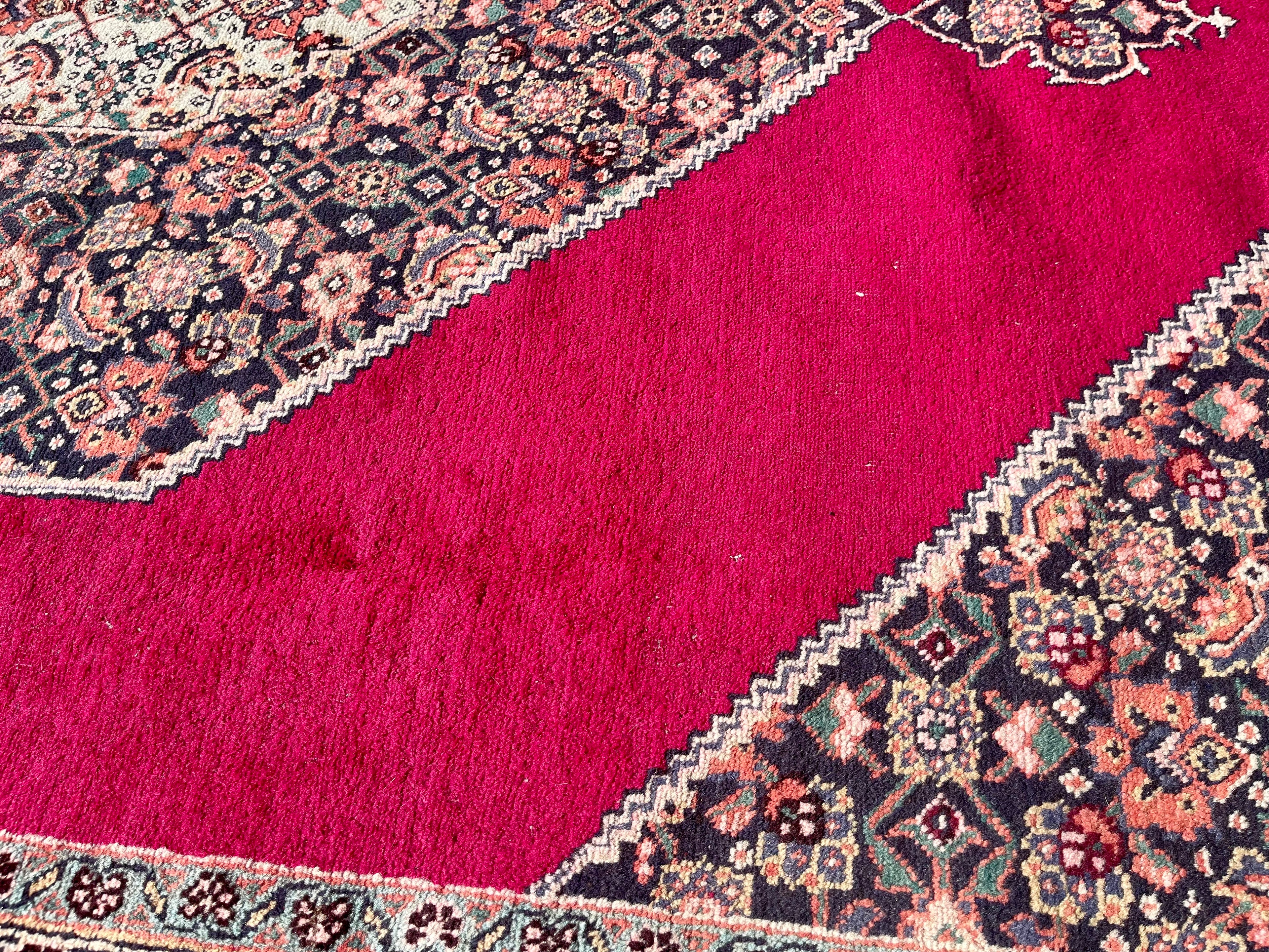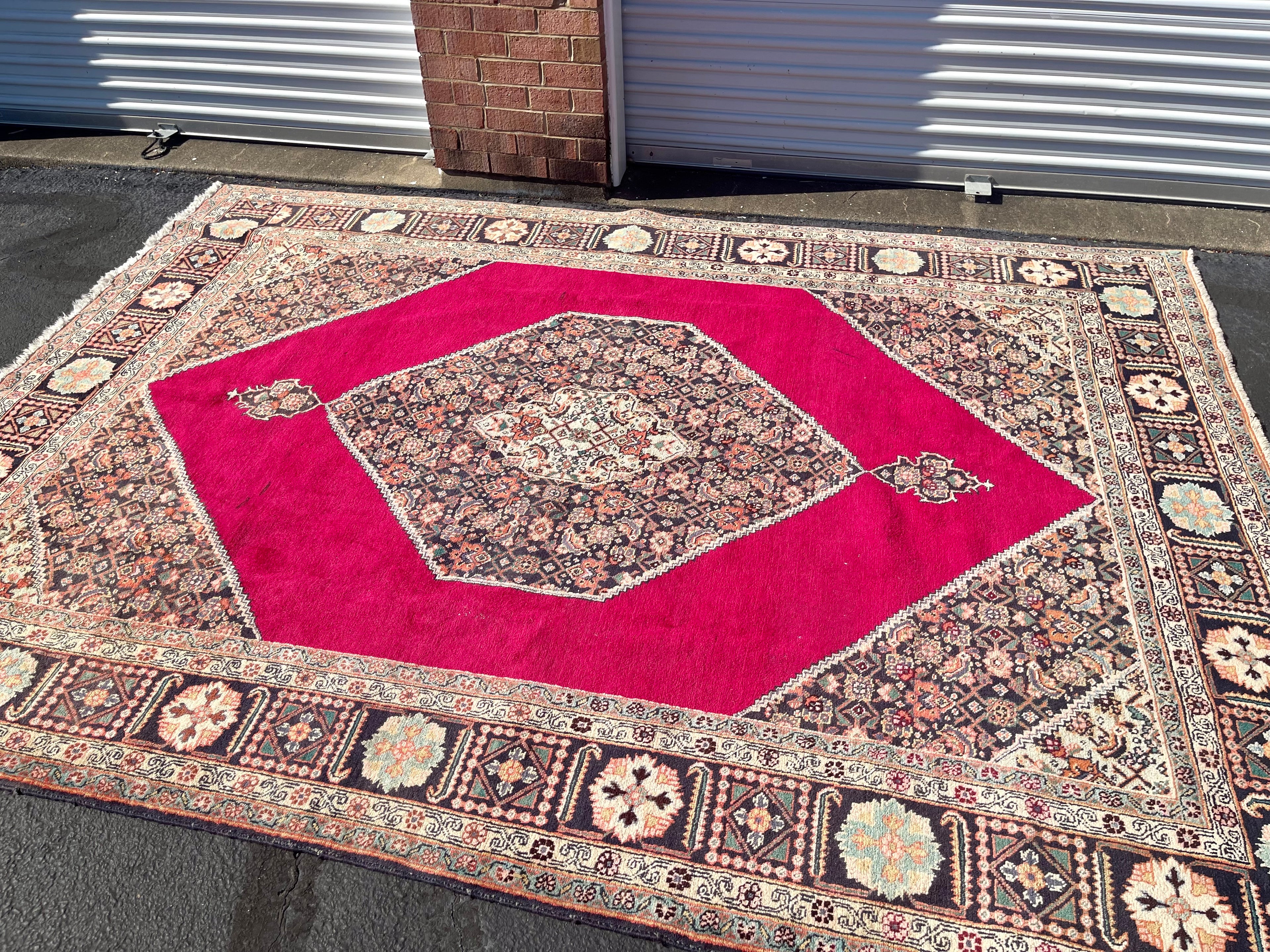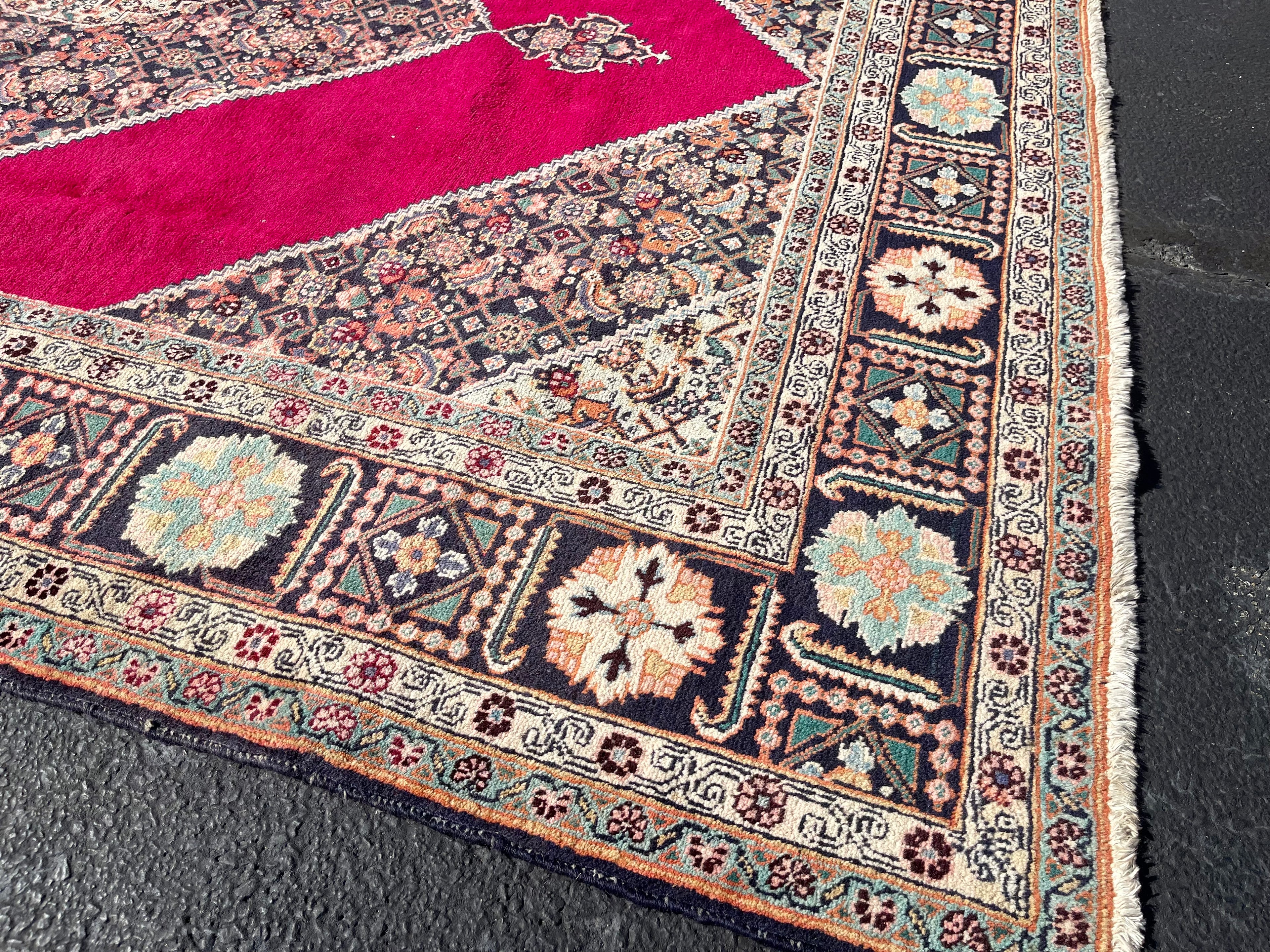 Beautiful hand-knotted oriental large area rug. This rug has a unique pattern with striking red around the central medallion, with a very thick trim of navy, coral, and lighters blue. Lovely for a living room, dining room or bedroom.