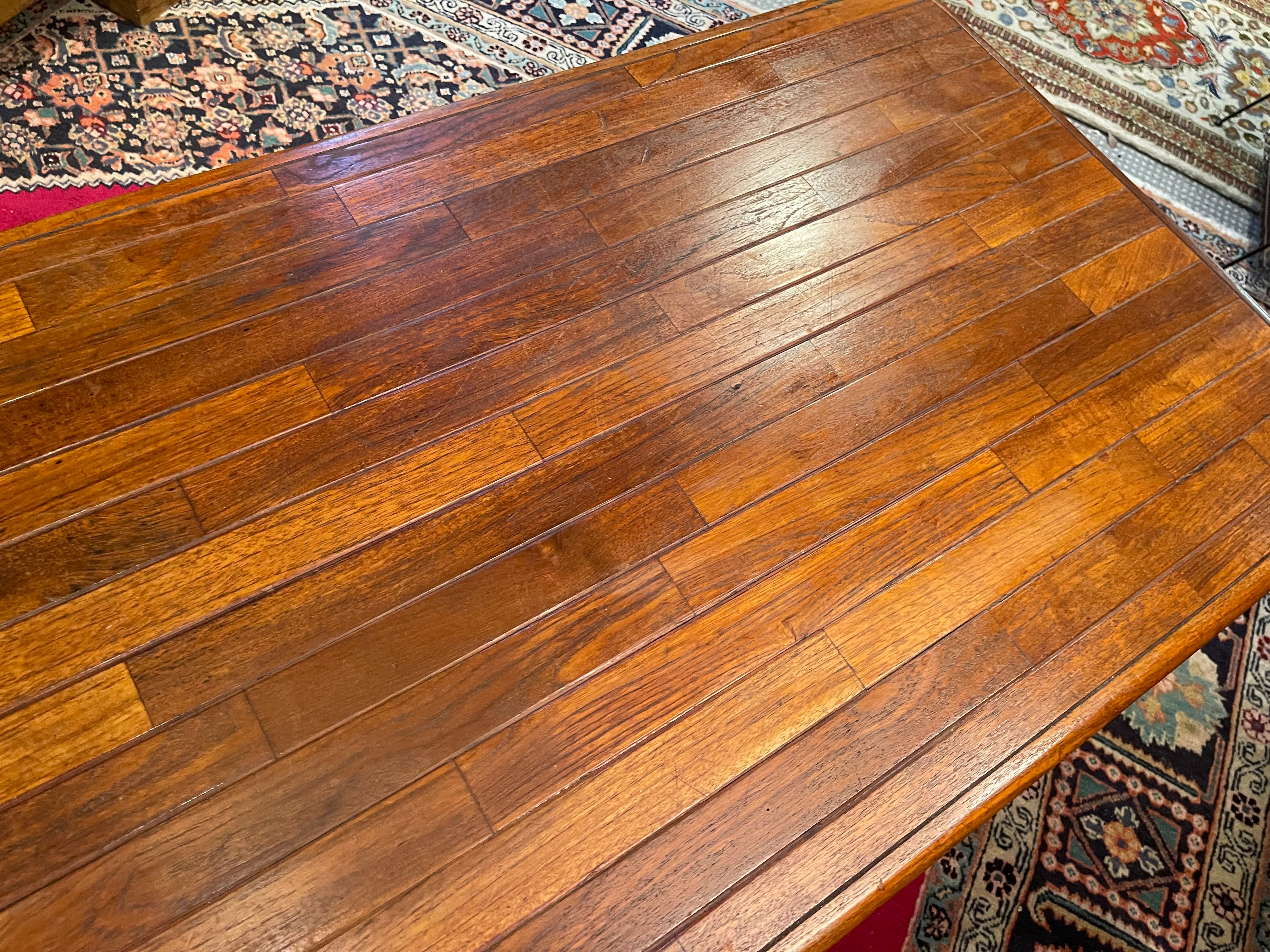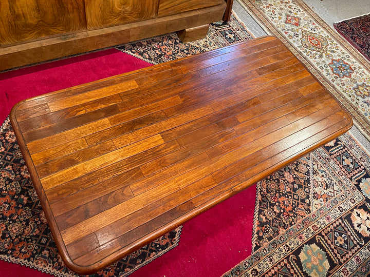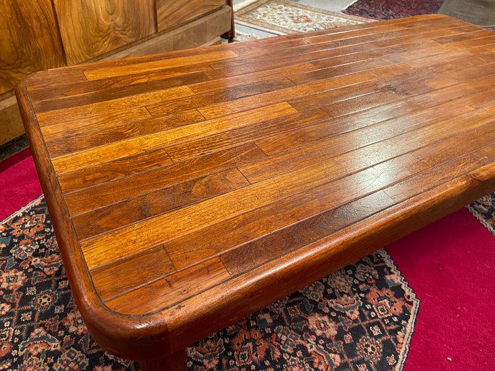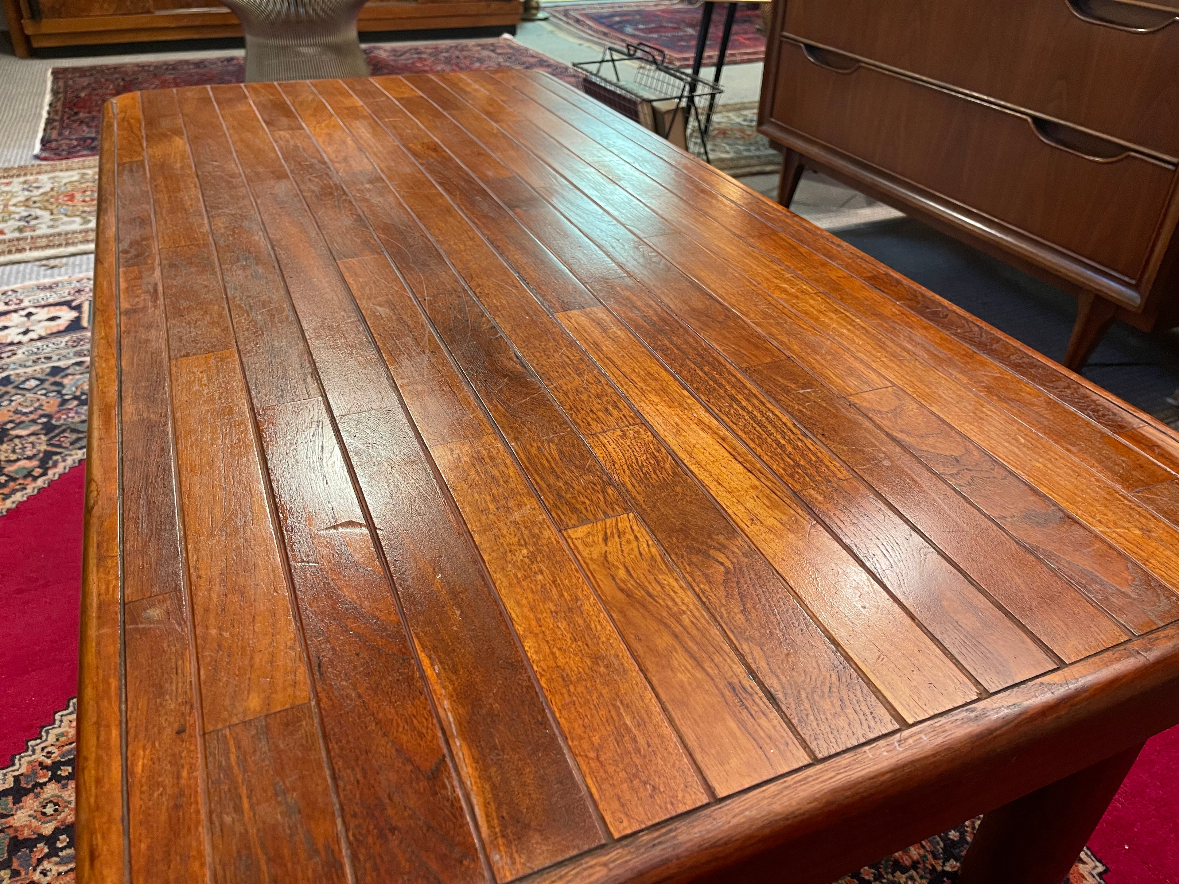 Scandinavian modern with a rustic twist, this teak coffee table is certainly a unique offering. Striking teak throughout with a great vintage patina, the top of the table is arranged in a pattern resembling butcher block. Thick solid teak legs makes this a very sturdy piece. Likely Danish but unsure of manufacturer. Matching side table available but needs to be refinished first.