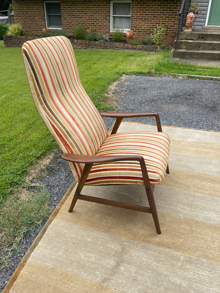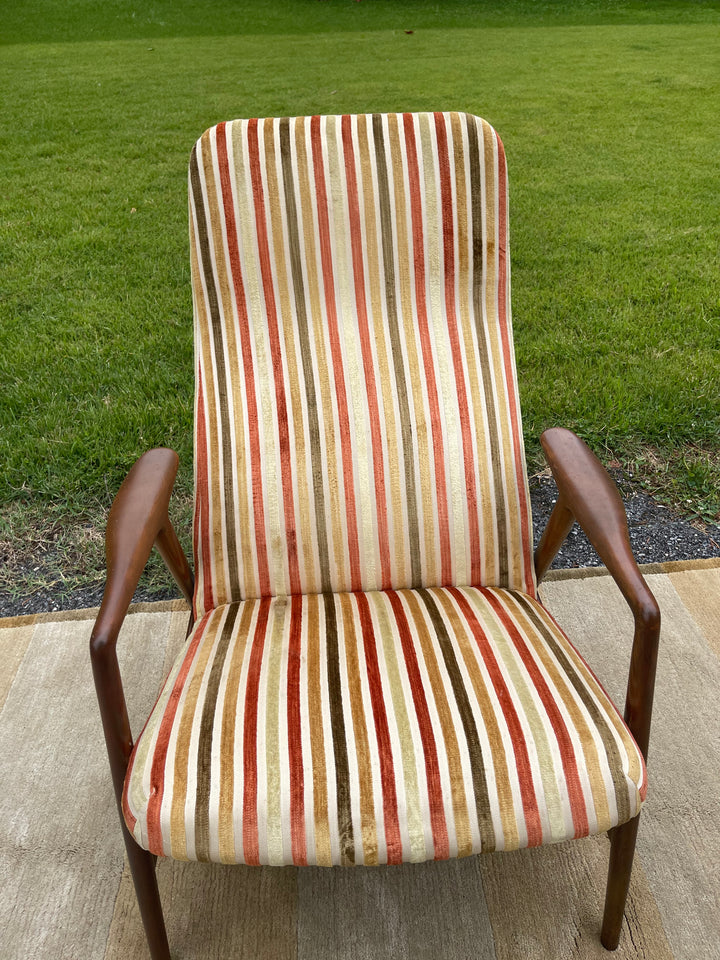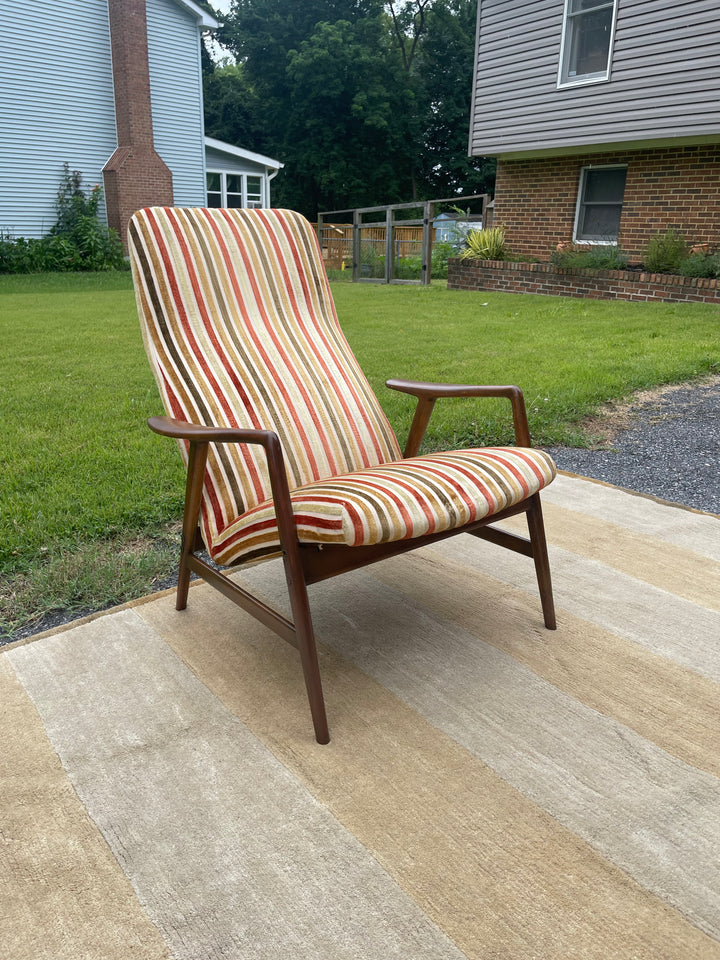 Incredibly comfortable and stylish chair from Alf Svennson (Sweden). This Scandinavian Modern chair features a sculptural wood frame with elegantly curved arms and subtly tapered legs. The adjustable seat reclines in two positions, providing excellent comfort in a small footprint. Reupholstered.