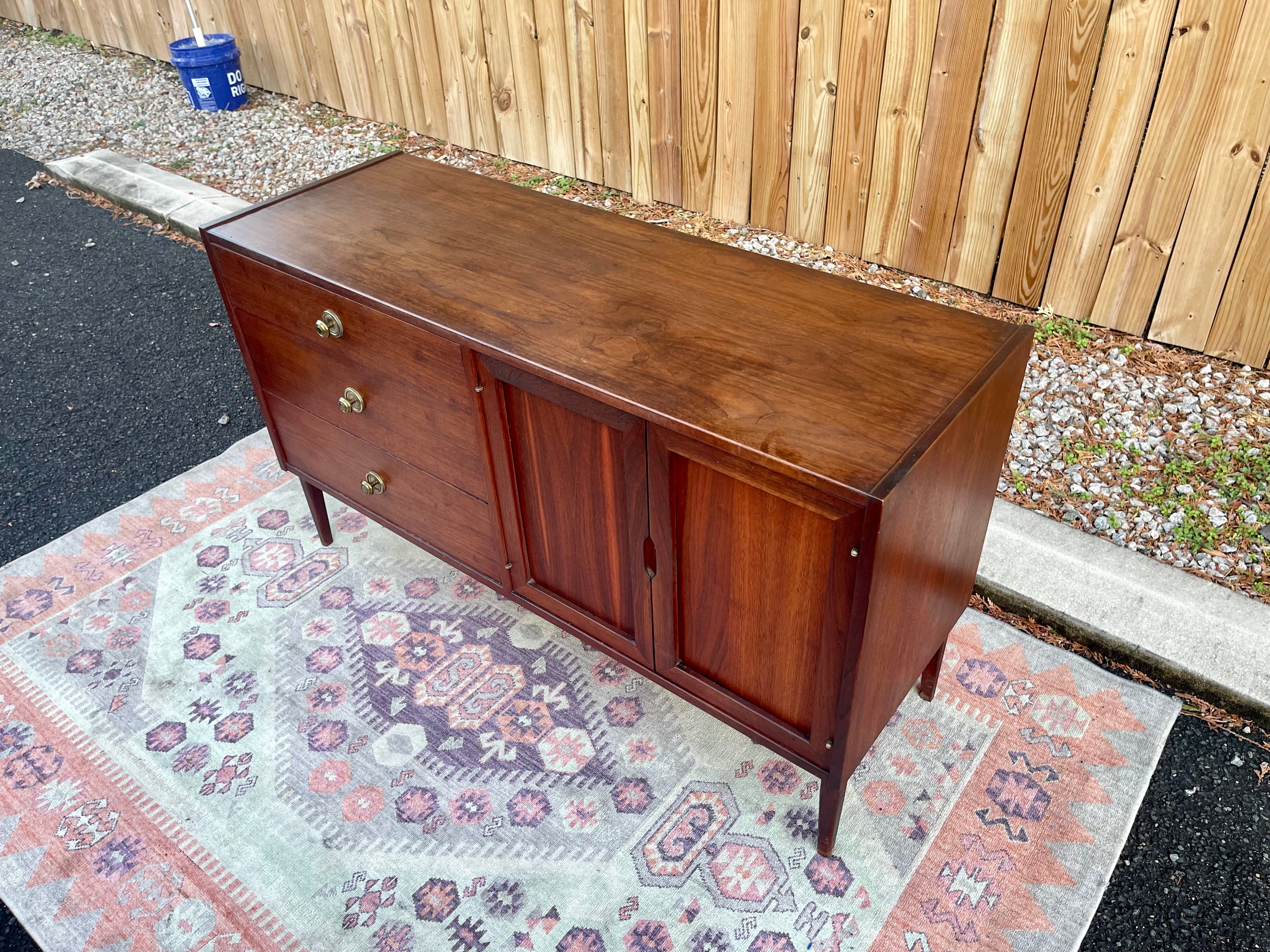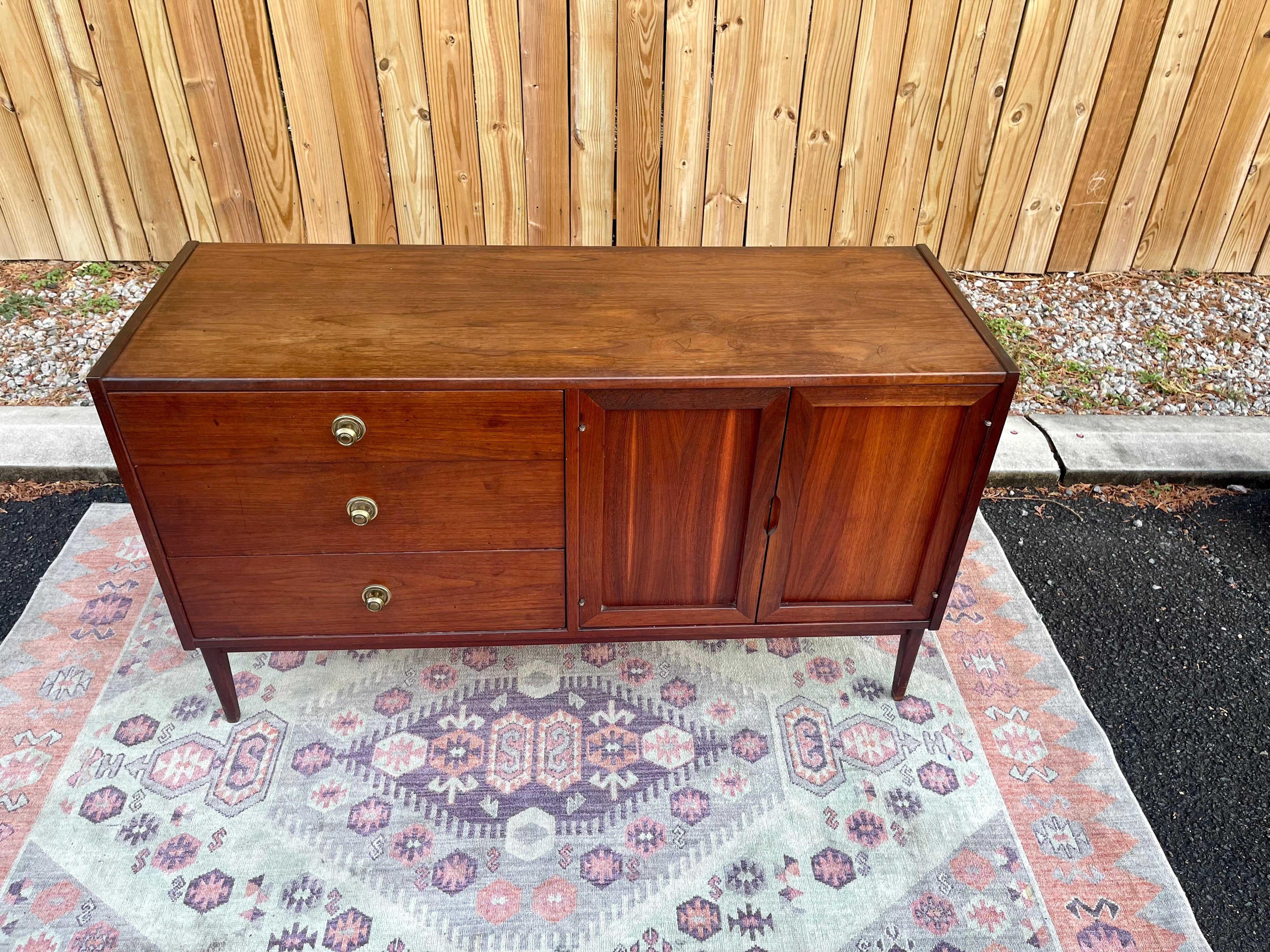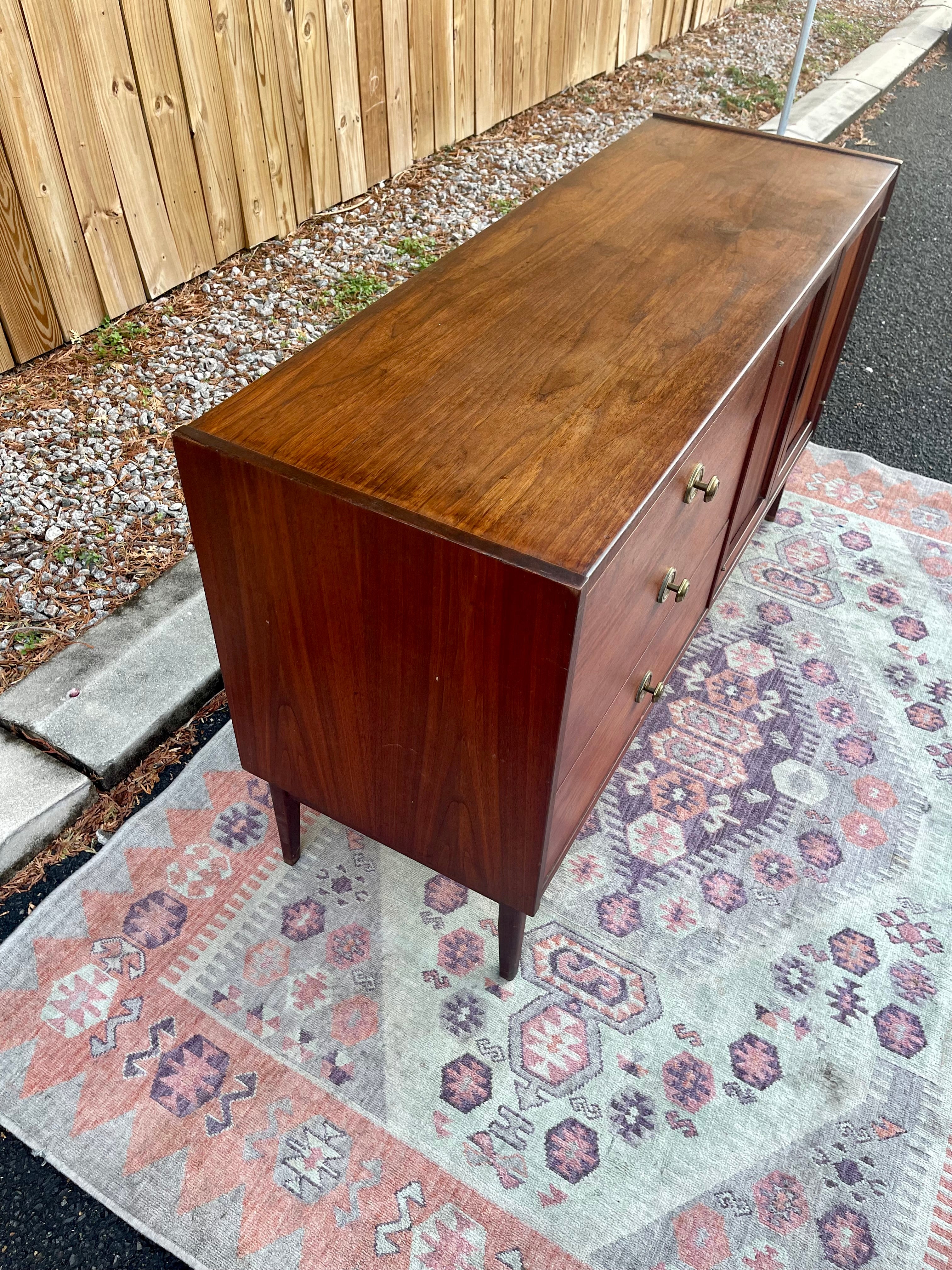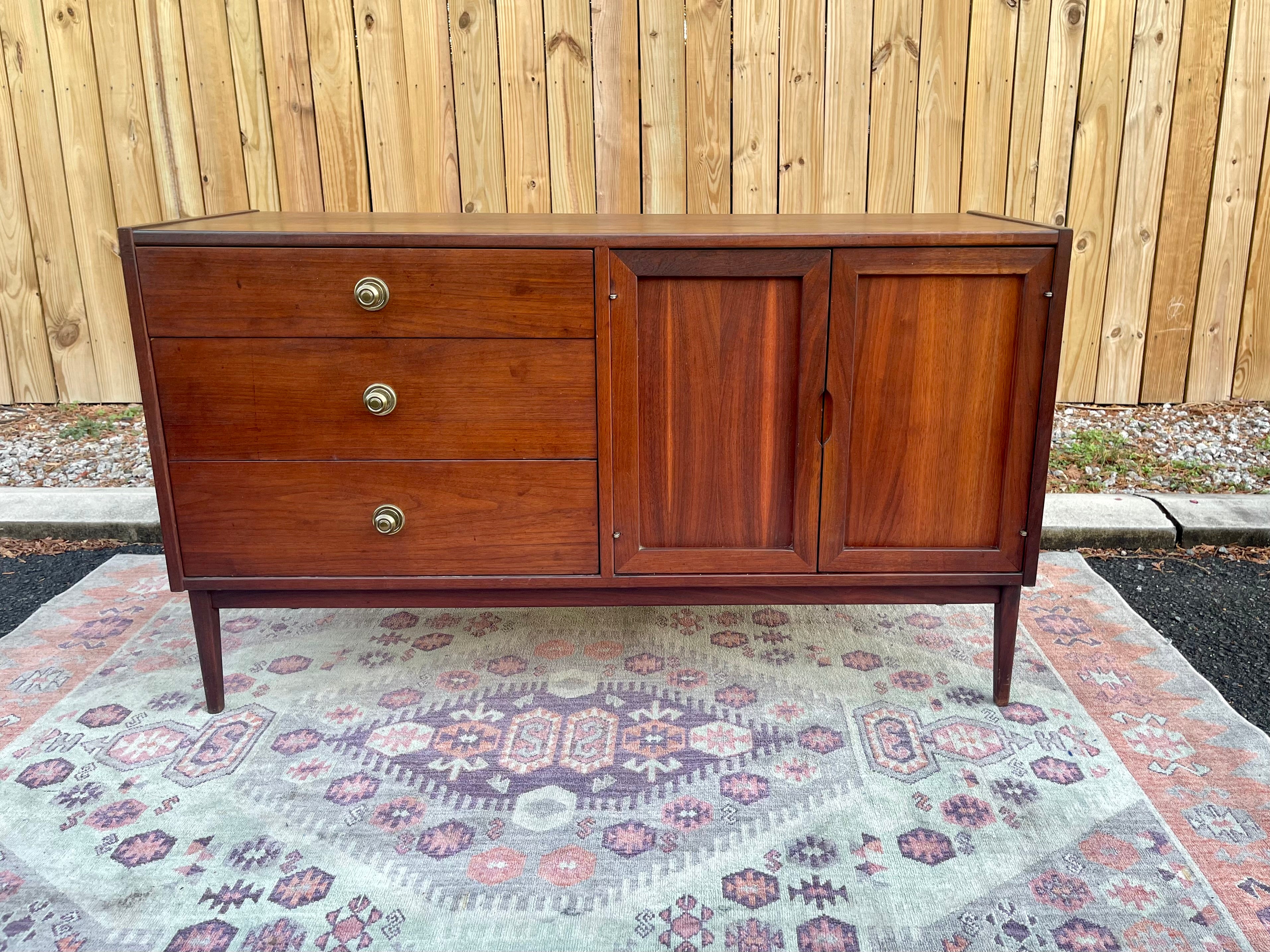 The striking wood grain on this petite Midcentury modern credenza really sets in apart. This piece is in good vintage condition with wear expected of a piece it’s age. The vintage patina on this is still beautiful and has an unmatched depth to it. Cabinet and drawer storage in an ideal footprint!