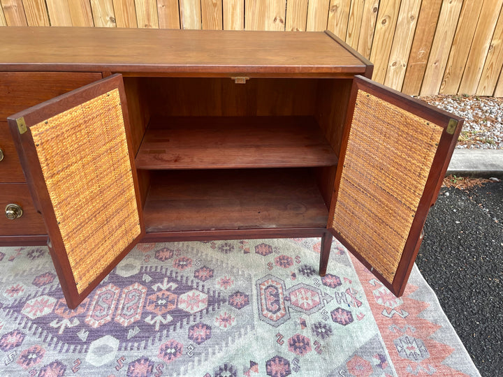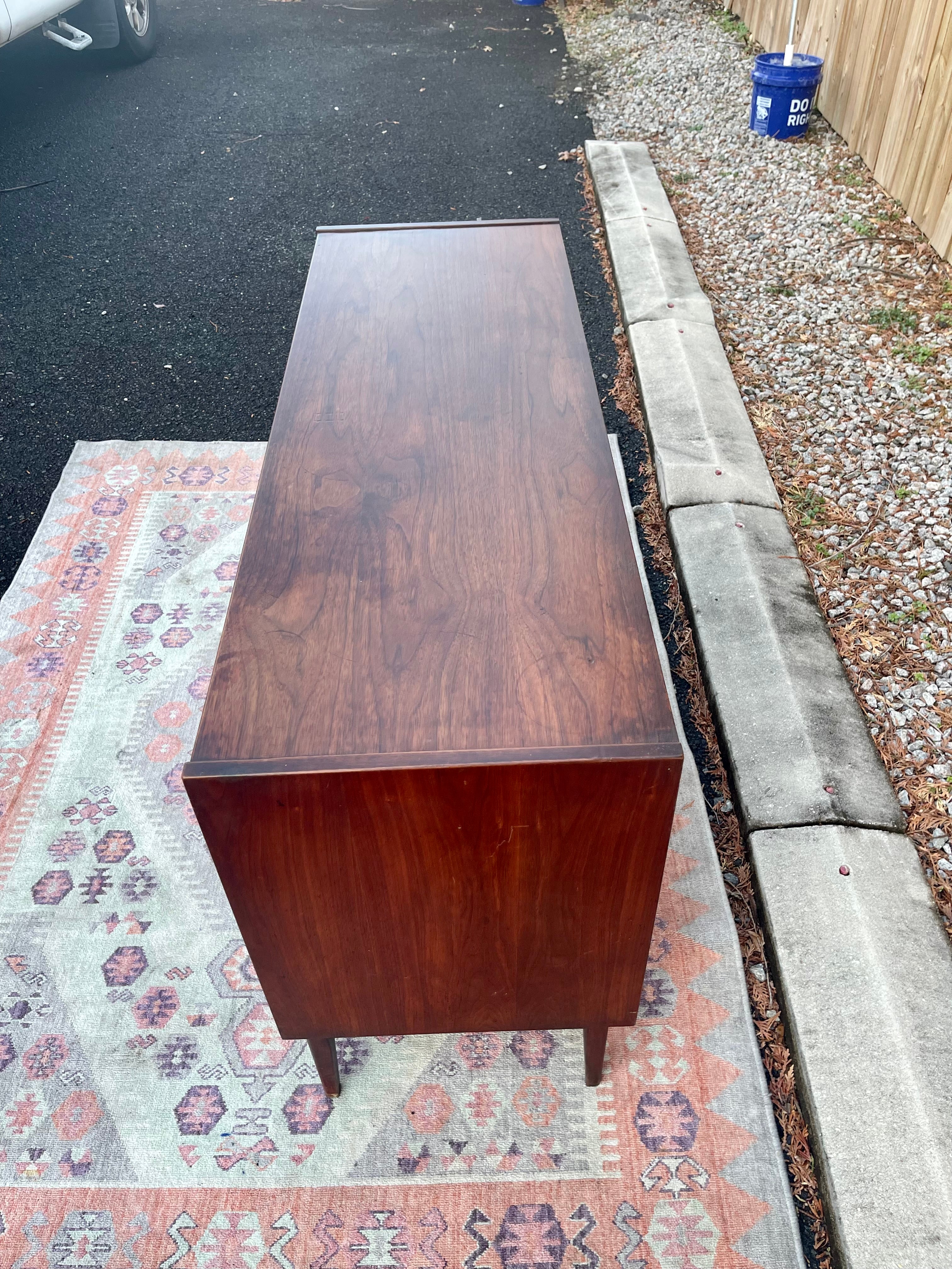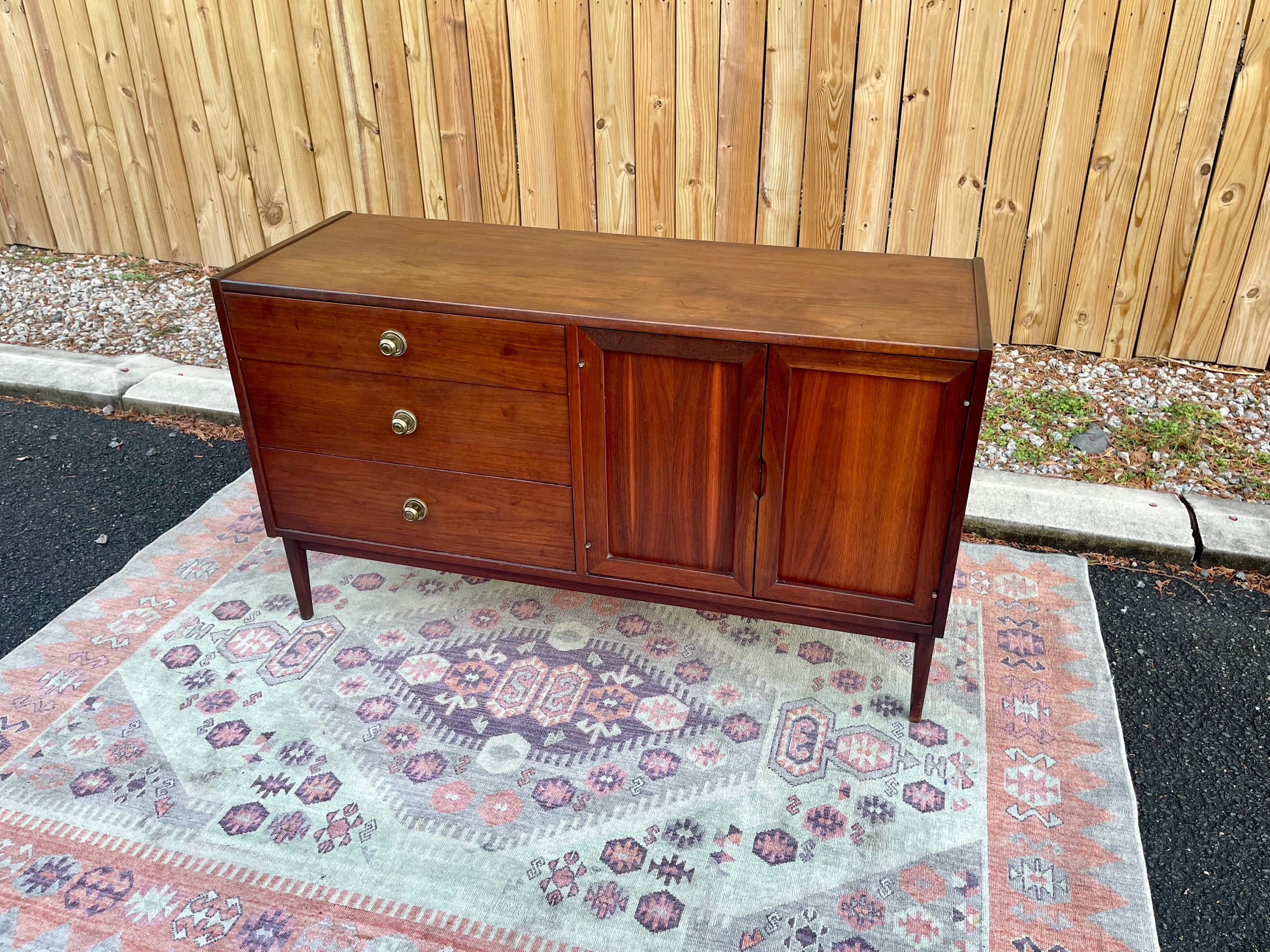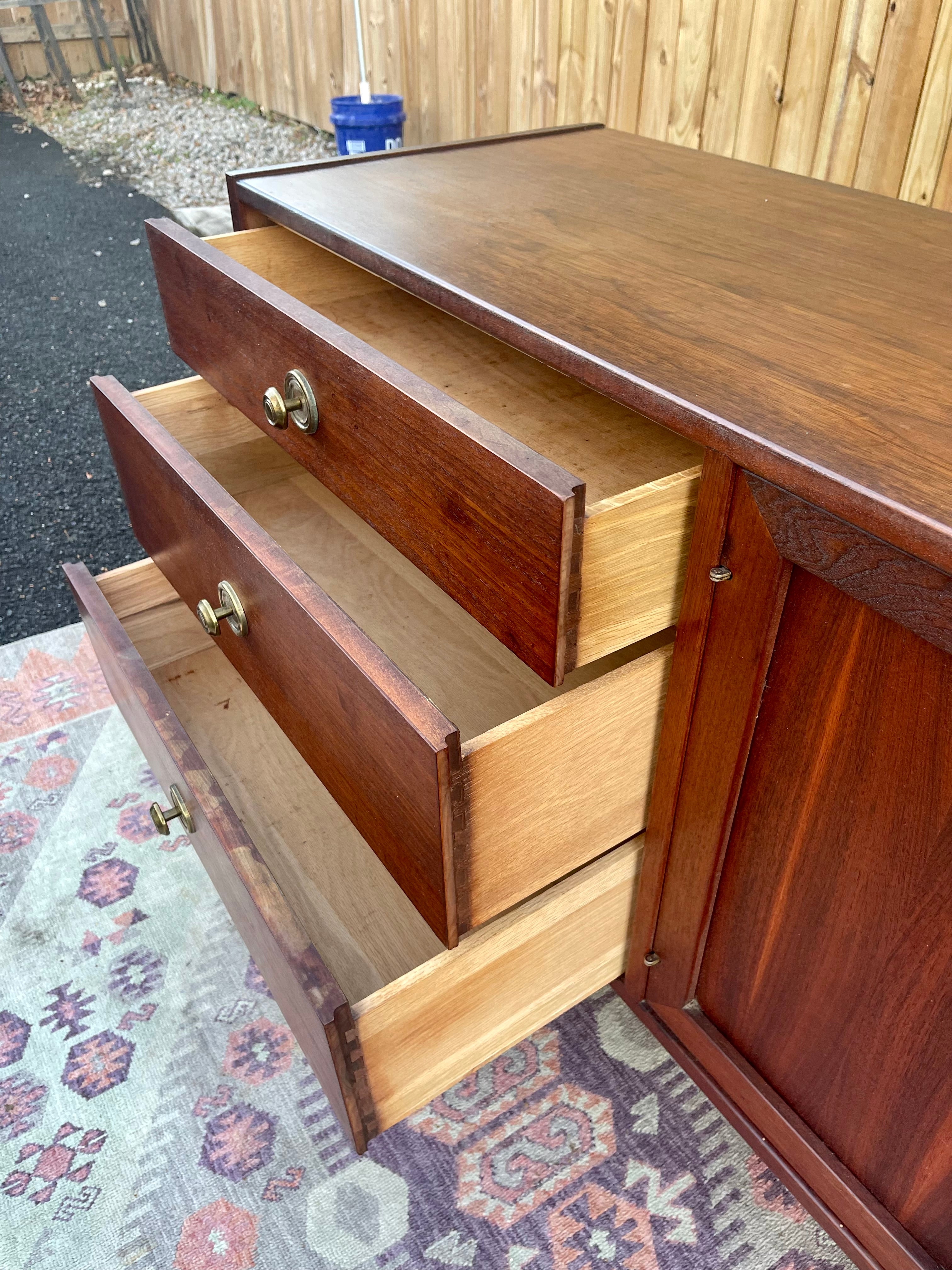 The striking wood grain on this petite Midcentury modern credenza really sets in apart. This piece is in good vintage condition with wear expected of a piece it’s age. The vintage patina on this is still beautiful and has an unmatched depth to it. Cabinet and drawer storage in an ideal footprint!