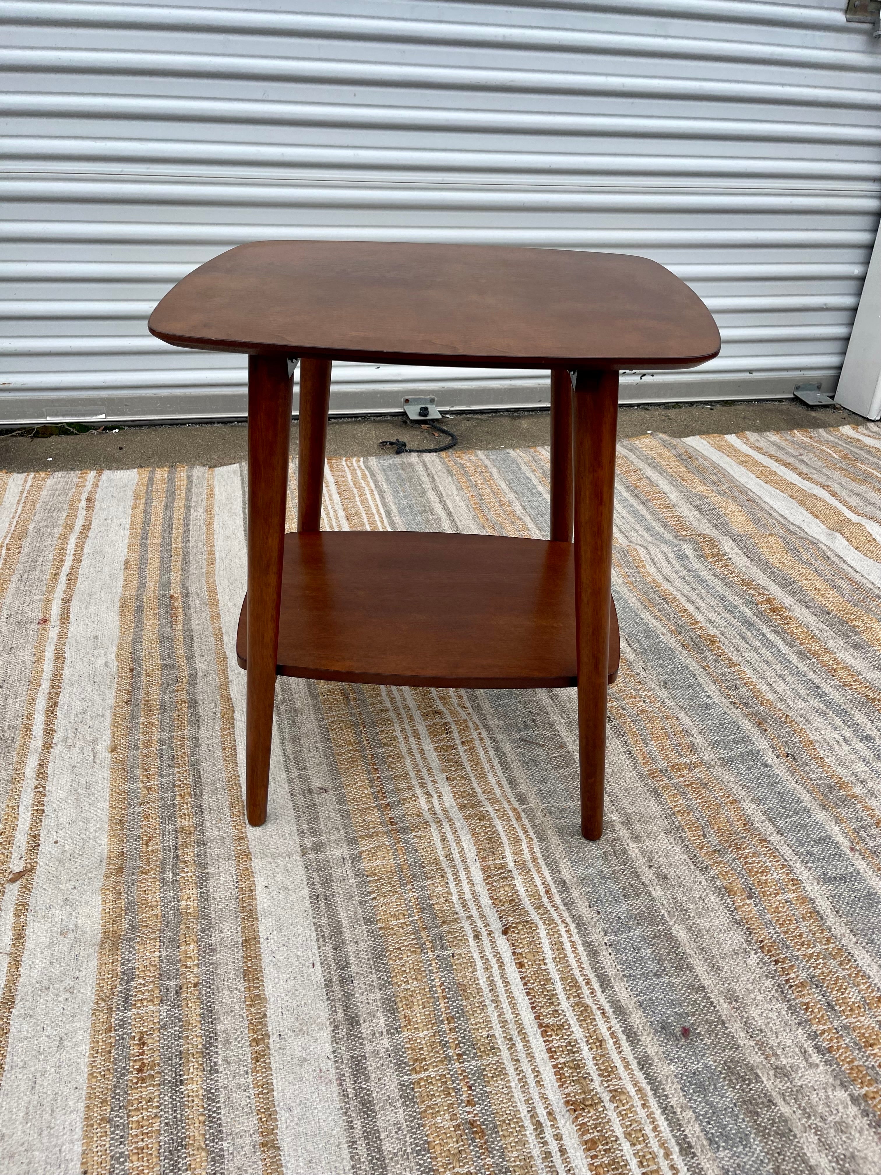 Contemporary MCM style side table. Two tiered with classic tapered legs. Ideal in a living room or bedroom, or even as a cute plant stand.