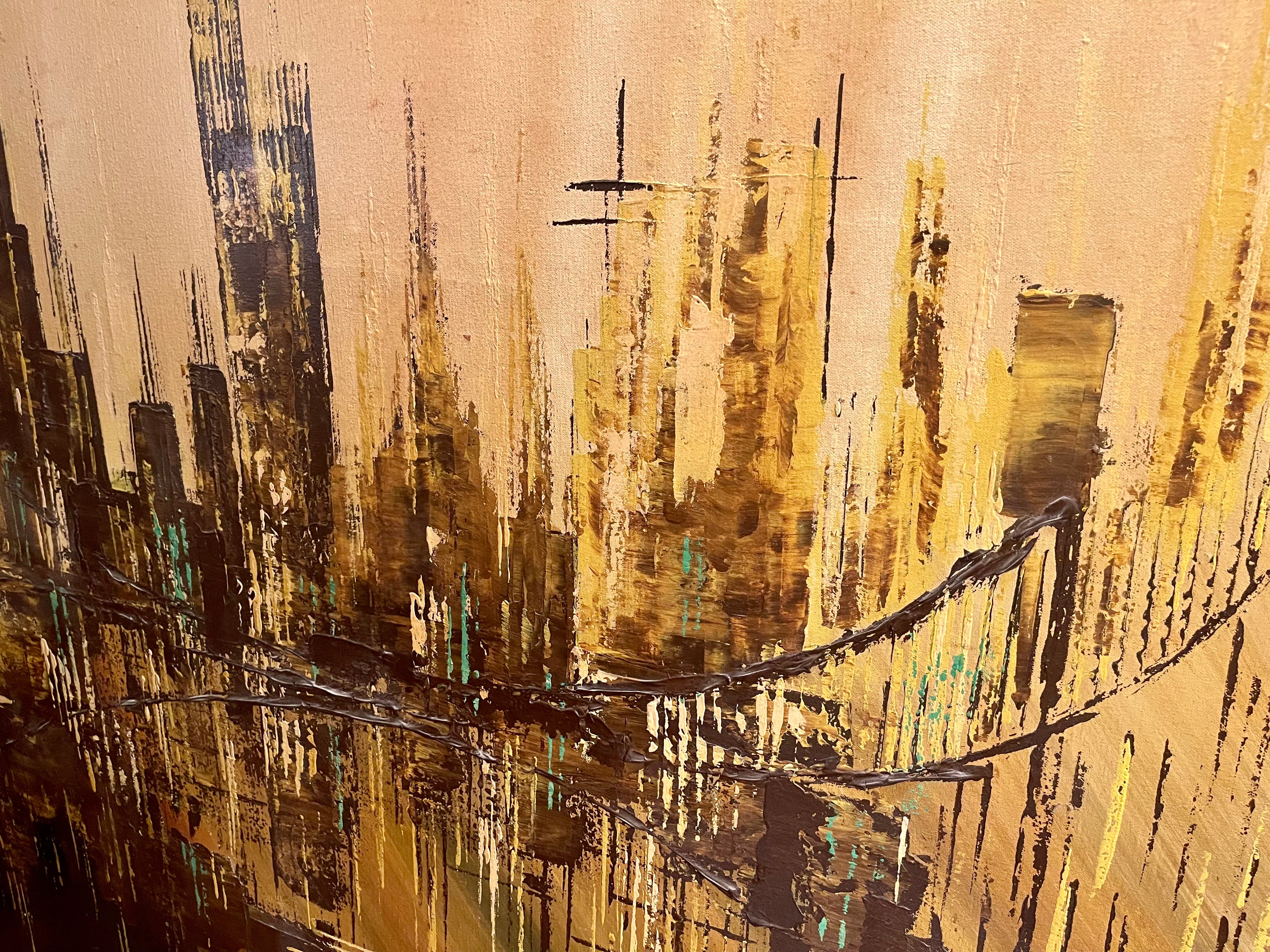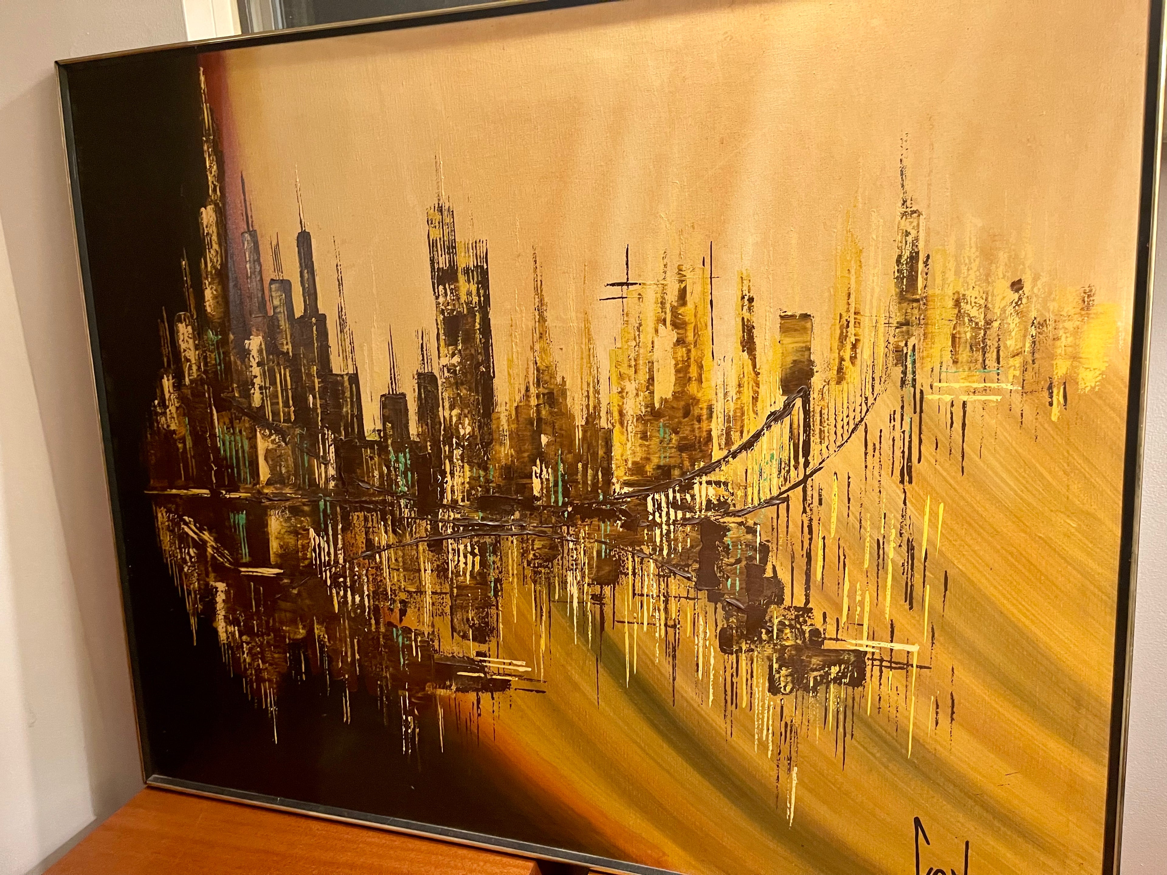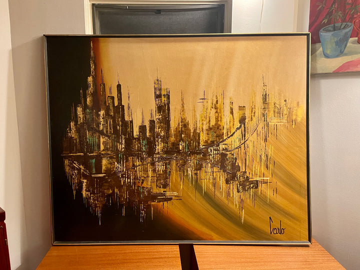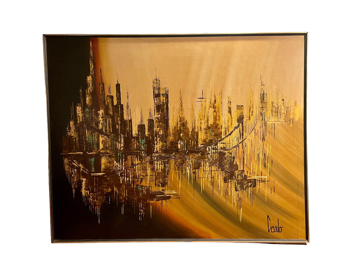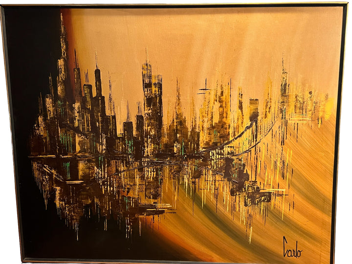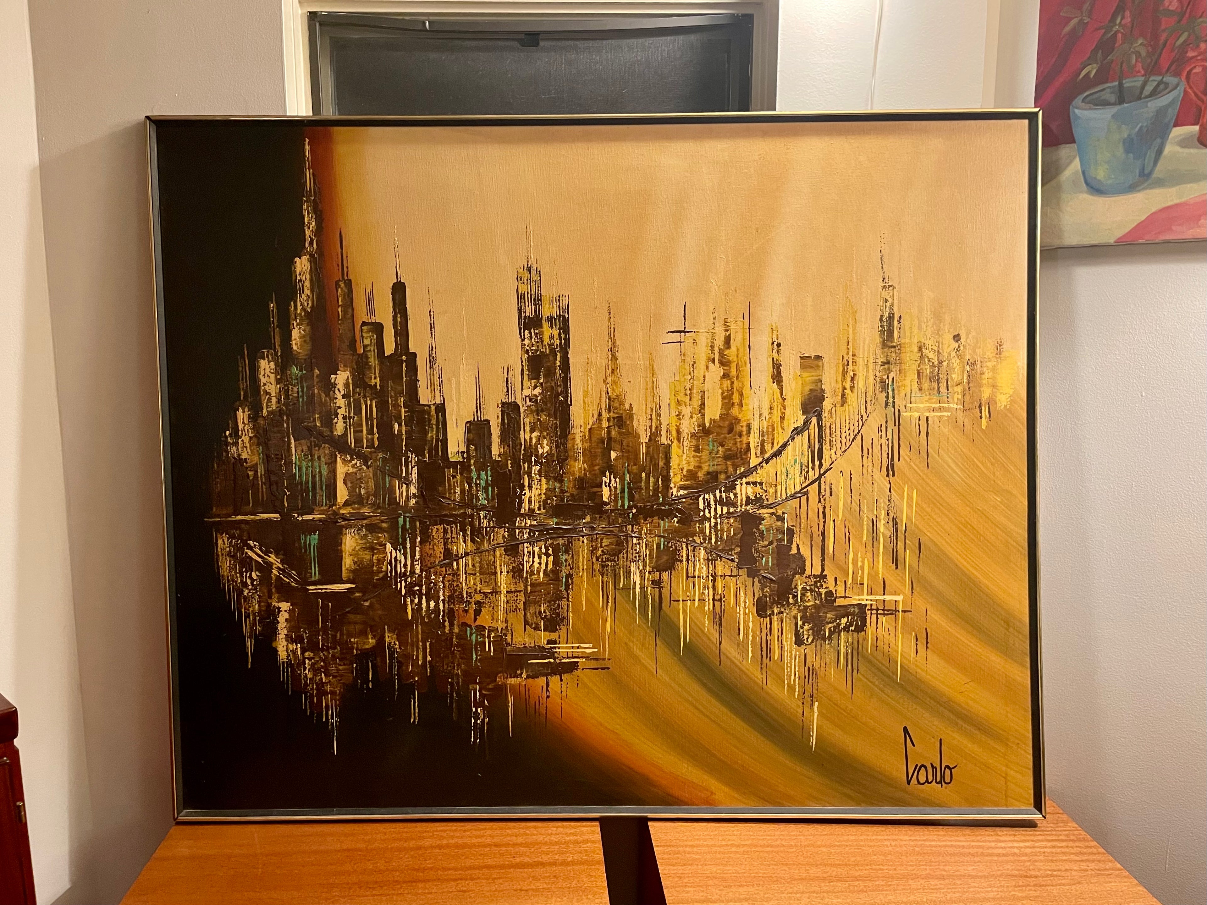 A striking example of the mid century modern cityscape, this large oil painting by Carlo of Hollywood is a perfect statement piece for your home. Carlo of Hollywood was an elusive artist who crested art from the 50’s to the late 1970’s. This talented artist is rumored to have done set design for the I Love Lucy television show. Wonderful example of mid century modern artwork. The painting, done with deep umbers, browns, blacks and a hint of green, depicts a condensed New York City skyline.