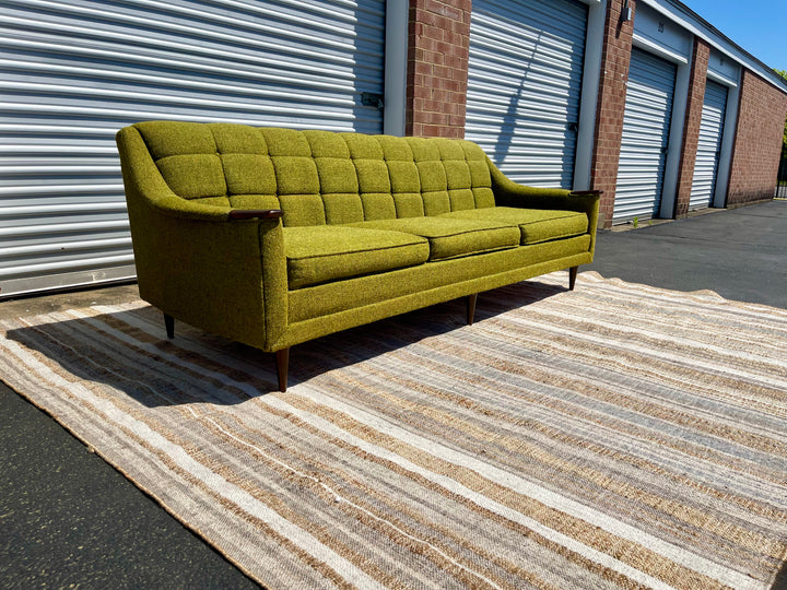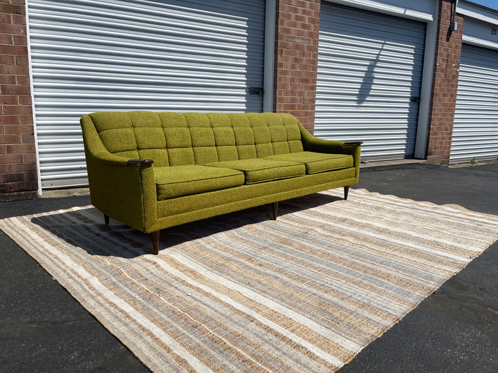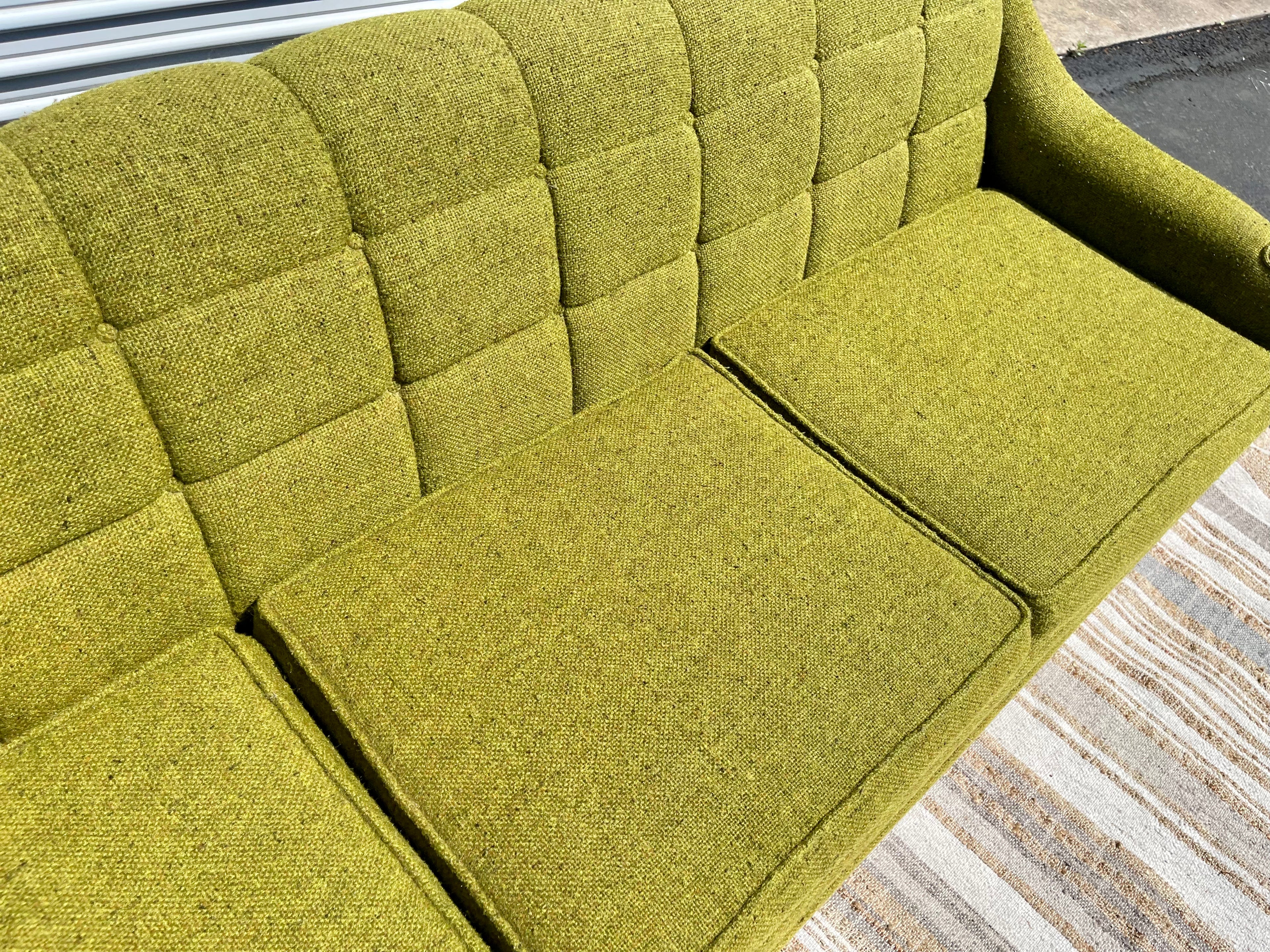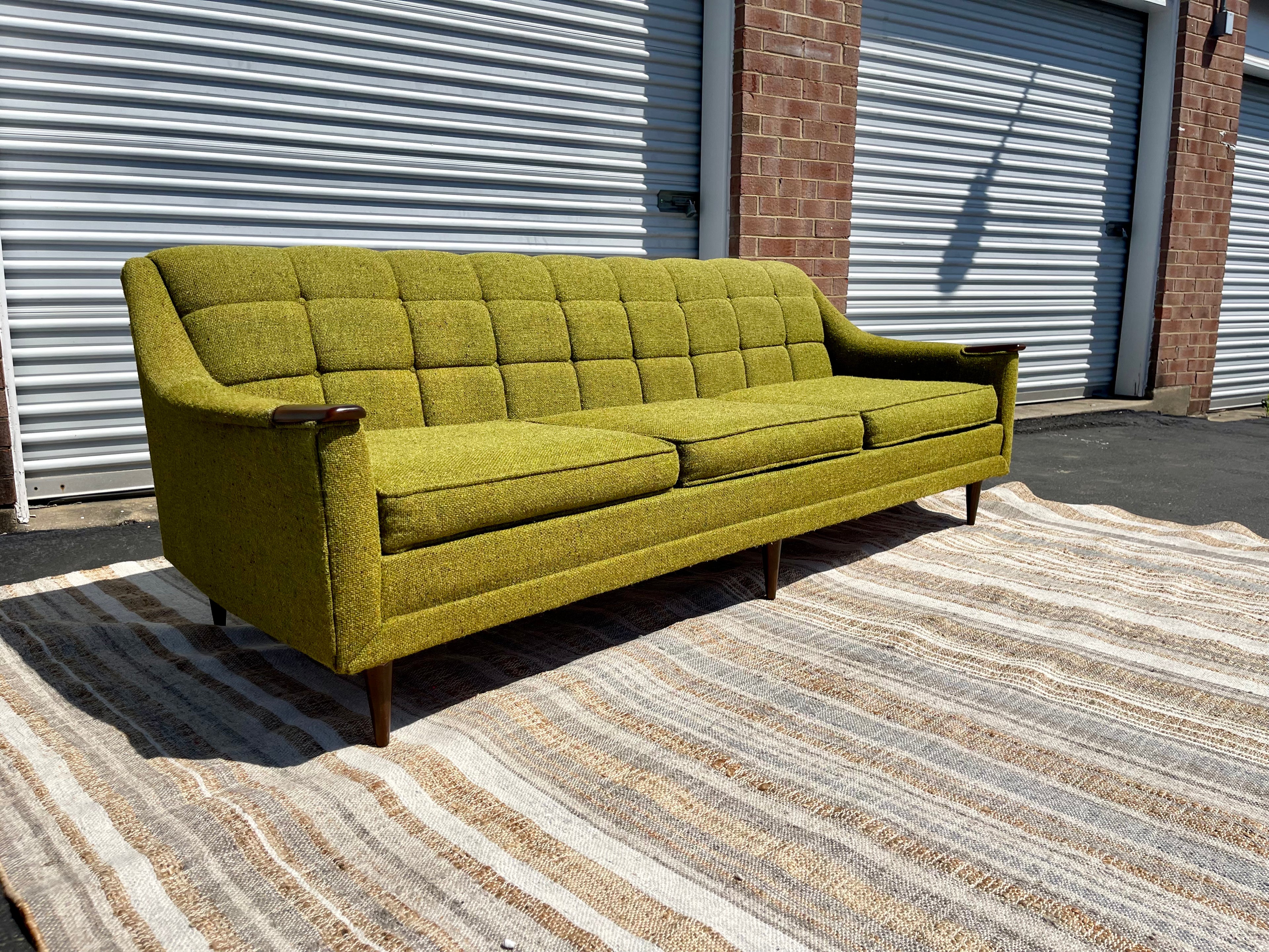 Mid Century Modern Kroehler Avant Designs sofa upholstered in green tweed fabric. In excellent vintage condition; no issues whatsoever with the upholstery. The cushions still have plenty of life in them as well. We refinished the wood armrests and touched up the legs, restoring this beauty to its original vintage condition. The lime green tweed is a classic mid century look, and would be a very fun statement piece!