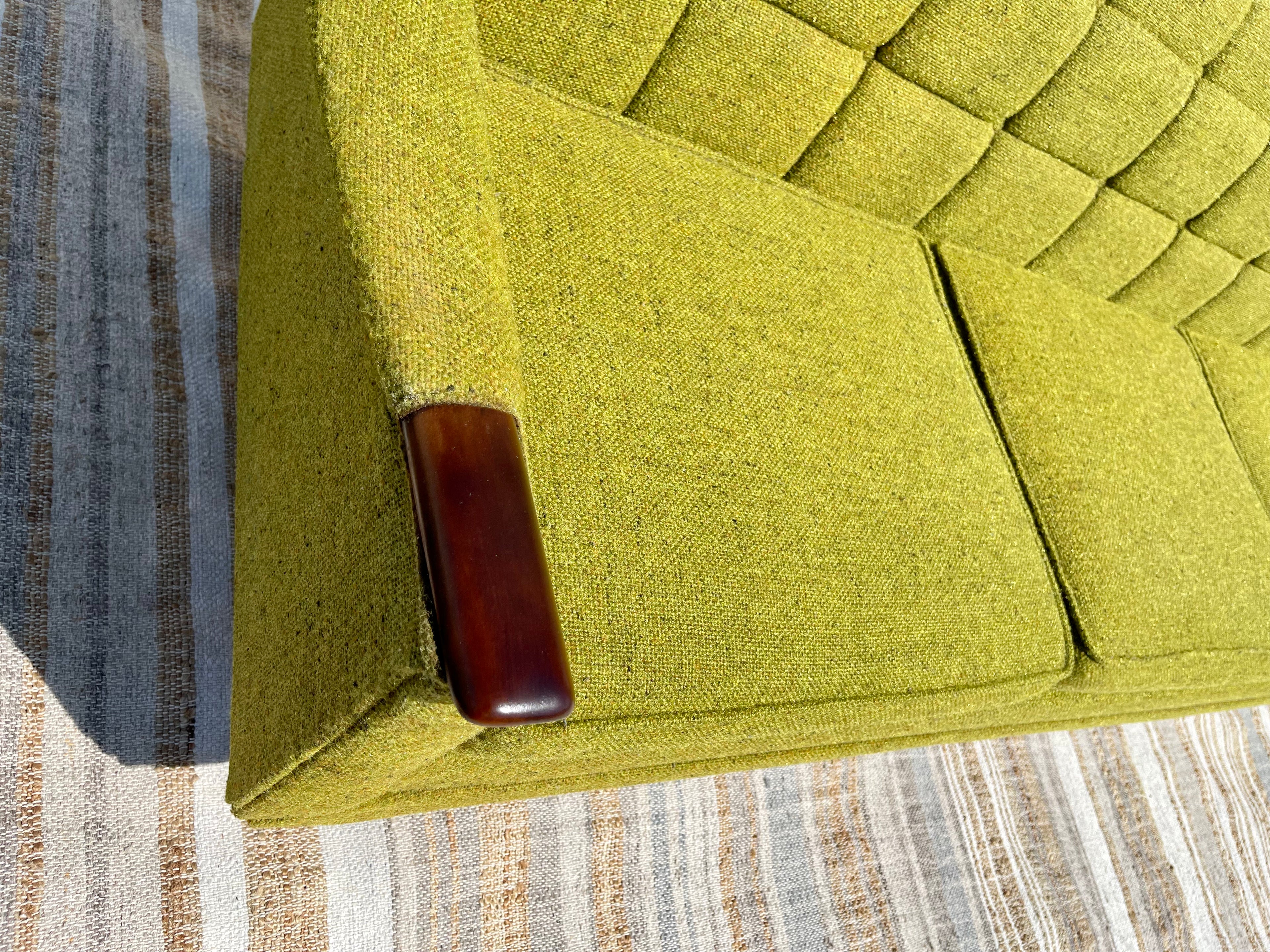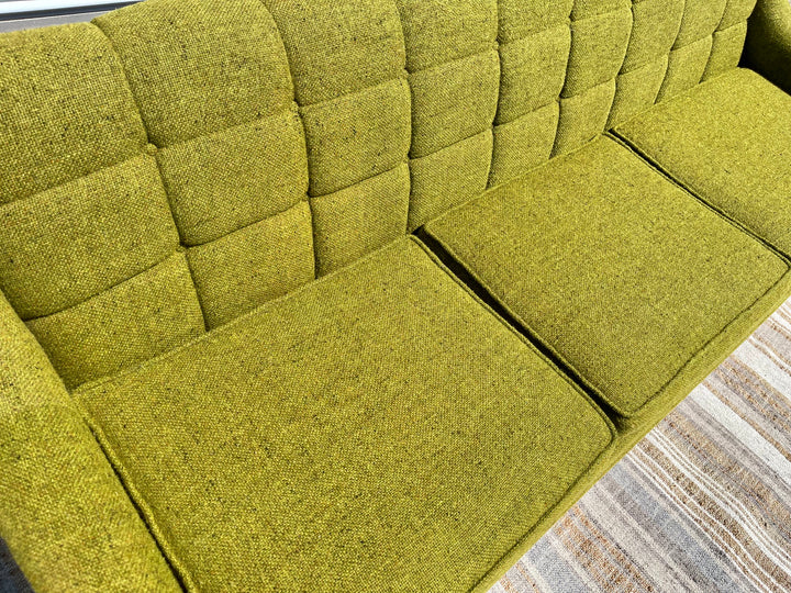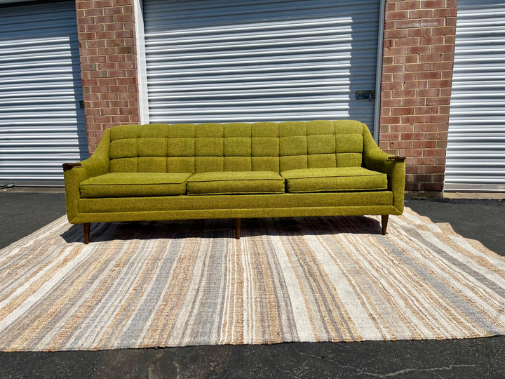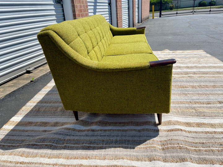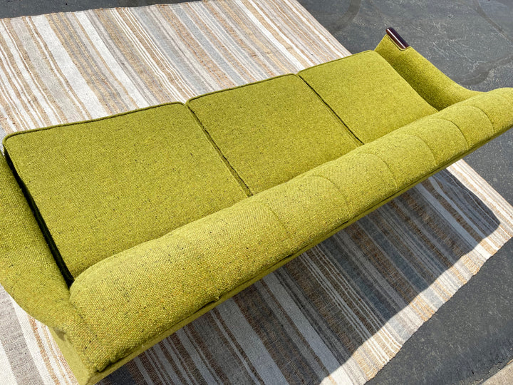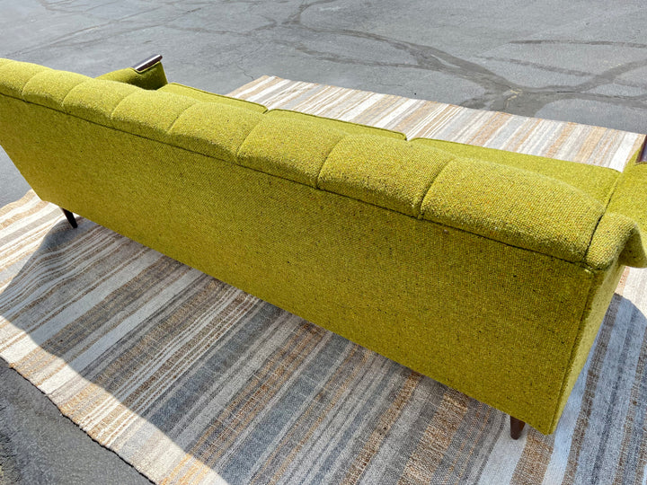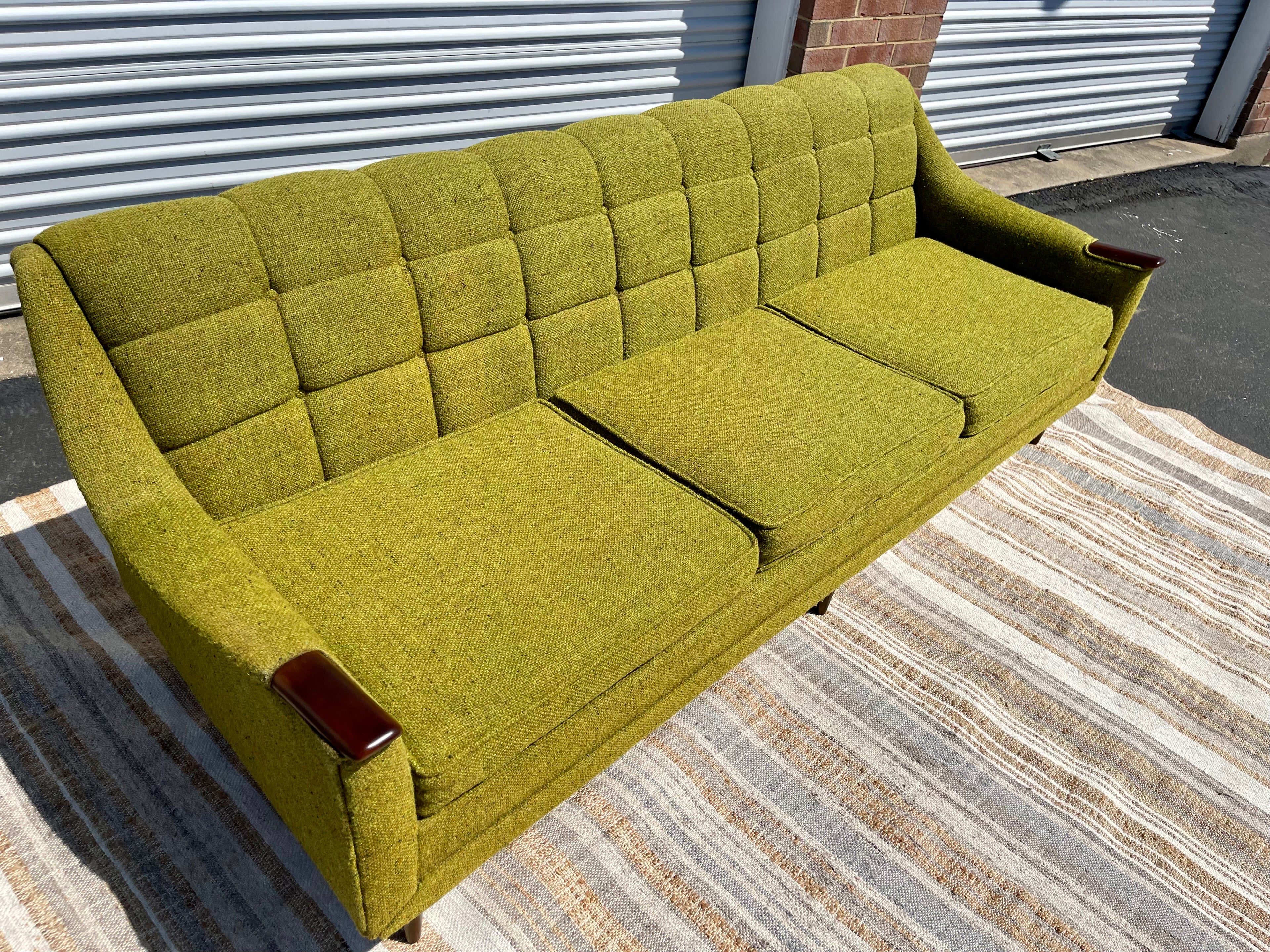 Mid Century Modern Kroehler Avant Designs sofa upholstered in green tweed fabric. In excellent vintage condition; no issues whatsoever with the upholstery. The cushions still have plenty of life in them as well. We refinished the wood armrests and touched up the legs, restoring this beauty to its original vintage condition. The lime green tweed is a classic mid century look, and would be a very fun statement piece!