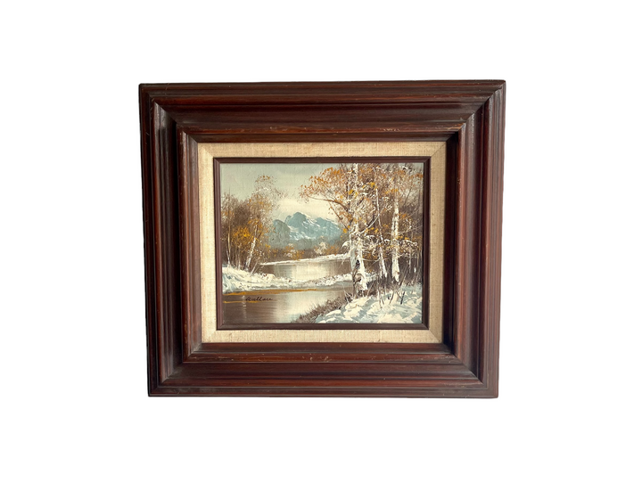Stylishly framed mid century modern oil on canvas landscape painting. Beautiful detail throughout the composition. Very cool period piece with trees and river in the foreground and looming mountains in the background.
