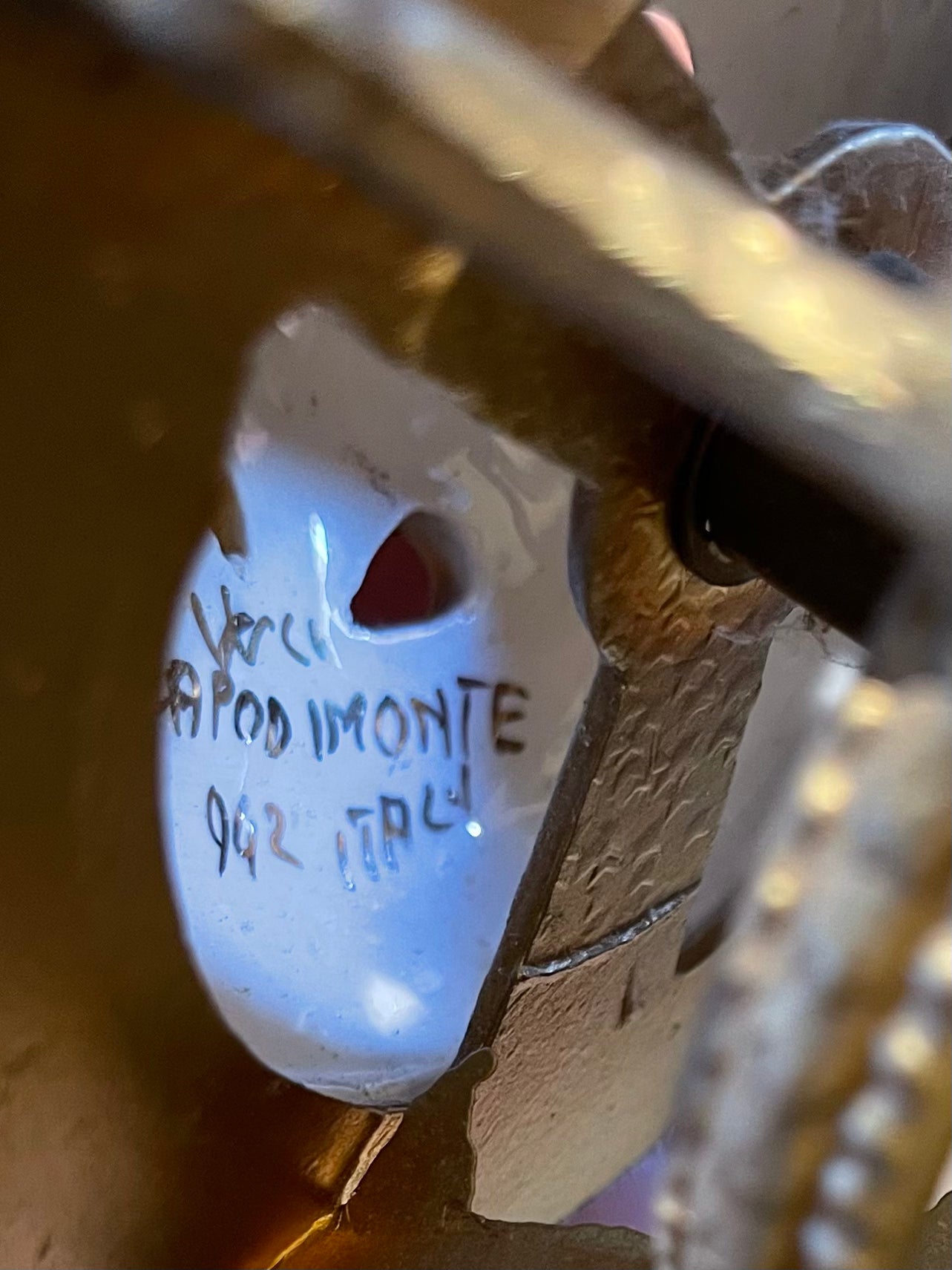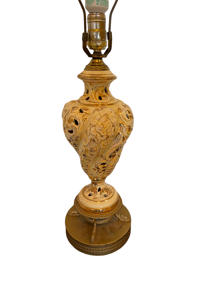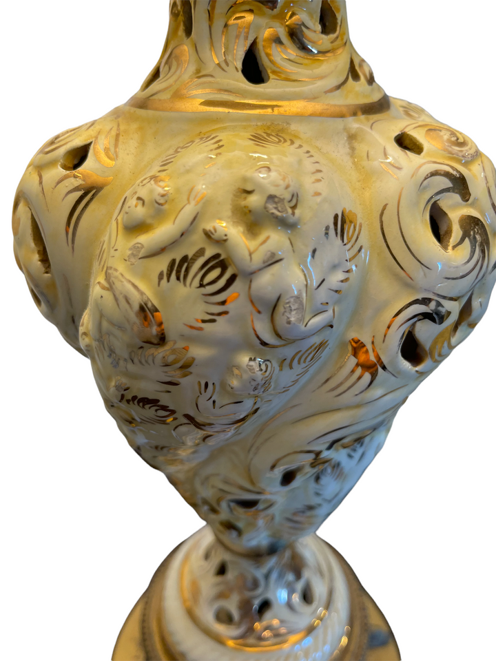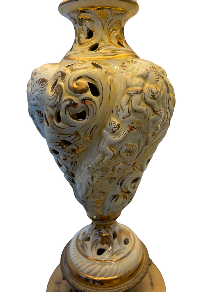 Midcentury Italian Handpainted Capodimonte Lamp. Signed on the interior of the base. Stunning white and gold porcelains expiring cherubs and swirls. Classical Italian brass base. Original wiring still intact and working.