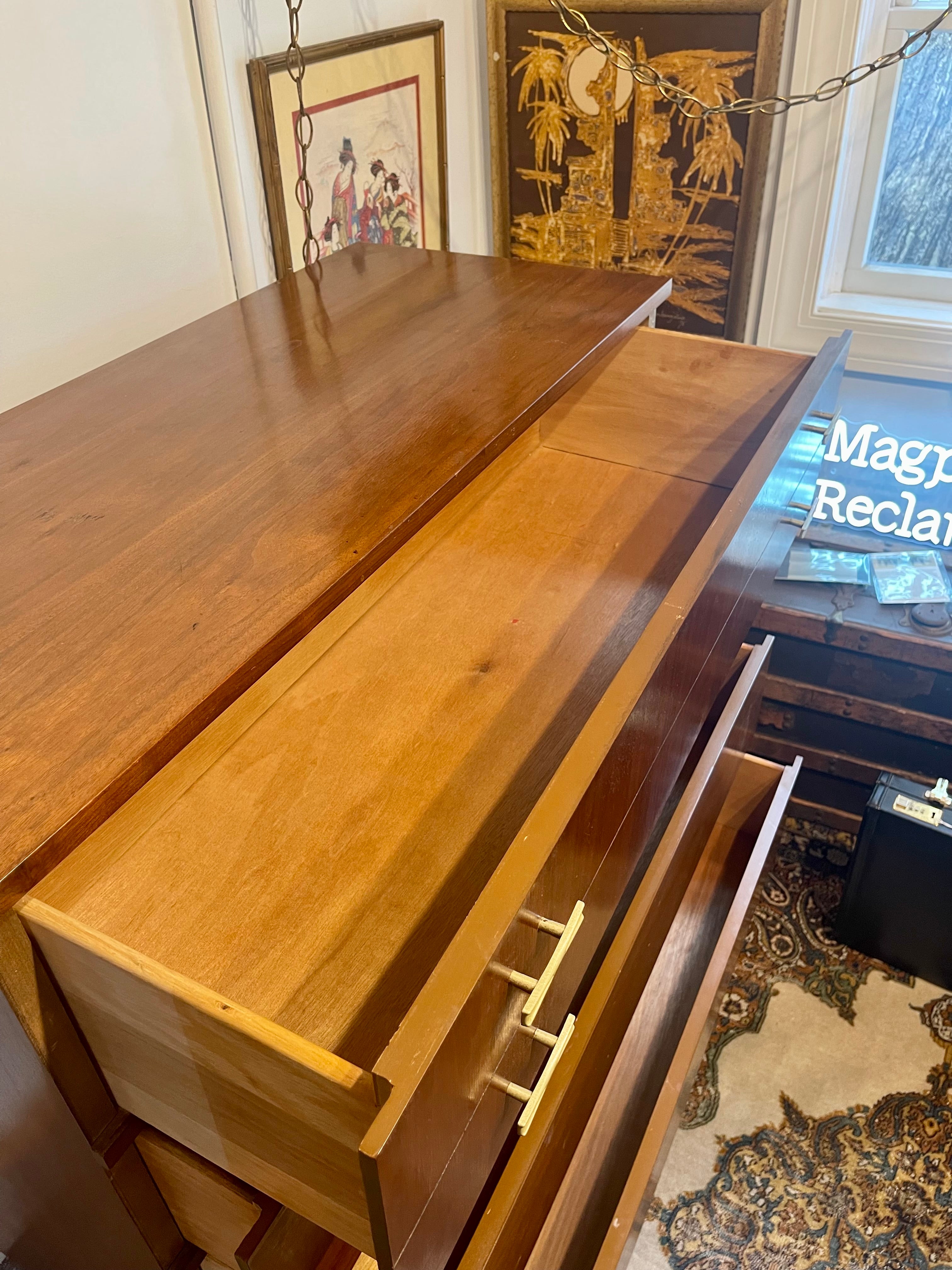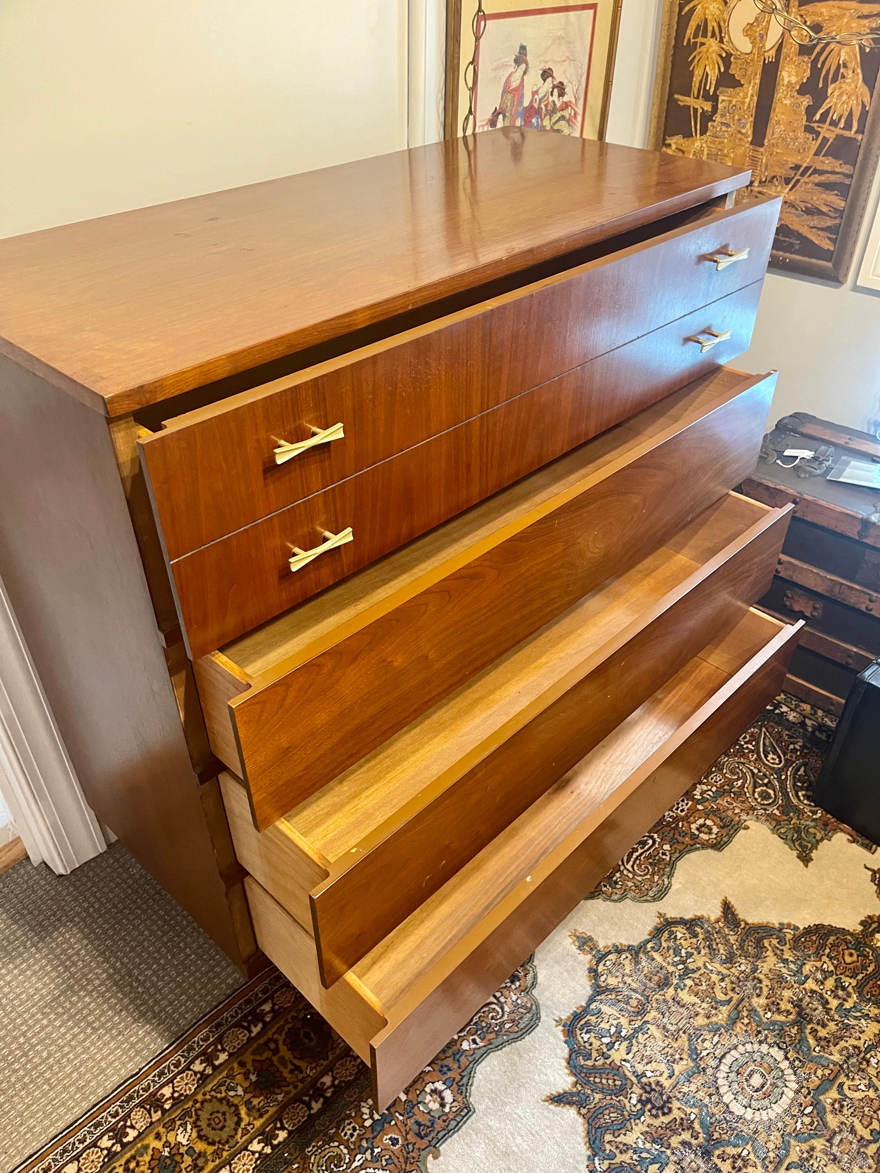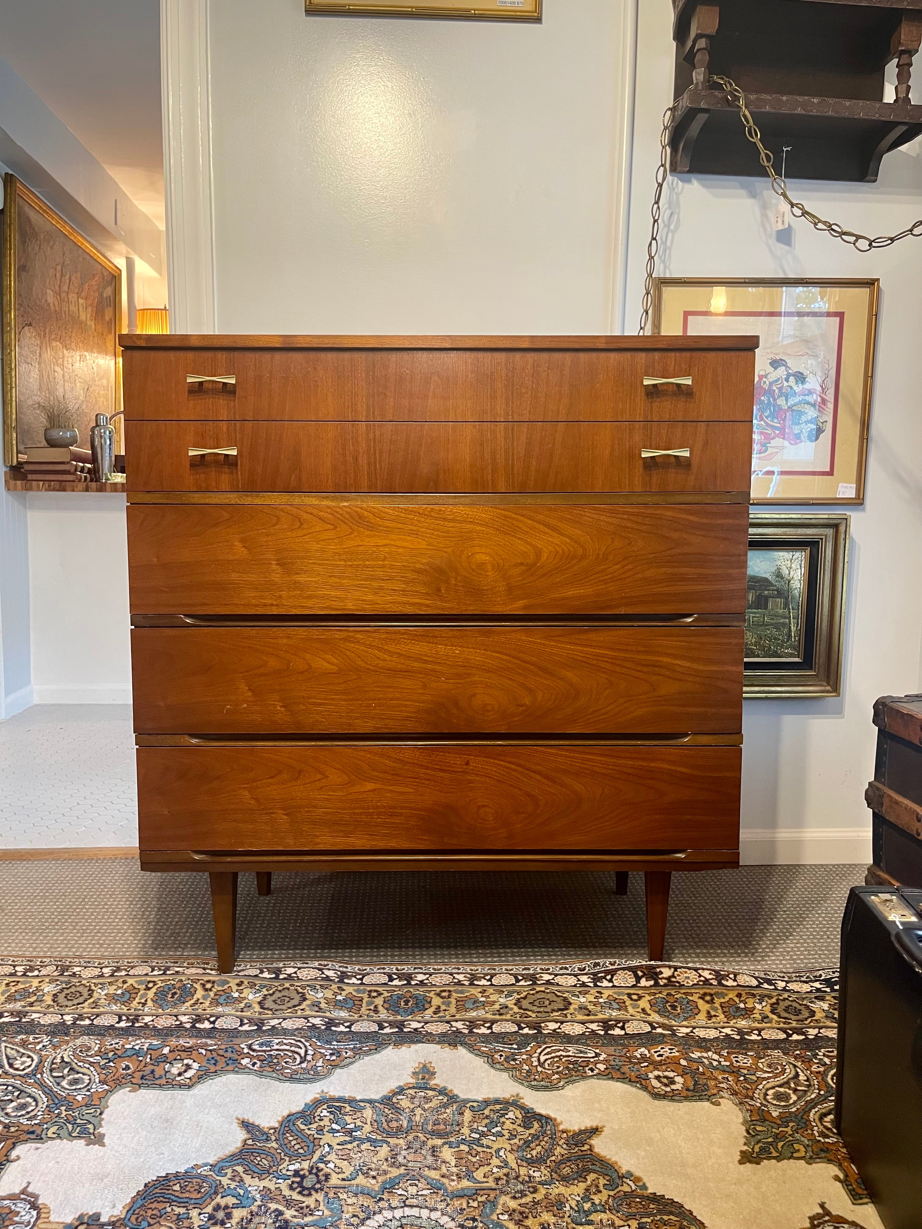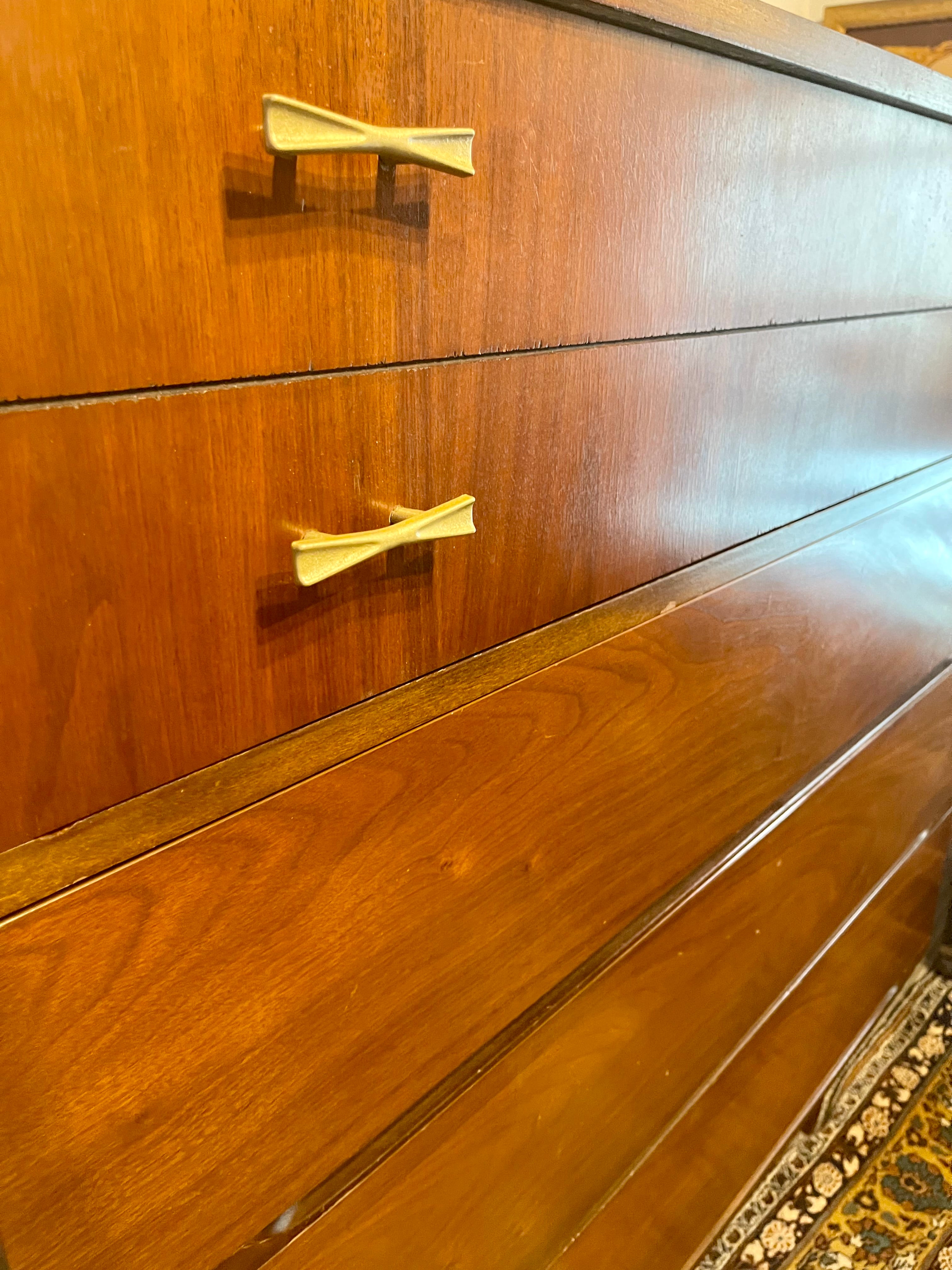 Beautiful Mid Century Modern four drawer walnut dresser by Harmony House. This dresser has four drawers with brass bow tie shaped pulls. The piece is in lovely vintage condition with minor signs of age appropriate wear. Be sure to check out the matching lowboy as well!
