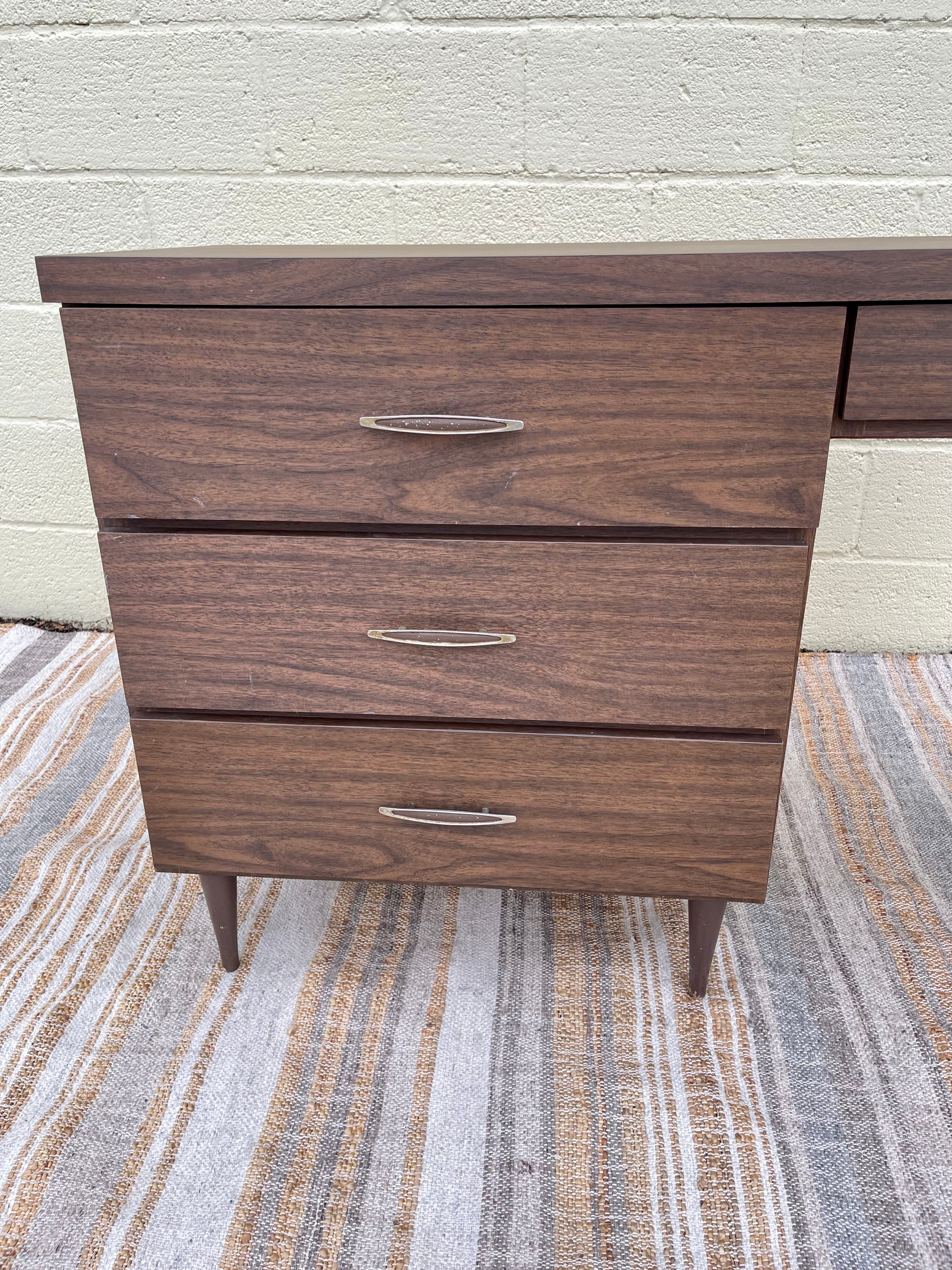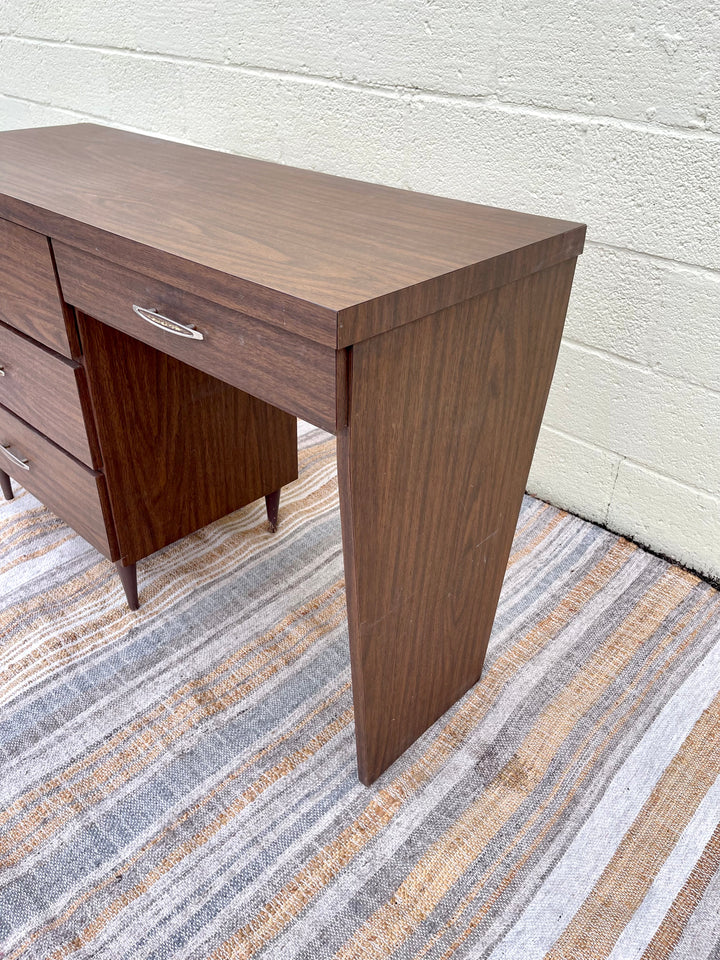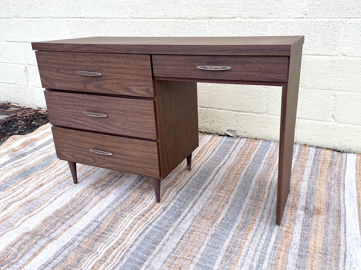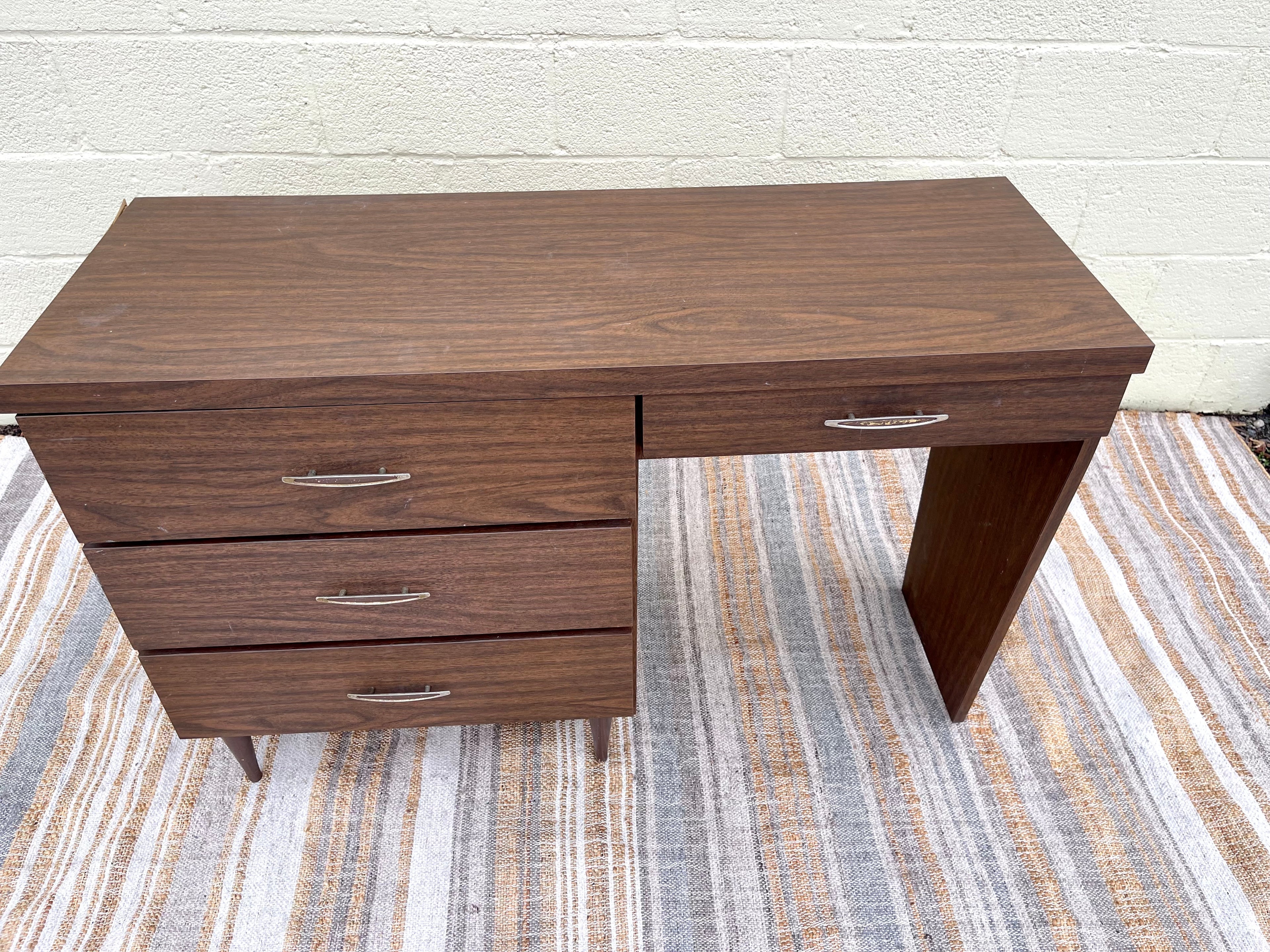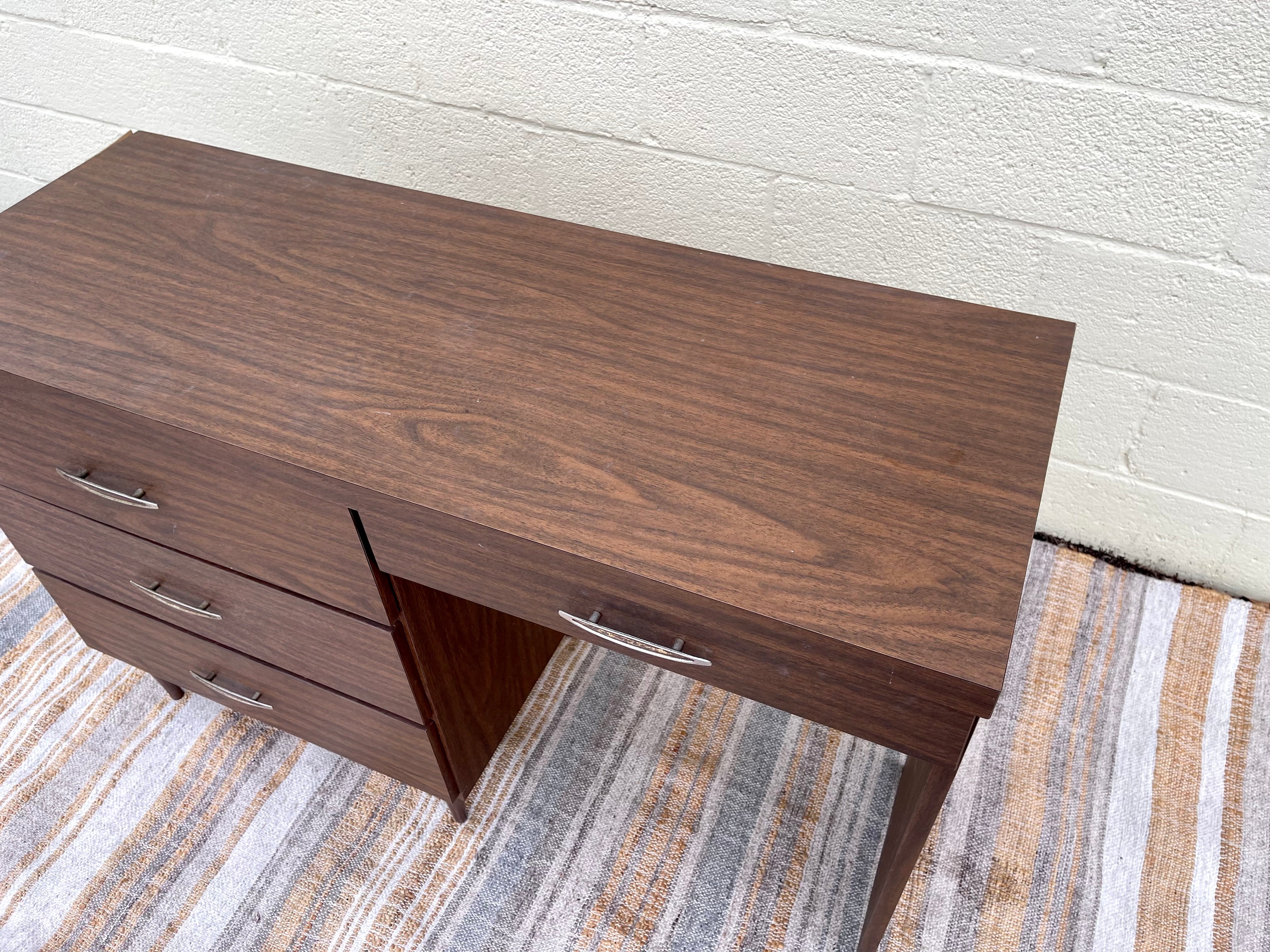 Functional and versatile petite writing desk. Classic Midcentury design. Four total drawers for storage. This piece is laminate, not wood, which makes it very durable.