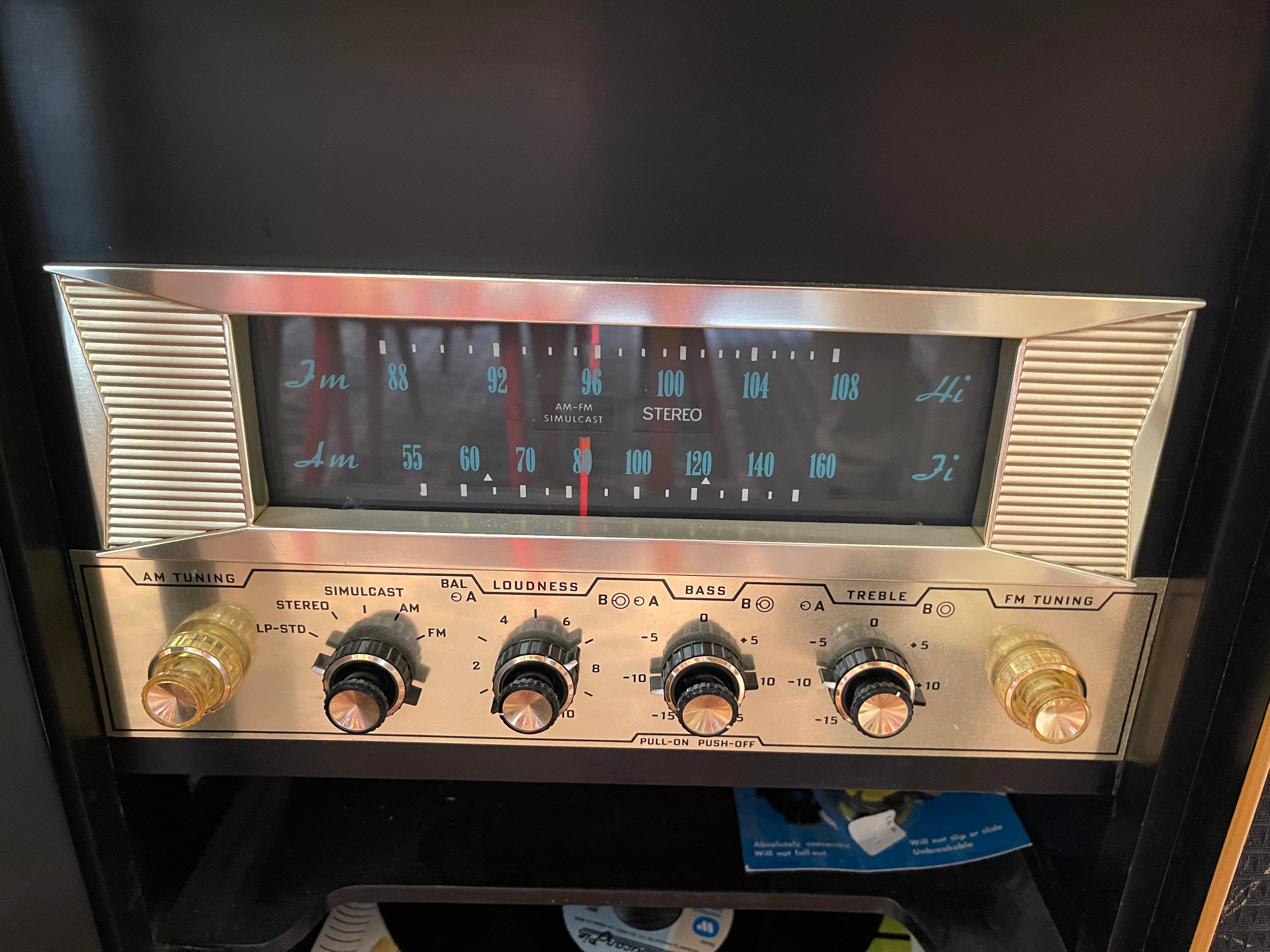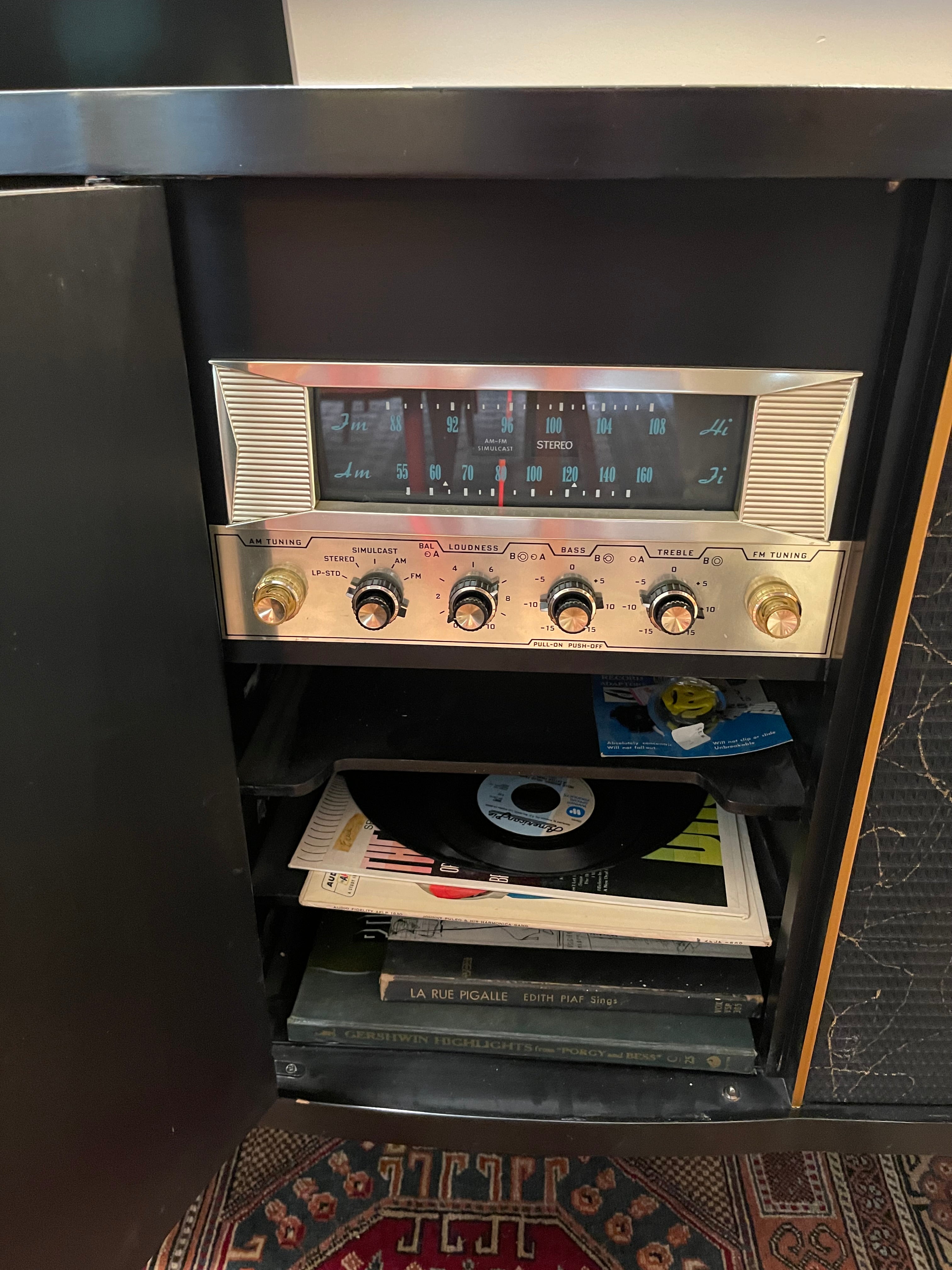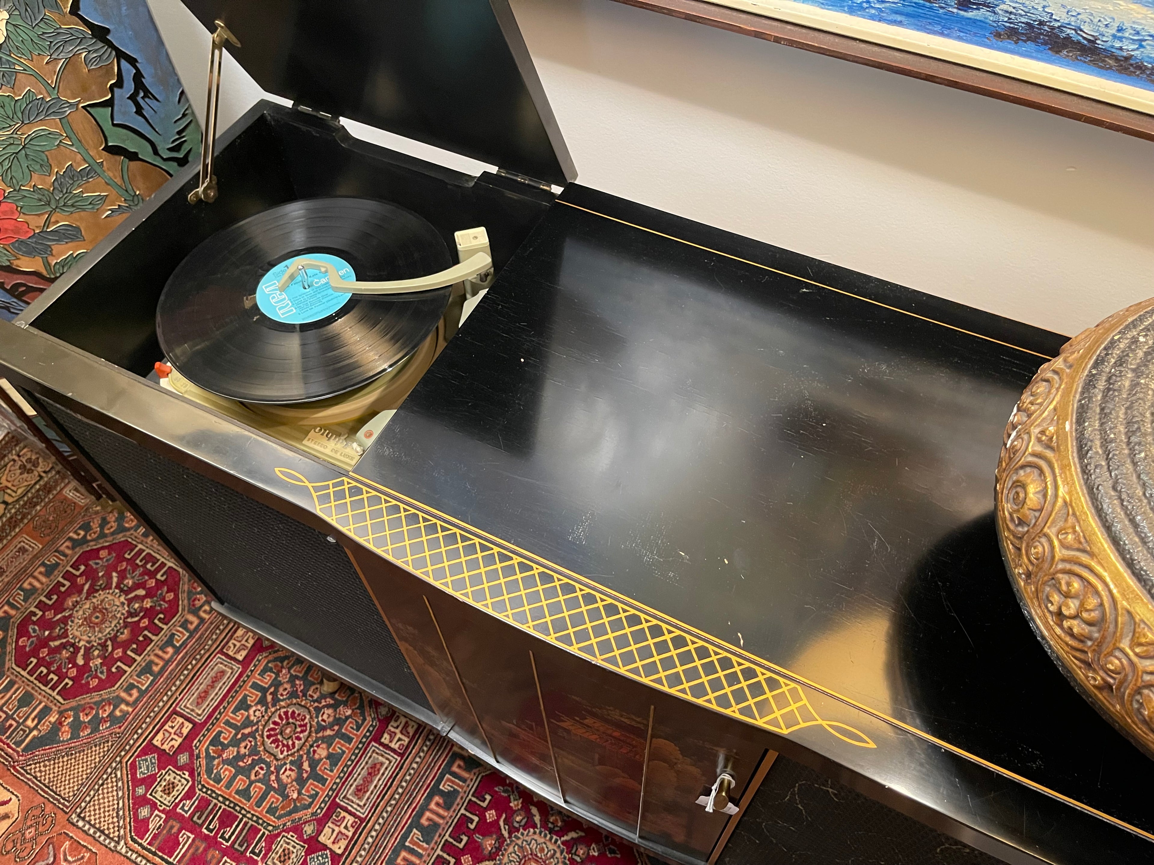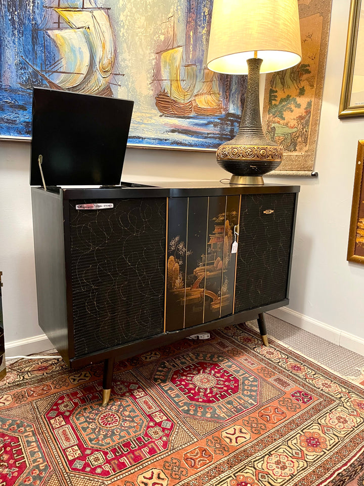 This unit, model 7511, is the “The Jade” collection with a Chinese motif and influence. The black lacquered wood case holds a AM/FM Stereo system, six speakers, a fully functioning record player, and record storage. This unit has been recently serviced and sounds incredible.