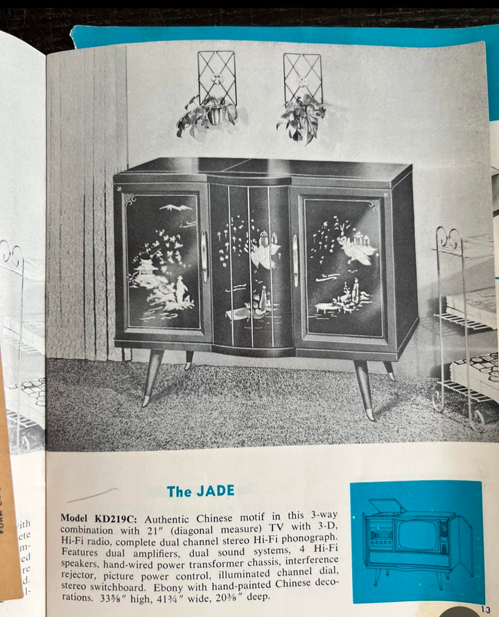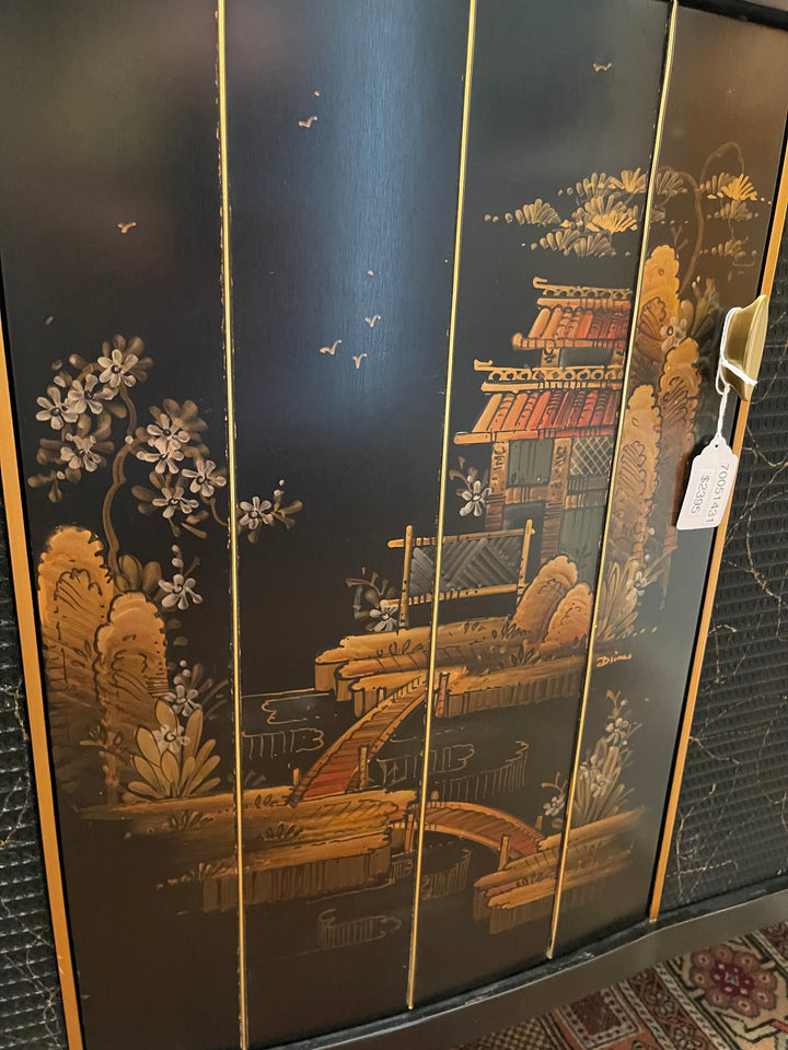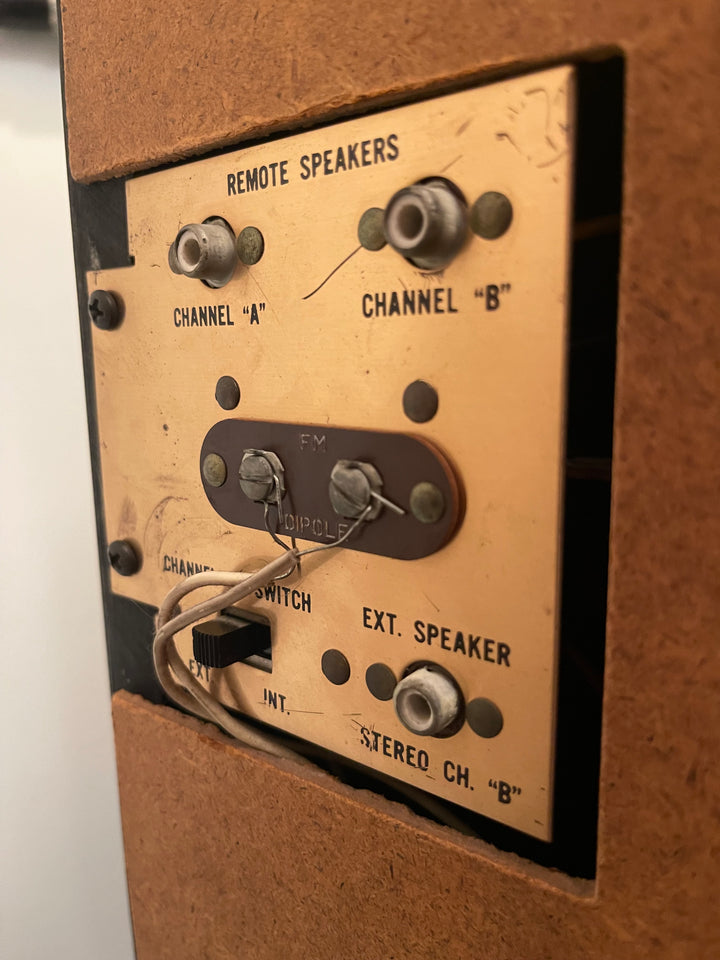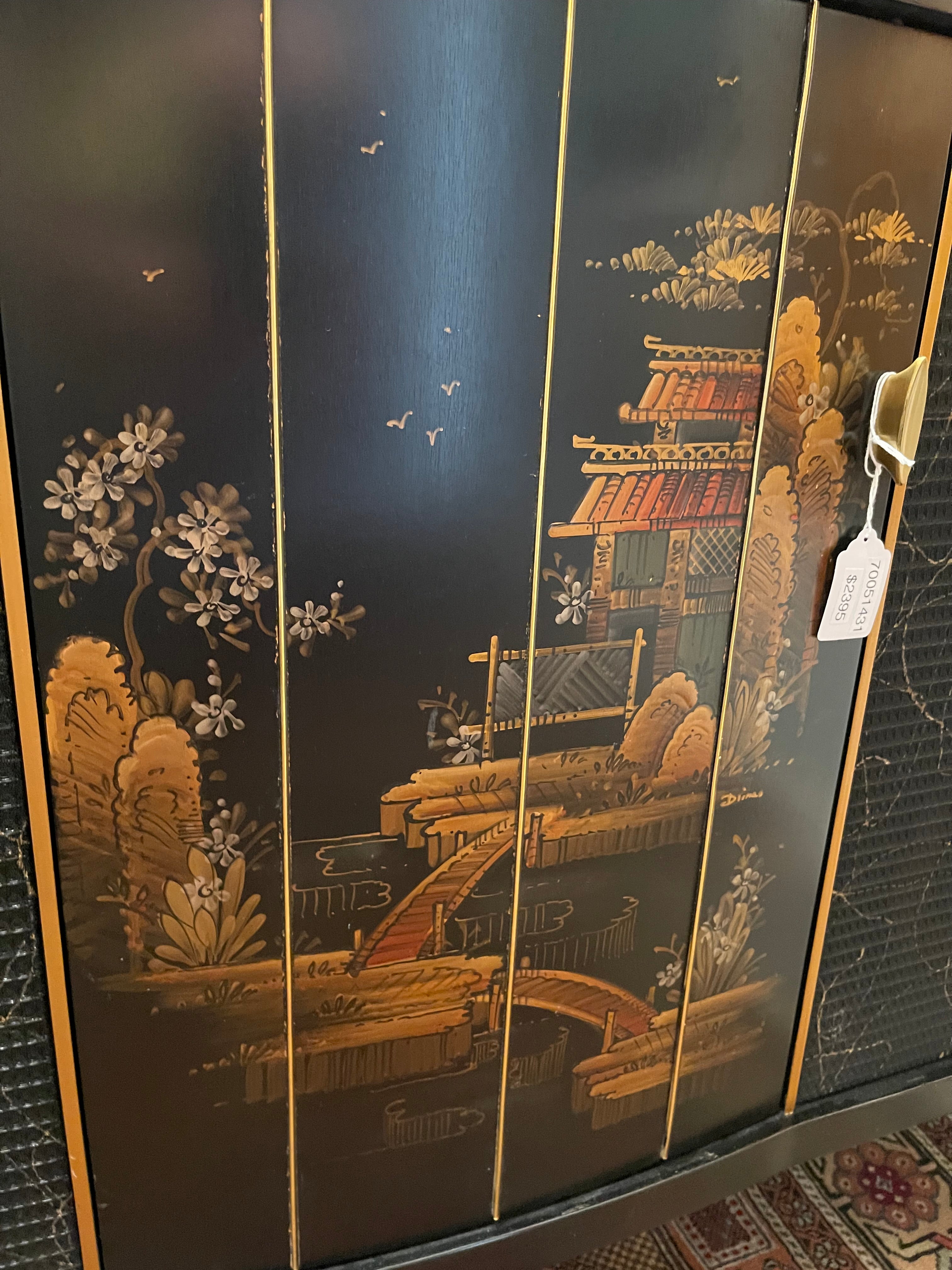 This unit, model 7511, is the “The Jade” collection with a Chinese motif and influence. The black lacquered wood case holds a AM/FM Stereo system, six speakers, a fully functioning record player, and record storage. This unit has been recently serviced and sounds incredible.