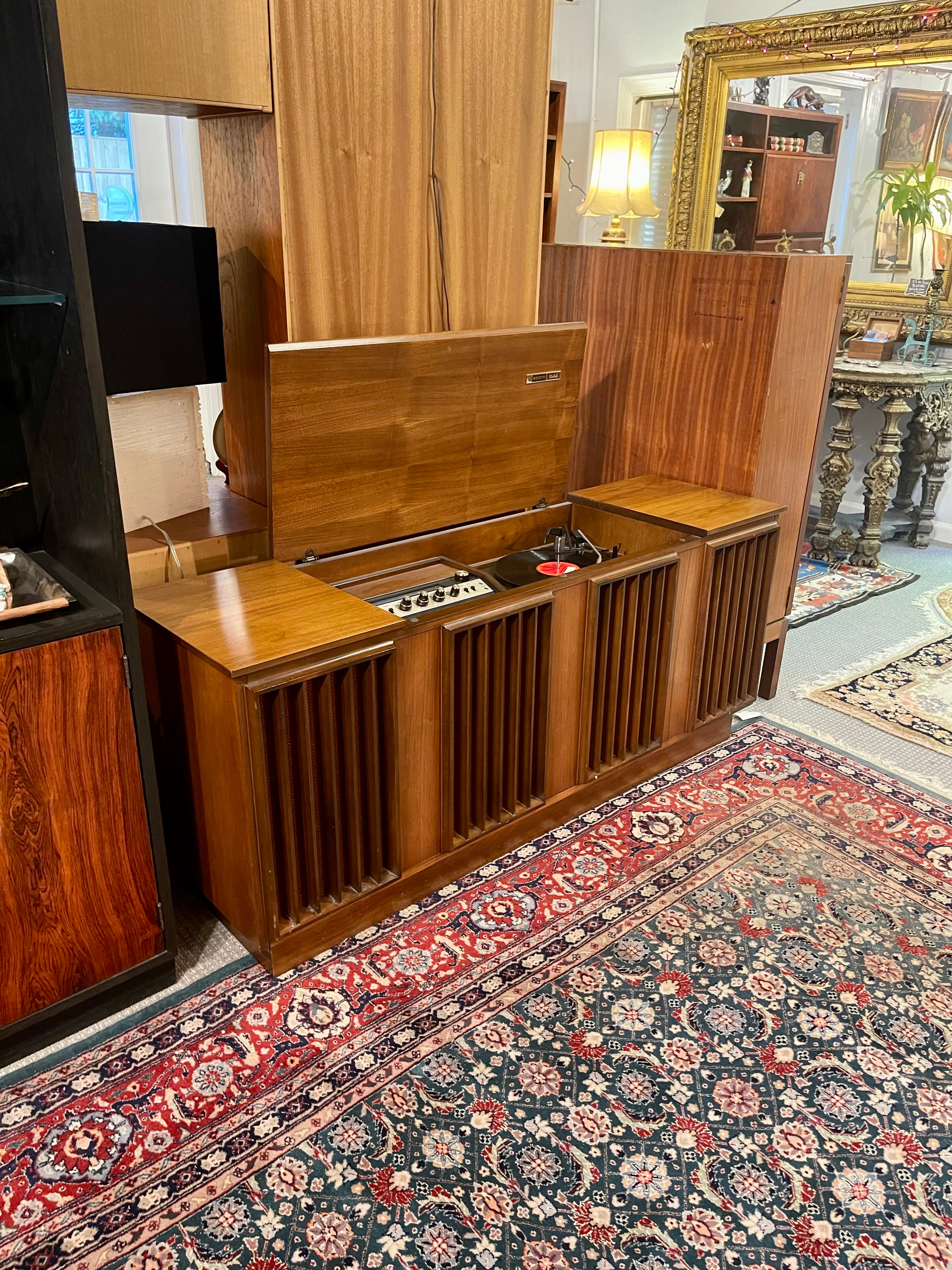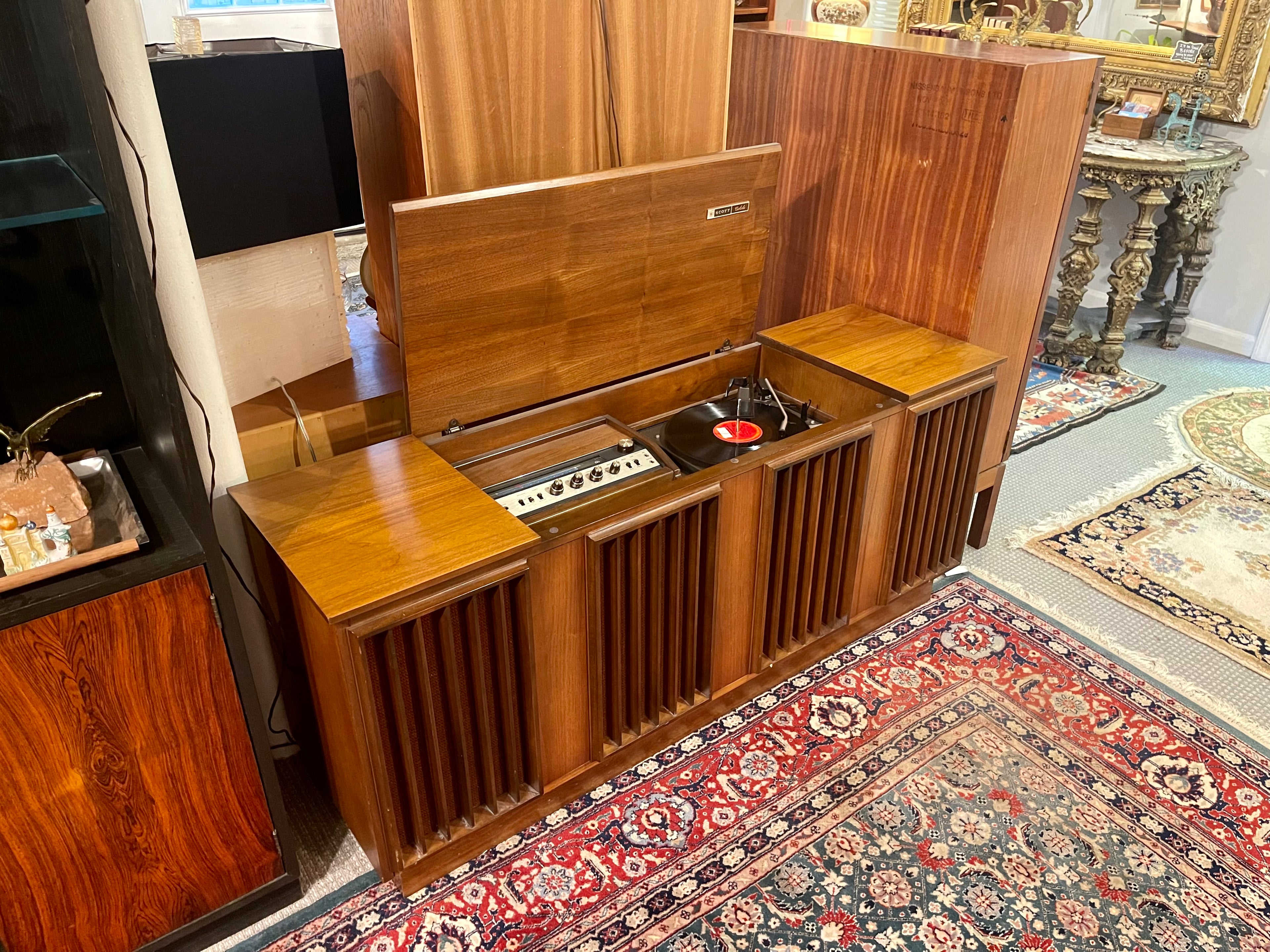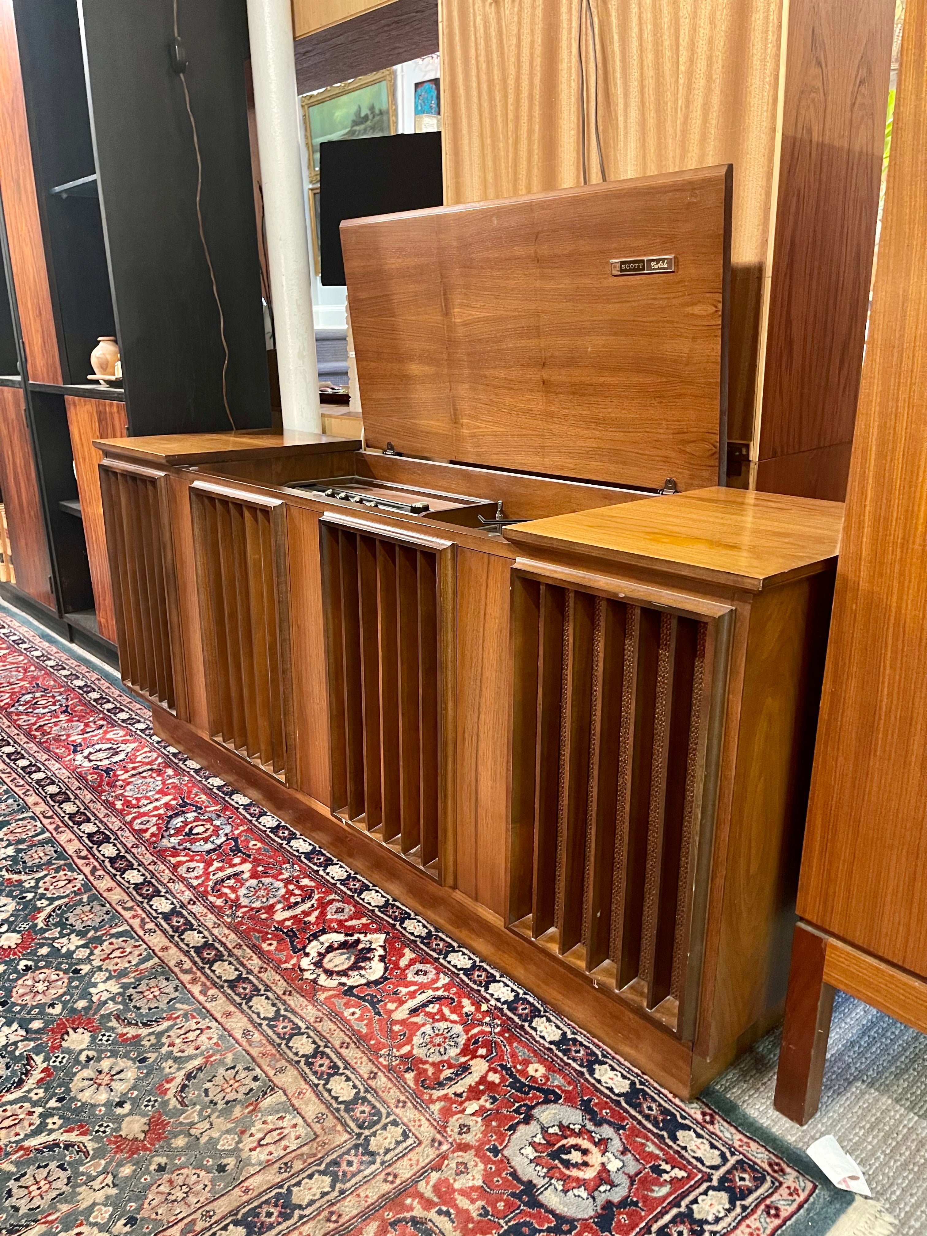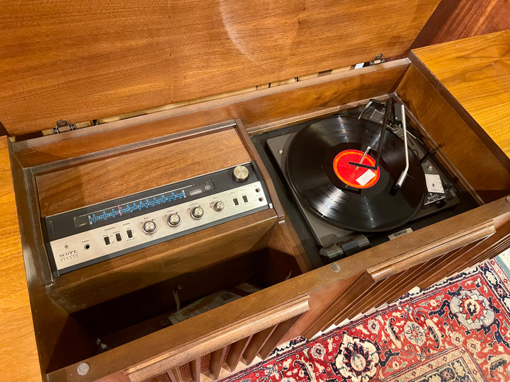 Incredibly well preserved Scott “Carlyle” record console. Incredible sound from this cabinet; please see the video or come take a listen in store! Beautiful walnut cabinet with solid state fm radio/record player. All the bells and whistles including original paperwork.