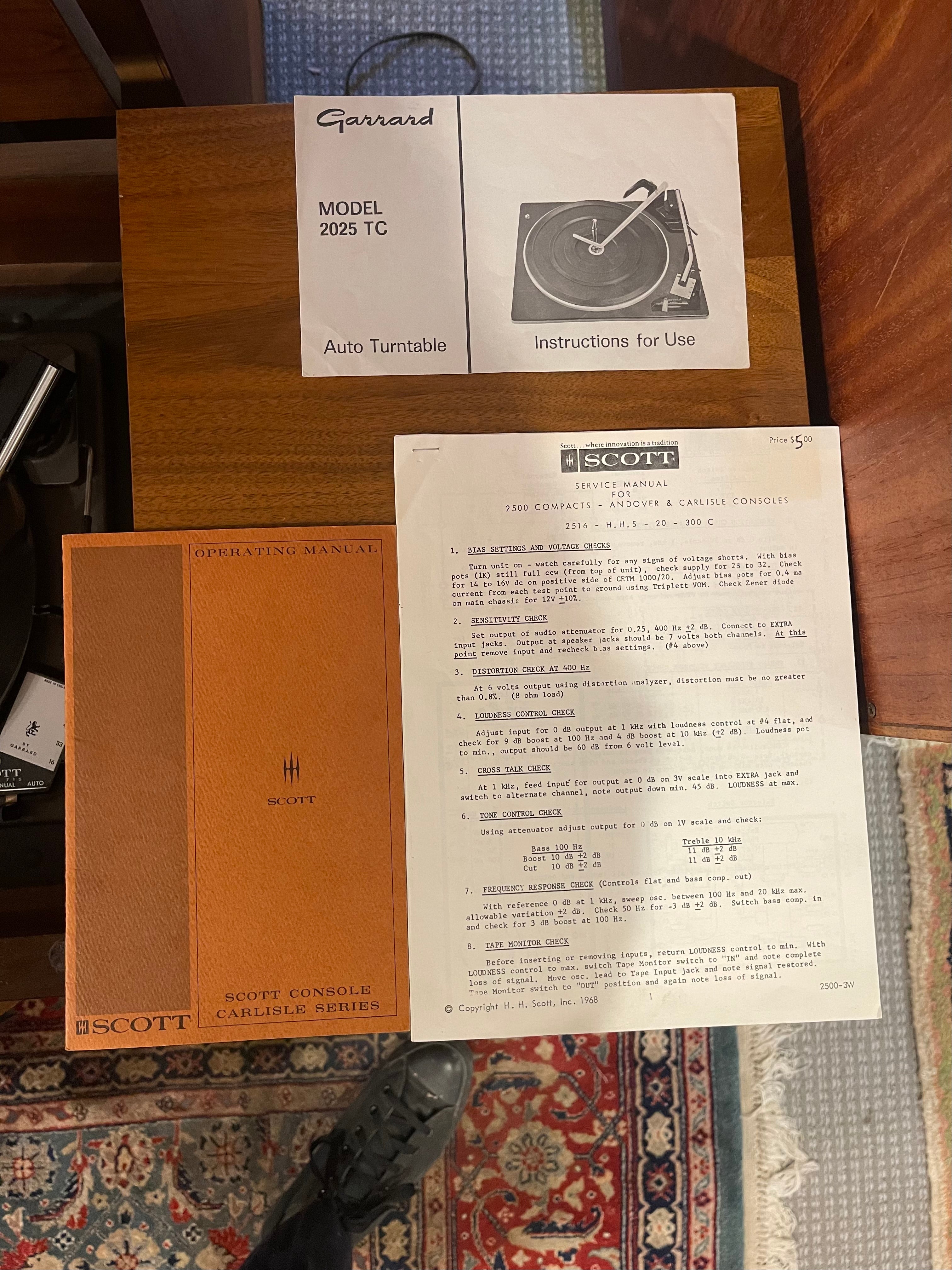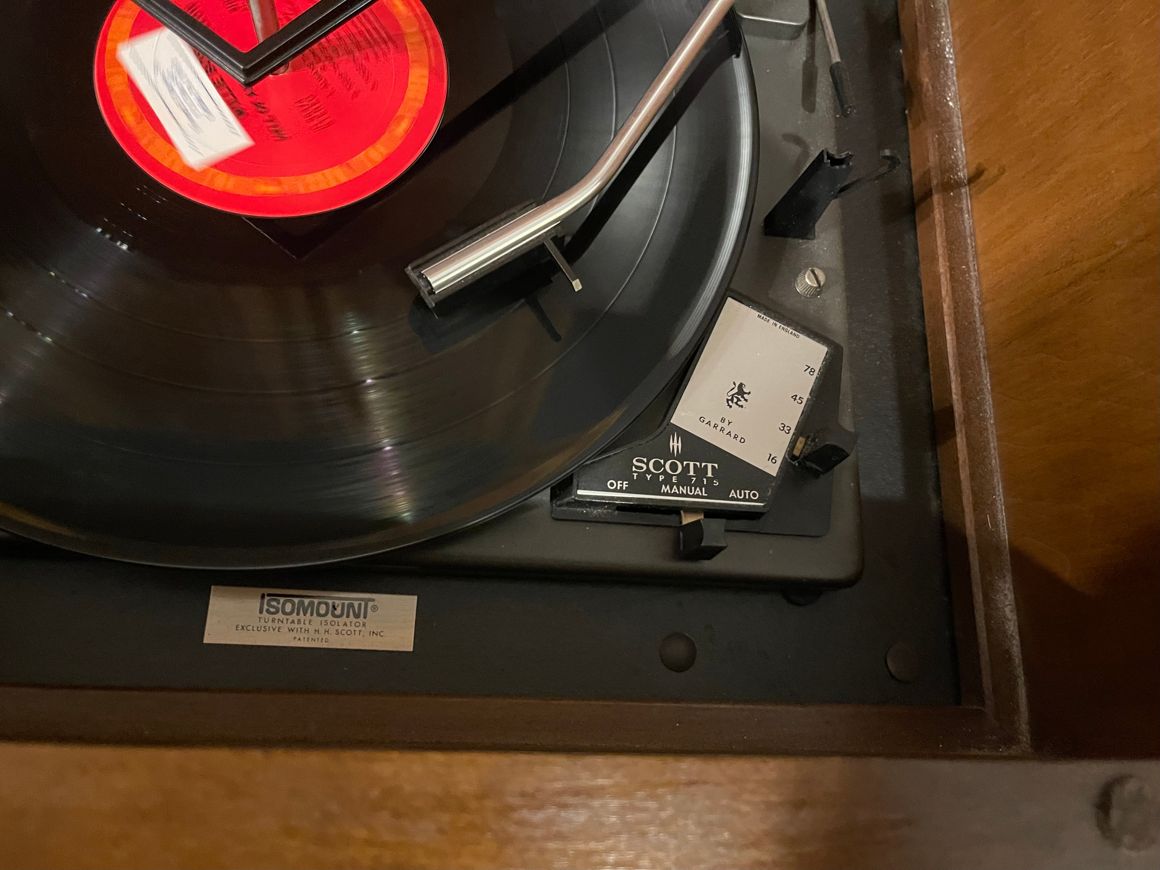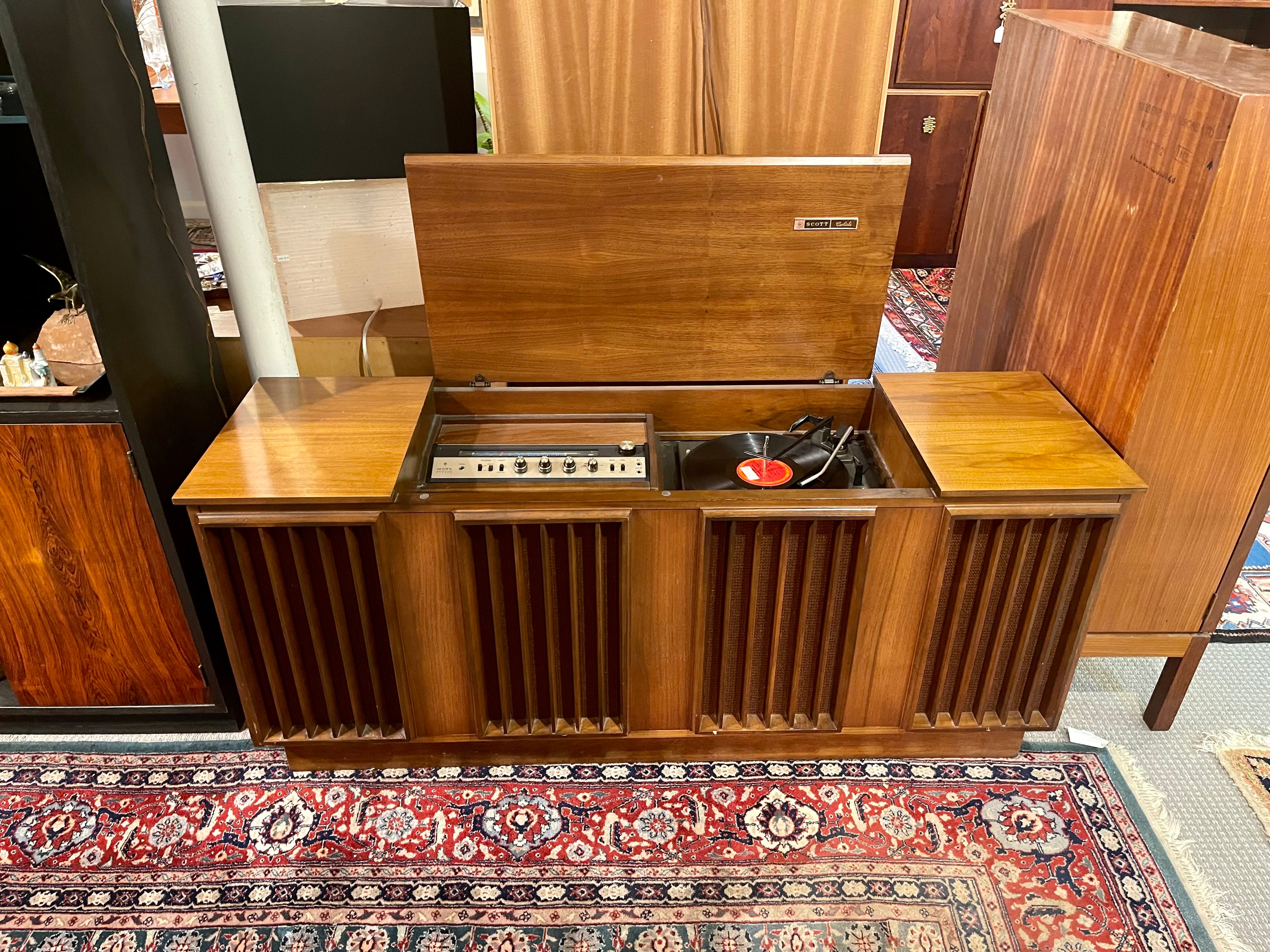Incredibly well preserved Scott “Carlyle” record console. Incredible sound from this cabinet; please see the video or come take a listen in store! Beautiful walnut cabinet with solid state fm radio/record player. All the bells and whistles including original paperwork.