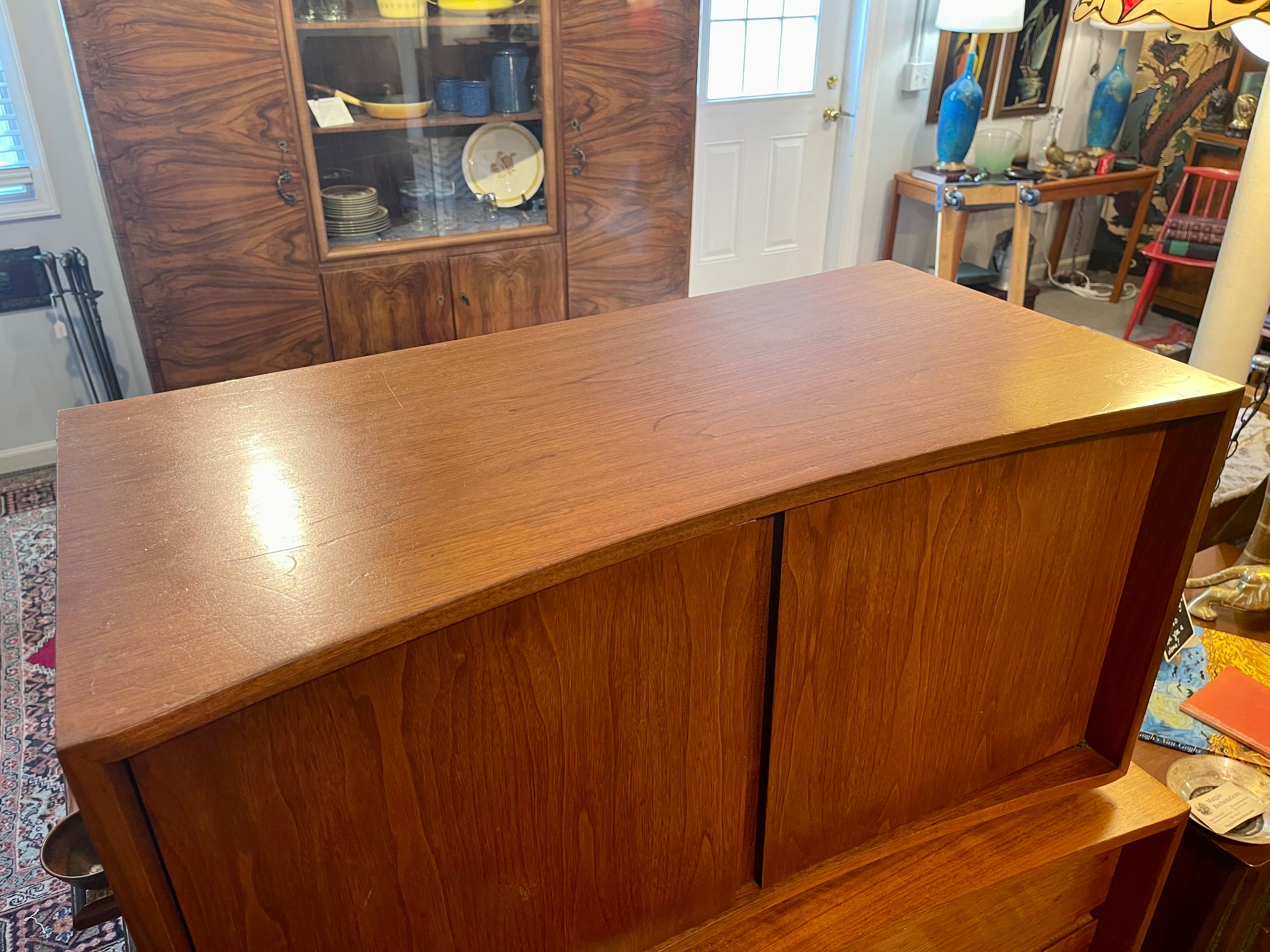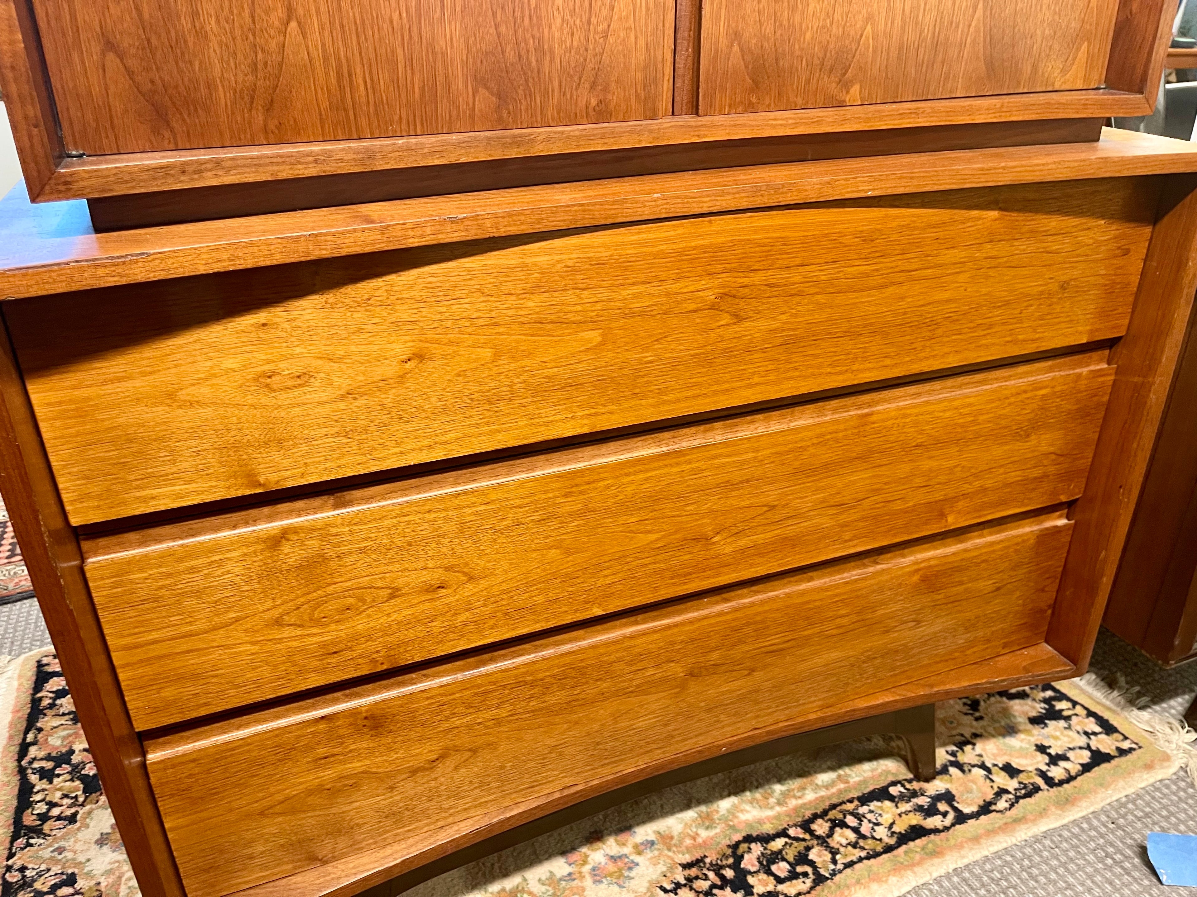 Fun and stylish Midcentury modern Walnut gentleman’s chest from Tobago of Canada. Tobago manufactured many high end Midcentury modern pieces throughout the decades and this is one of our favorites. The gently curved face of the cabinet is reminiscent of the famous line from Young Mfg. Five spacious drawers provide ample storage. Some minor imperfections but overall this is an excellent example of Midcentury design and aesthetic.