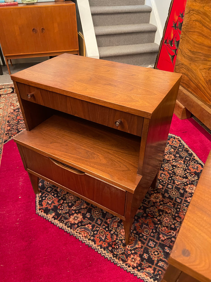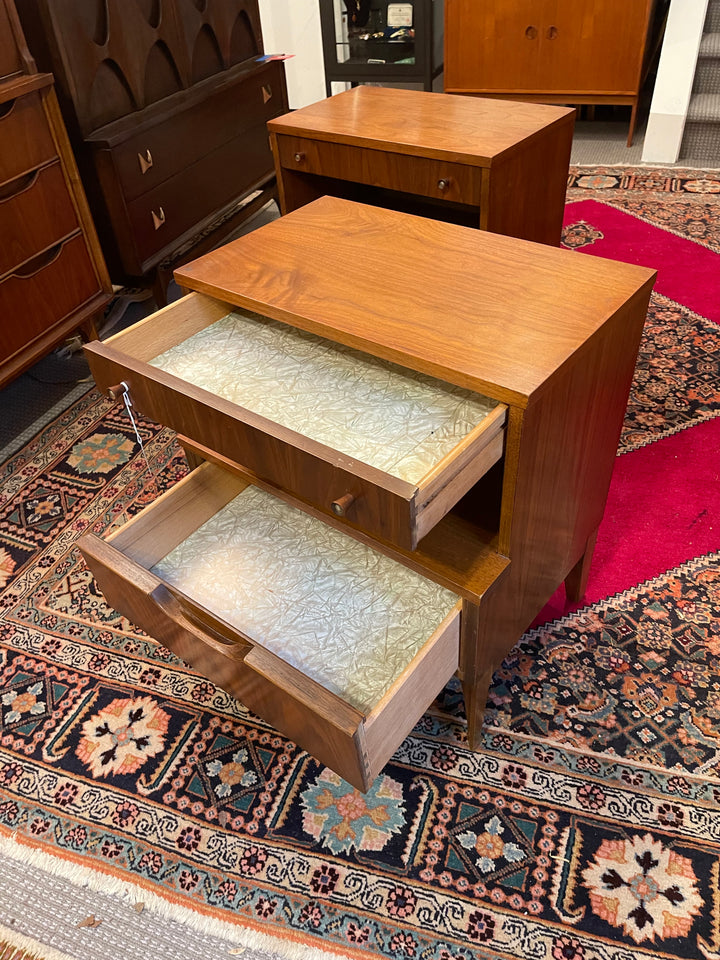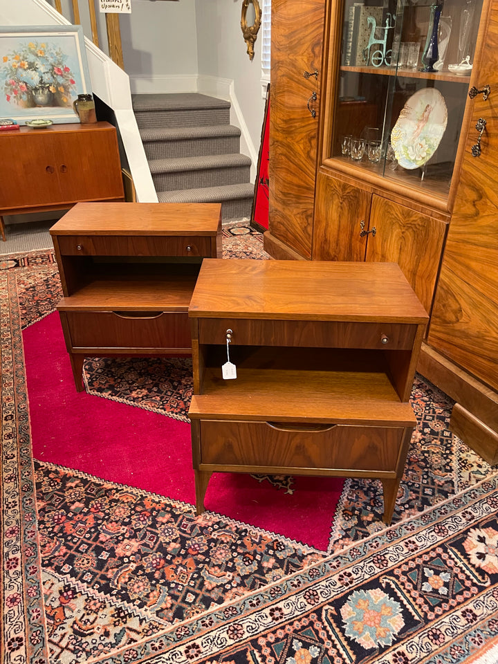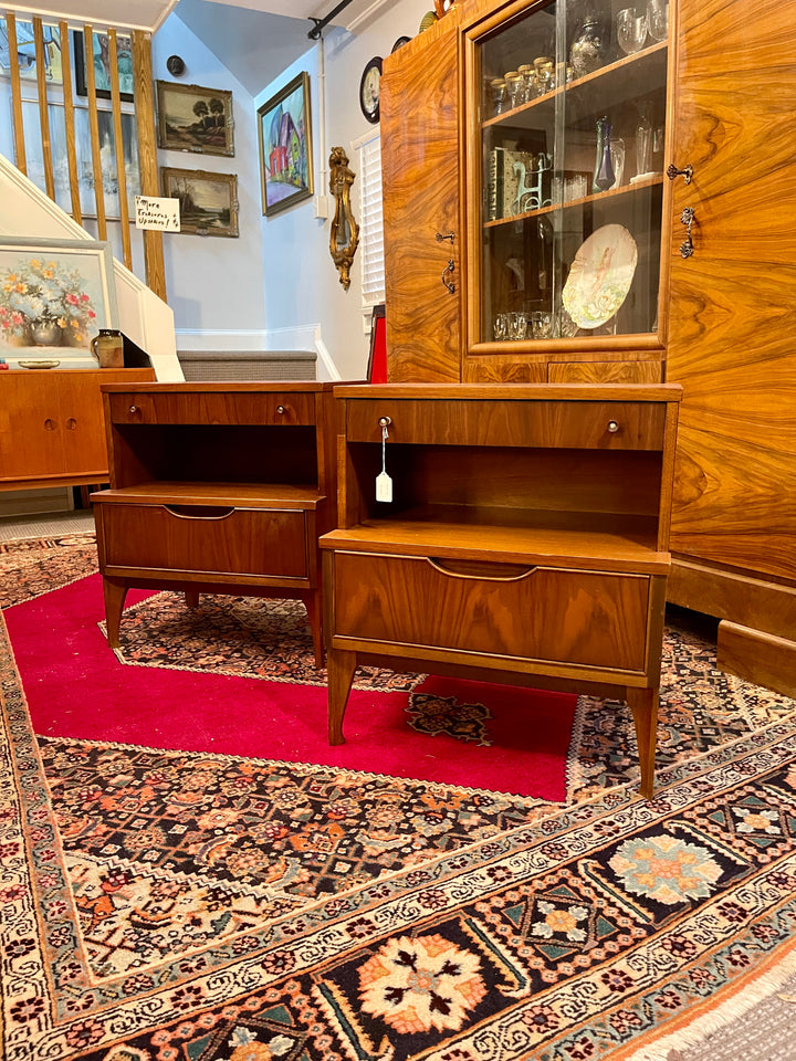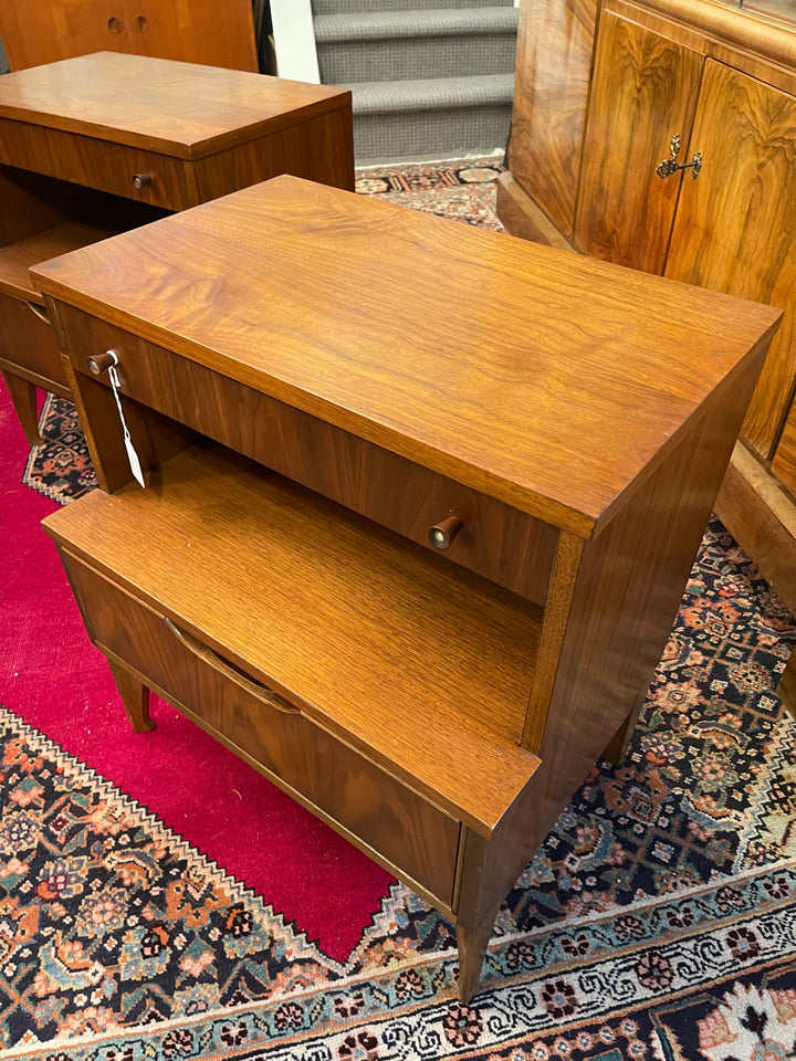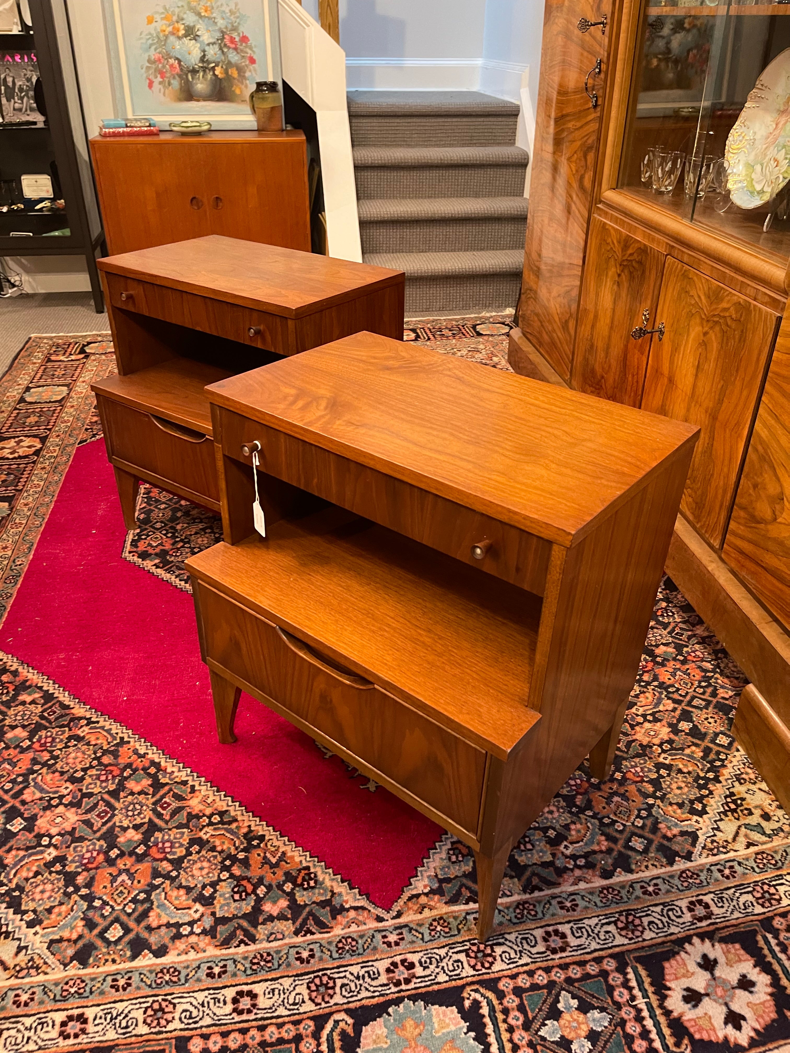 Handsome Midcentury modern pair of nightstands in a beautiful book matched walnut. The unique design on these pieces offers great storage, with two drawers and a shelf for all of your various needs. Carved wood pulls and sculpted frame make this an excellent set. Please note we do have the matching Tallboy dresser in stock as well.