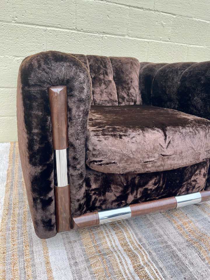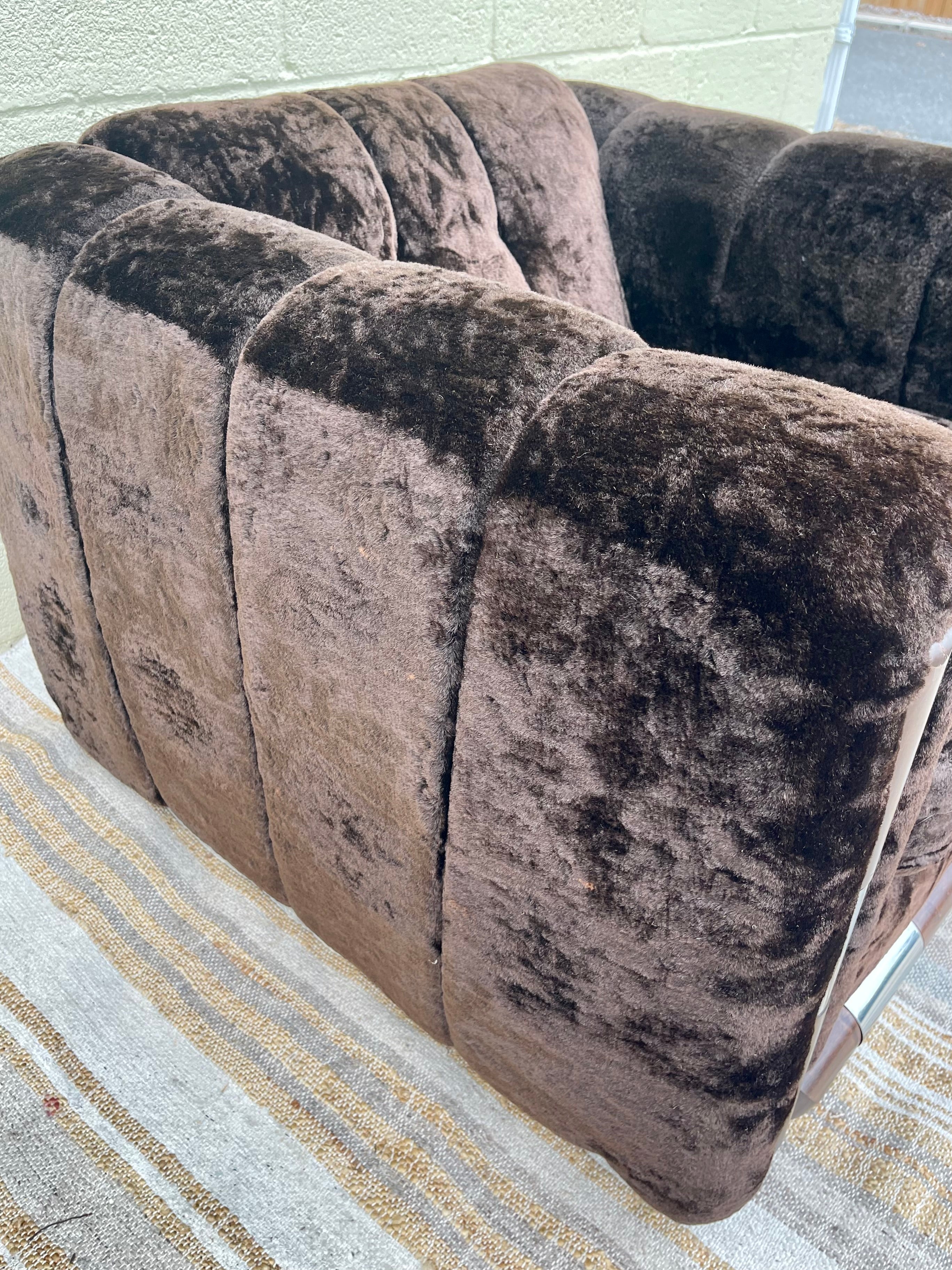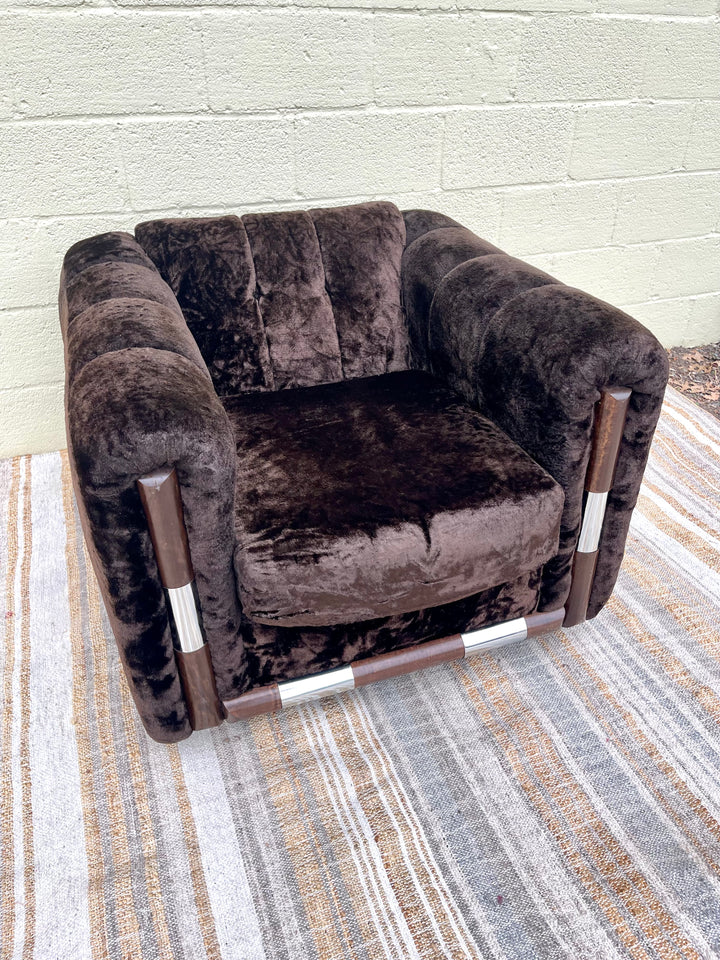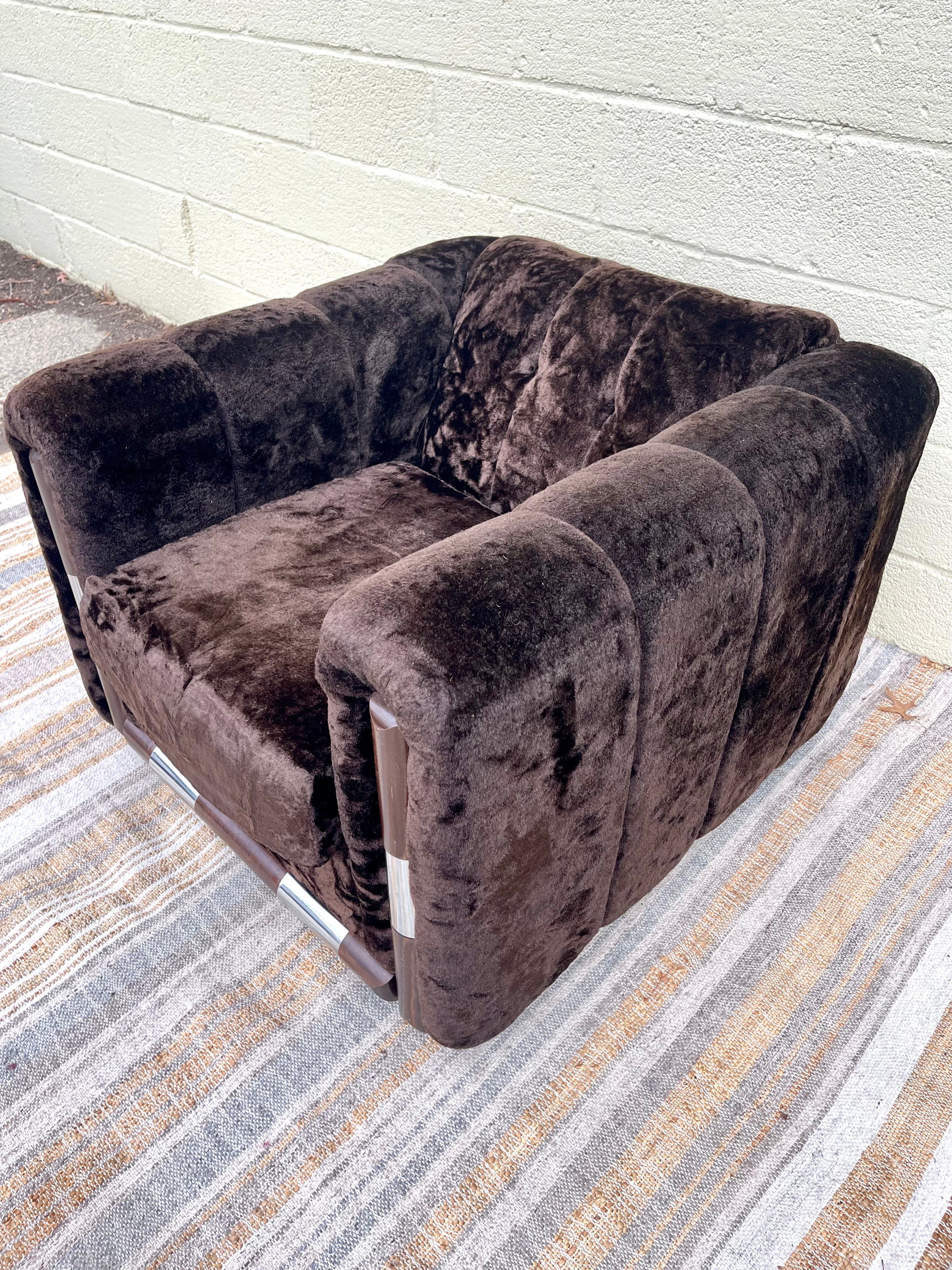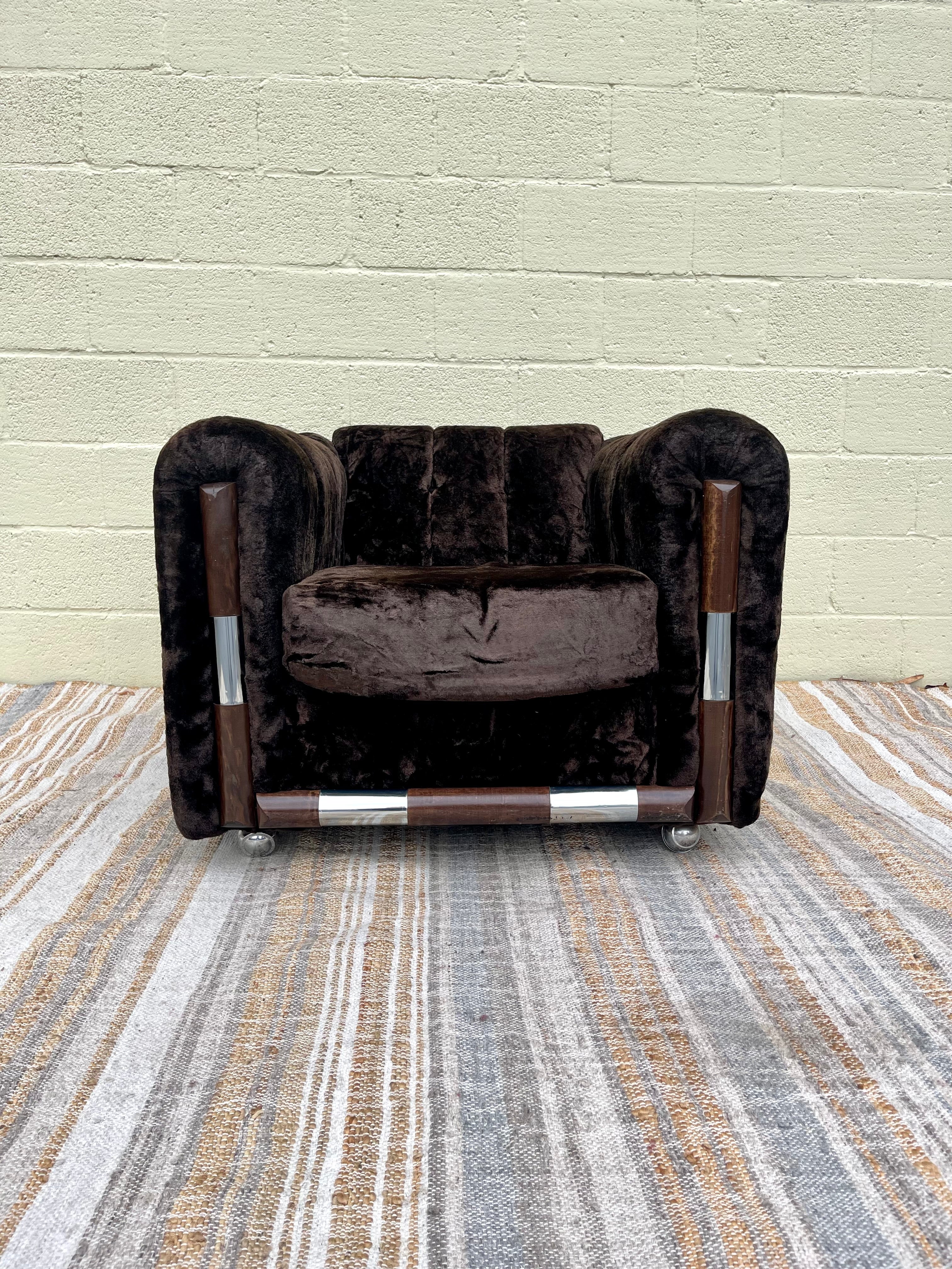 Fun and comfortable overstuffed armchair in a Milo Baughman style. The chrome and wood accents along the front and cubic shape make this a really interesting piece. The fabric is reminiscent of a very fine shag and is soft and comfortable. The chair has two casters for easy movement around the house.