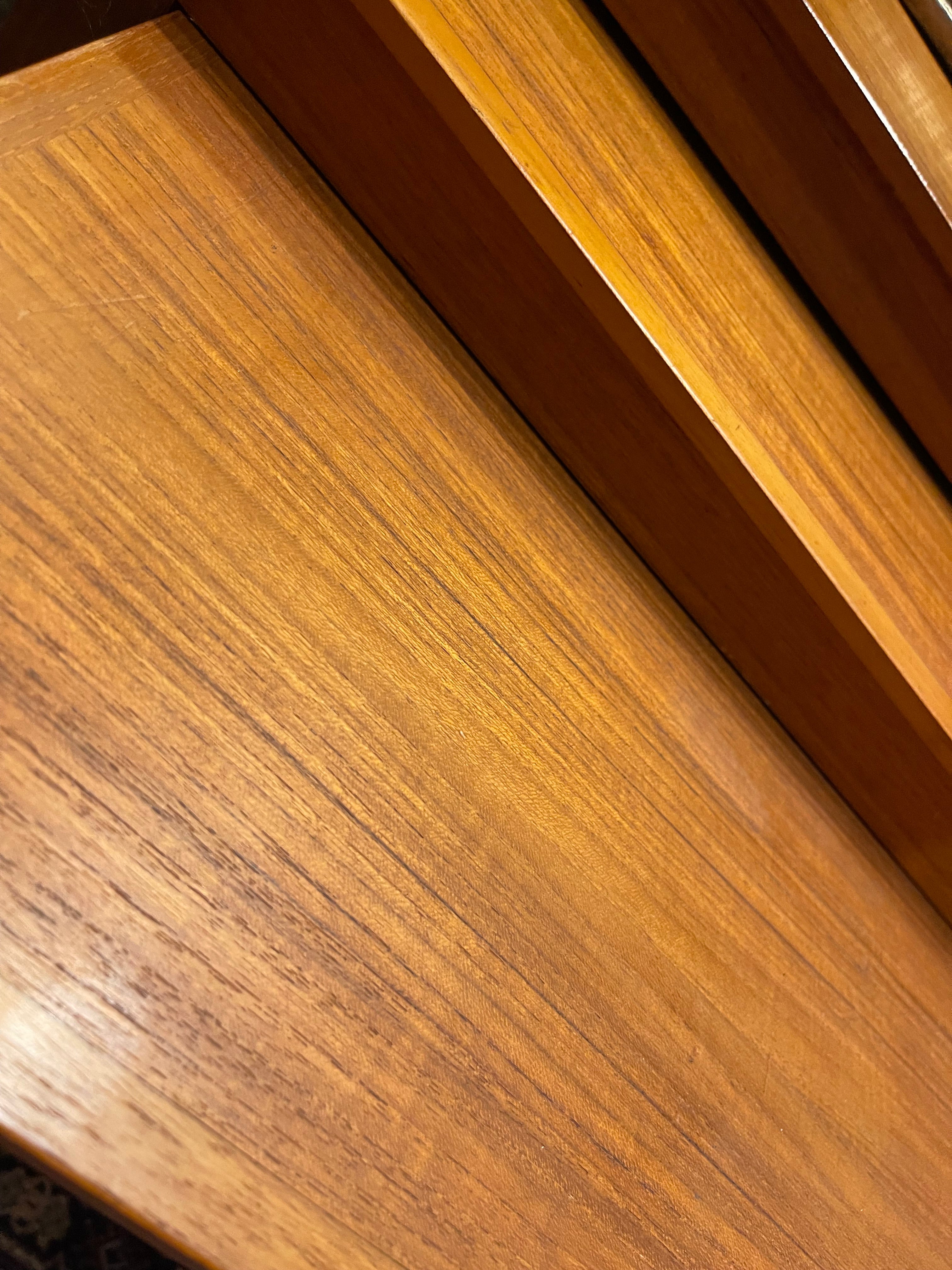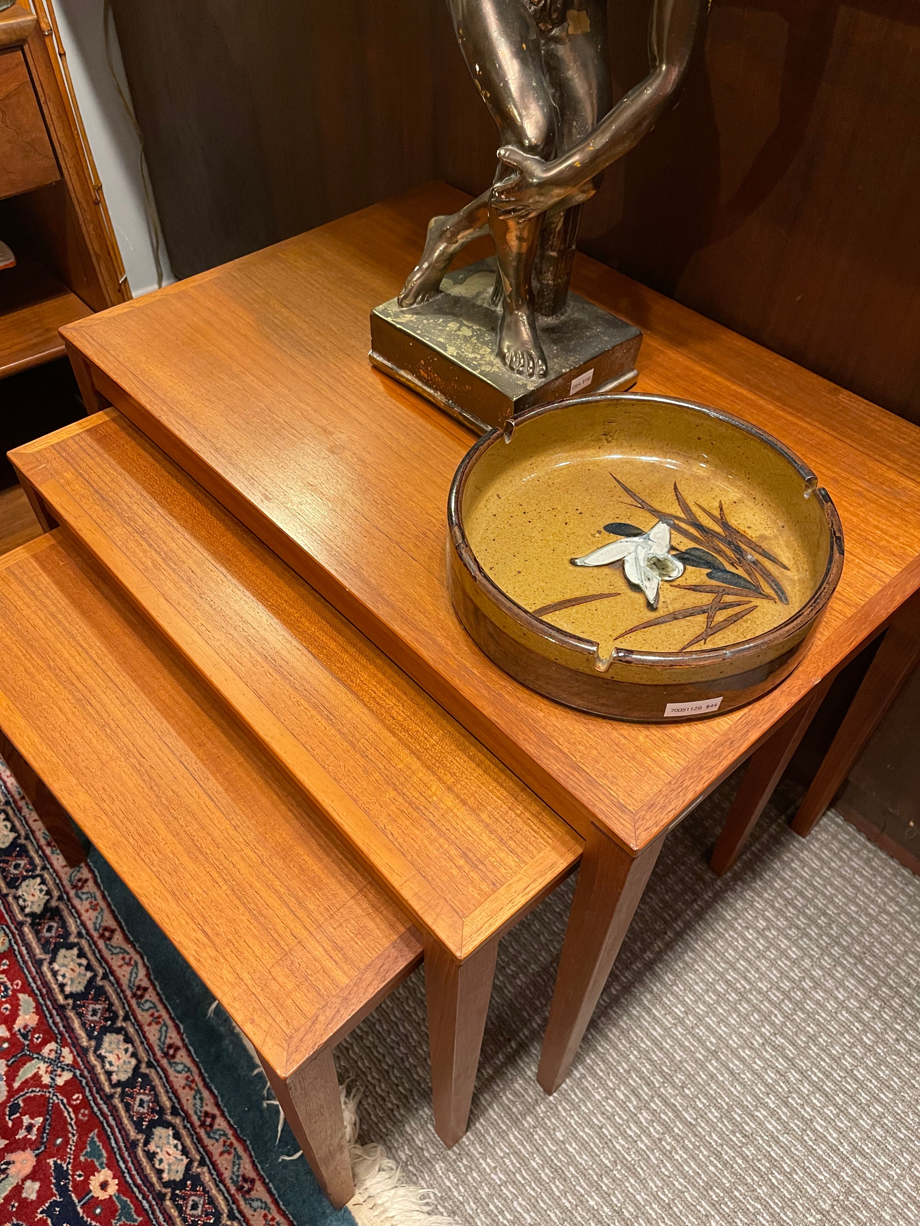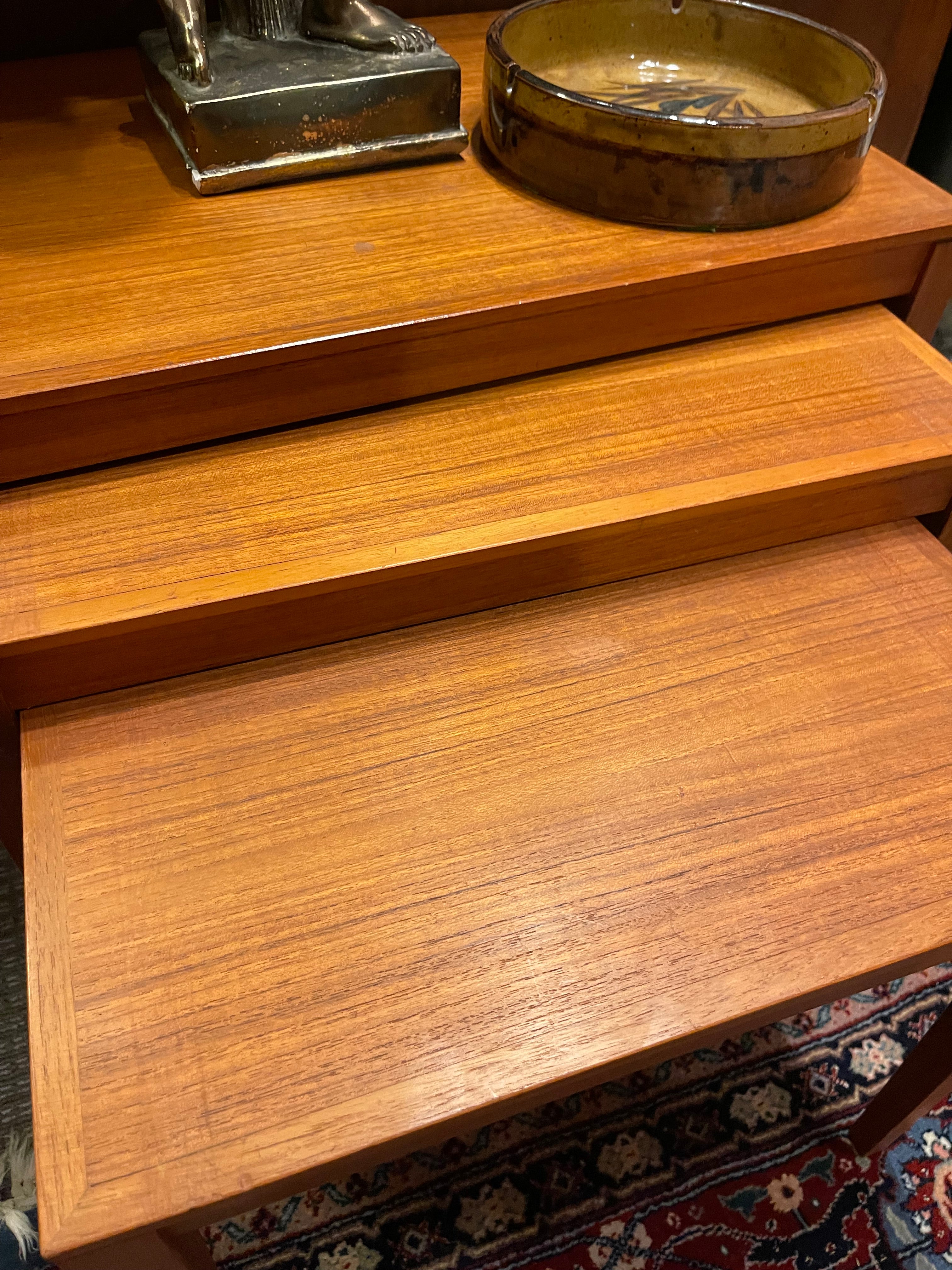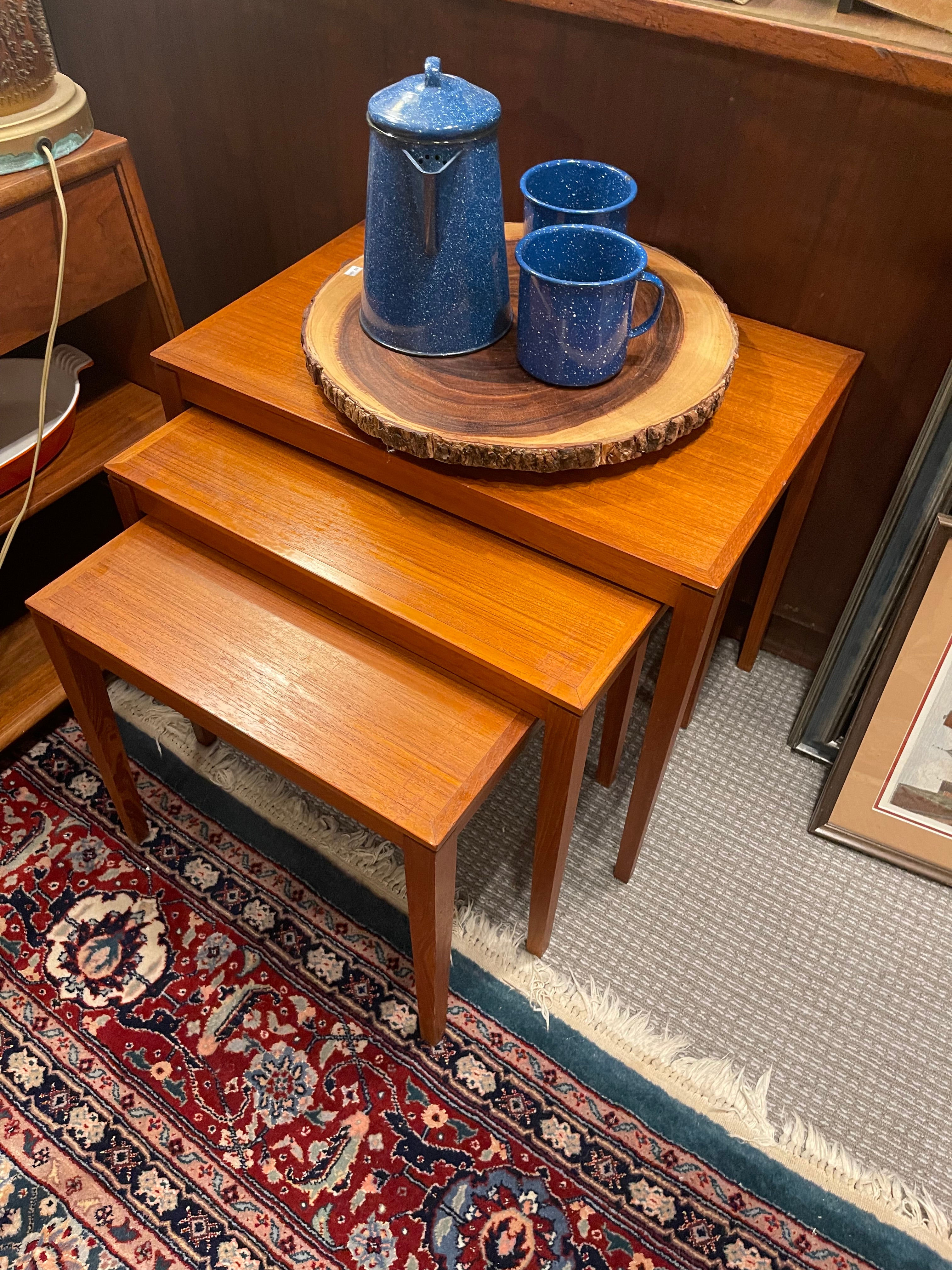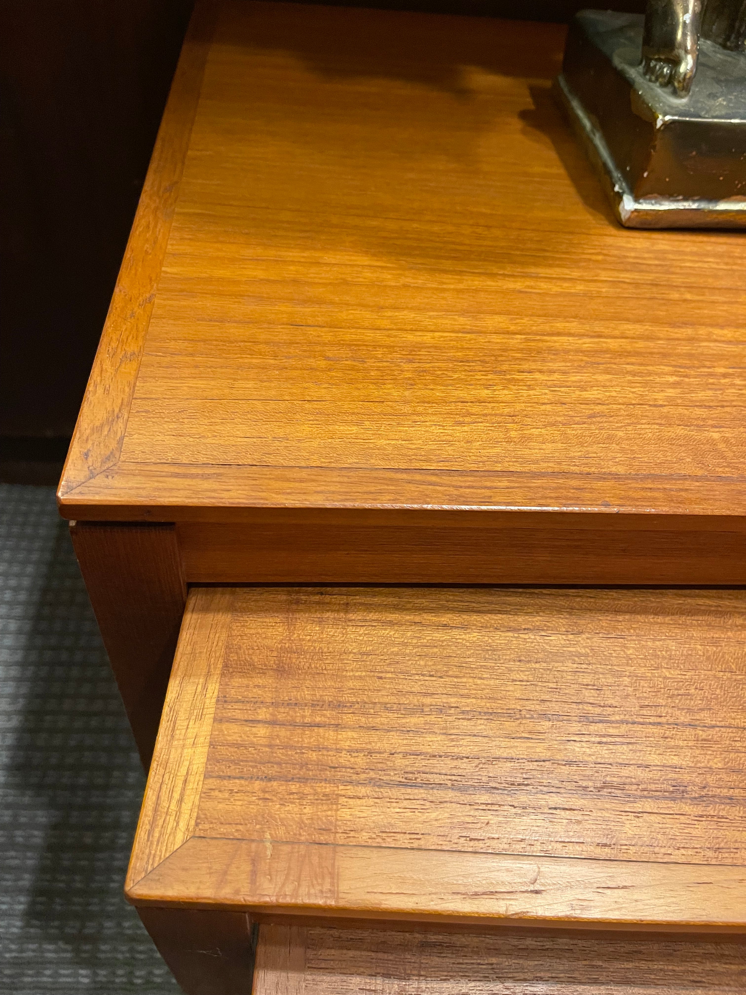 Set of three teak nesting tables. Made in Denmark. Some wear to the surface of these pieces but still present really well. Condition reflected in price. These are great for side tables or plant stands throughout the home.