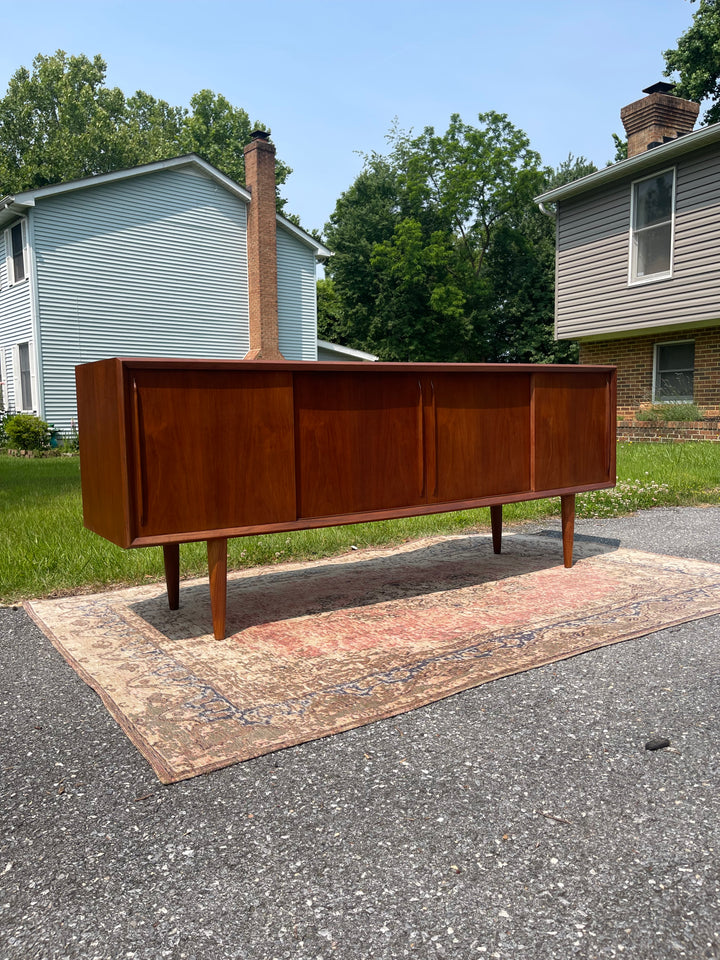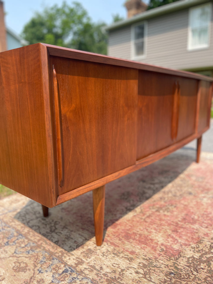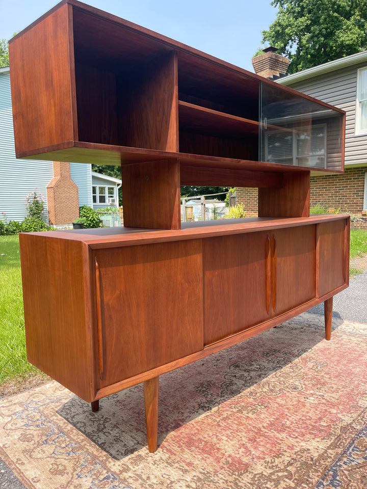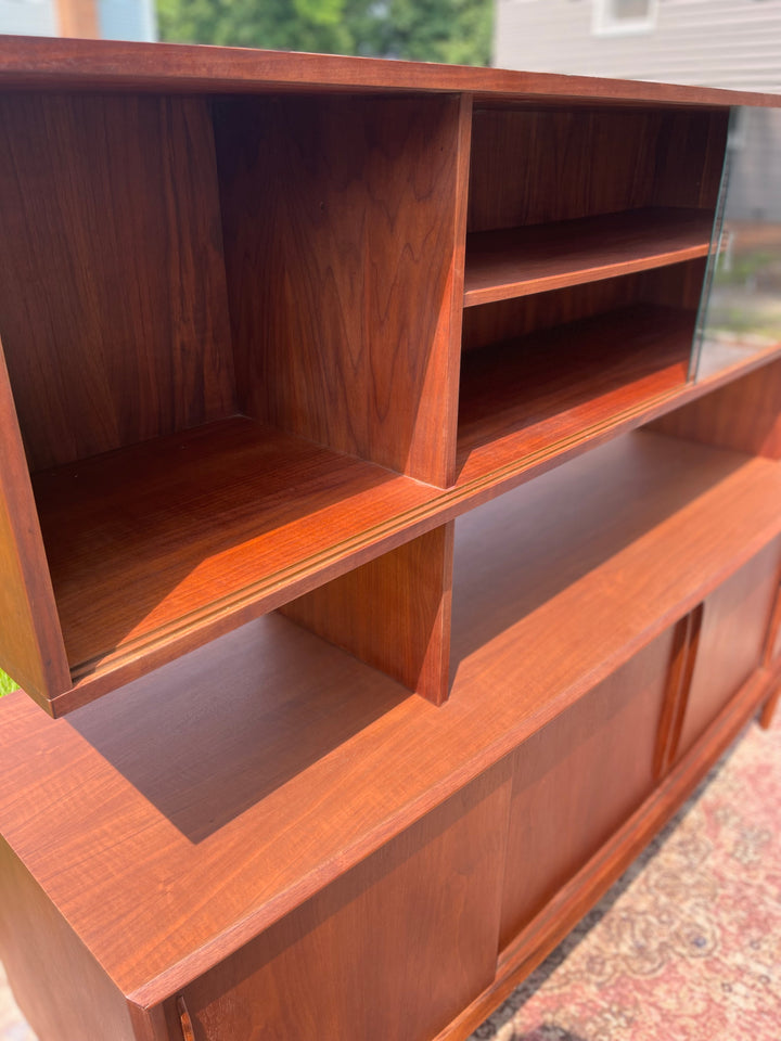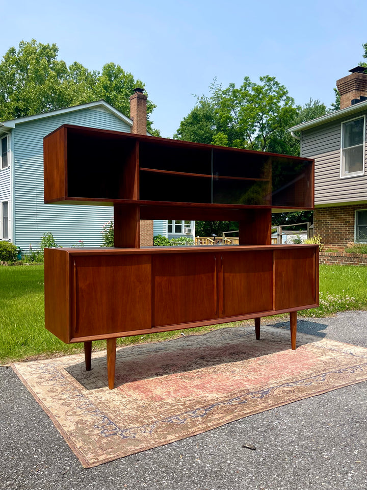This will be one of the finest pieces of furniture we have in stock at Magpie Reclamations this year! A beautifully refinished large bow fronted teak credenza and hutch from Peter Lovig Nielsen. Four spacious cabinets with sliding doors on the bottom credenza sit upon solid teak legs. The hutch is glass fronted for a Liz Scandinavian display.