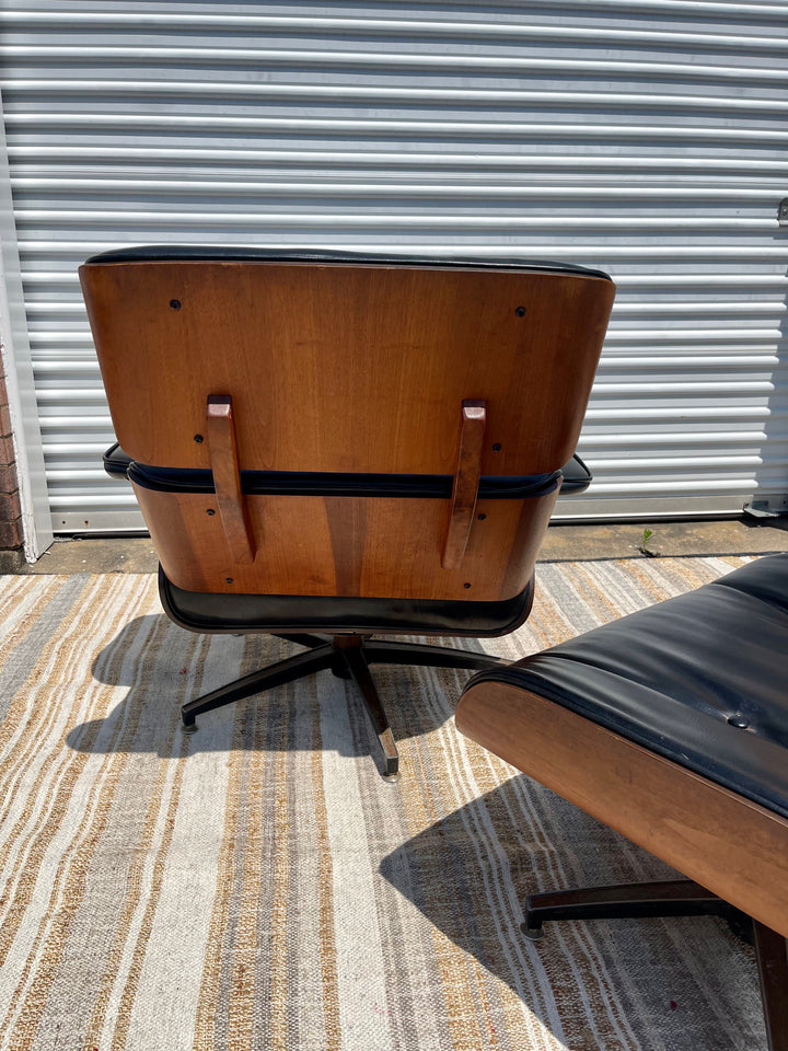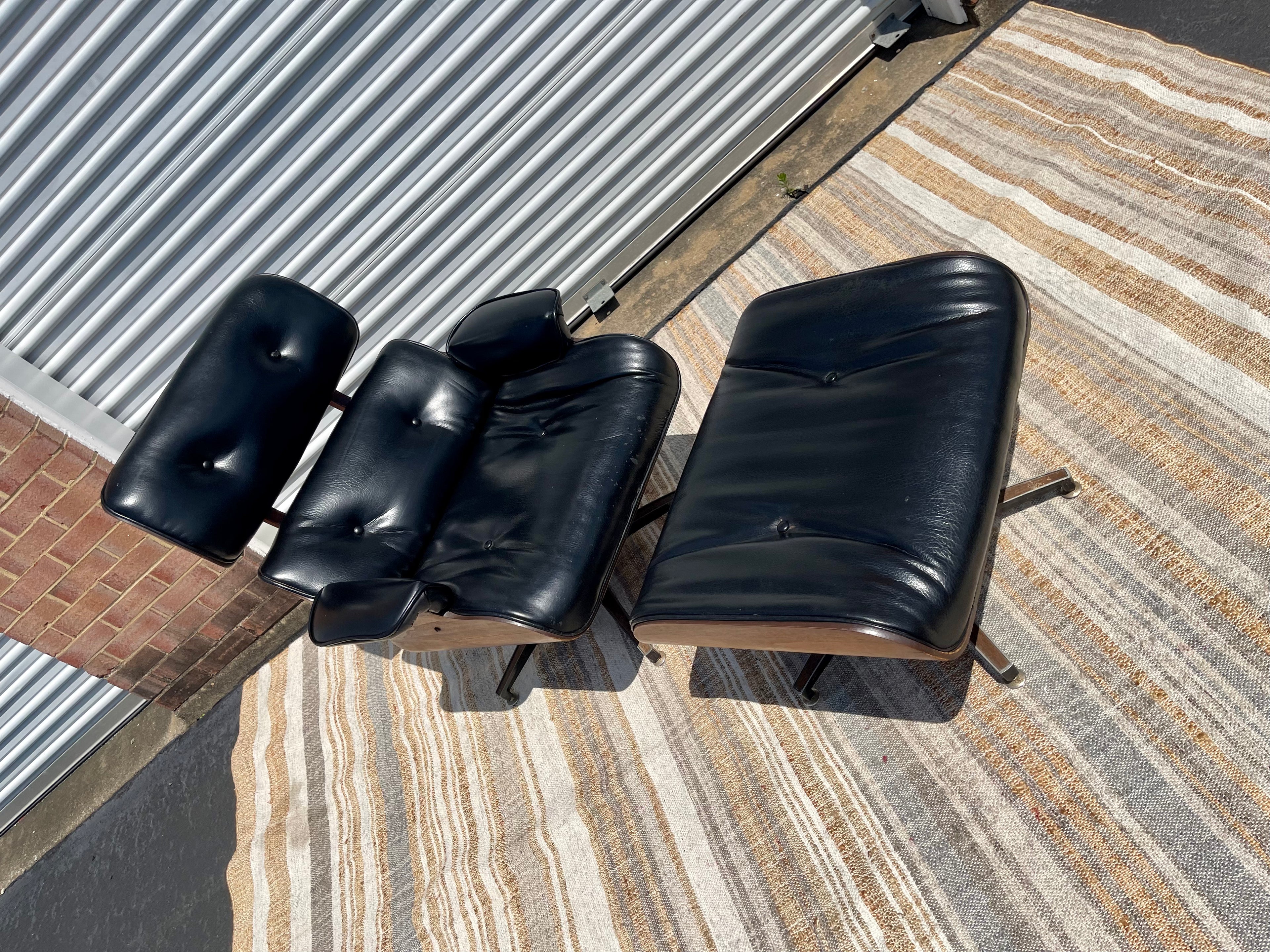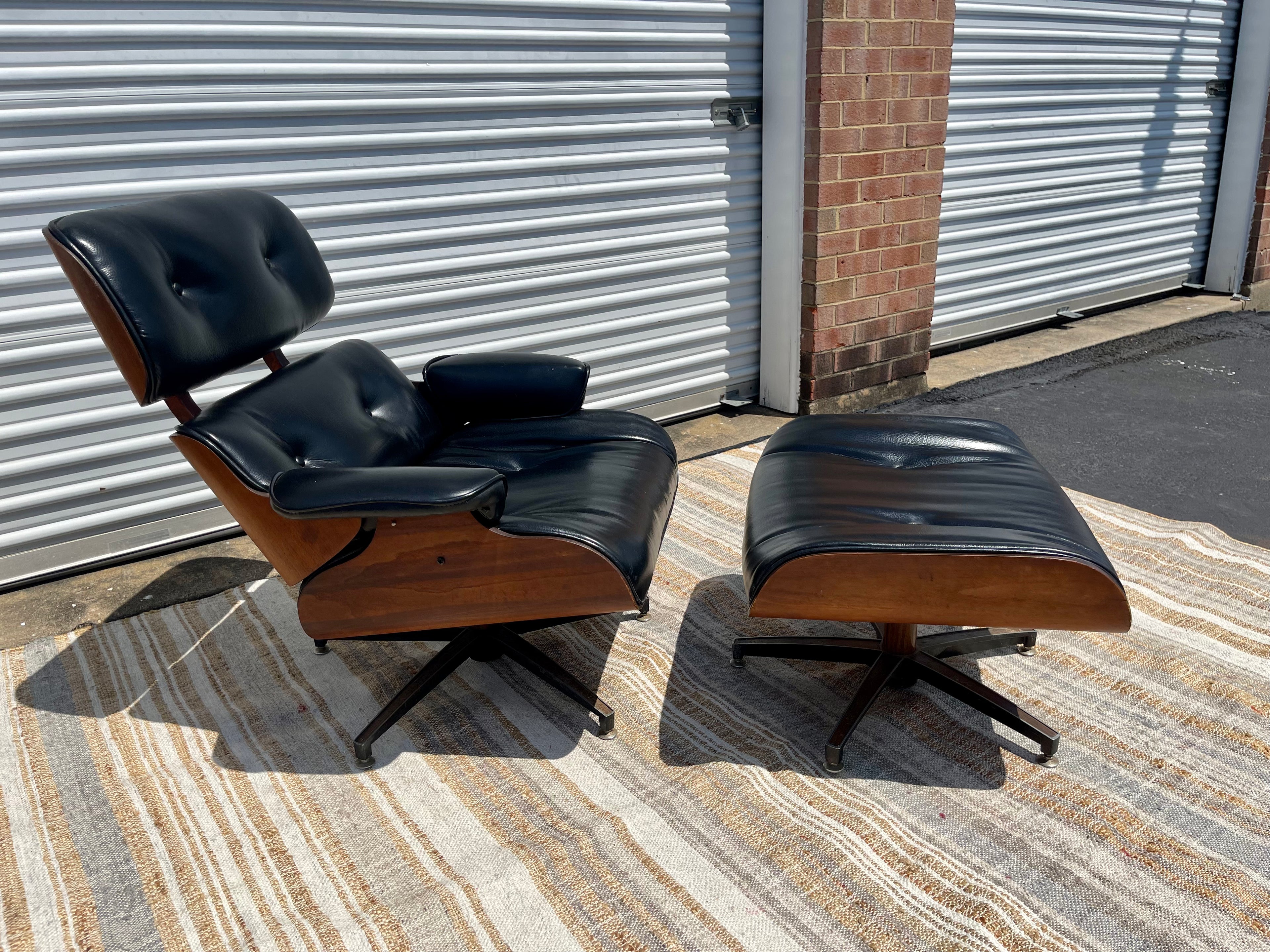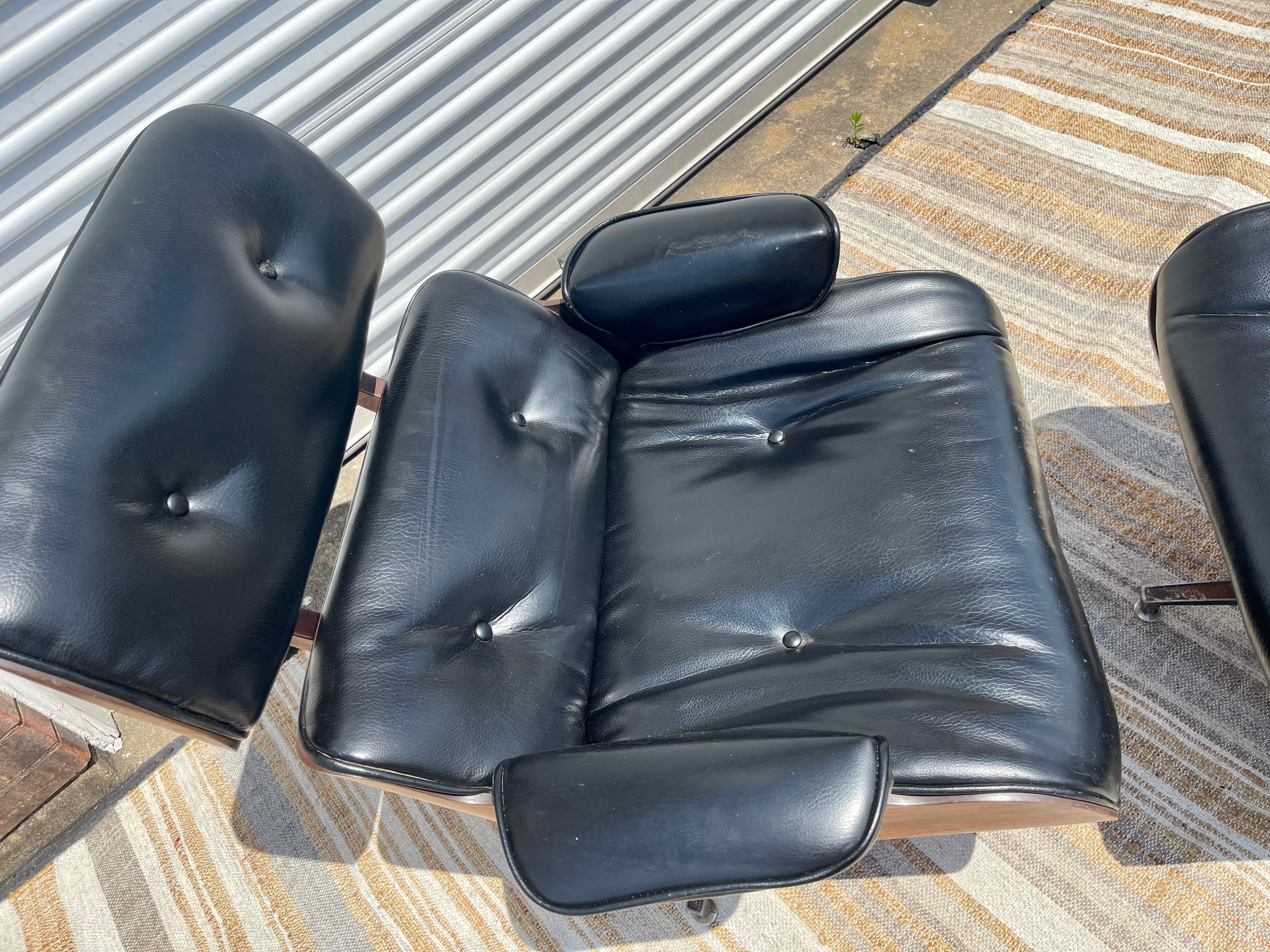 The Eames Lounger is ubiquitous with Midcentury modern design. This example from Plycraft is in good vintage condition. The black faux leather has no rips or tears, with only some light wear along the front edge of the chair. This chair is the perfect combination of comfort and style, and will immediately become your favorite place to sit in your house. Add it to a living room or create a classy reading nook.