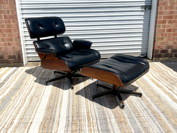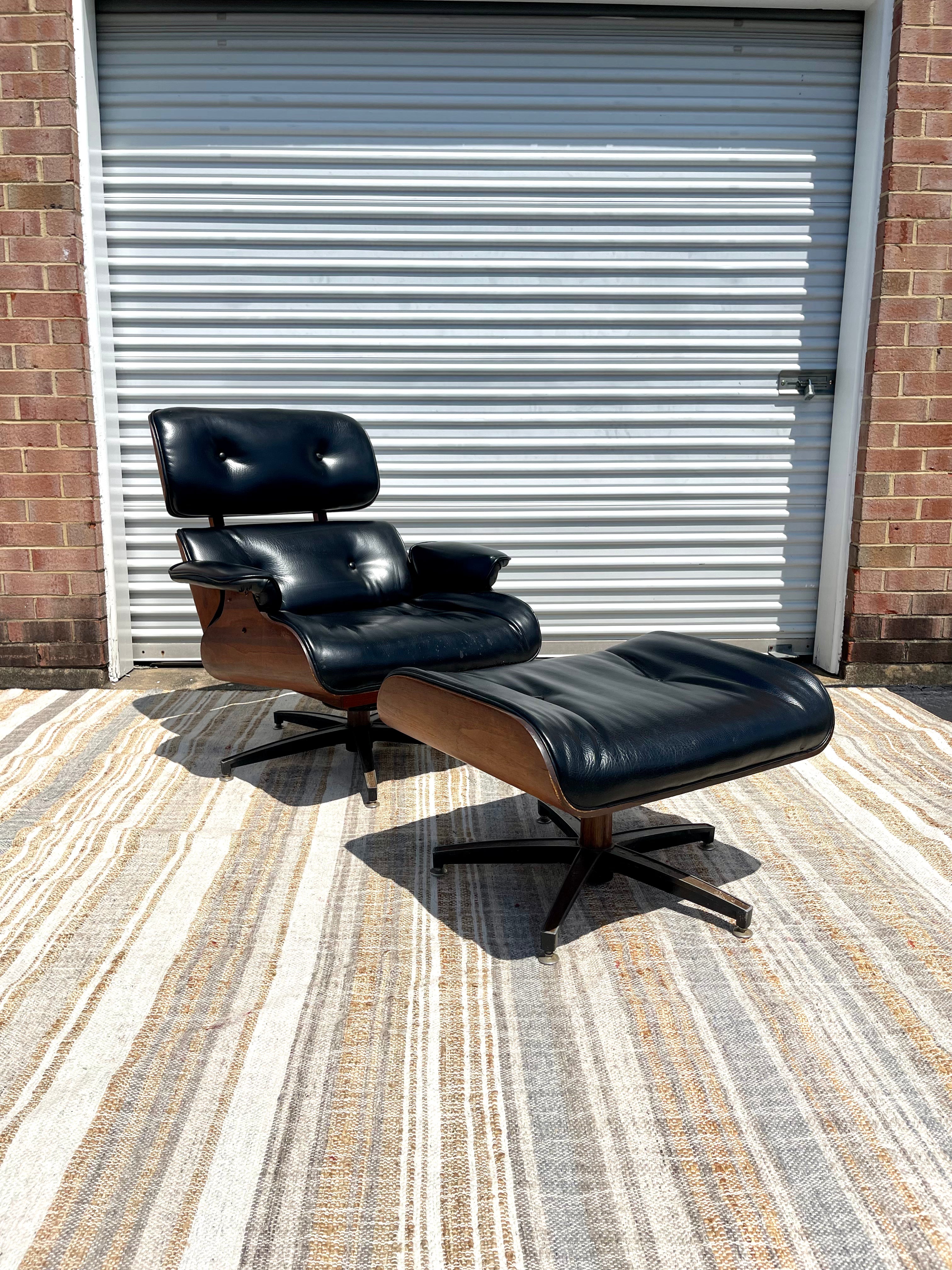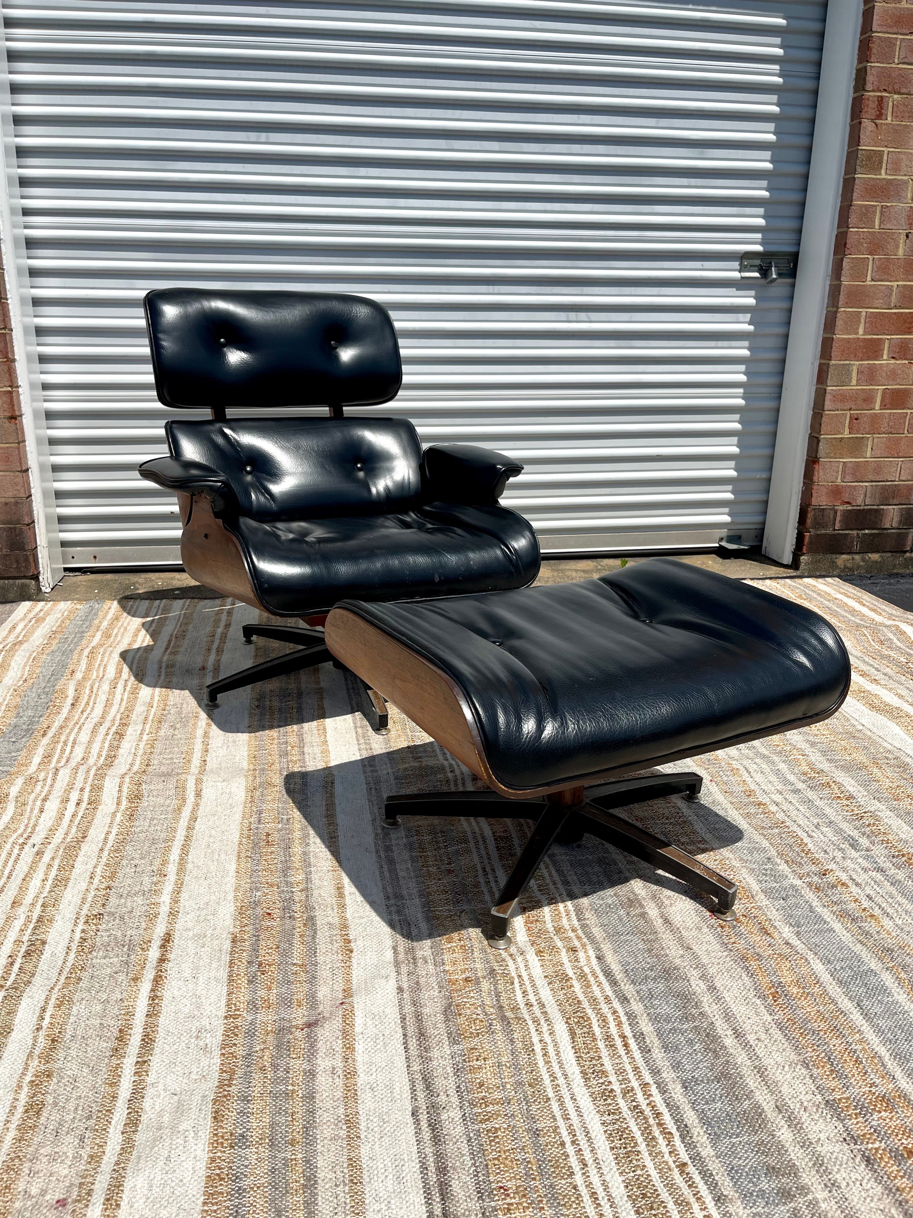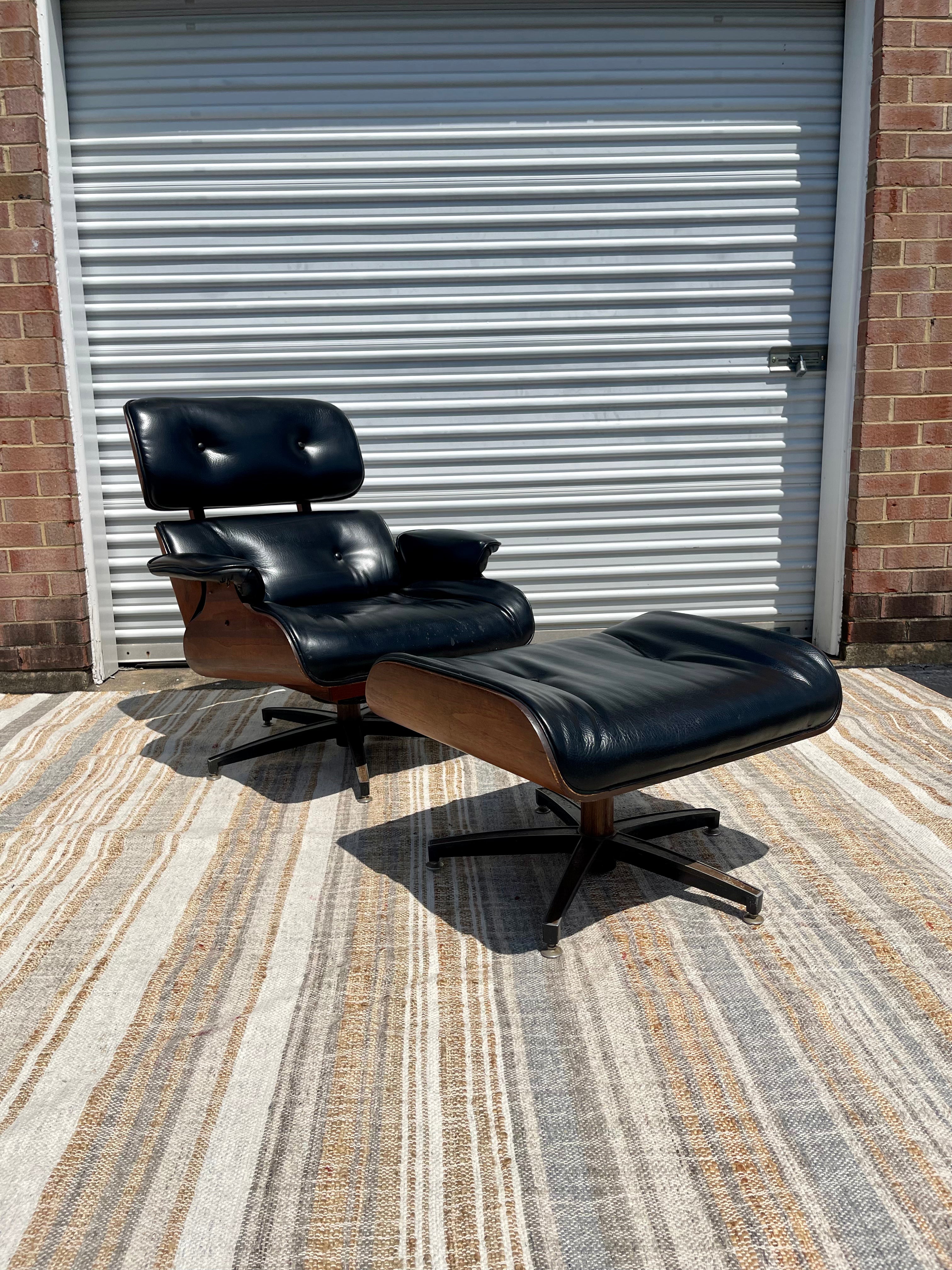 The Eames Lounger is ubiquitous with Midcentury modern design. This example from Plycraft is in good vintage condition. The black faux leather has no rips or tears, with only some light wear along the front edge of the chair. This chair is the perfect combination of comfort and style, and will immediately become your favorite place to sit in your house. Add it to a living room or create a classy reading nook.