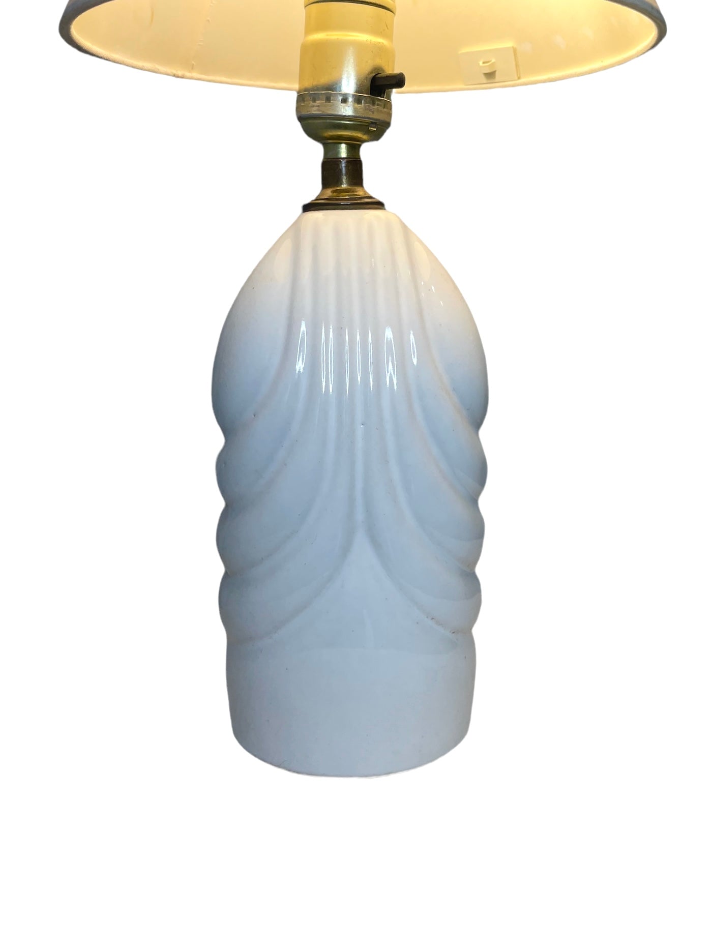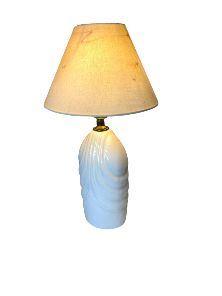 White proclain small table lamp in a post modern design. Functions perfectly, crack running along left side but still perfectly useable and does not detract from the aesthetic. Measurement is to the socket. Lamp shade not included.