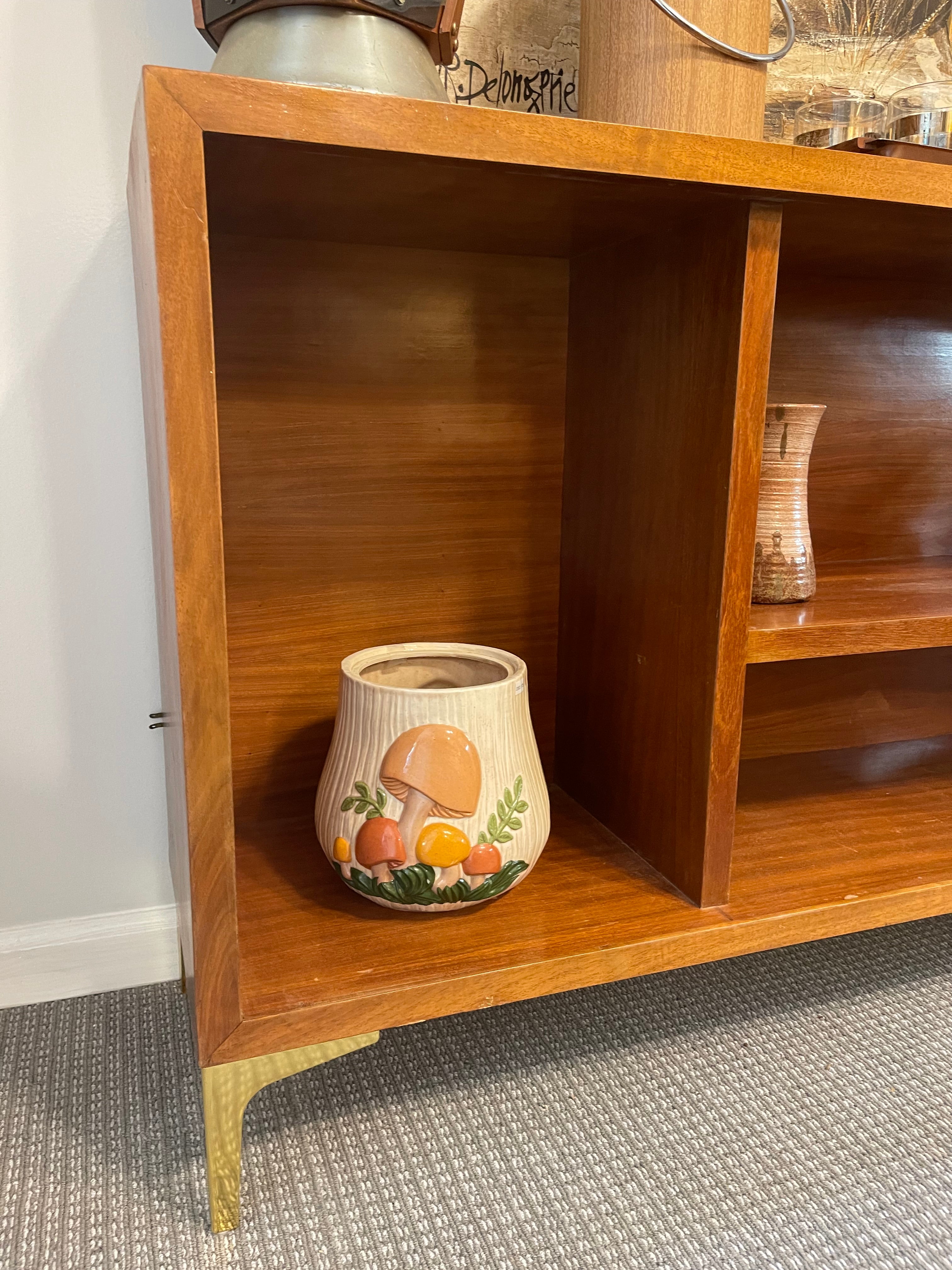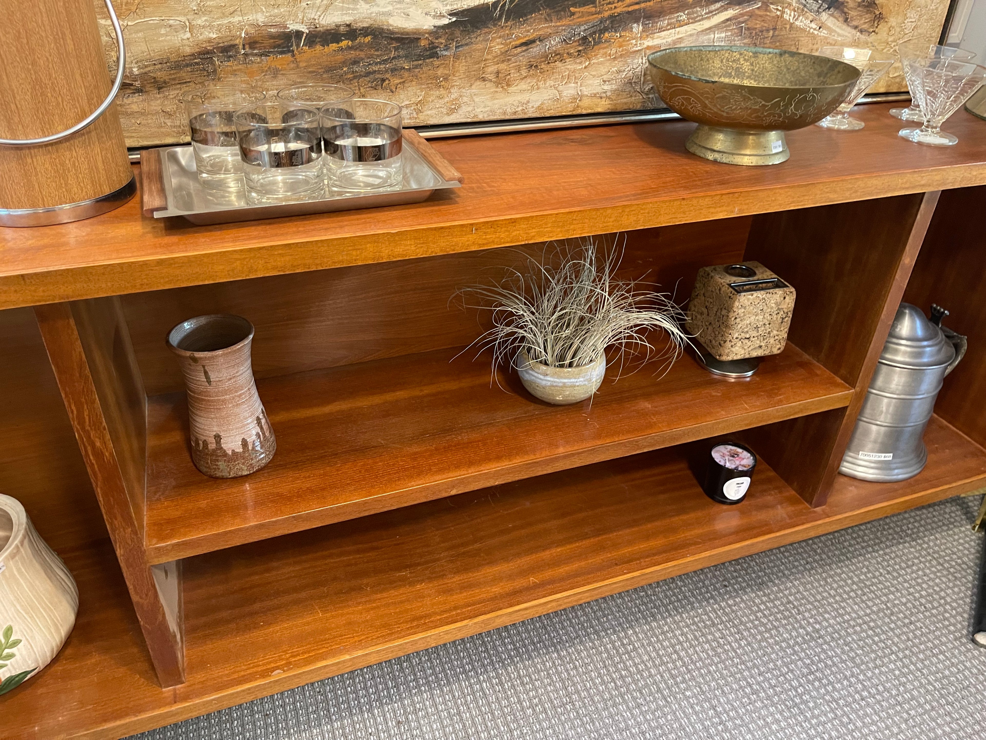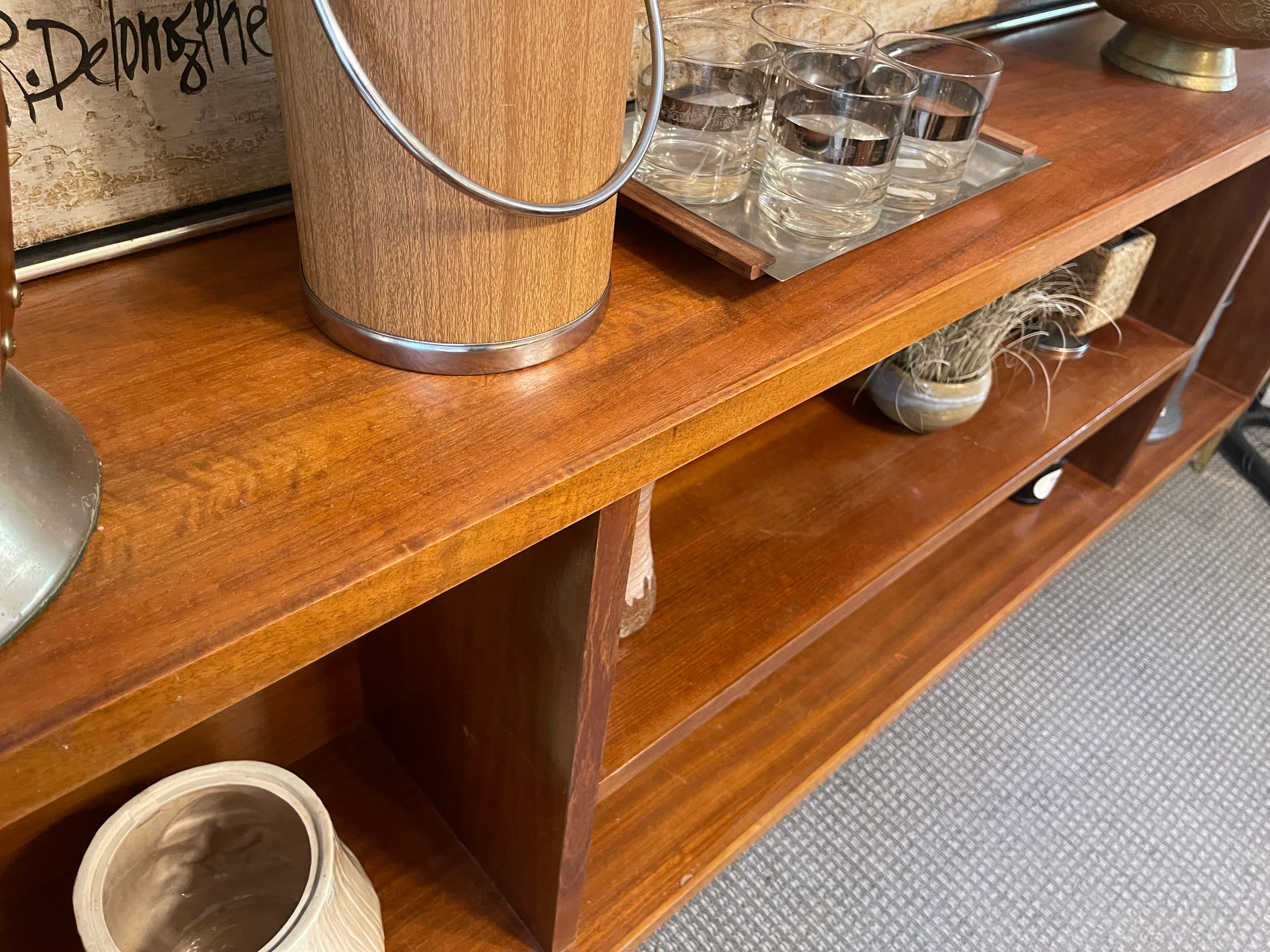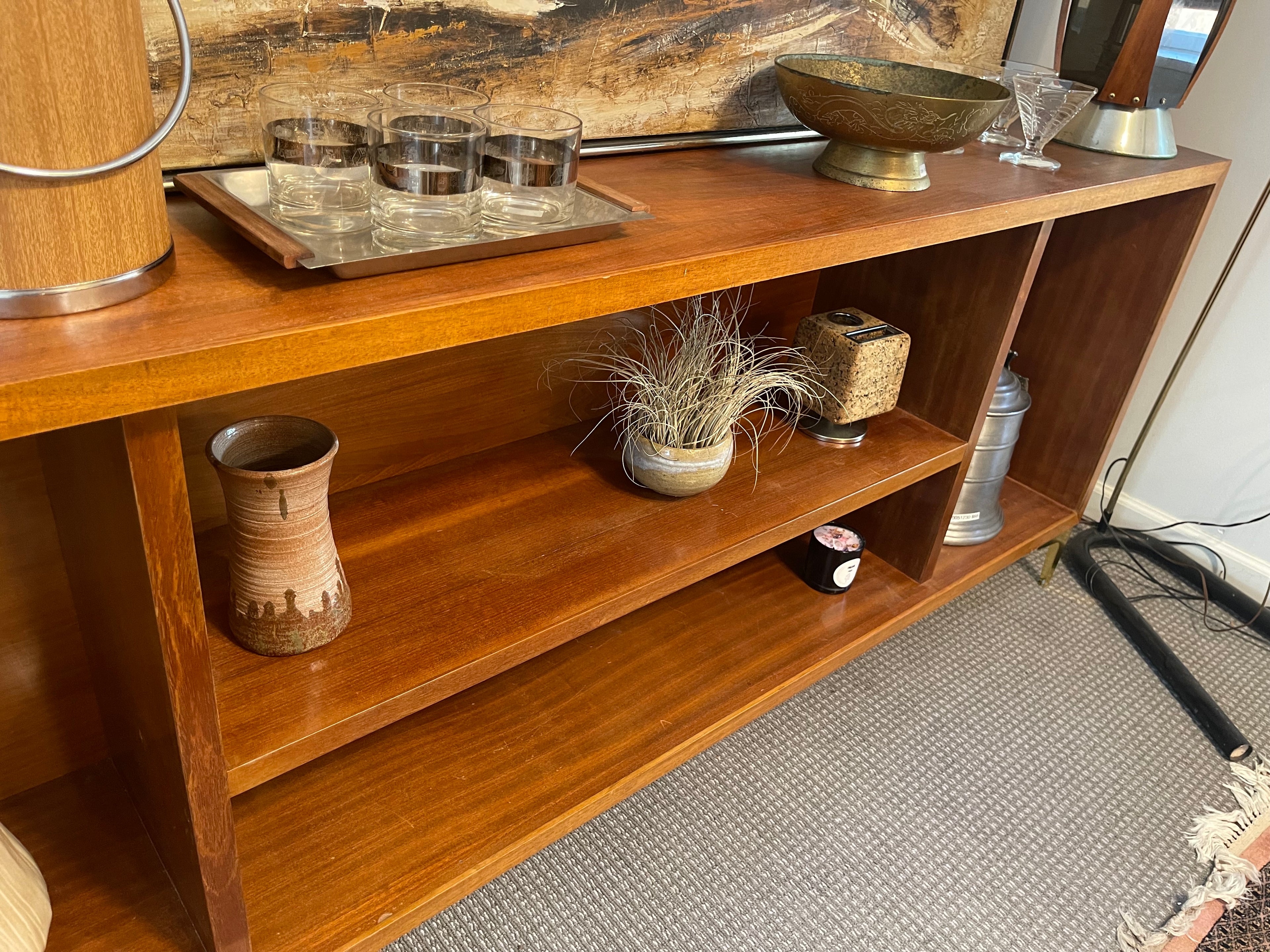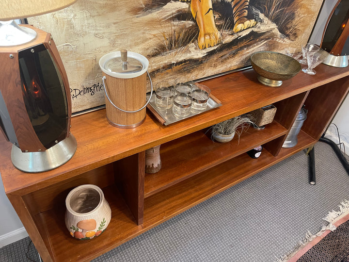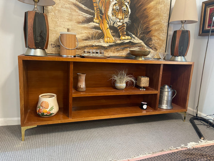 A unique Magpie Reclamation. The frame of this piece is from an Italian set built in the 1930s. The wooden frame has been refinished to highlight the beauty of the wood grain. We have added brass legs to increase function and style. Could be used as a large low bookcase or media stand. One of a kind.