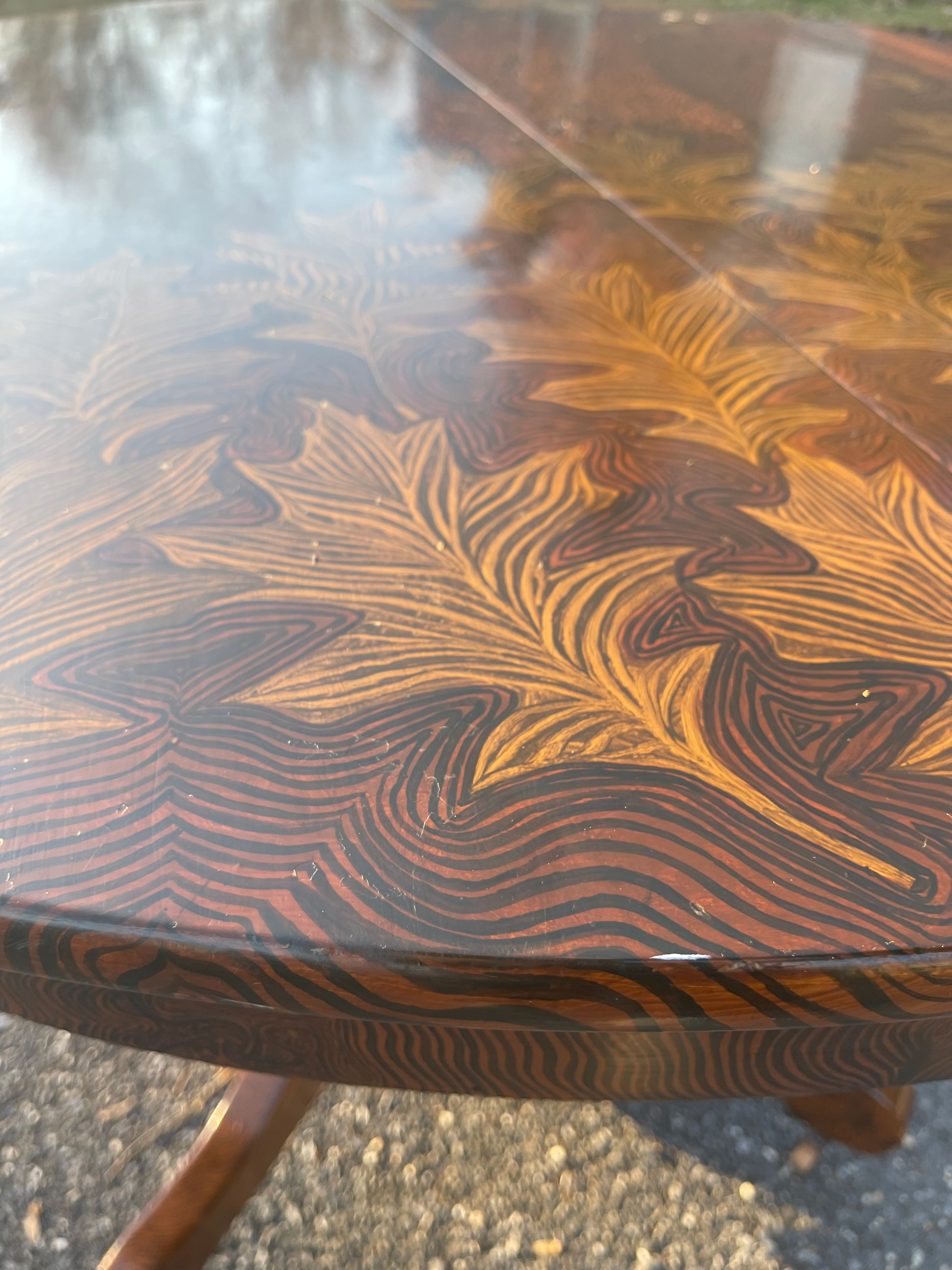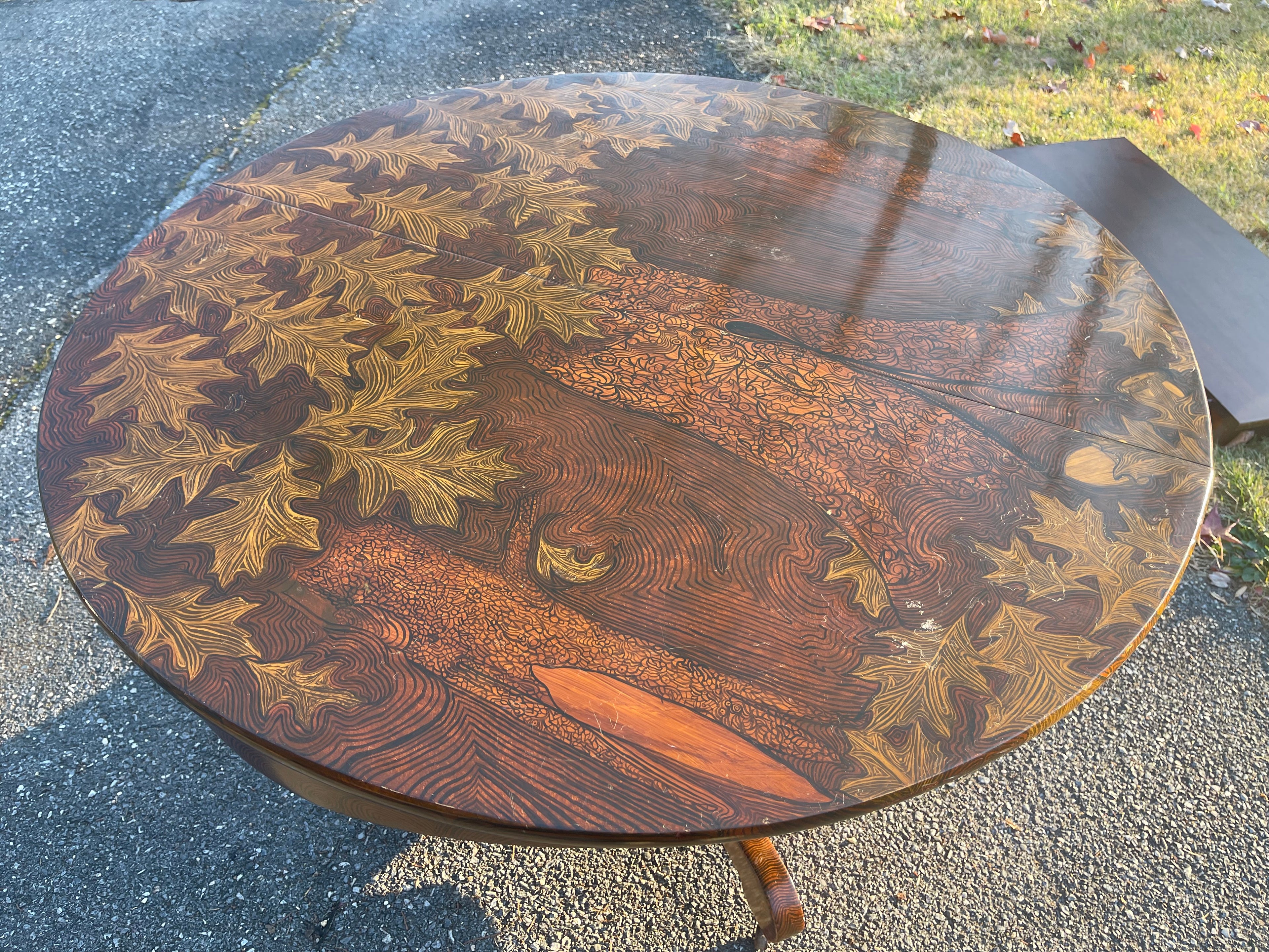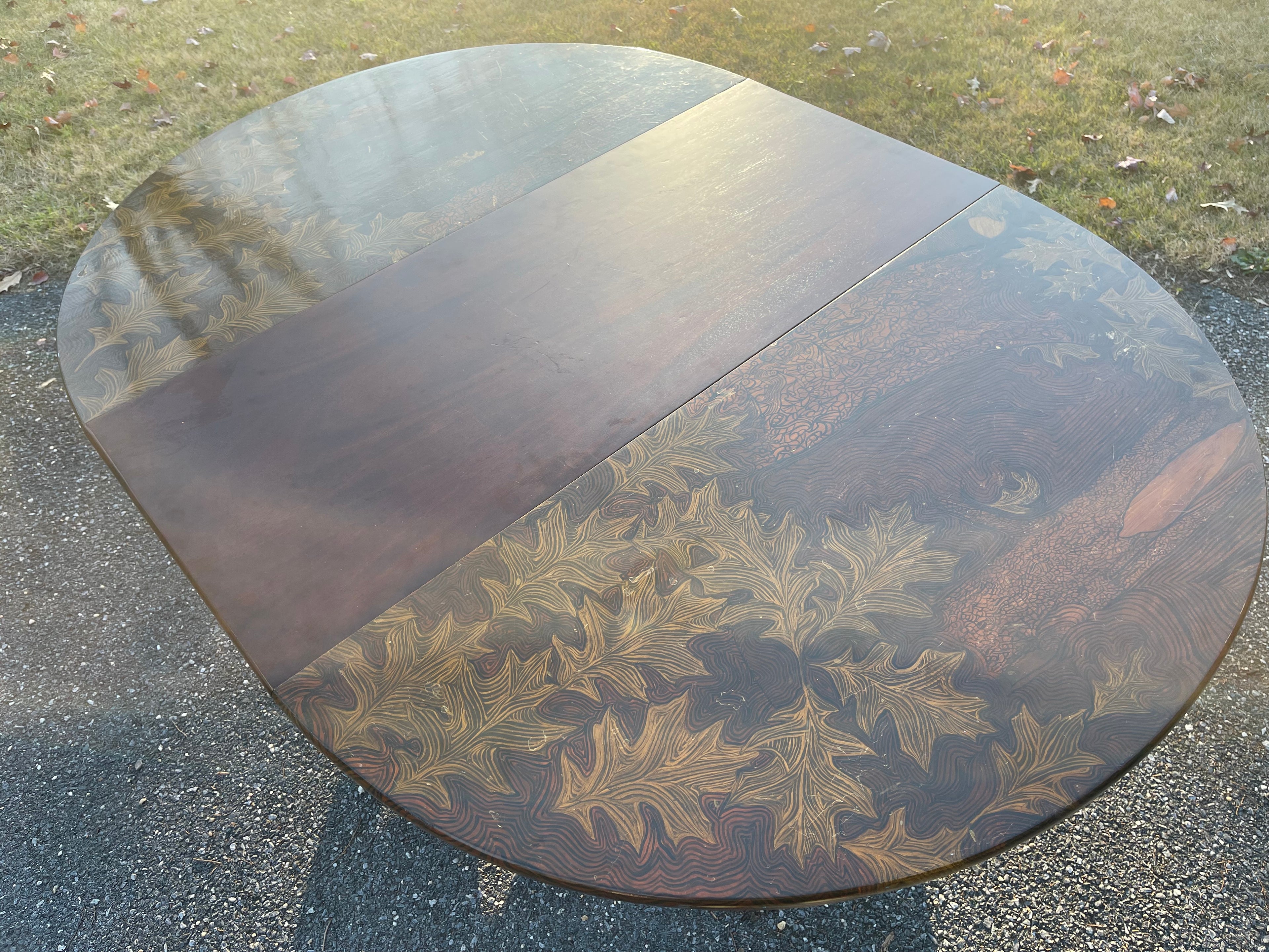 One of a kind with incredible artistic detail, this solid rosewood dining table is an absolute statement piece. The table itself is likely an antique (over 100 years old). Artist T.L. Moore refinished and painted this incredible piece in 1979 with a beautiful tree motif. The incredible detail extends to the base as well. This piece does come with a leaf which extends the length, although the leaf is not finished by the artist.