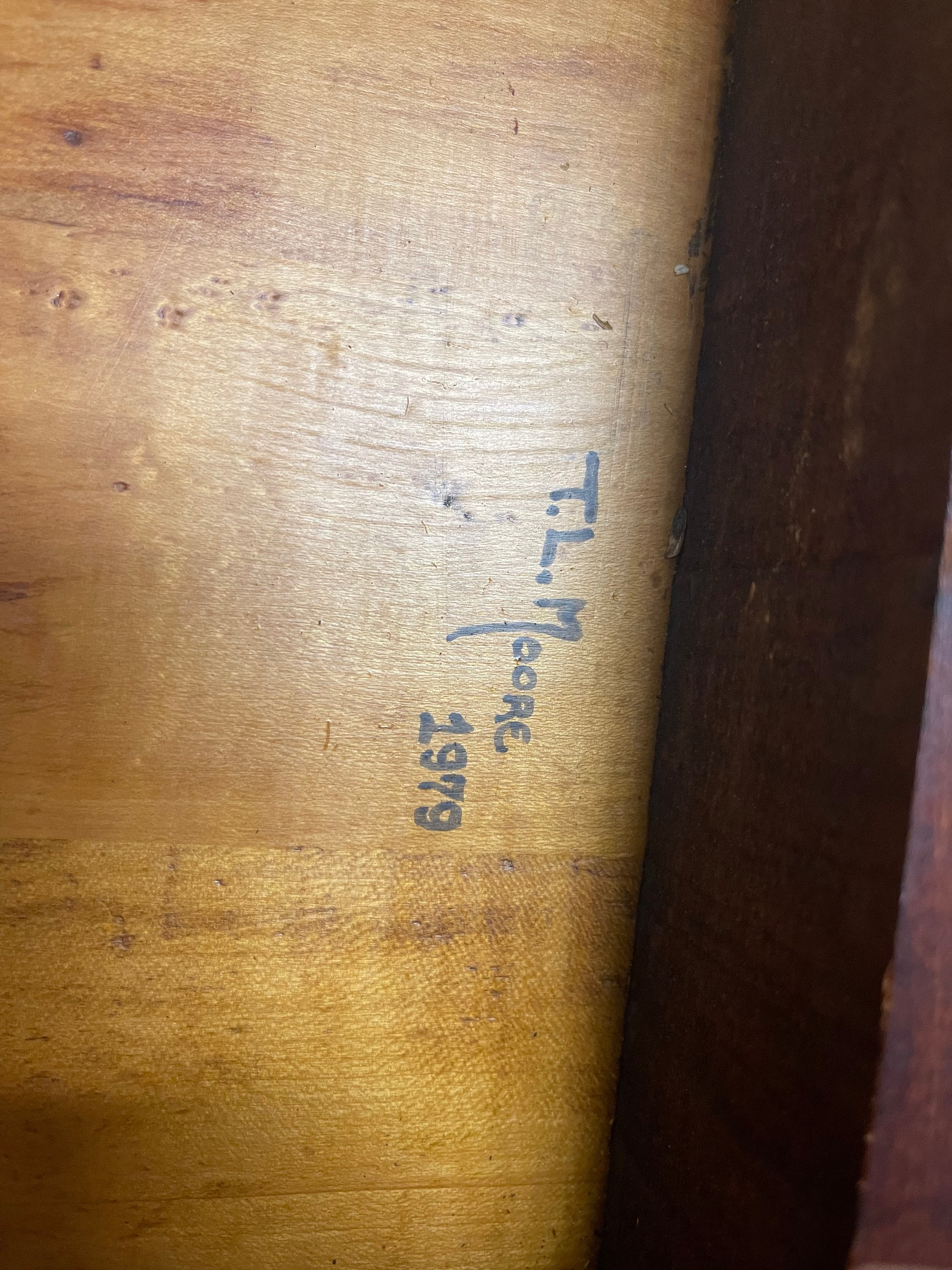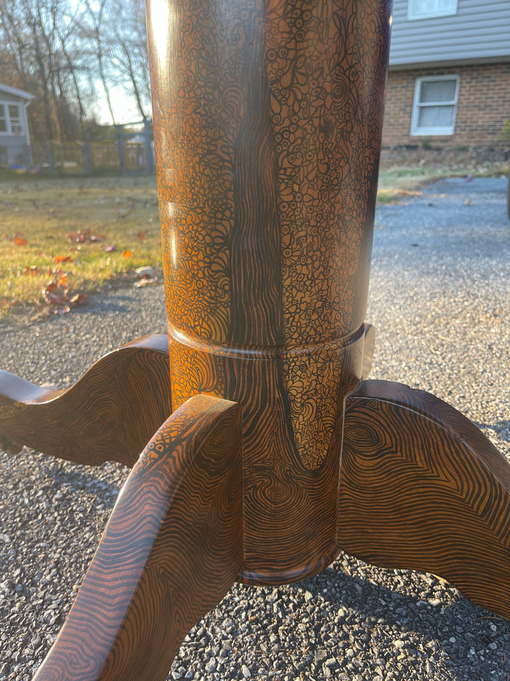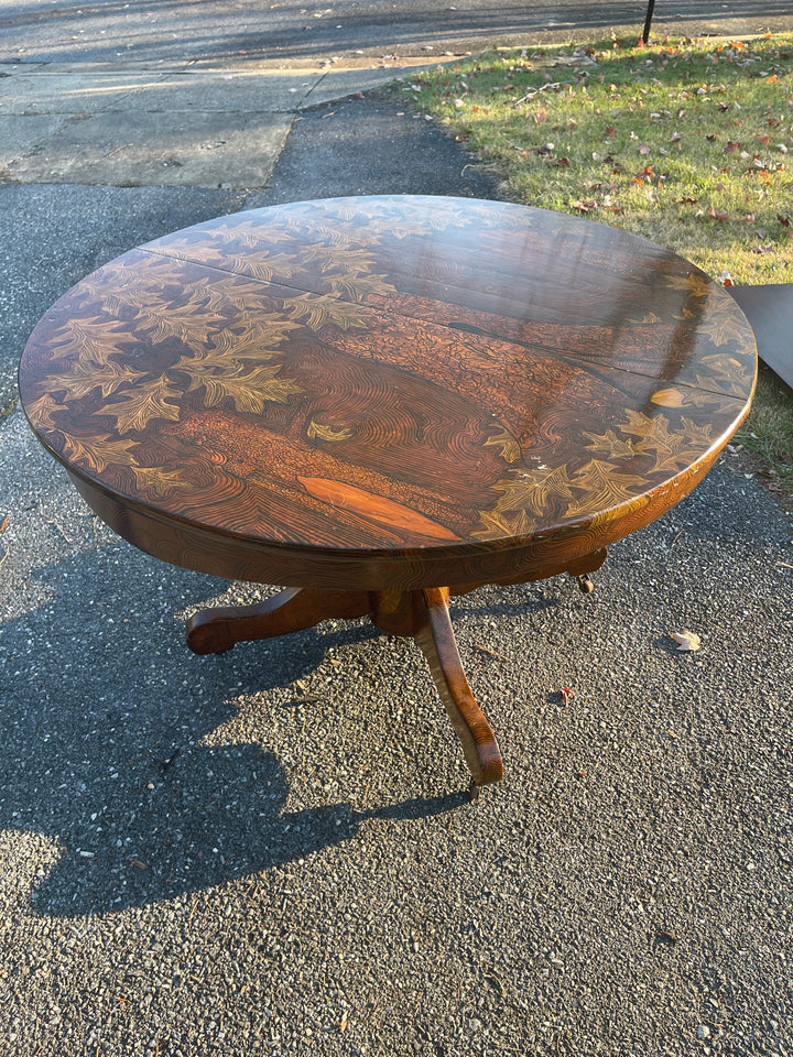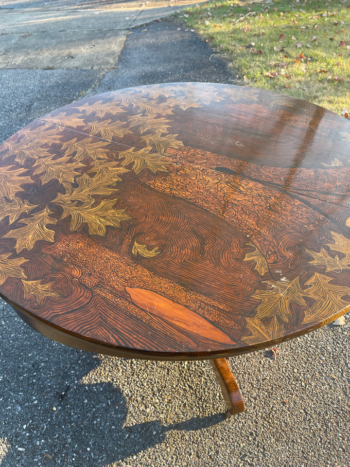 One of a kind with incredible artistic detail, this solid rosewood dining table is an absolute statement piece. The table itself is likely an antique (over 100 years old). Artist T.L. Moore refinished and painted this incredible piece in 1979 with a beautiful tree motif. The incredible detail extends to the base as well. This piece does come with a leaf which extends the length, although the leaf is not finished by the artist.