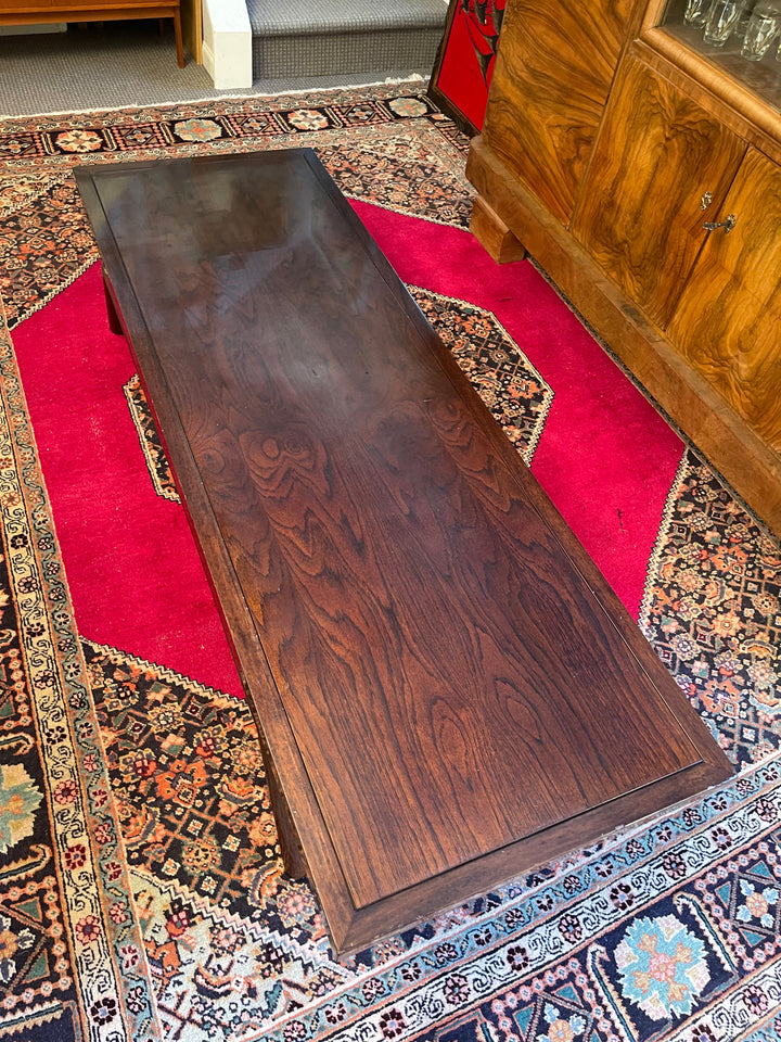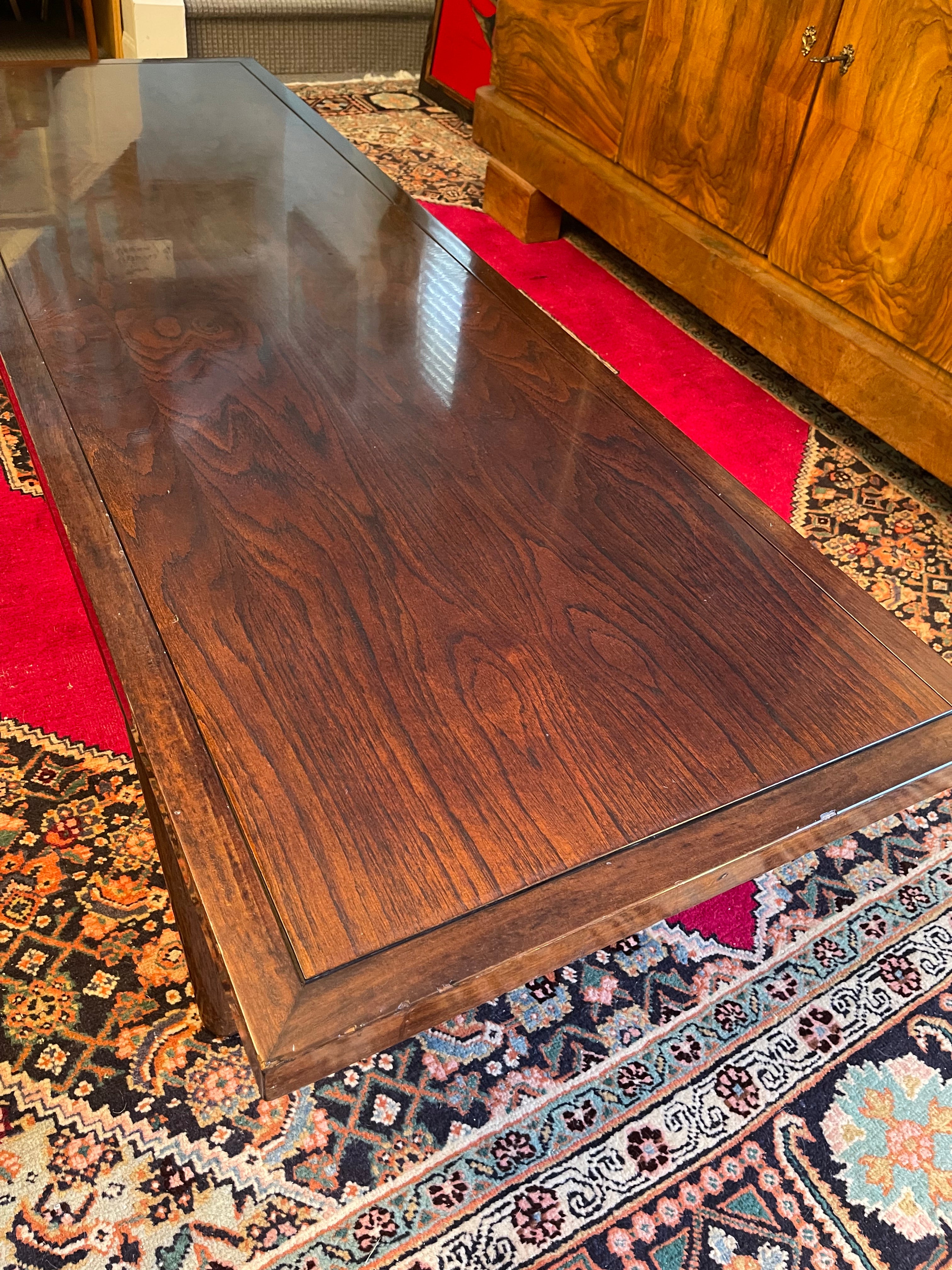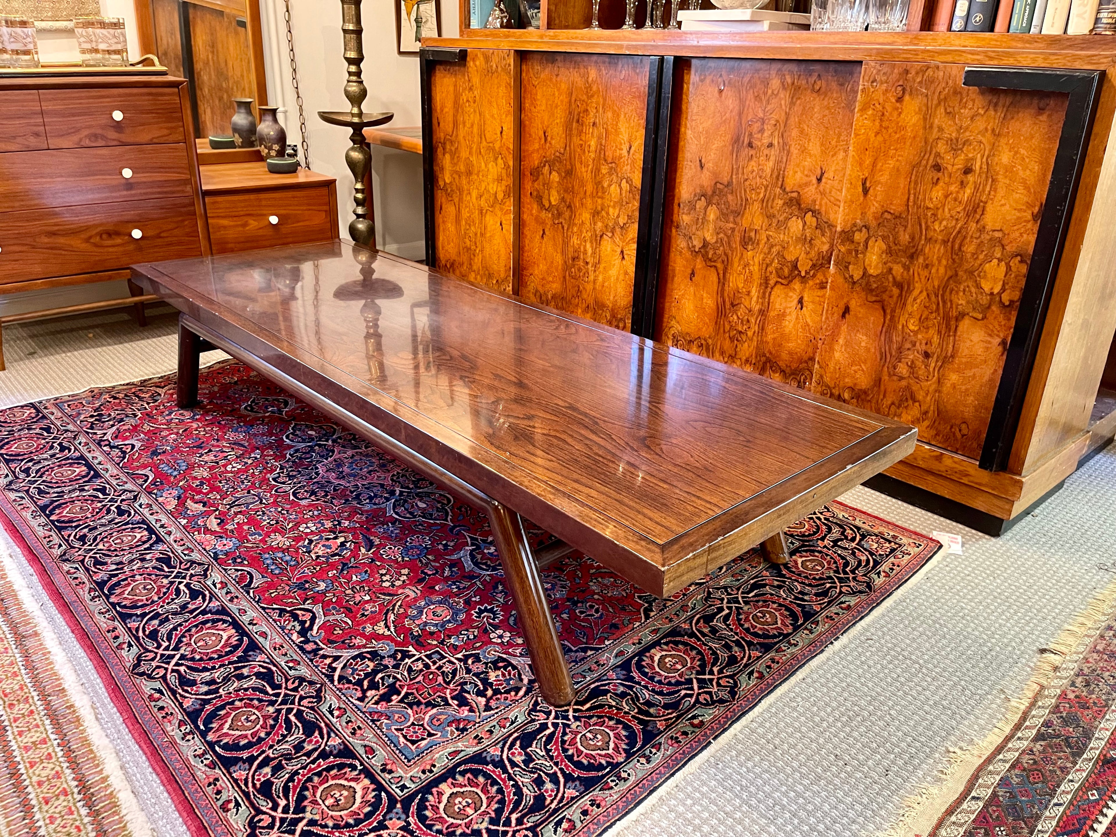 The coffee table is low and sleek, with a dark espresso stain and a thick high gloss lacquer finish. Tapered legs give this piece a stylish Midcentury modern feel. Solid wood base and frame. I’m good vintage condition.