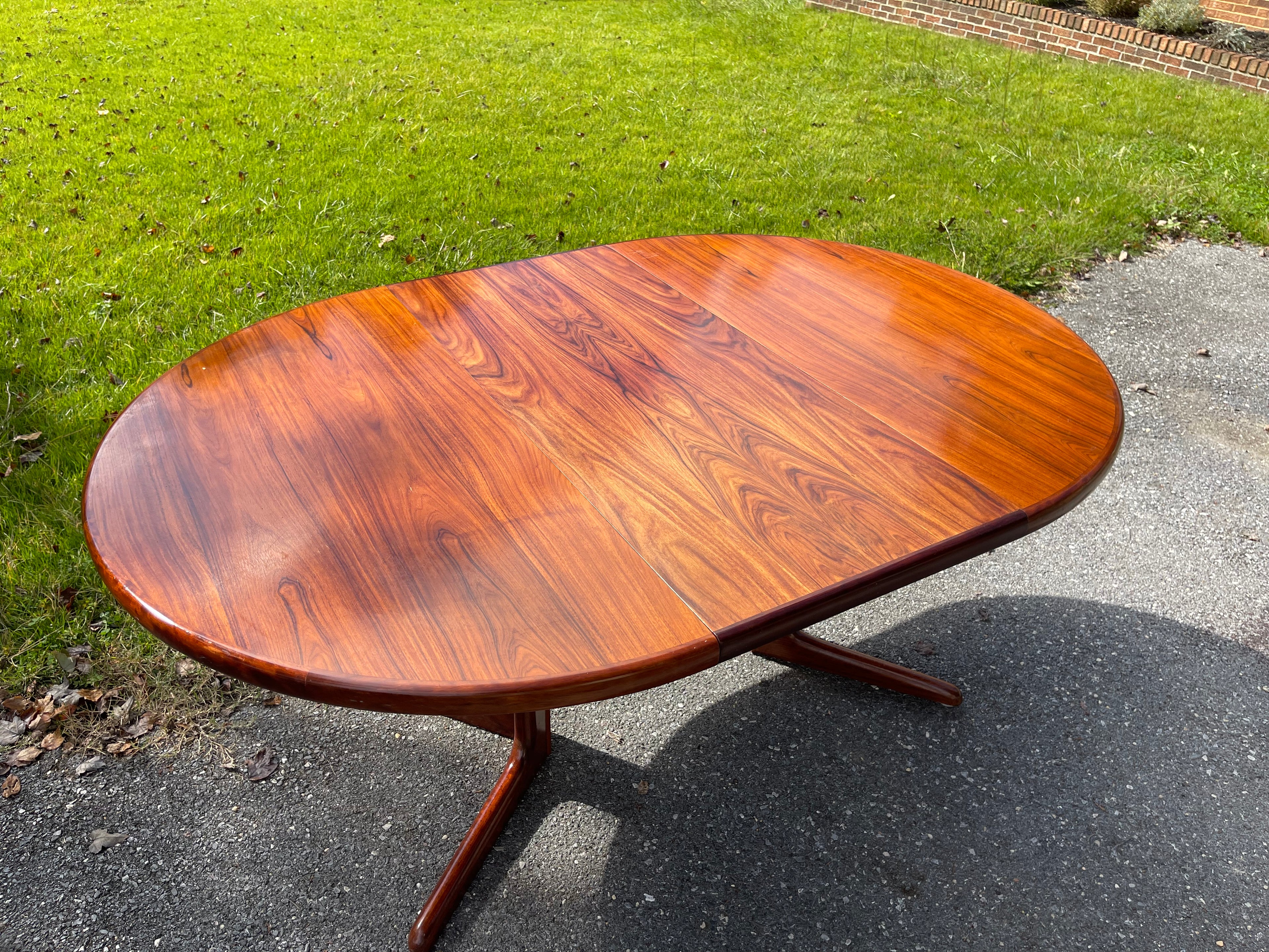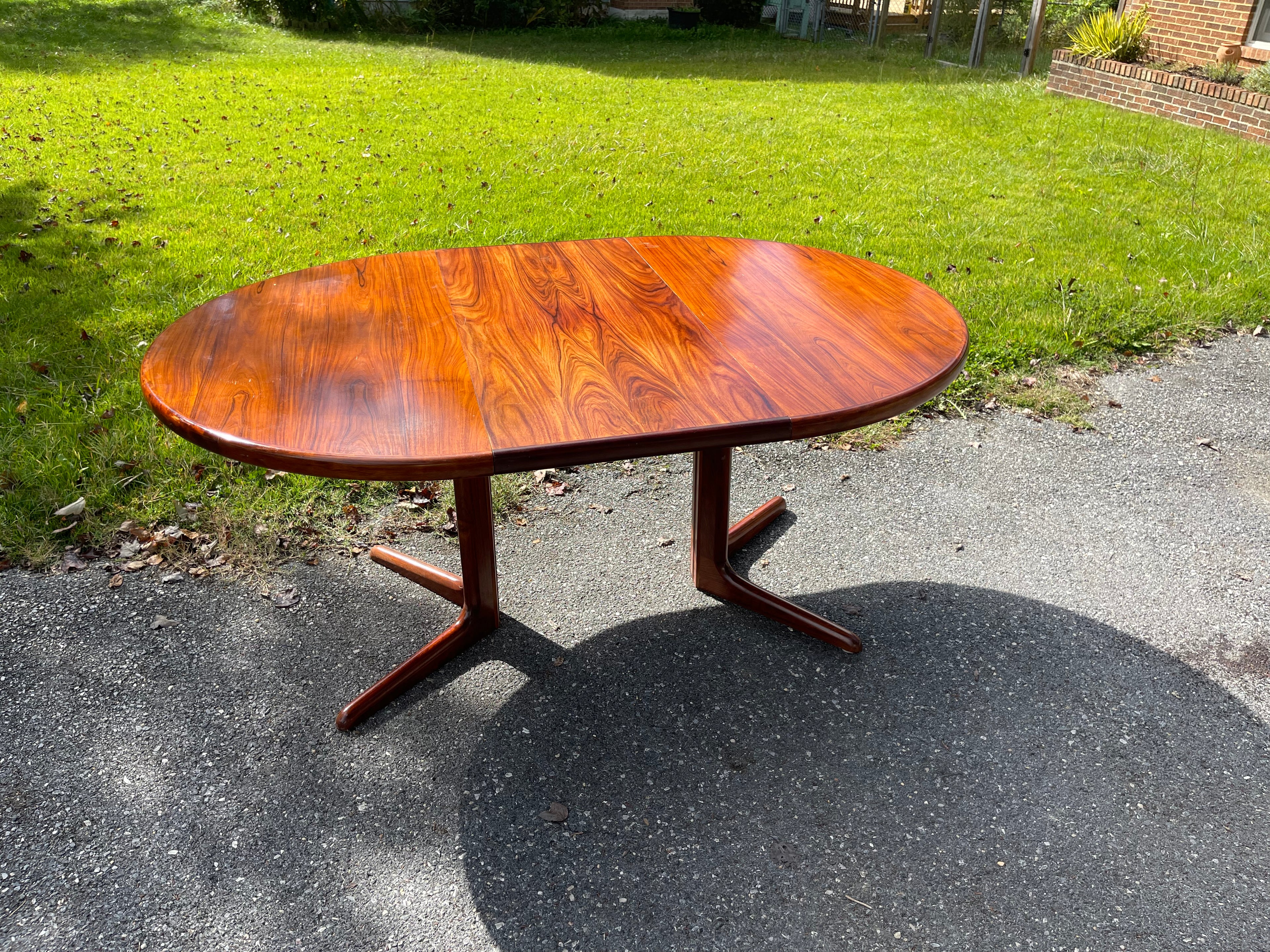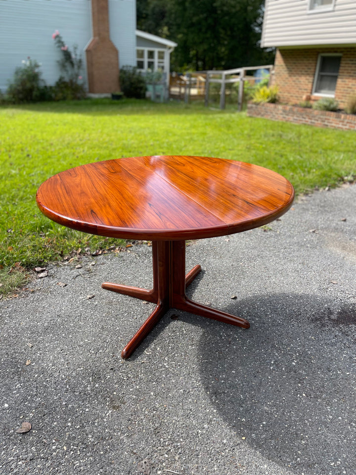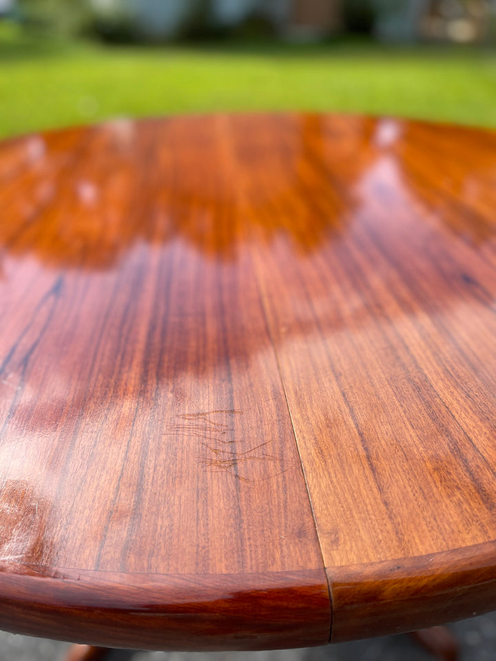 Beautiful Scandinavian Modern rosewood dining table with leaf. The rosewood selection on this piece is absolutely stunning. Sold as is with some imperfections to the top (pictured). Can be ordered fully refinished for an additional $1000.