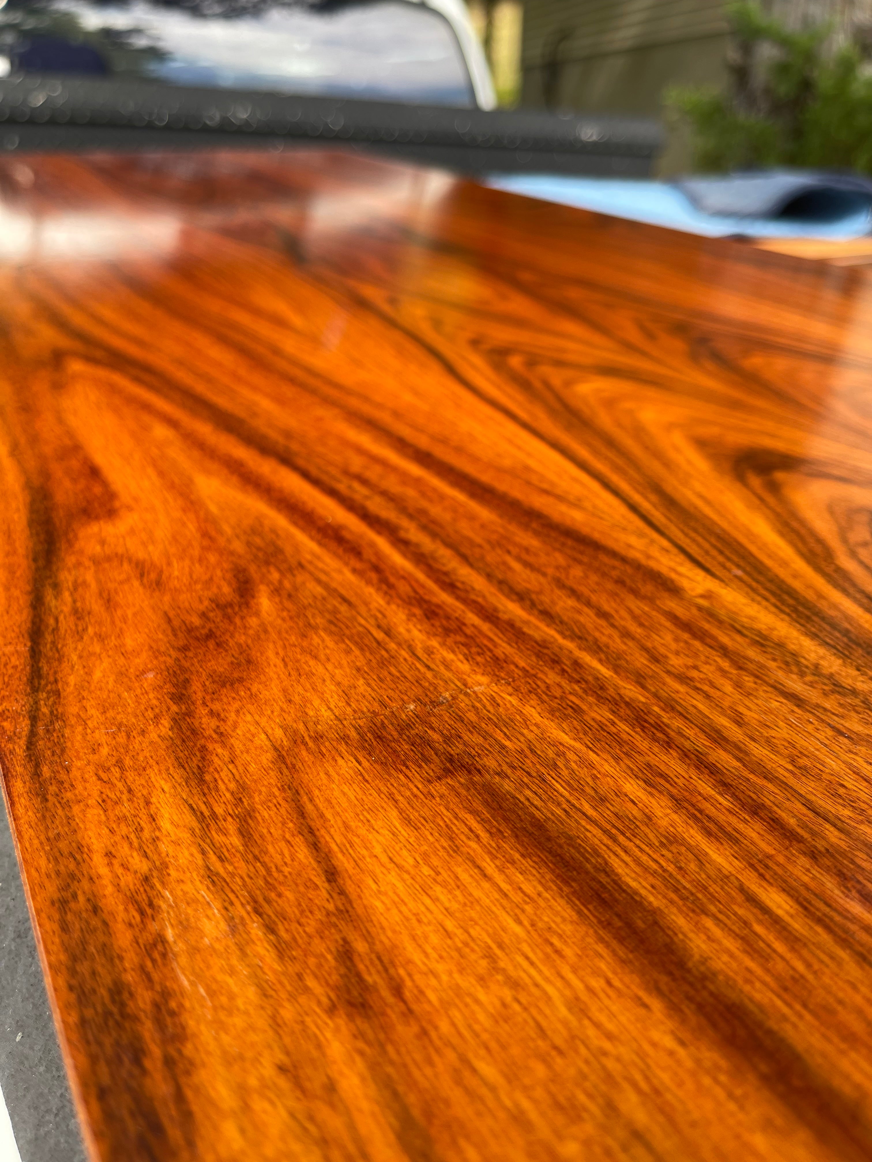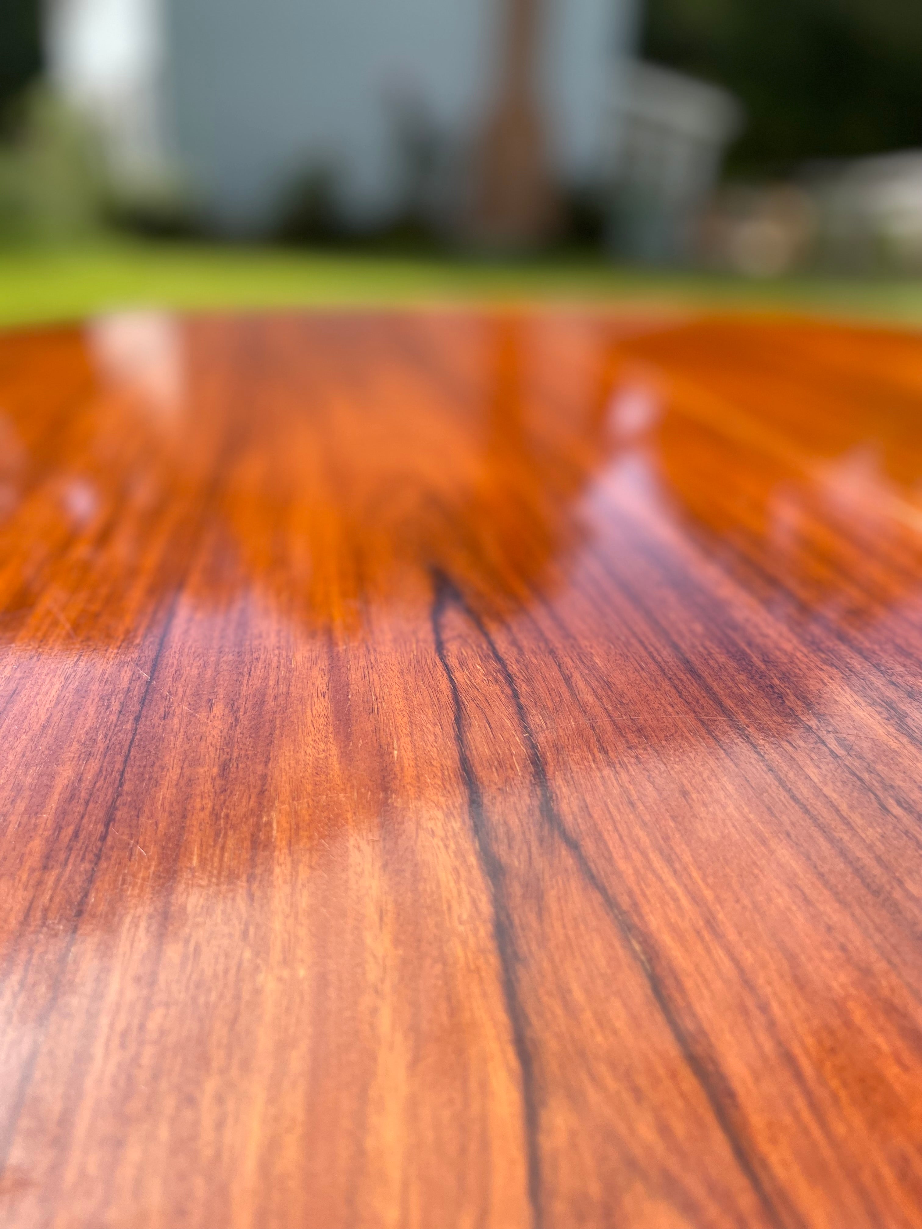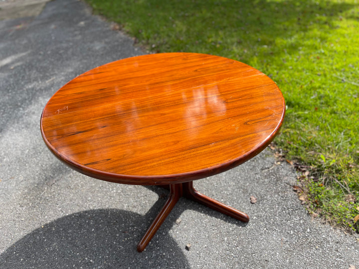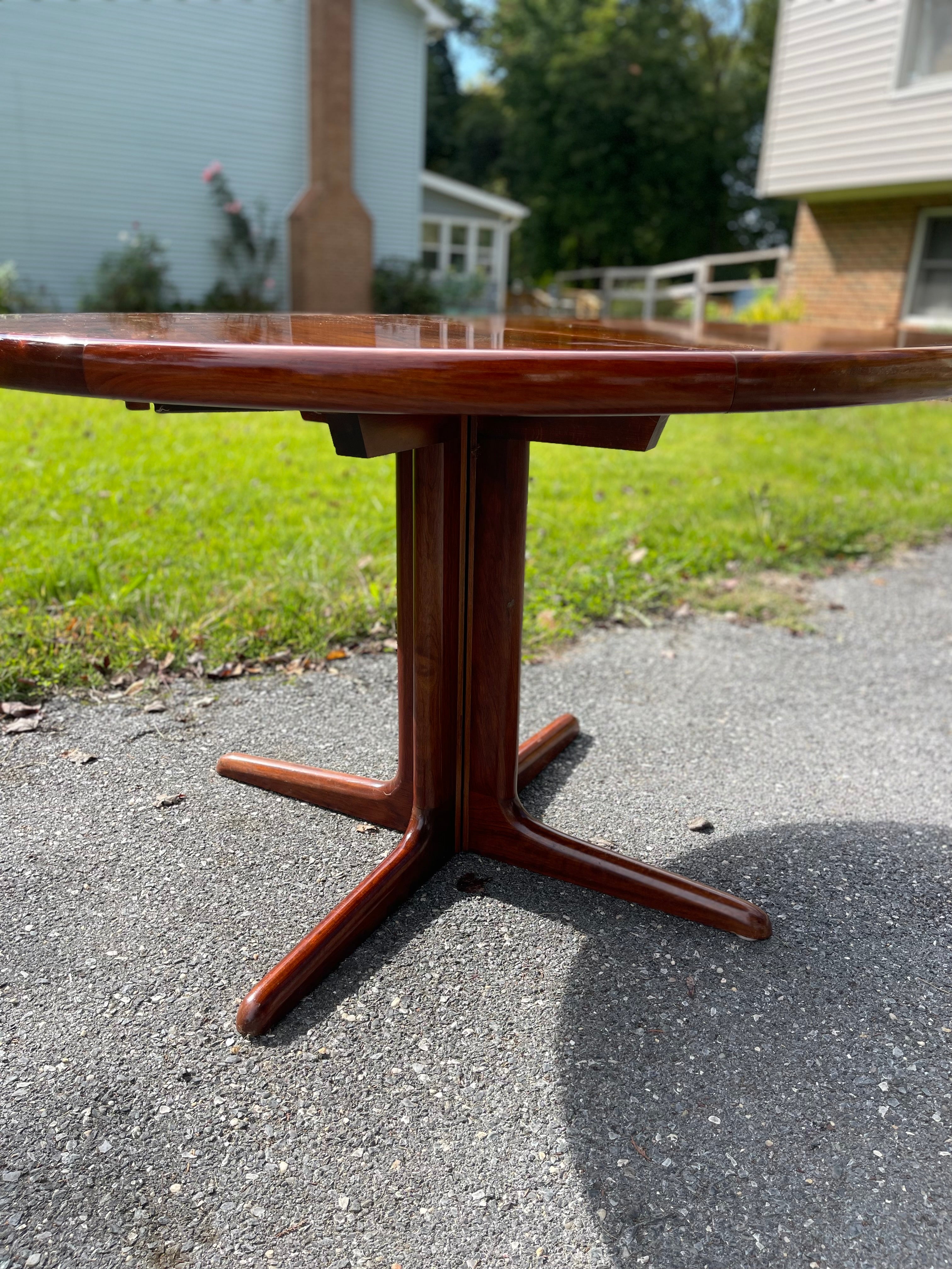 Beautiful Scandinavian Modern rosewood dining table with leaf. The rosewood selection on this piece is absolutely stunning. Sold as is with some imperfections to the top (pictured). Can be ordered fully refinished for an additional $1000.