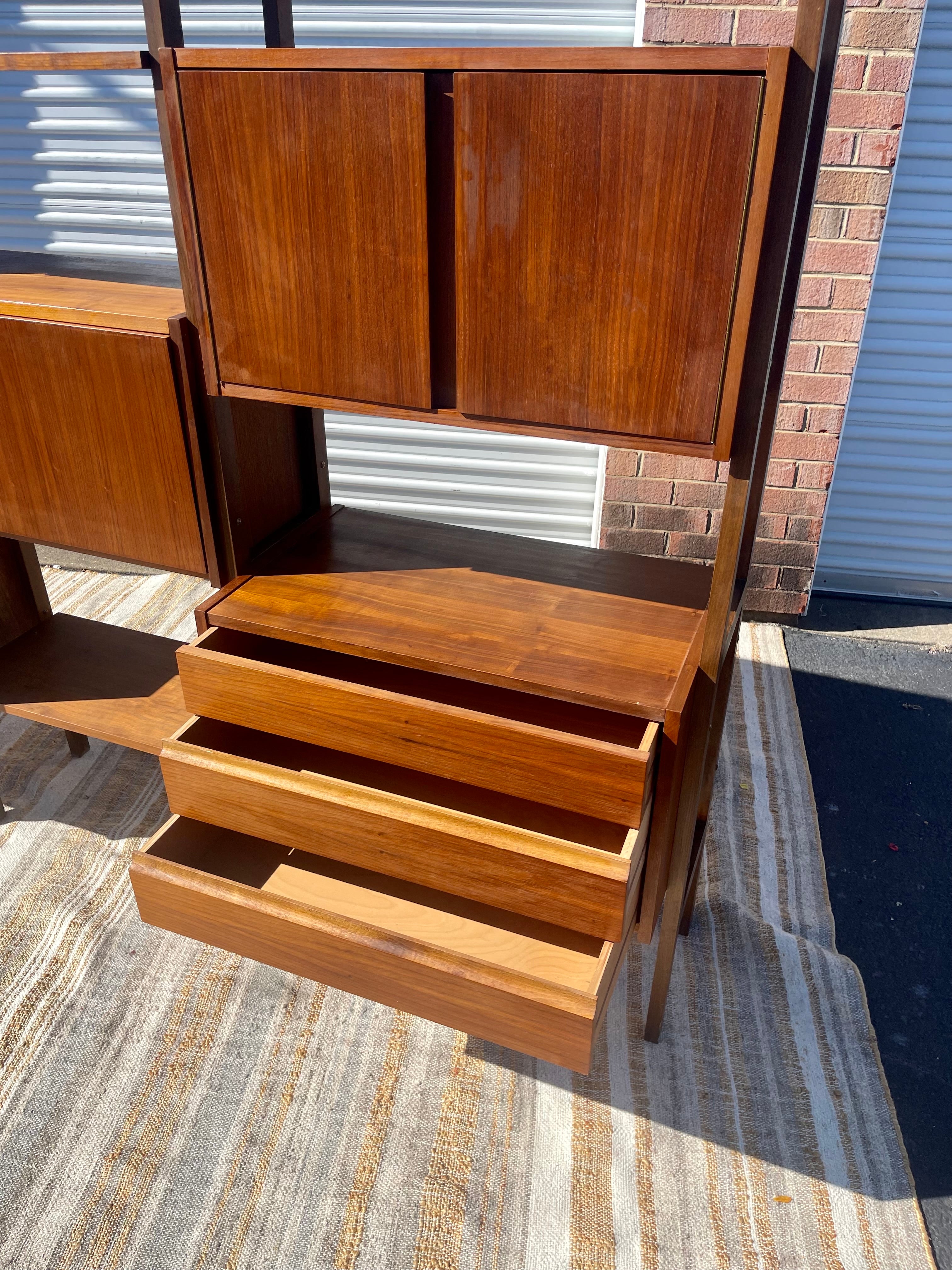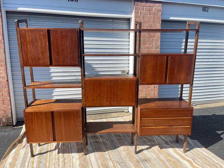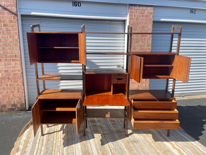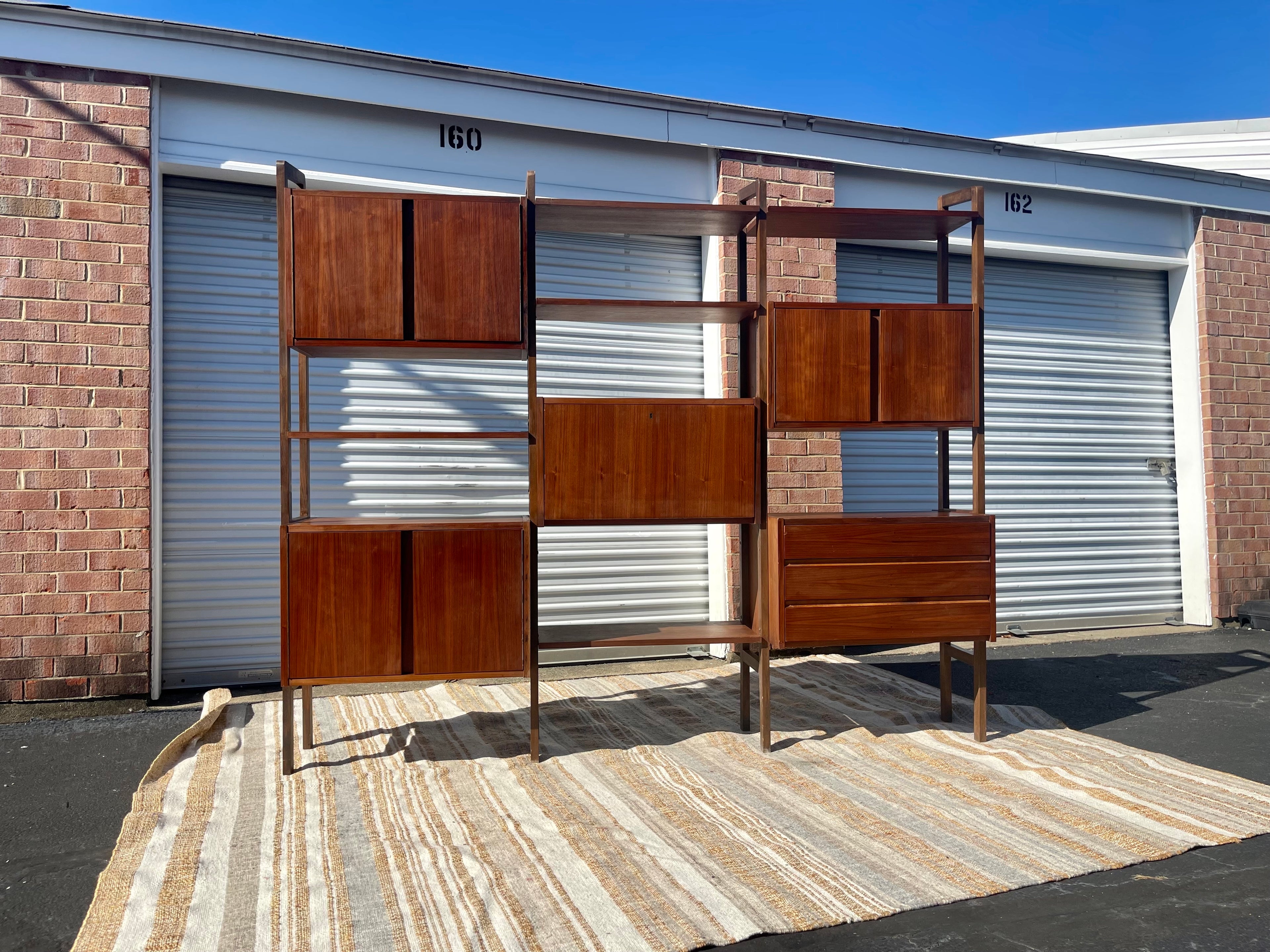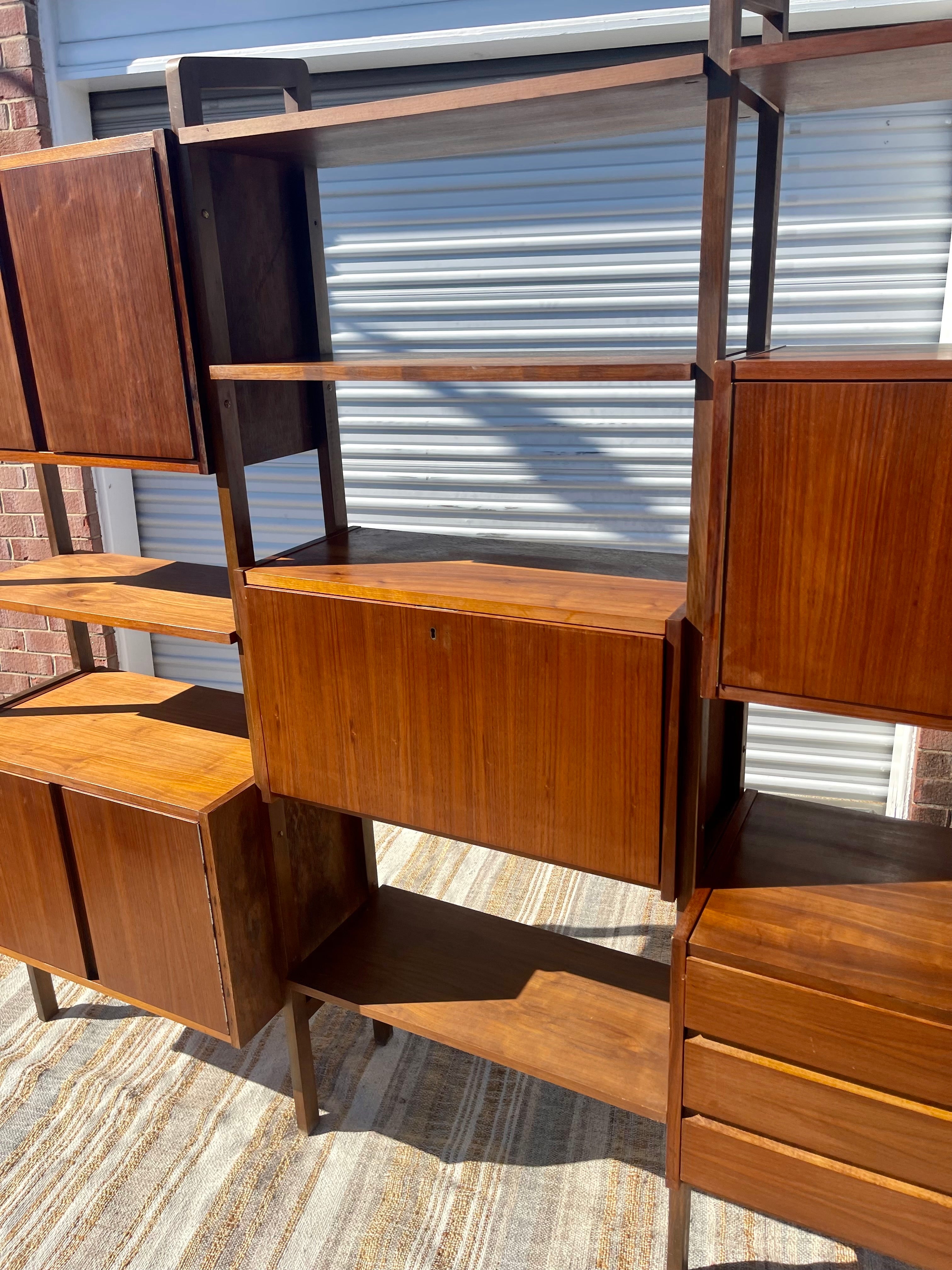 Scandinavian Modern-Style teak freestanding wall unit. This unit features 5 cases and average additional shelves. The lower right case has three spacious drawers. The center case folds down to reveal a Secretary desk. The additional three cases function as cabinets for storage with interior shelves. These rare freestanding units are difficult to source and add an incredible amount of function and style to your home. Stamped made in Yugoslavia.