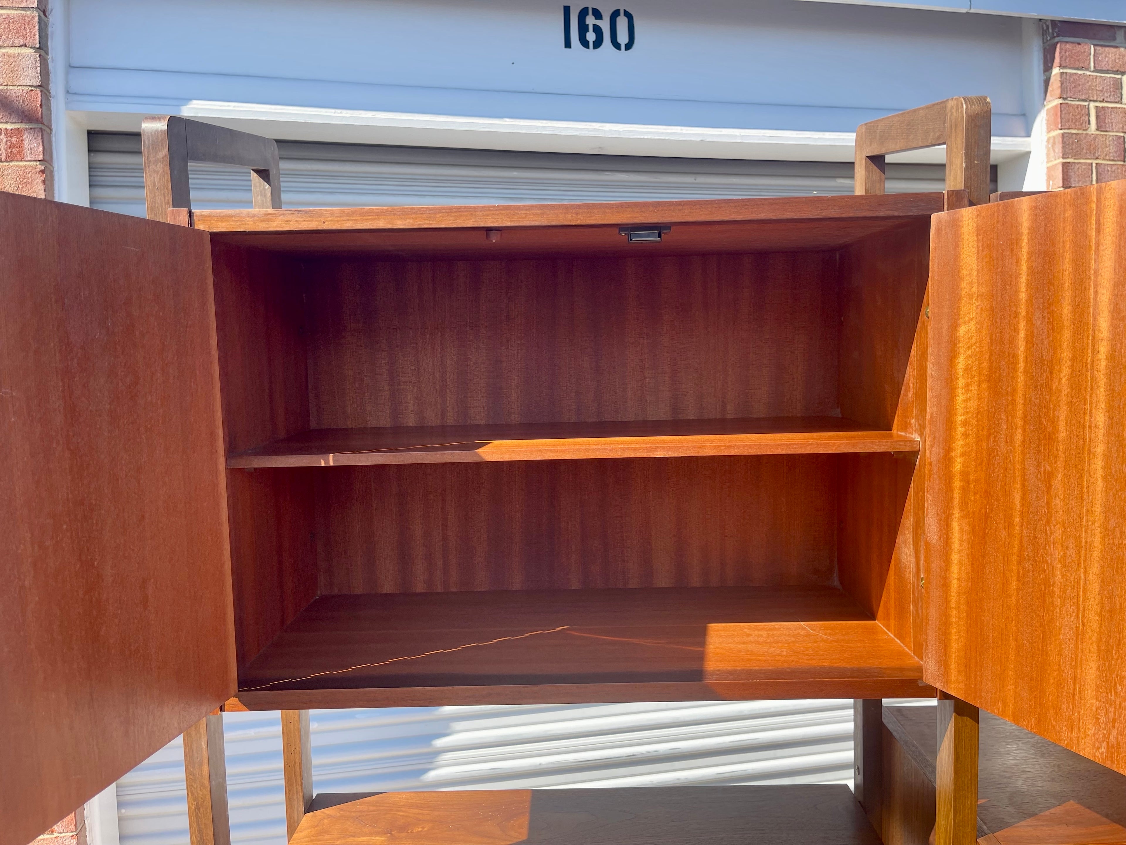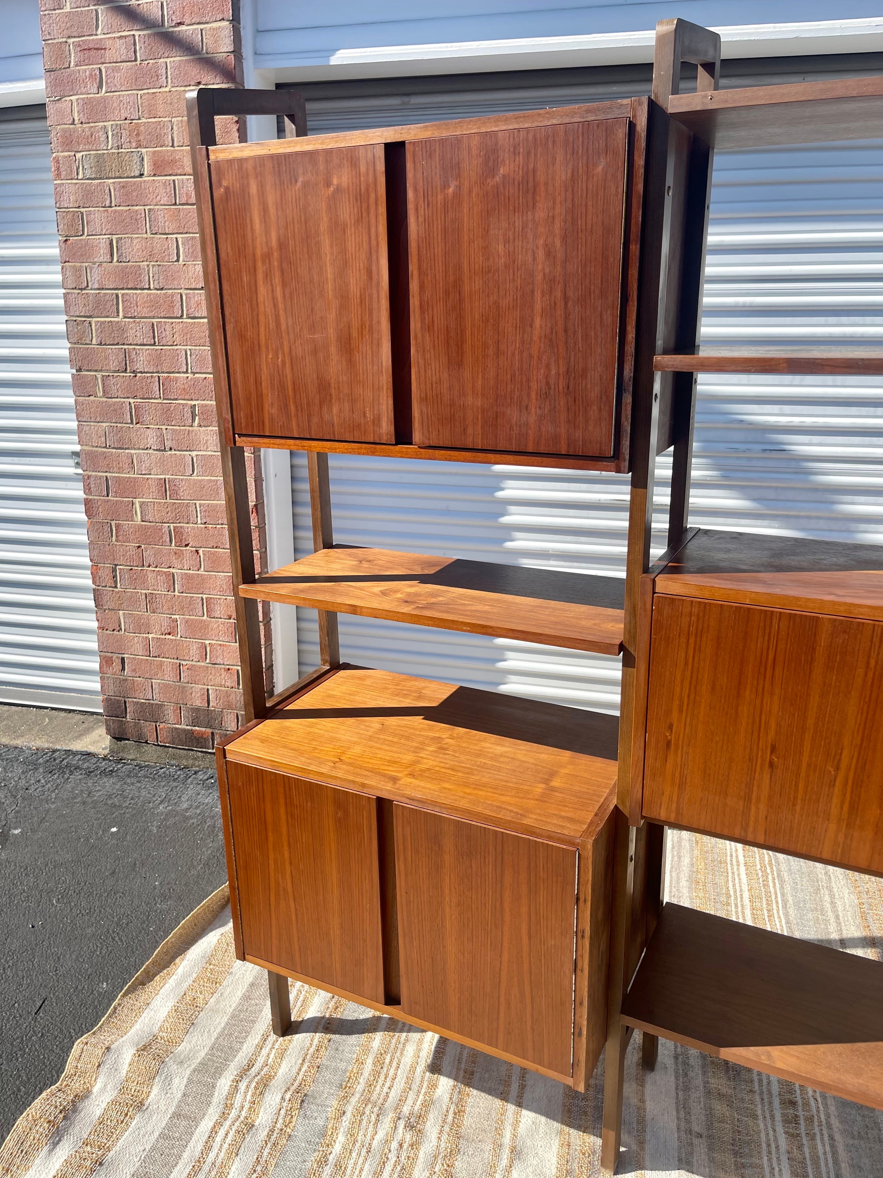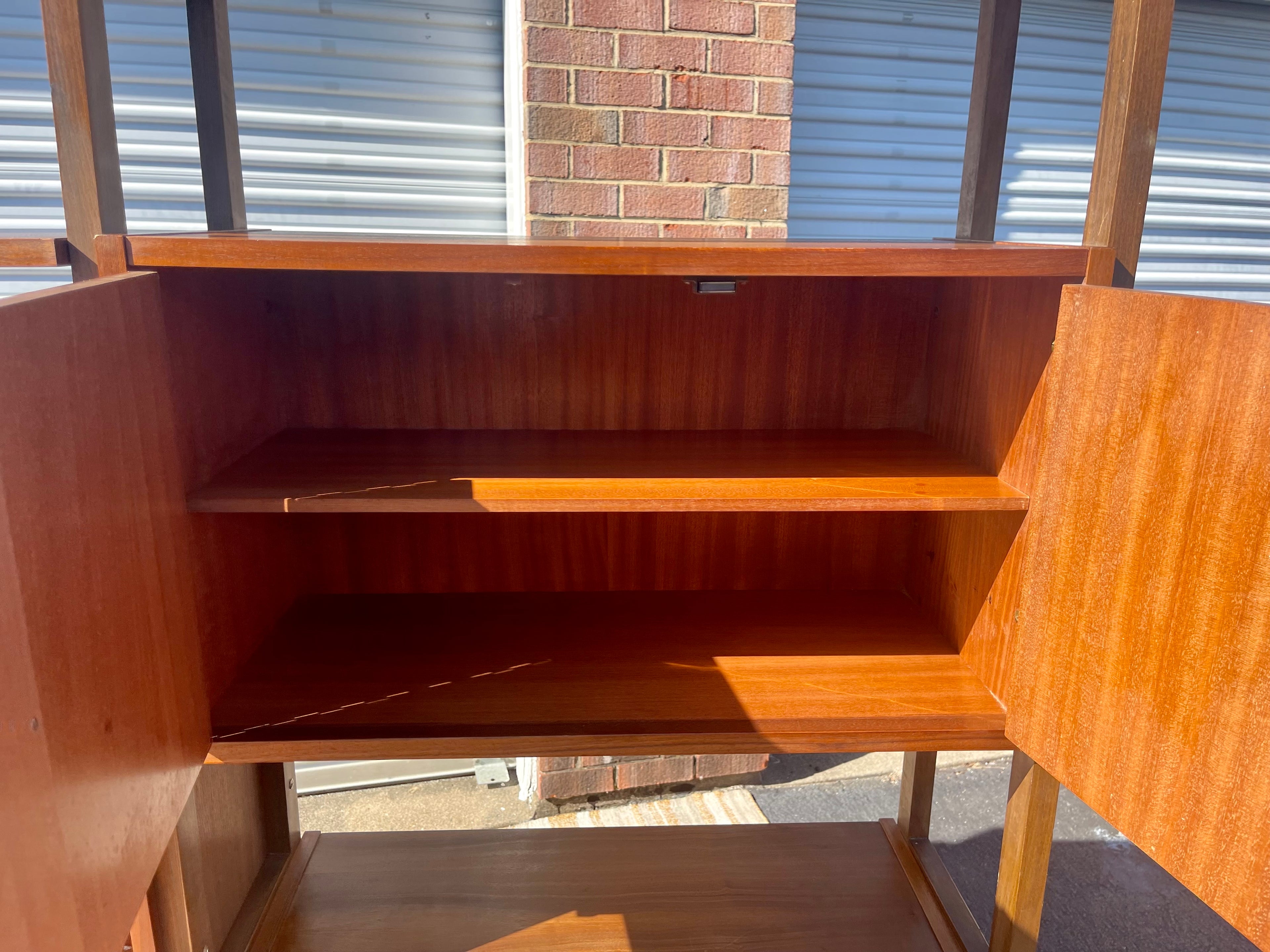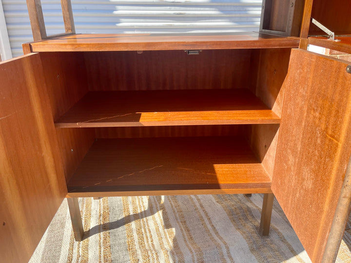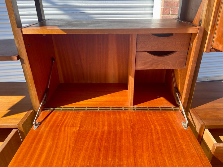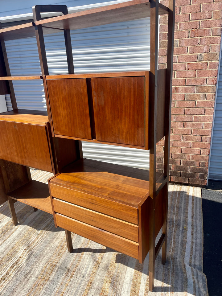 Scandinavian Modern-Style teak freestanding wall unit. This unit features 5 cases and average additional shelves. The lower right case has three spacious drawers. The center case folds down to reveal a Secretary desk. The additional three cases function as cabinets for storage with interior shelves. These rare freestanding units are difficult to source and add an incredible amount of function and style to your home. Stamped made in Yugoslavia.