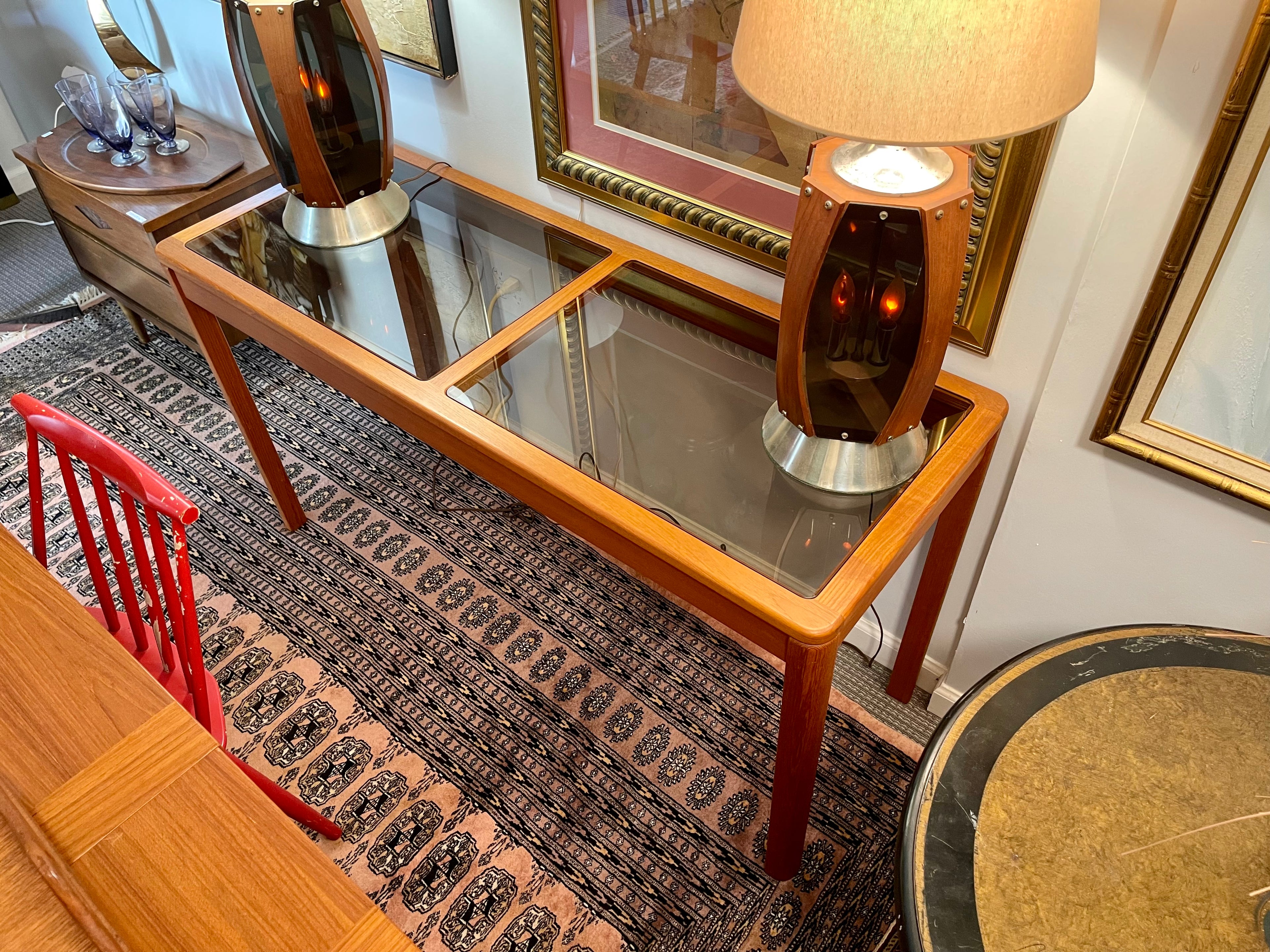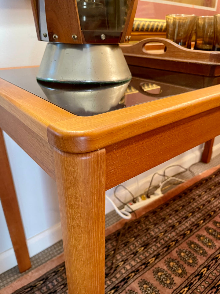 Stylish Scandinavian modern console table in warm teak with smoke glass inserts. Rounded and tapered edges and legs make this a understated but elegant addition for any space.