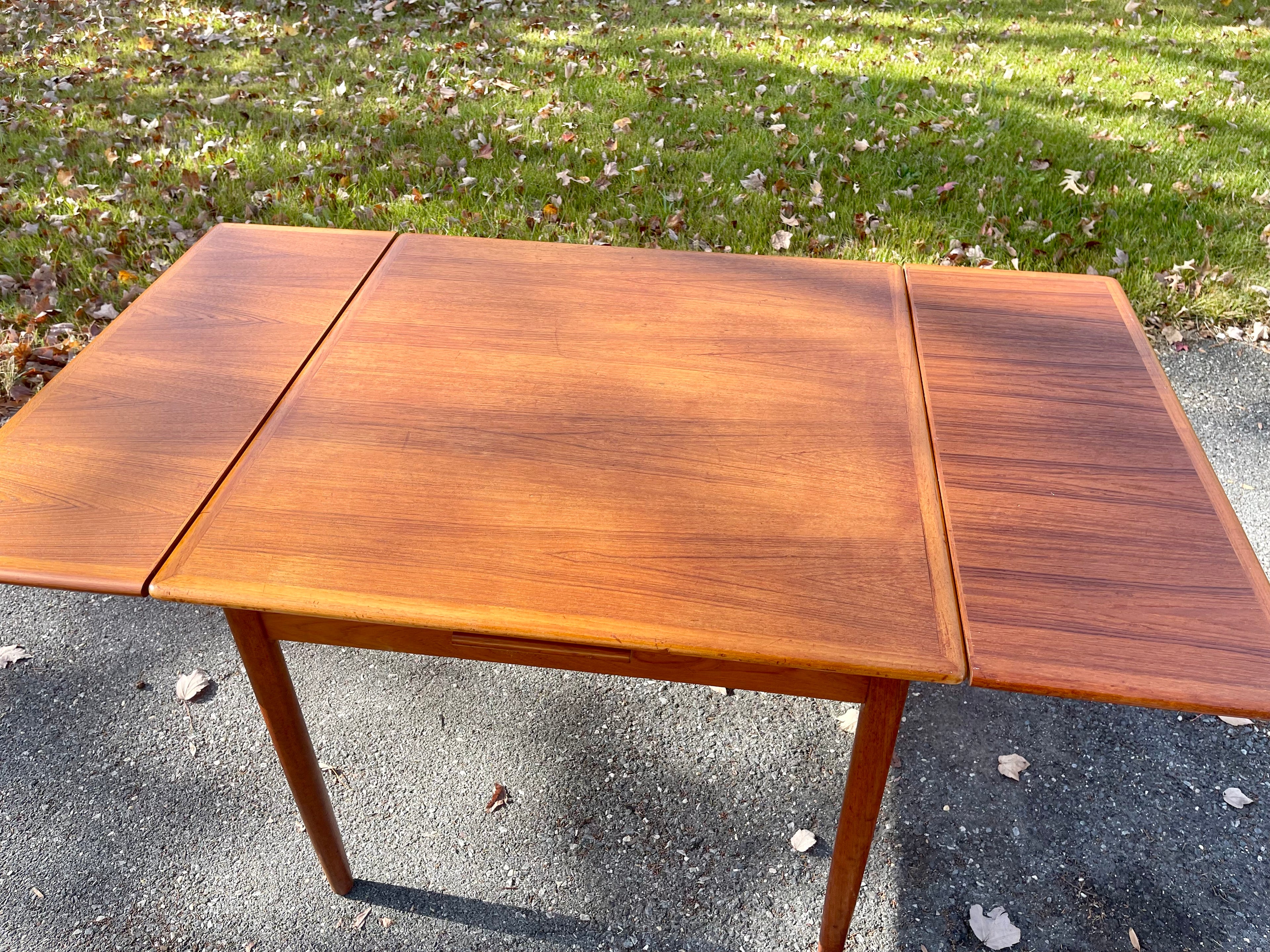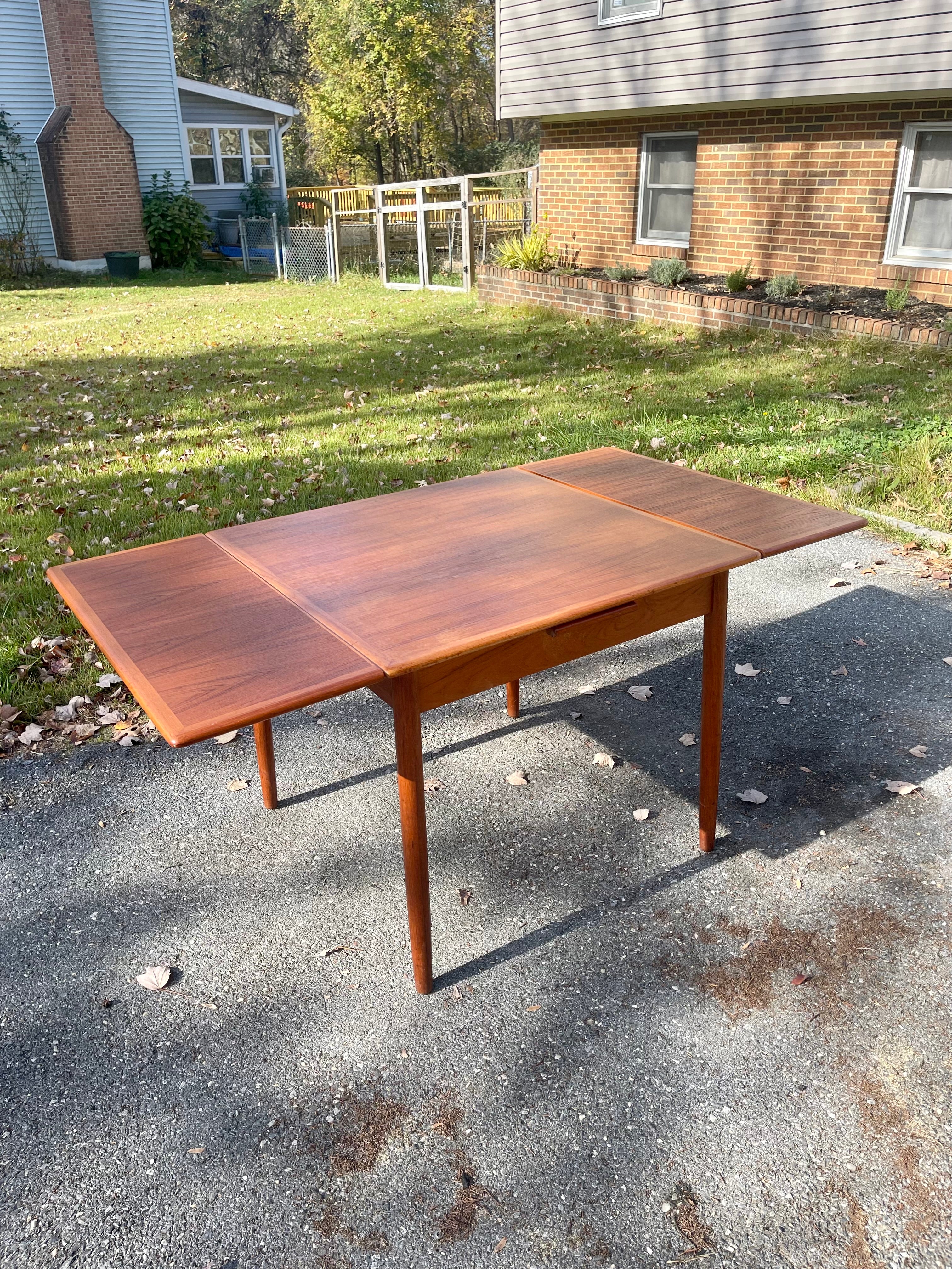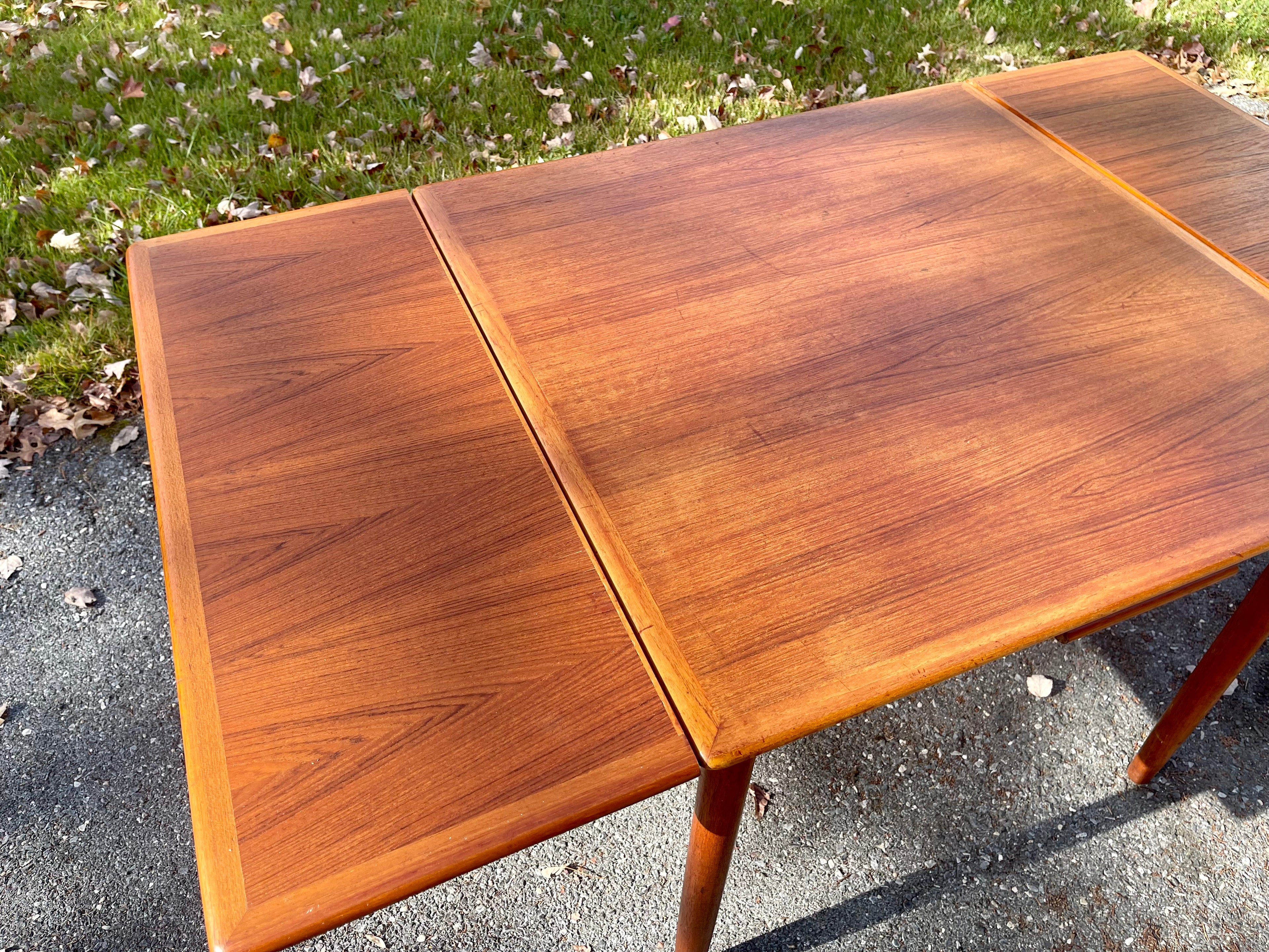 Lovely petite teak dining table refinished by our team. Perfect size for apartment living; the two leaves tuck under the table and extend to 60 inches long total. Solid teak legs and frame; stamped made in Denmark.