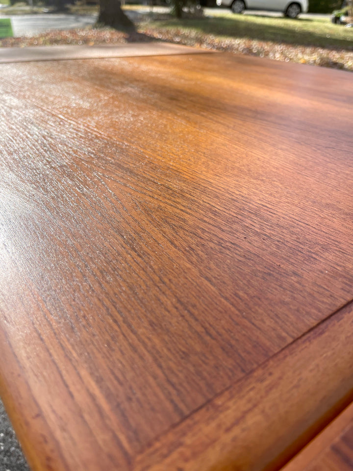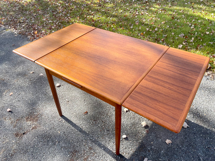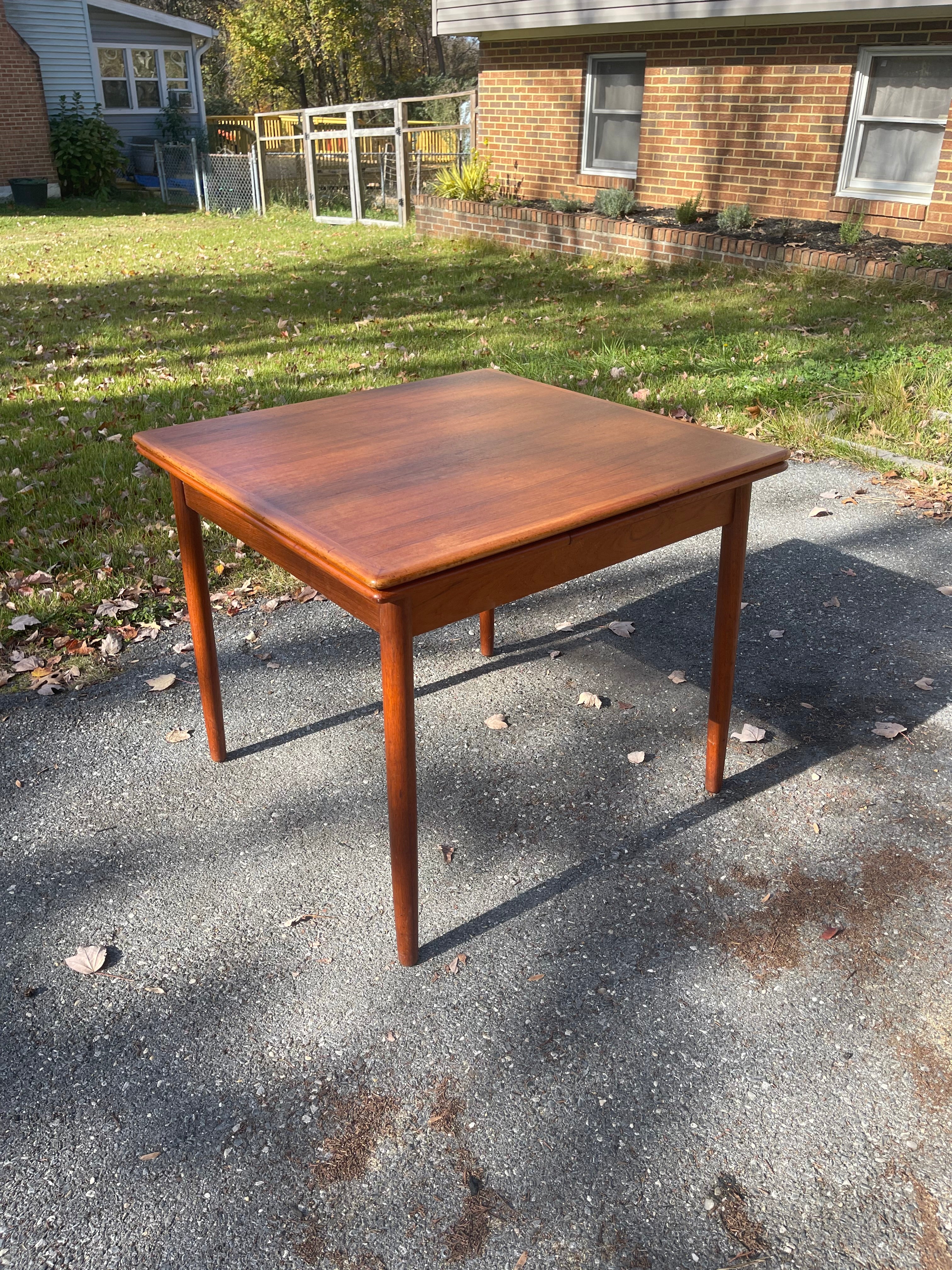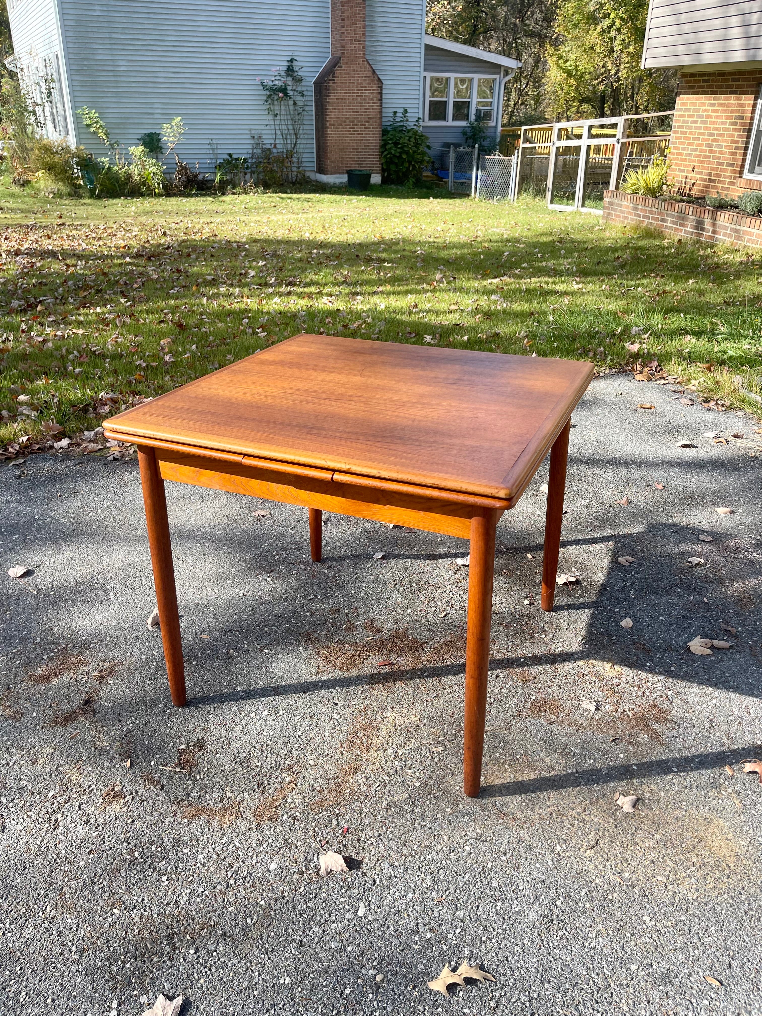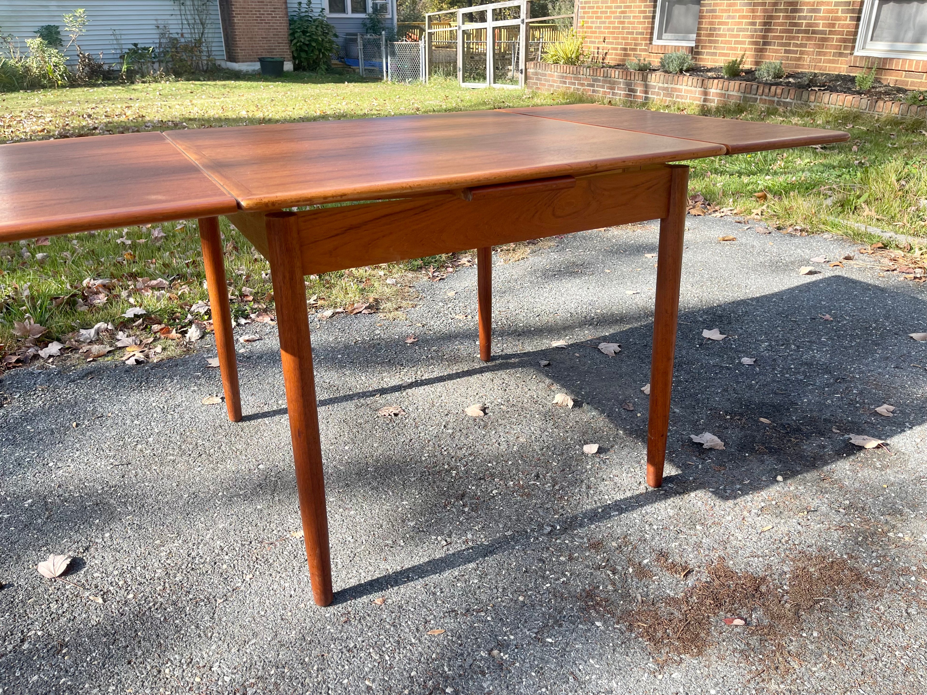 Lovely petite teak dining table refinished by our team. Perfect size for apartment living; the two leaves tuck under the table and extend to 60 inches long total. Solid teak legs and frame; stamped made in Denmark.