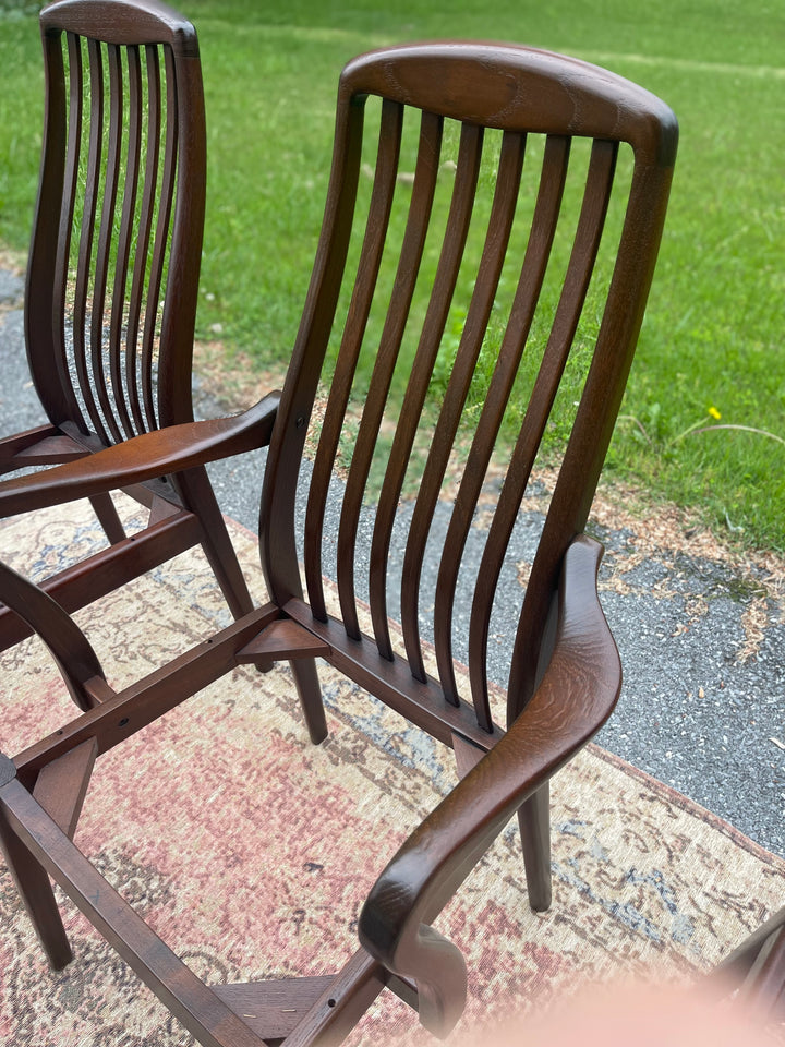 Custom cushions available, pick your own upholstery! Solid Rosewood dining chairs, set of 6. Refurbished in perfect condition. End chairs with arms measure 23 in wide.