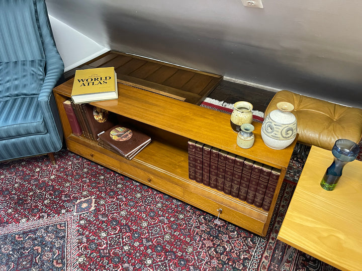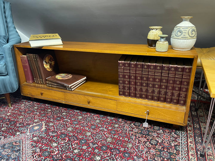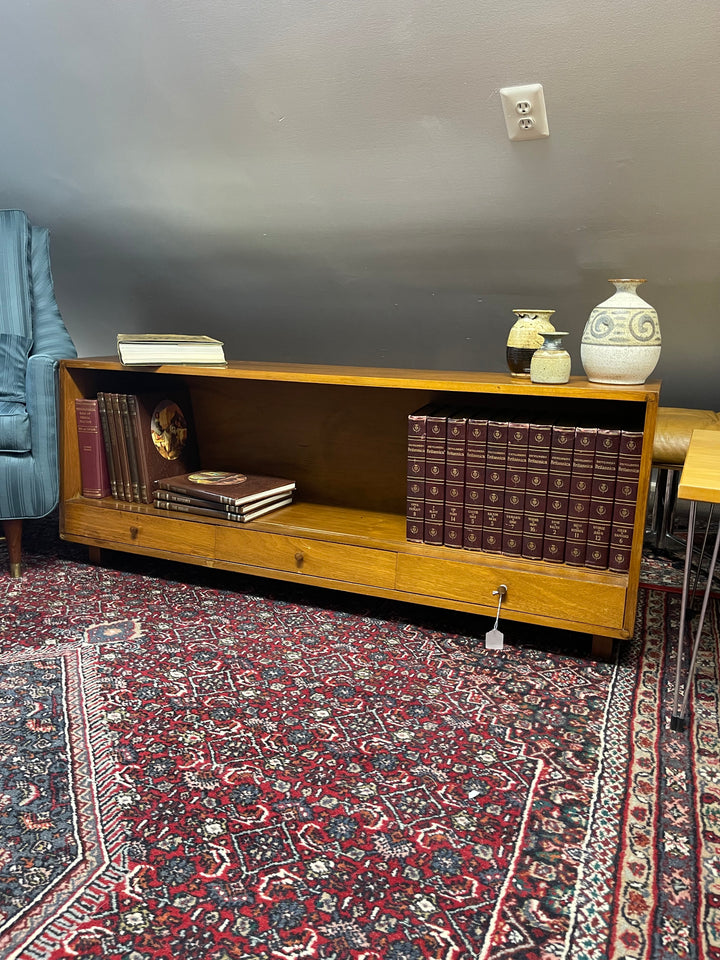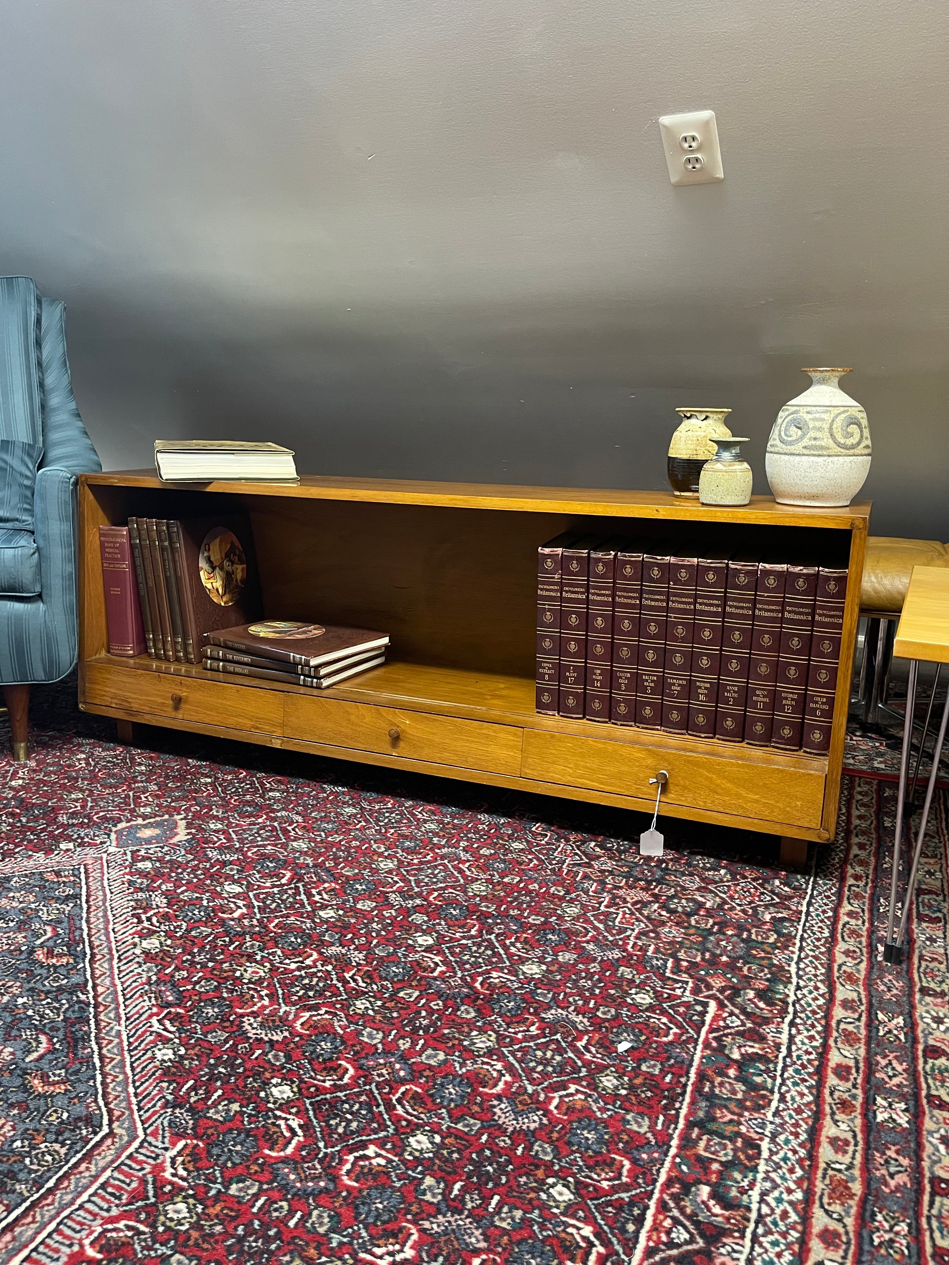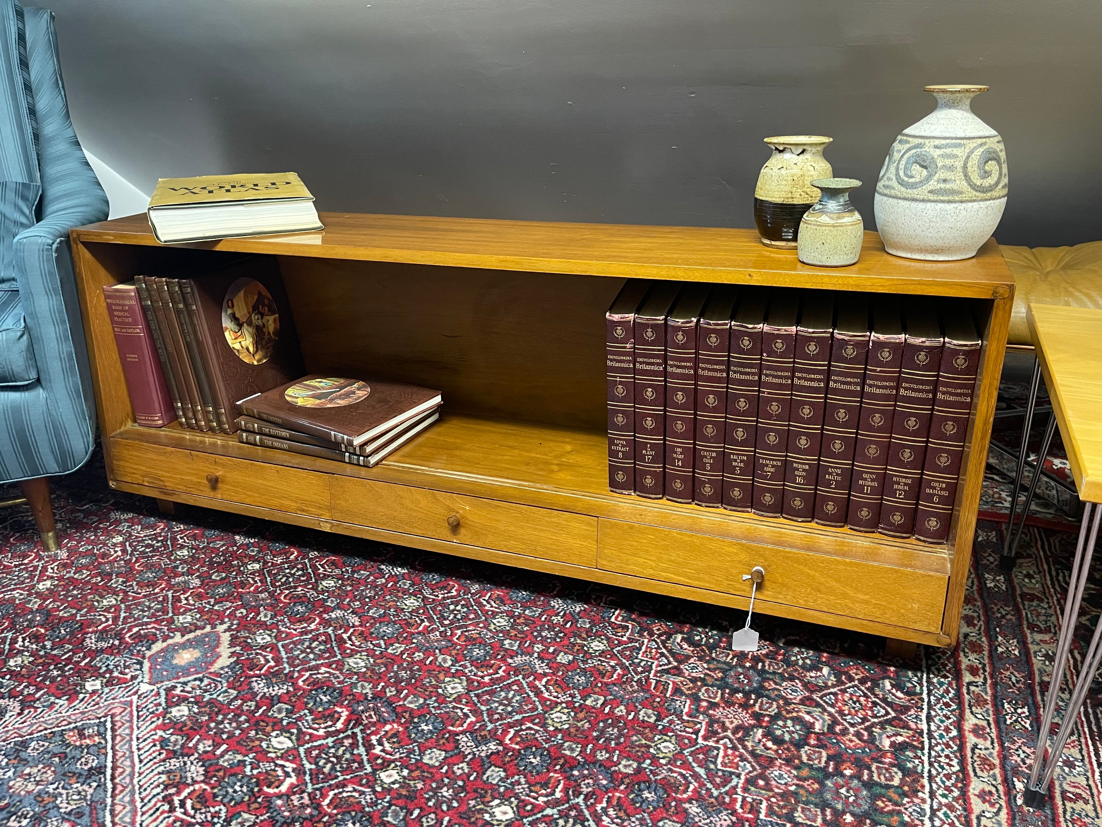 This piece of furniture likely started out as a hutch for a credenza or desk. However, it now makes a perfectly good low bookcase or record storage piece. Three small drawers add additional storage. Perfect for under a window with plants!