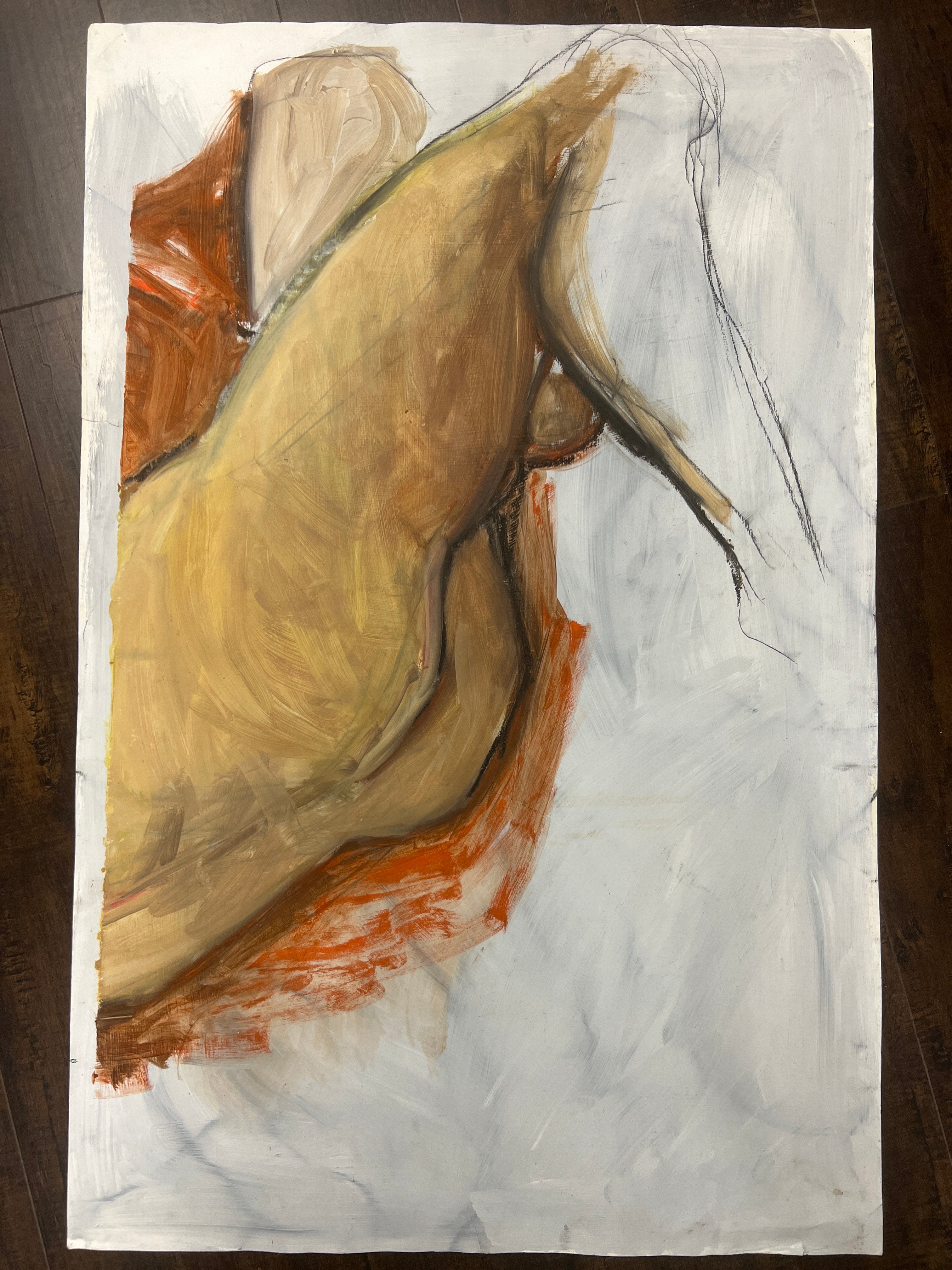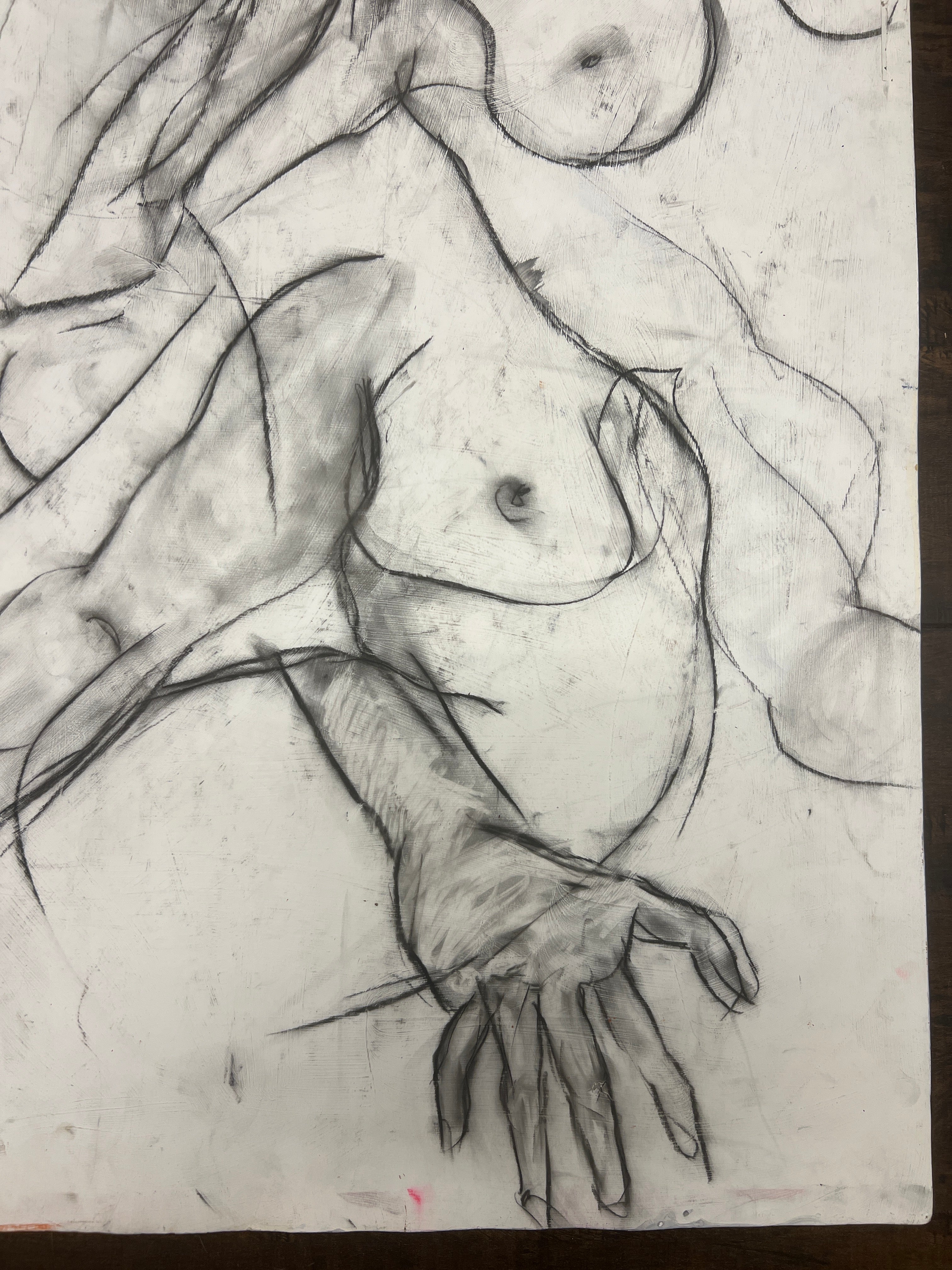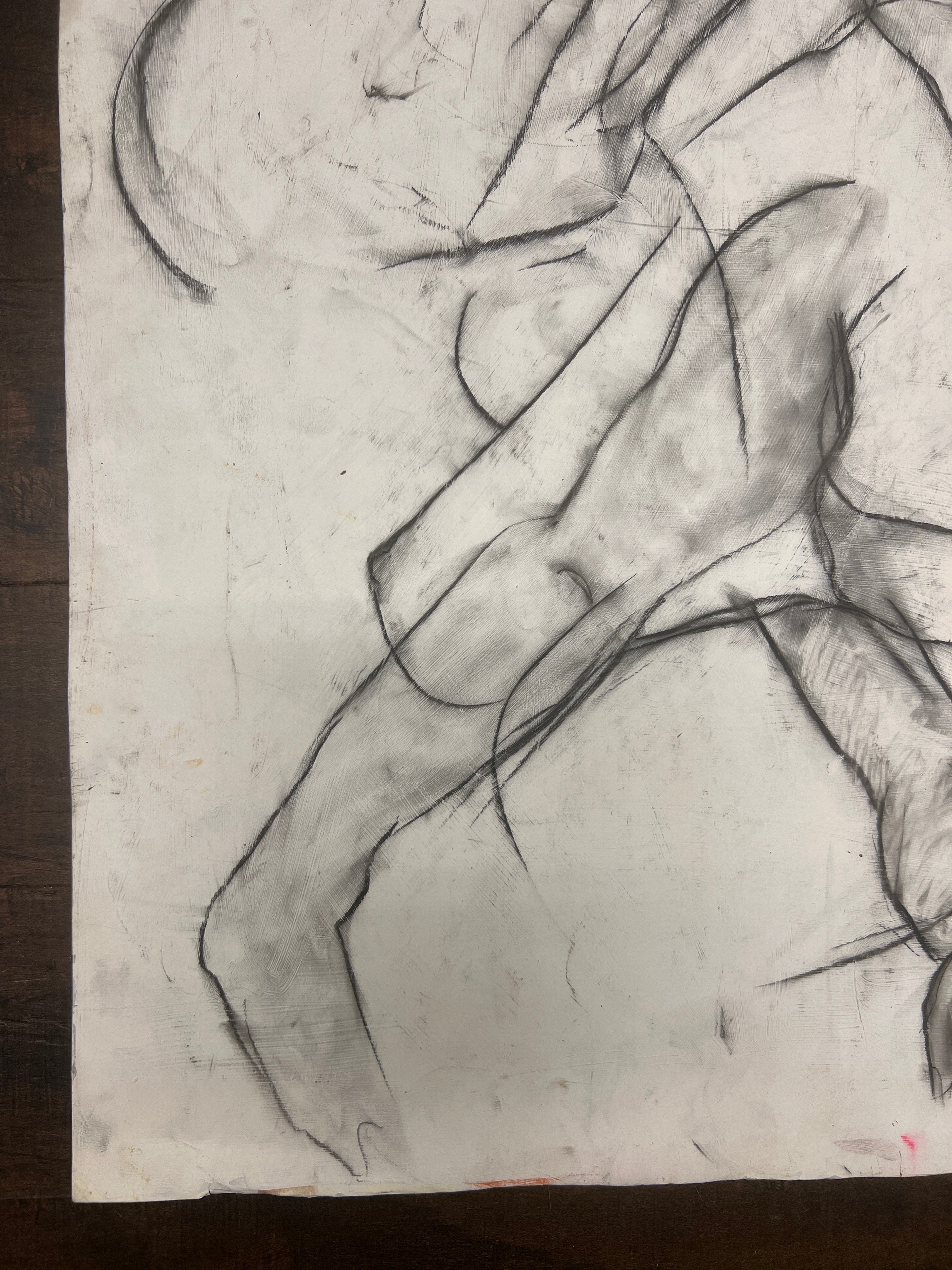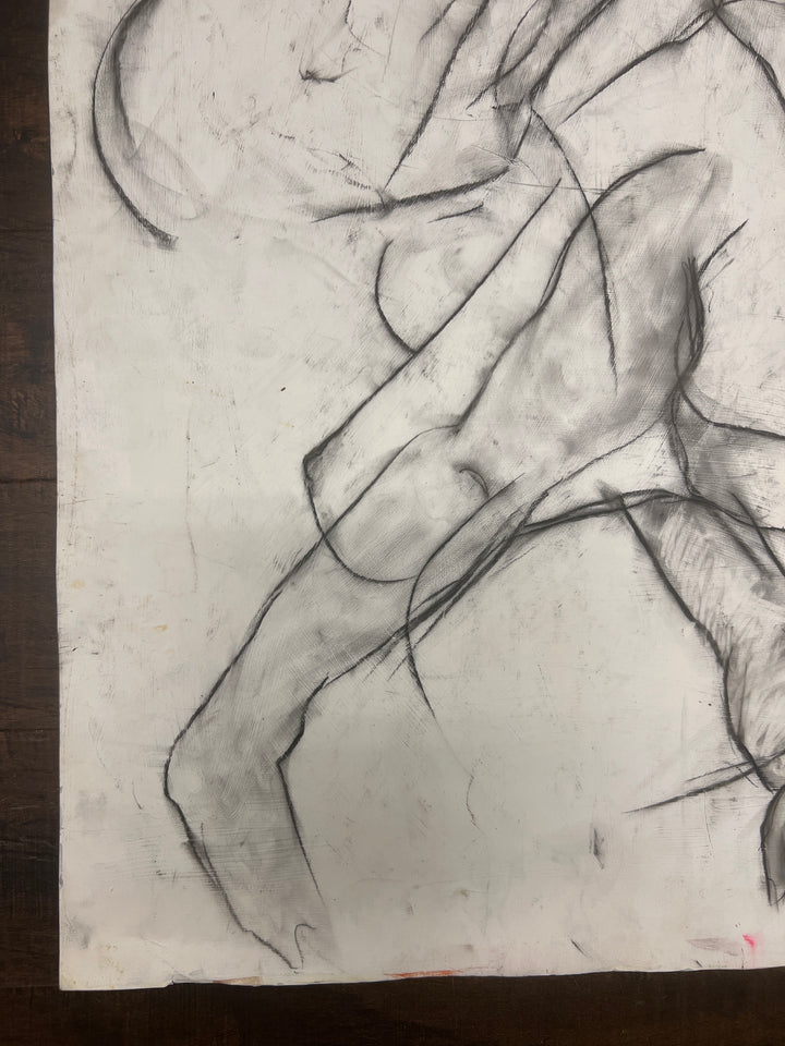 This piece is charcoal on paper, unframed. There is another painting in acrylic on the opposite side, pictured in the last photo. Shipping available.