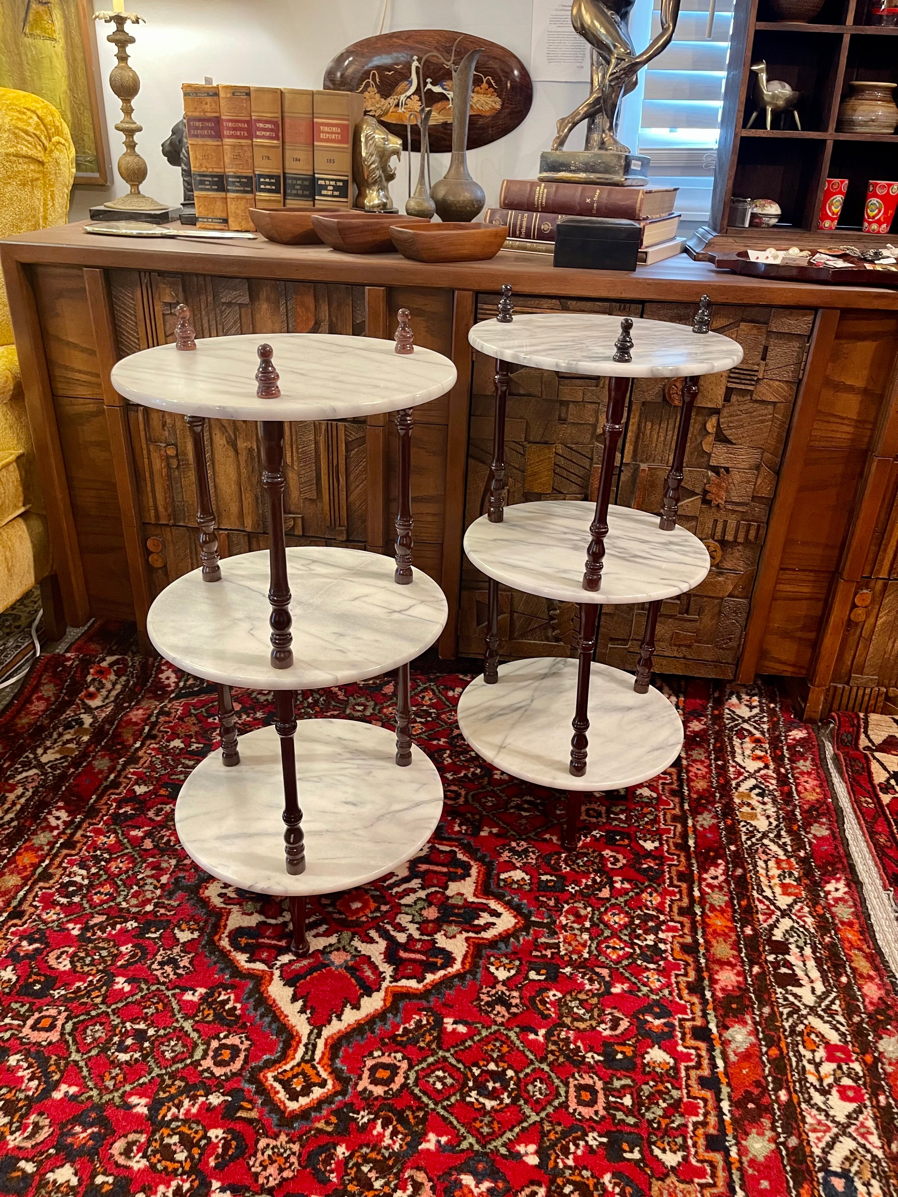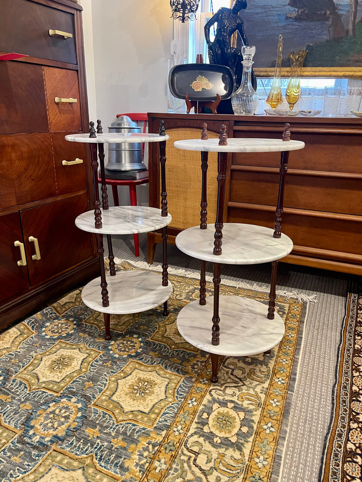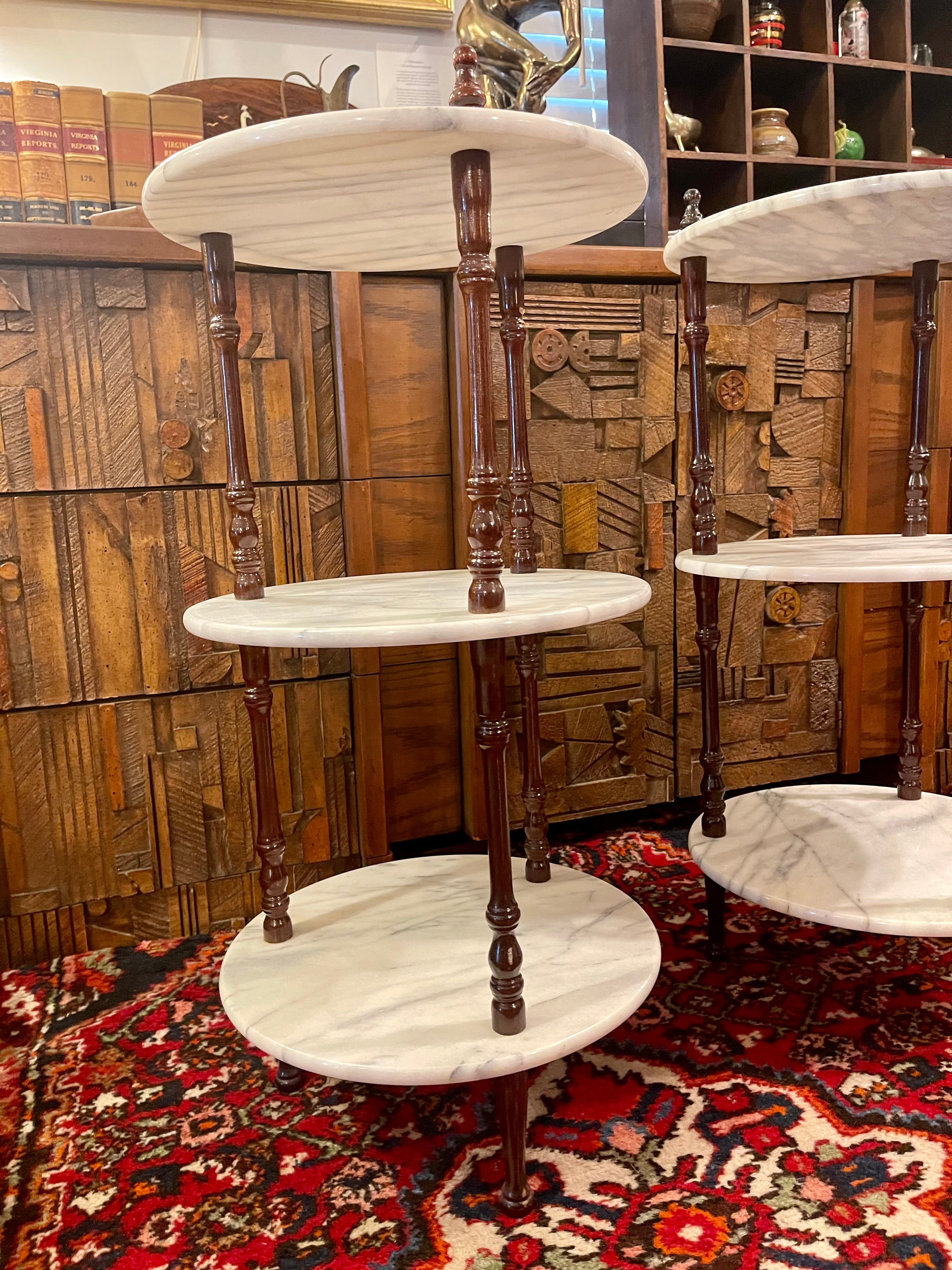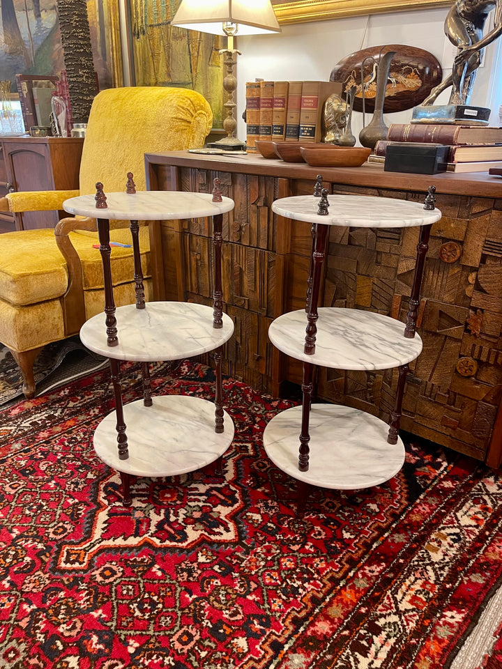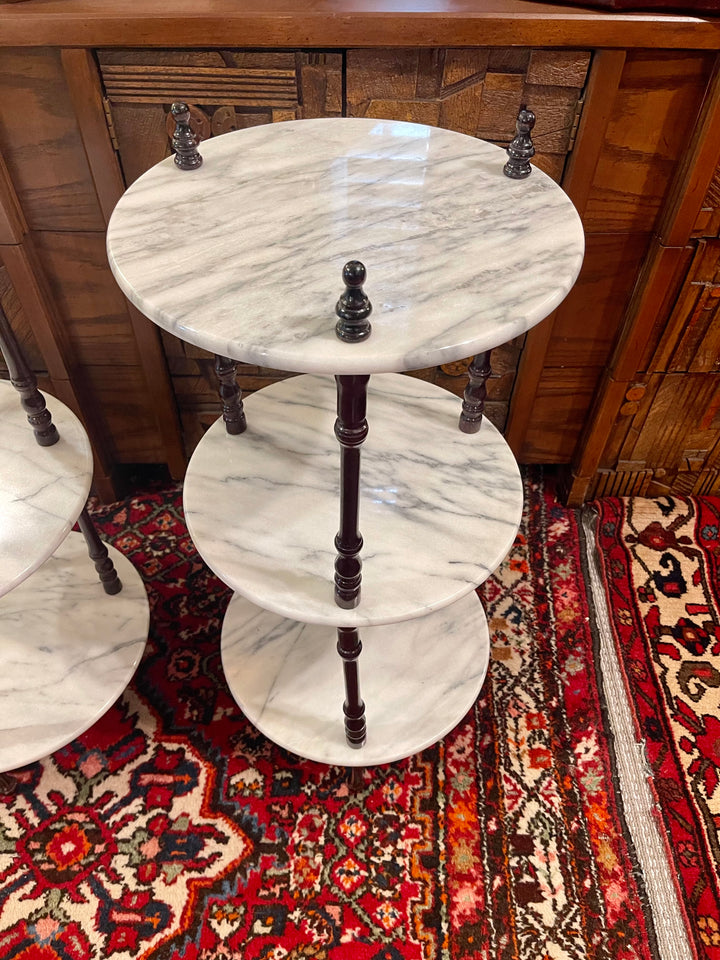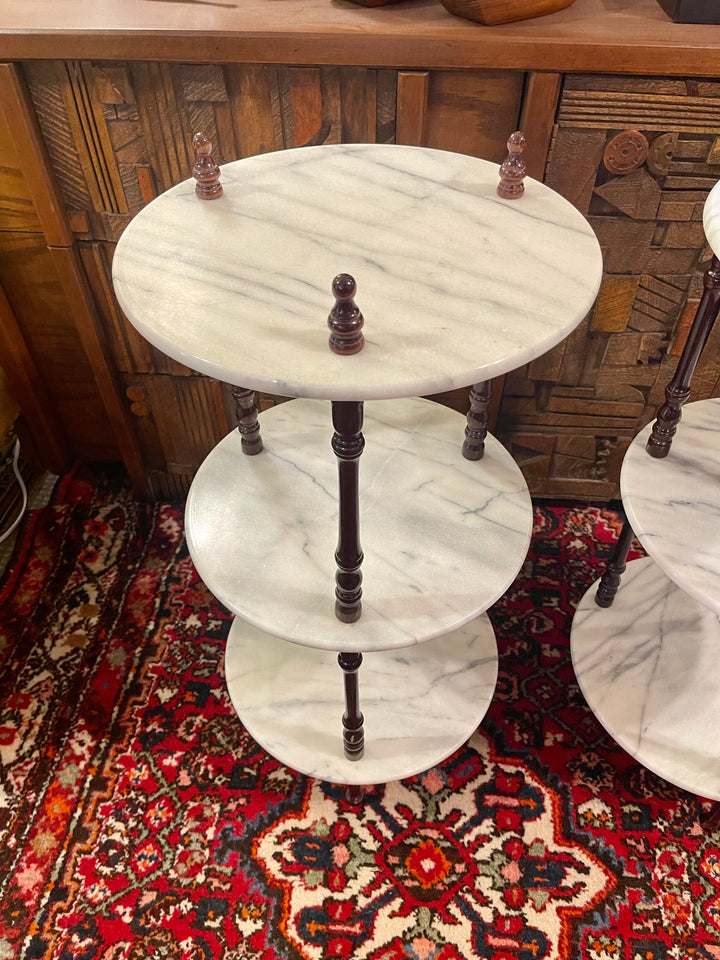 Handsome wood and marble three-tiered accent tables. Would make excellent plant stands as well. Solid construction, the marble is in great condition. Perfect accent pieces for your home! Priced individually.