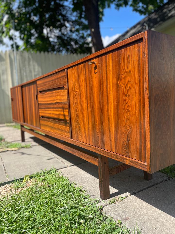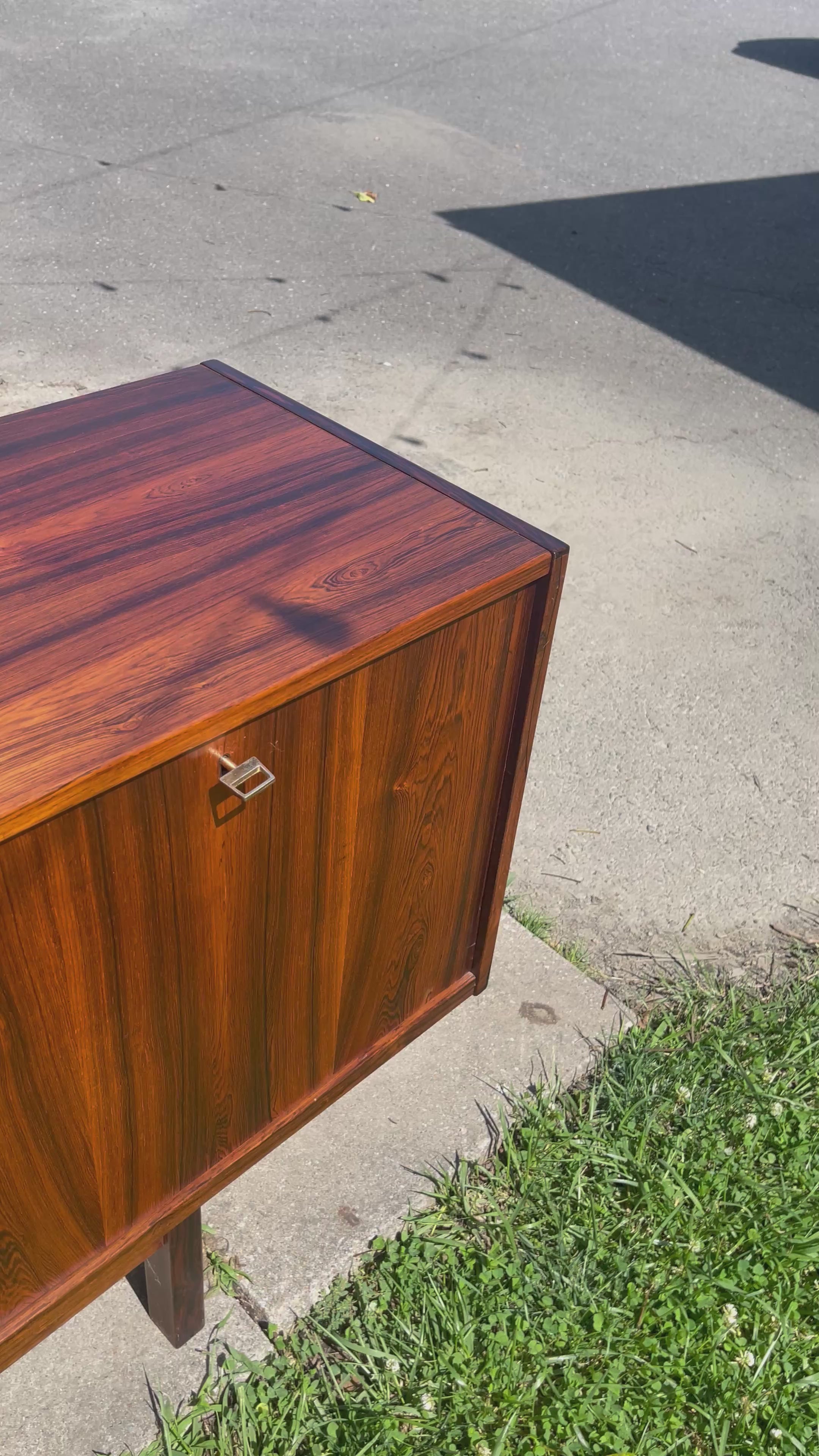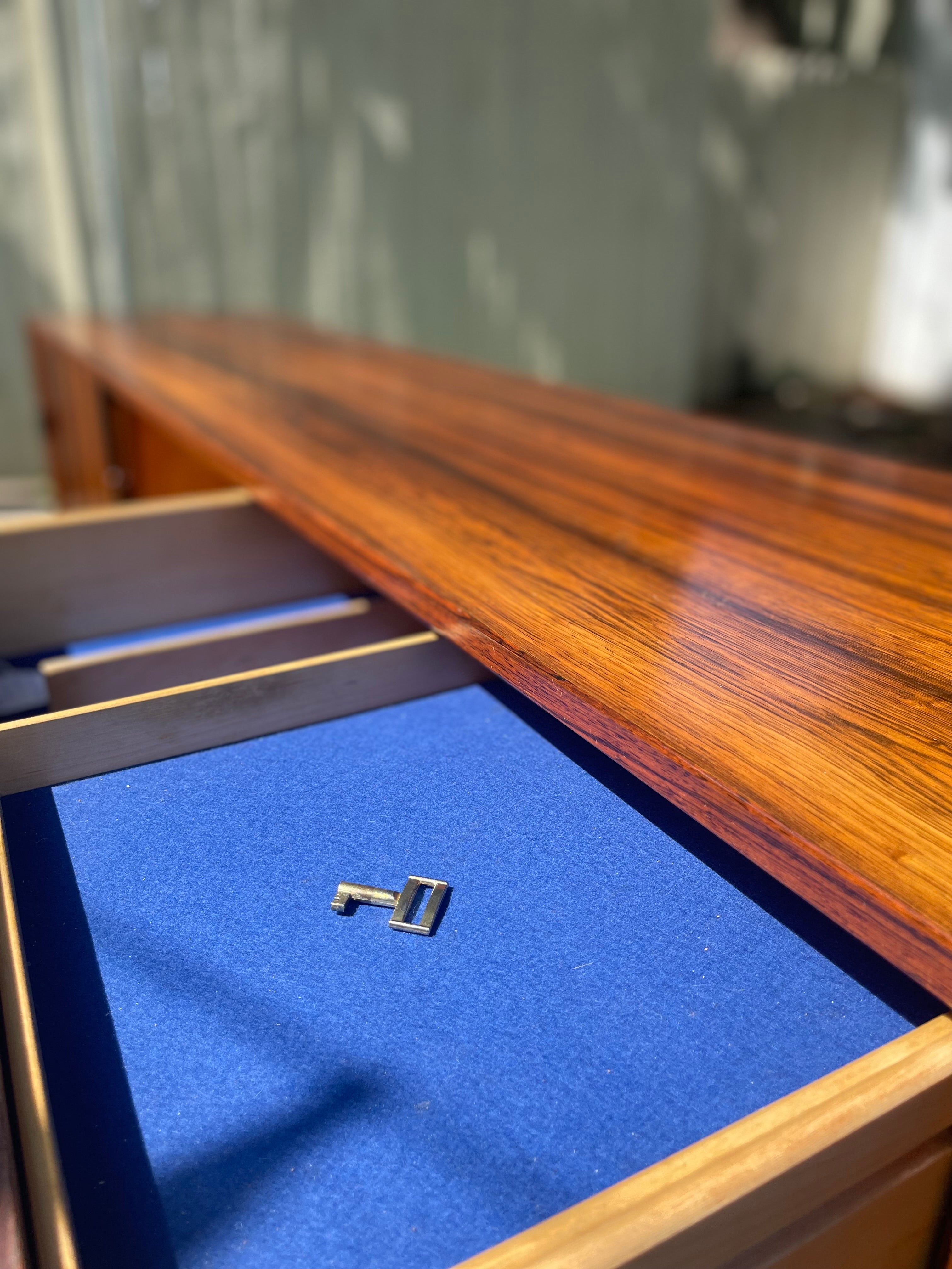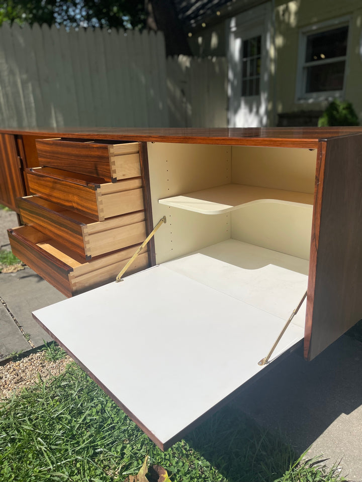 This fabulous sideboard was designed in Sweden by Nils Jonsson for Hugo Troeds. It features a stunning bookmatched rosewood grain. This XL sideboard offers generous storage with two sliding cupboard doors, both revealing a shelf inside, as well as four drawers and a fold down bar cabinet opened by a key. The top drawer contains dividers for cutlery and felt lining. Superior design and style in a very rare size.