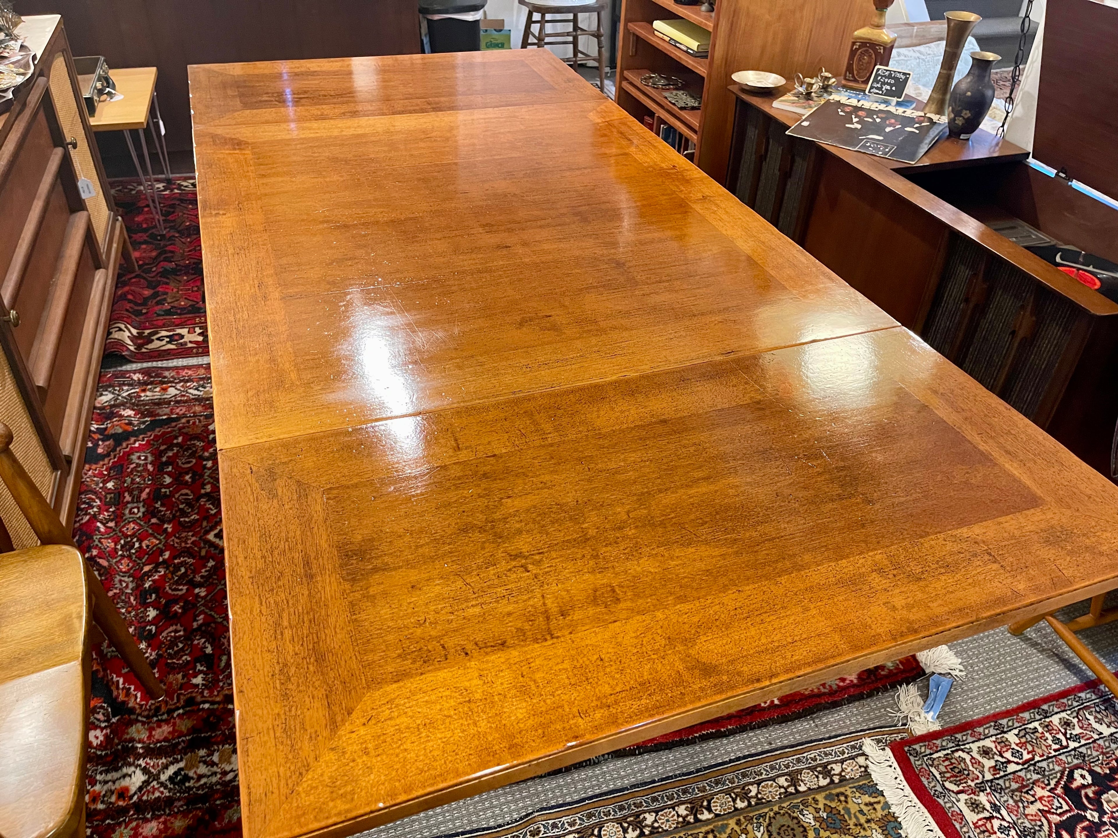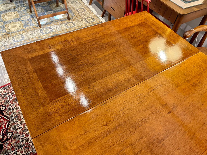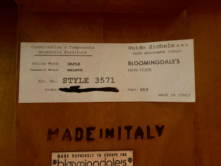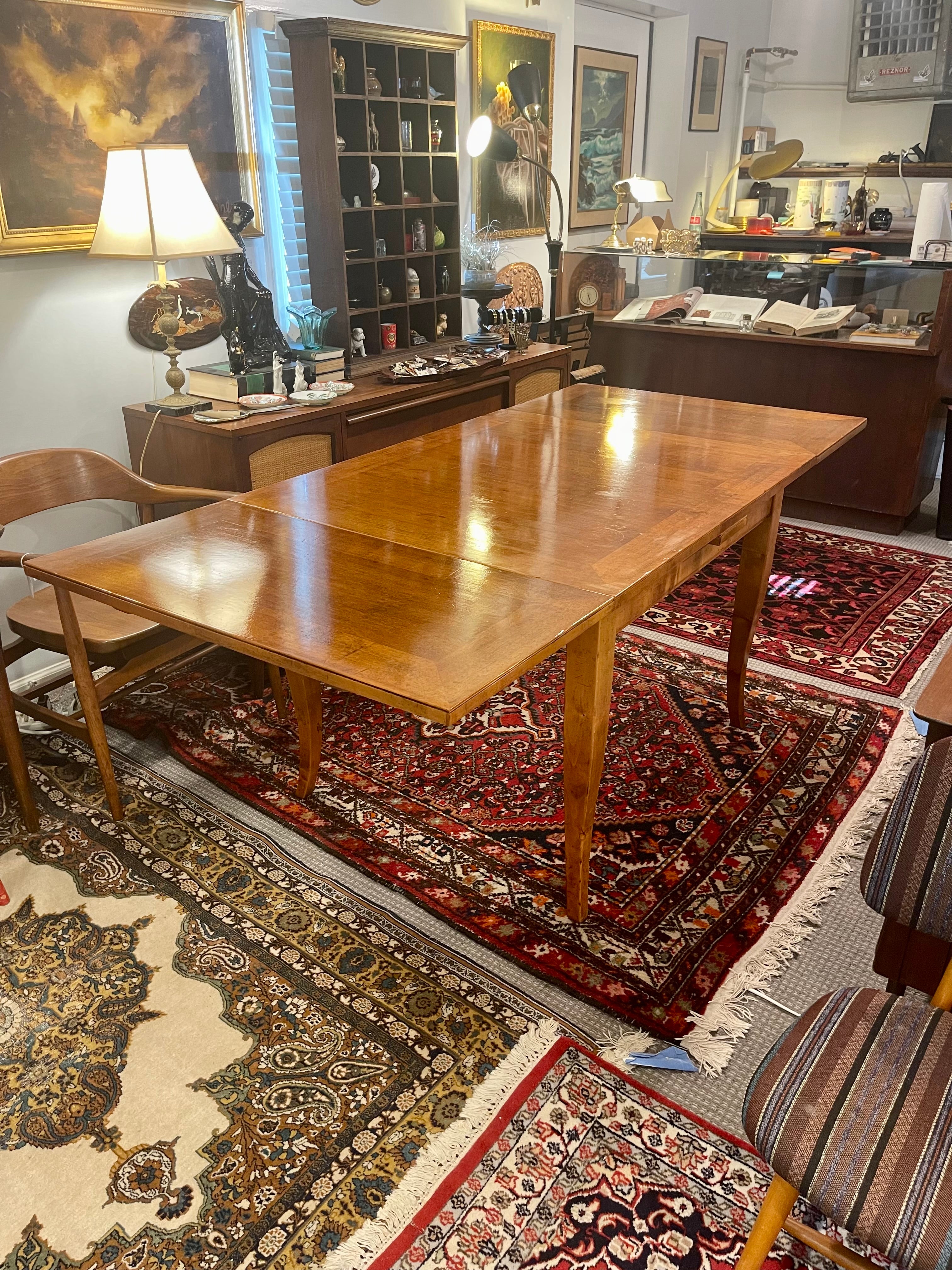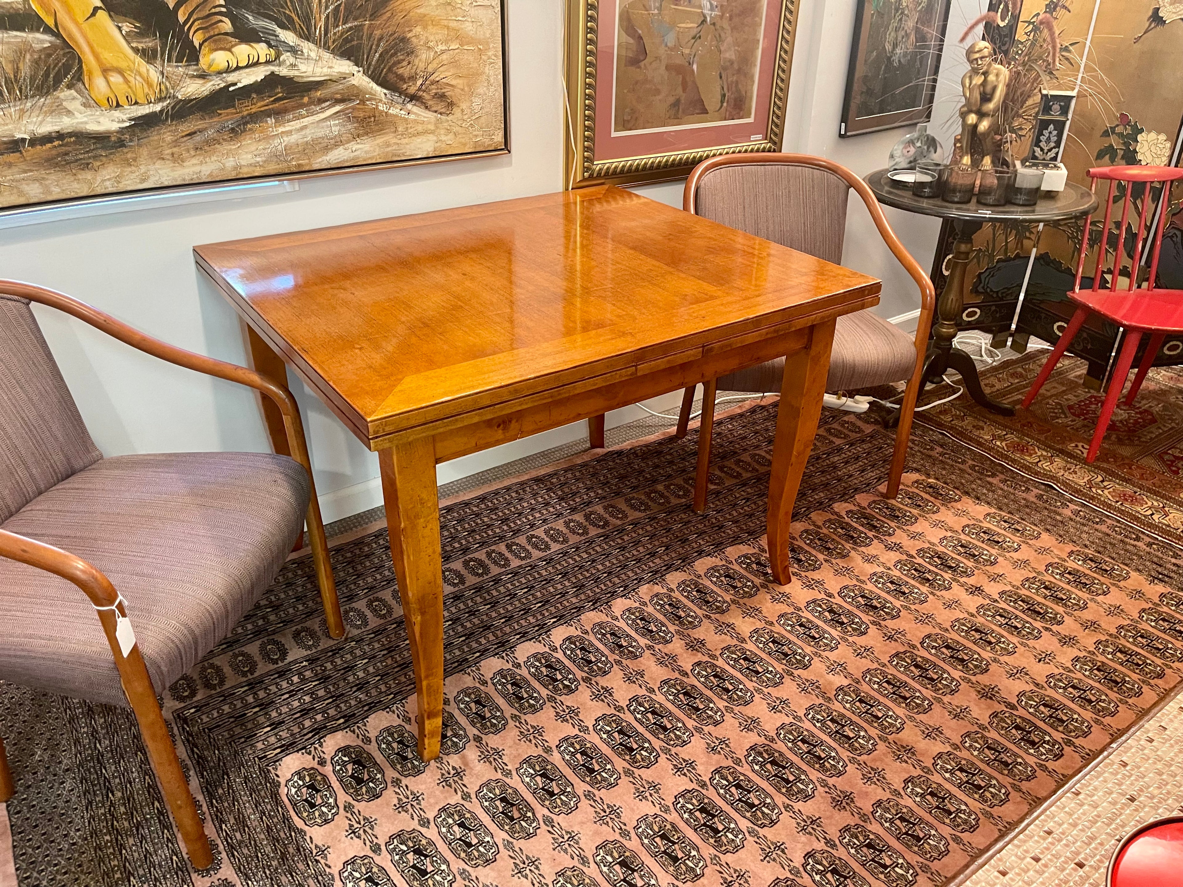 Designed by Guido Zichele for Bloomingdale’s, this Walnut and Maple Extendable Italian Dining Table is a beautiful example of Italian design. Maple with a Walnut veneer finish. Perfect size for smaller spaces, but comfortably seats 8 when the leaves are extended. The table has two 18 inch leaves which store under the tabletop and slide out easily for use. Full length of 78 inches when both leaves are in use.