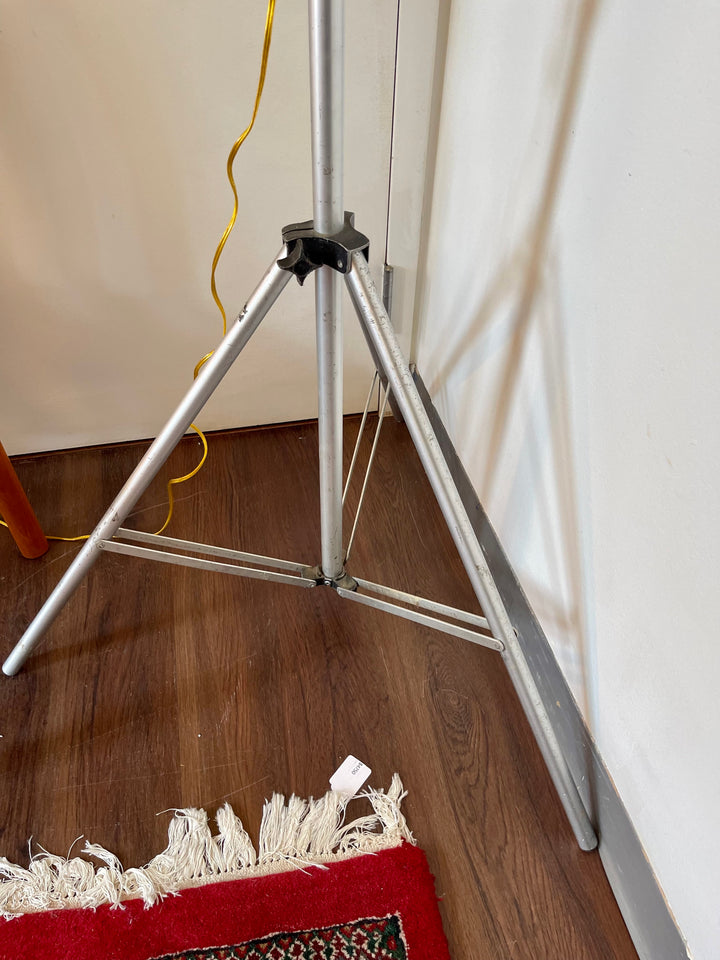 Vintage Vari-Beam Model 7750 Industrial Stage Light. Manufactured in Youngstown Ohio. This 1950s stage light has been rewired to serve as an industrial lighting accent to your home. All functionality still in tact, the light can reach as high as 95 inches, and the bulb adjust backward and forward within the housing. Easy light bulb change through the back panel. Adjustable tripod base.