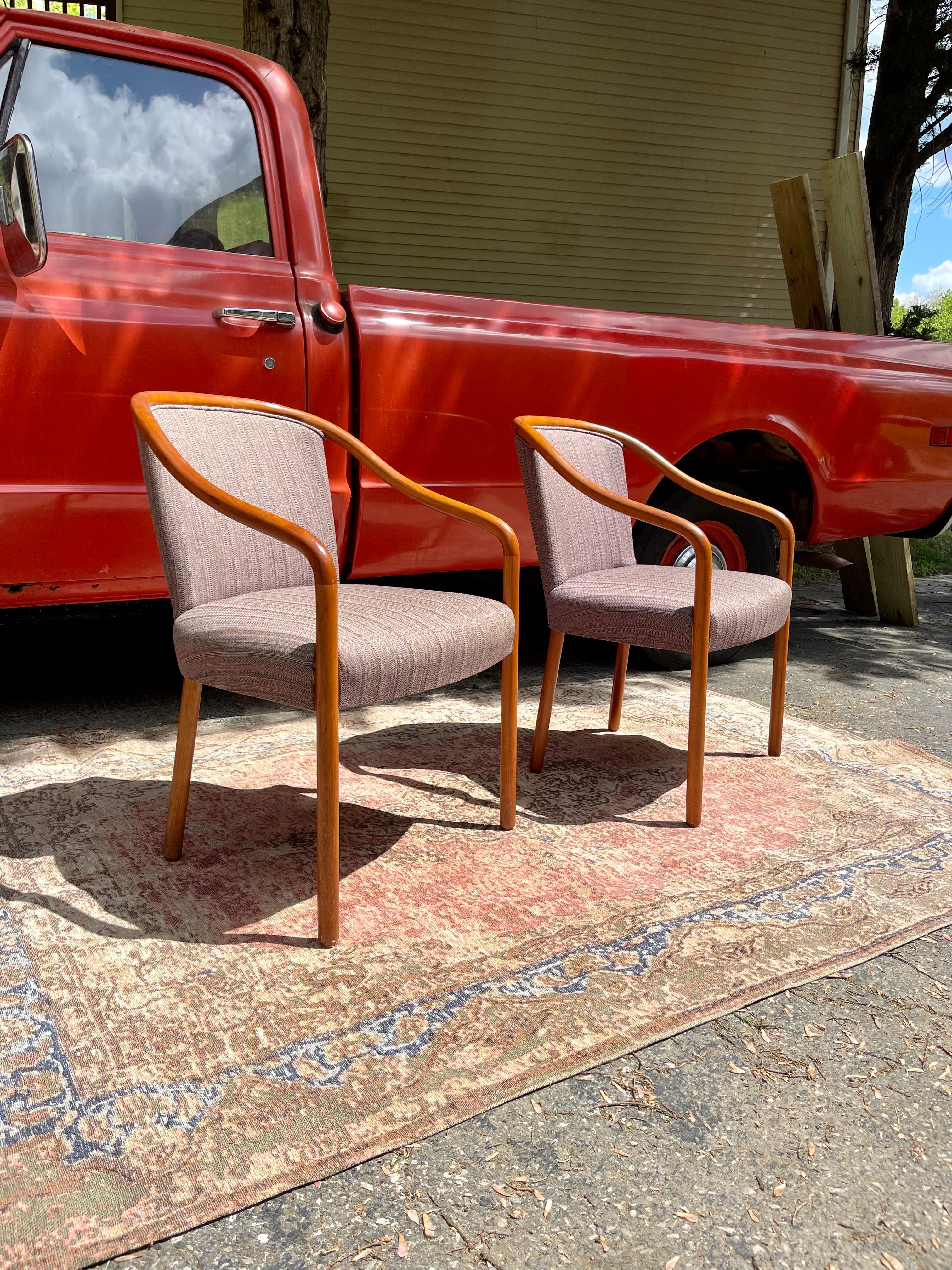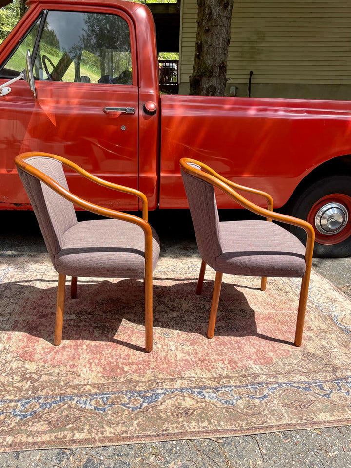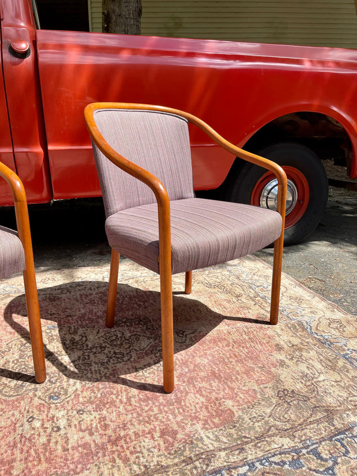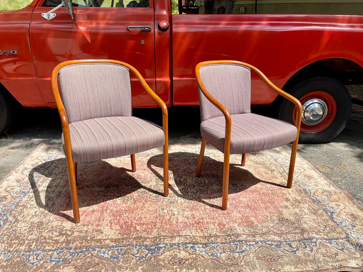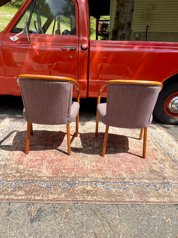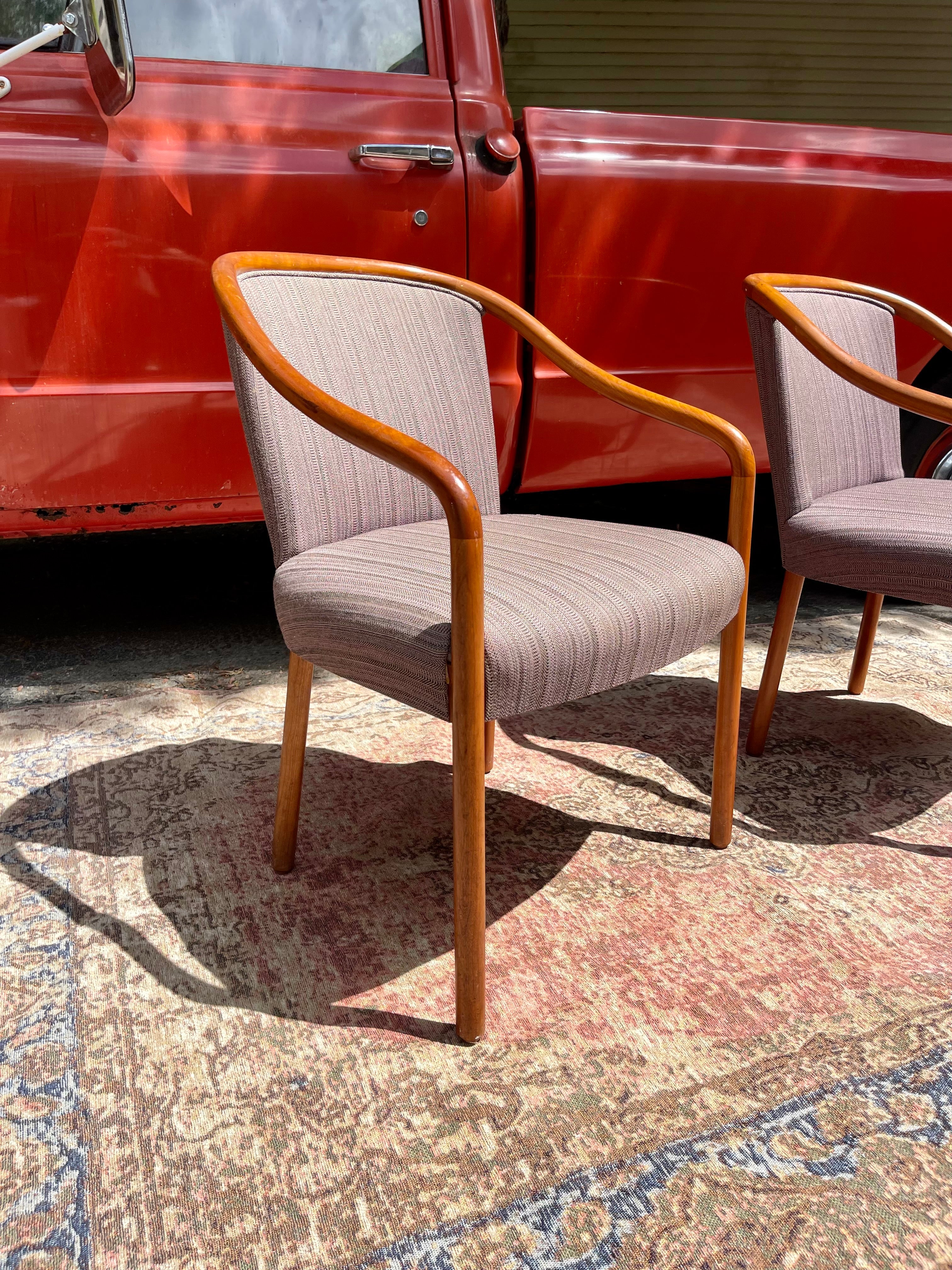 From the famed designer Ward Bennett, this pair of vintage chairs from Brickley Furniture are visually stunning. The original purple/grey upholstery is in great condition, and the solid wood Cherry frame is uniquely shaped.