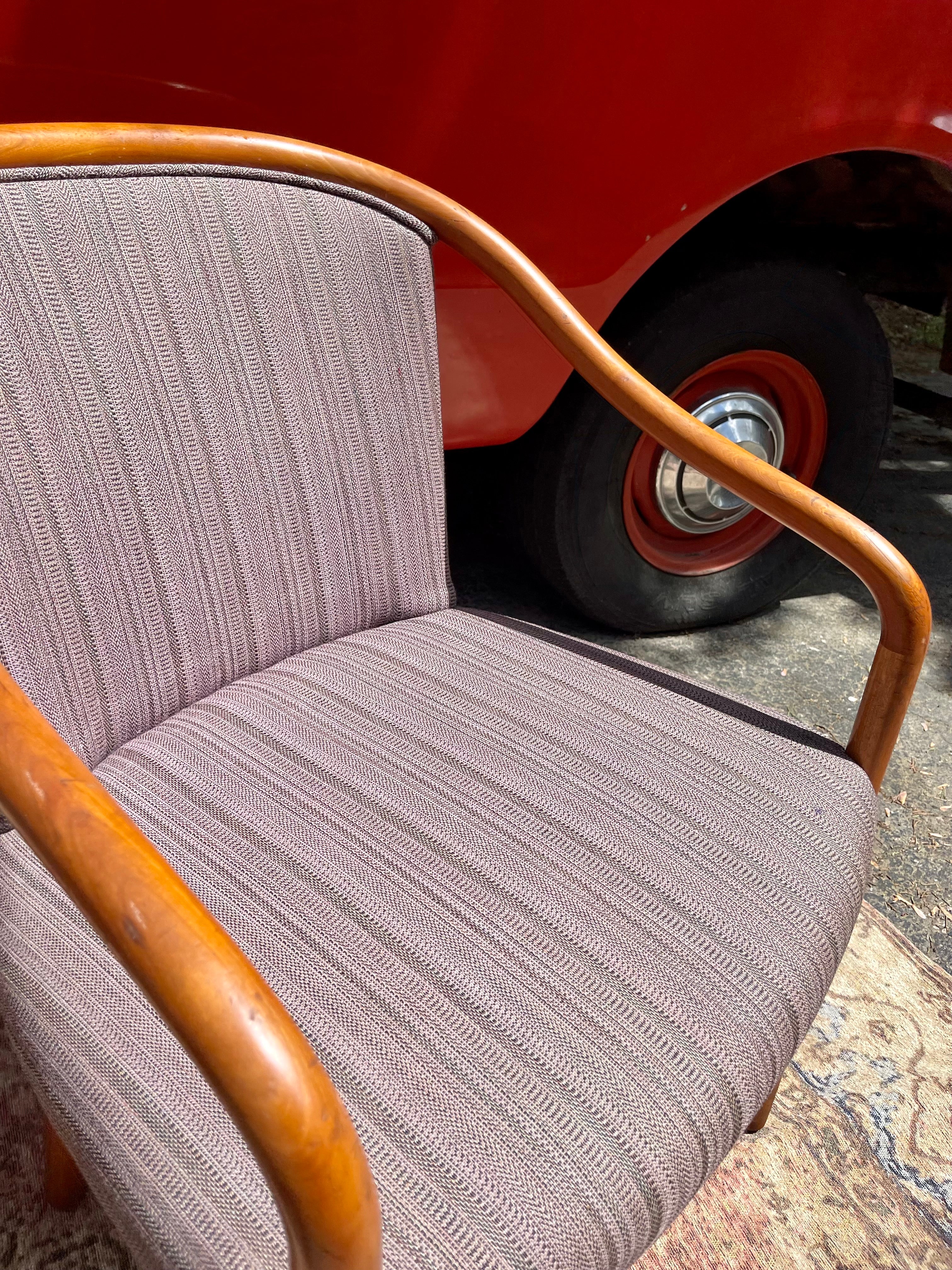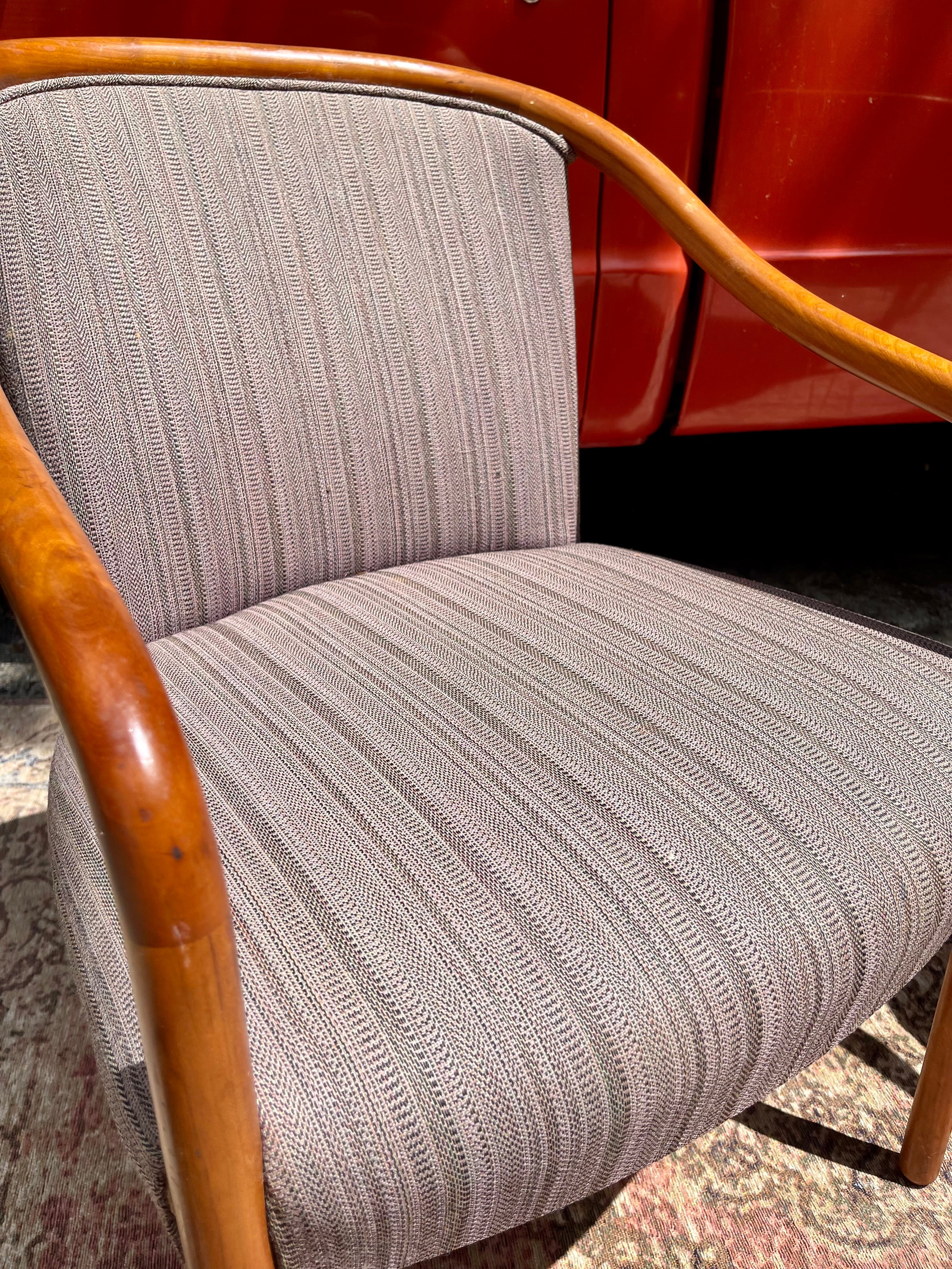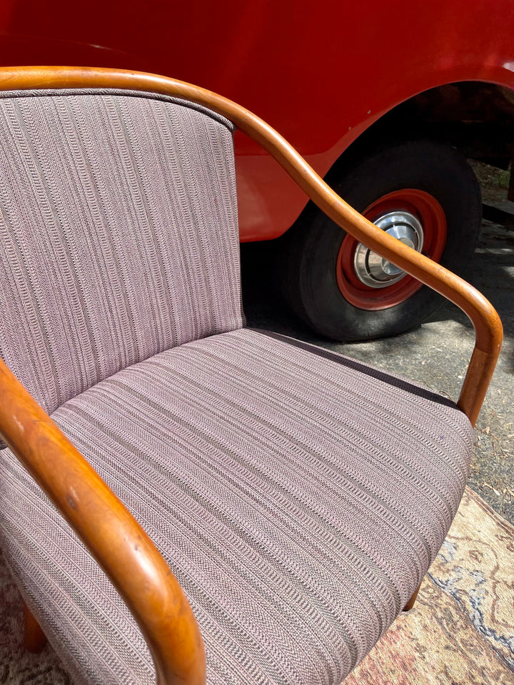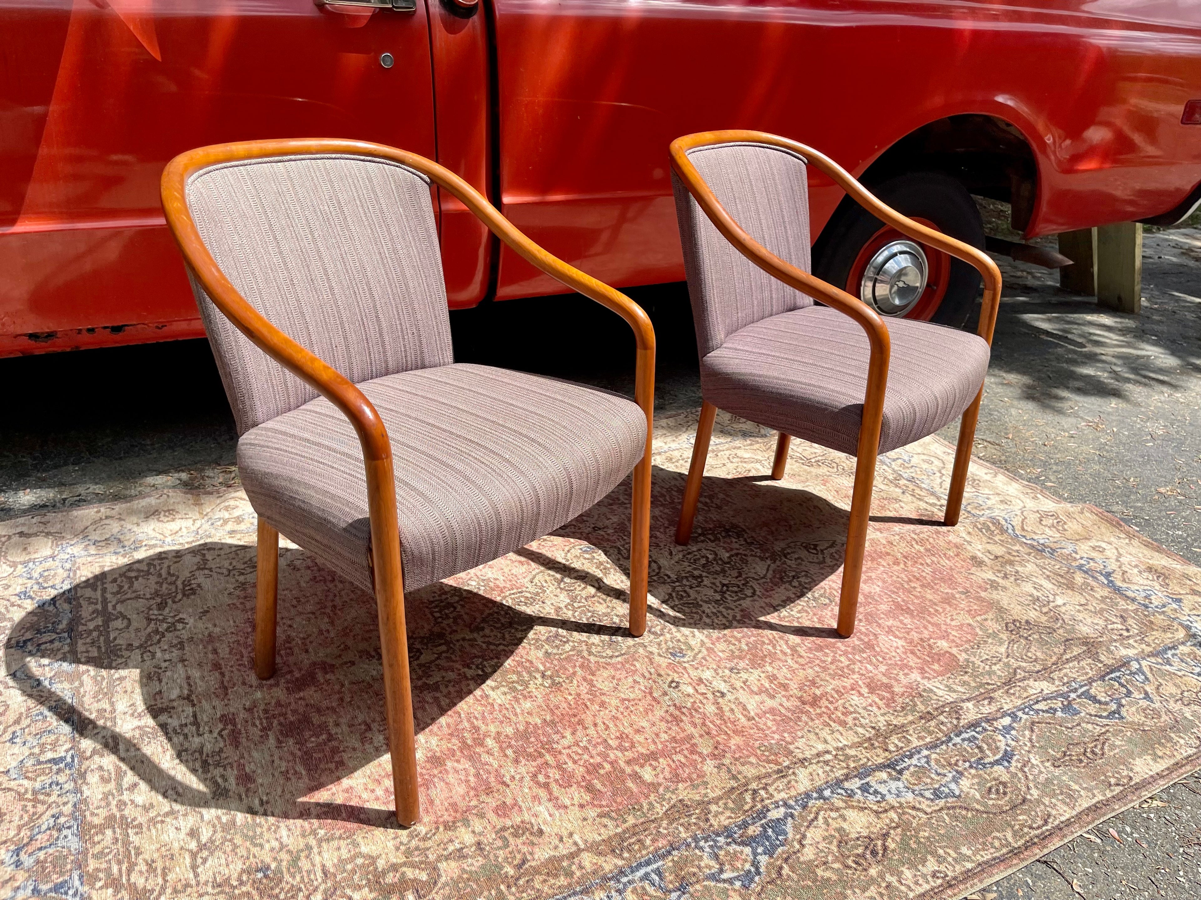 From the famed designer Ward Bennett, this pair of vintage chairs from Brickley Furniture are visually stunning. The original purple/grey upholstery is in great condition, and the solid wood Cherry frame is uniquely shaped.