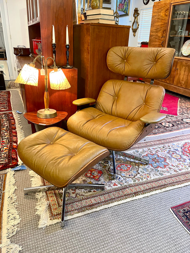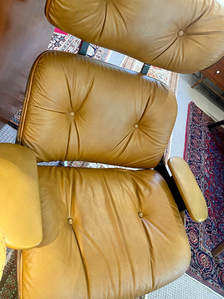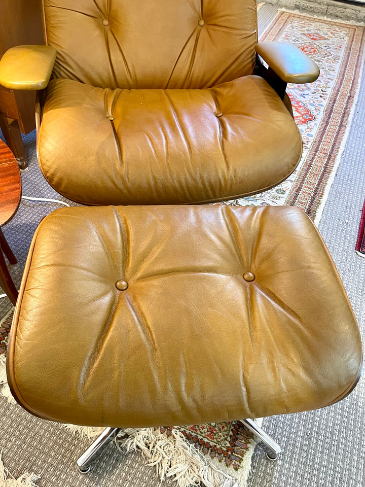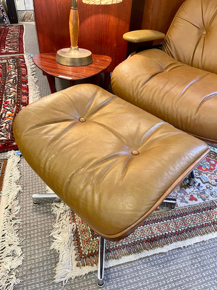 The Eames Lounger is ubiquitous with Midcentury modern design. This example from Plycraft is in great vintage condition. The caramel leather has no rips or tears. This chair is the perfect combination of comfort and style, and will immediately become your favorite place to sit in your house. Add it to a living room or create a classy reading nook.