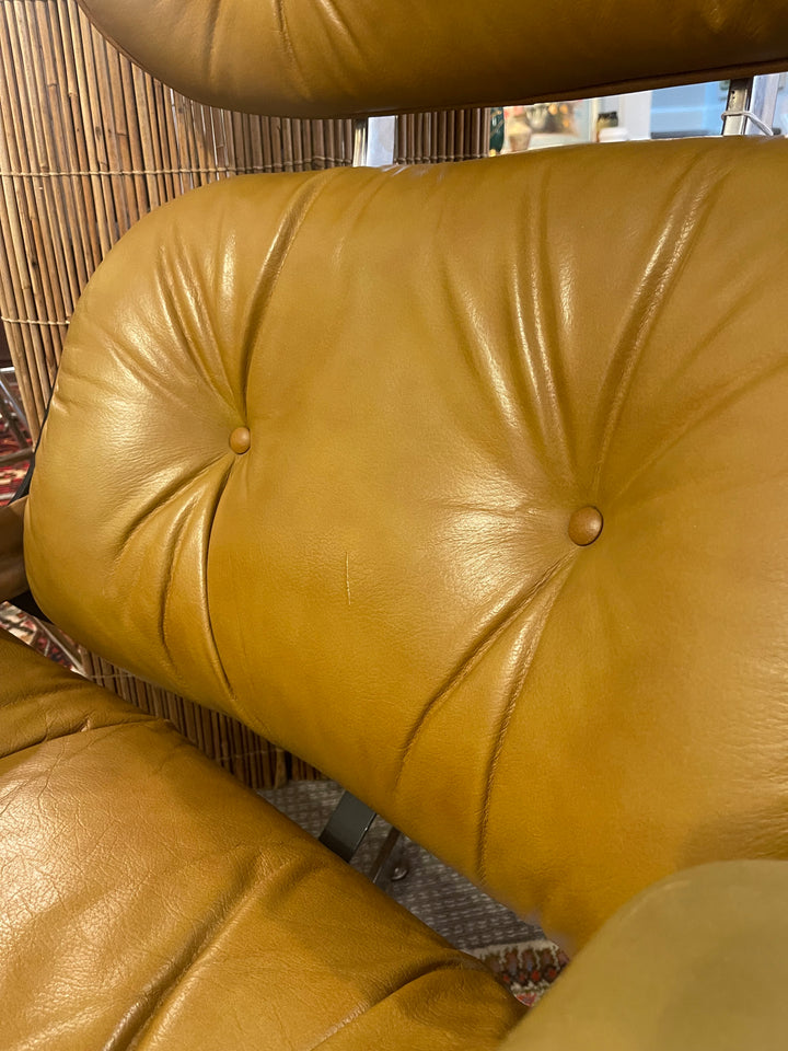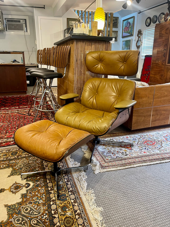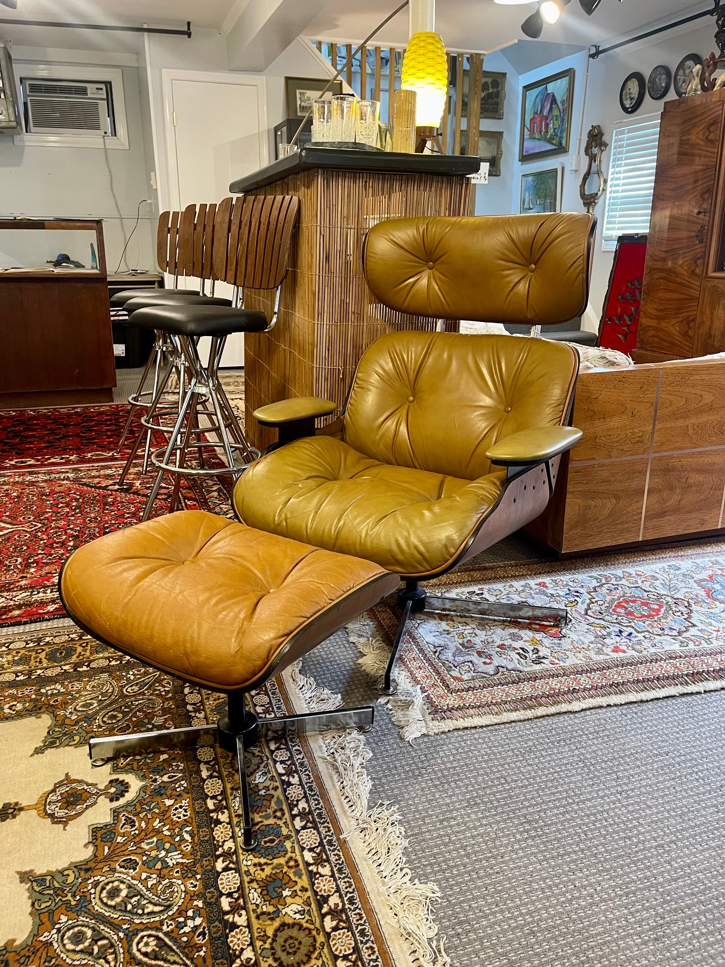 The Eames Lounger is ubiquitous with Midcentury modern design. This example from Plycraft is in great vintage condition. The caramel leather has no rips or tears. This chair is the perfect combination of comfort and style, and will immediately become your favorite place to sit in your house. Add it to a living room or create a classy reading nook. This particular model has a crisp black trim around the walnut frame and a chrome base.